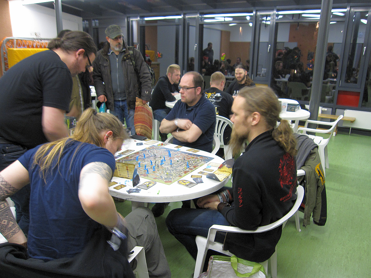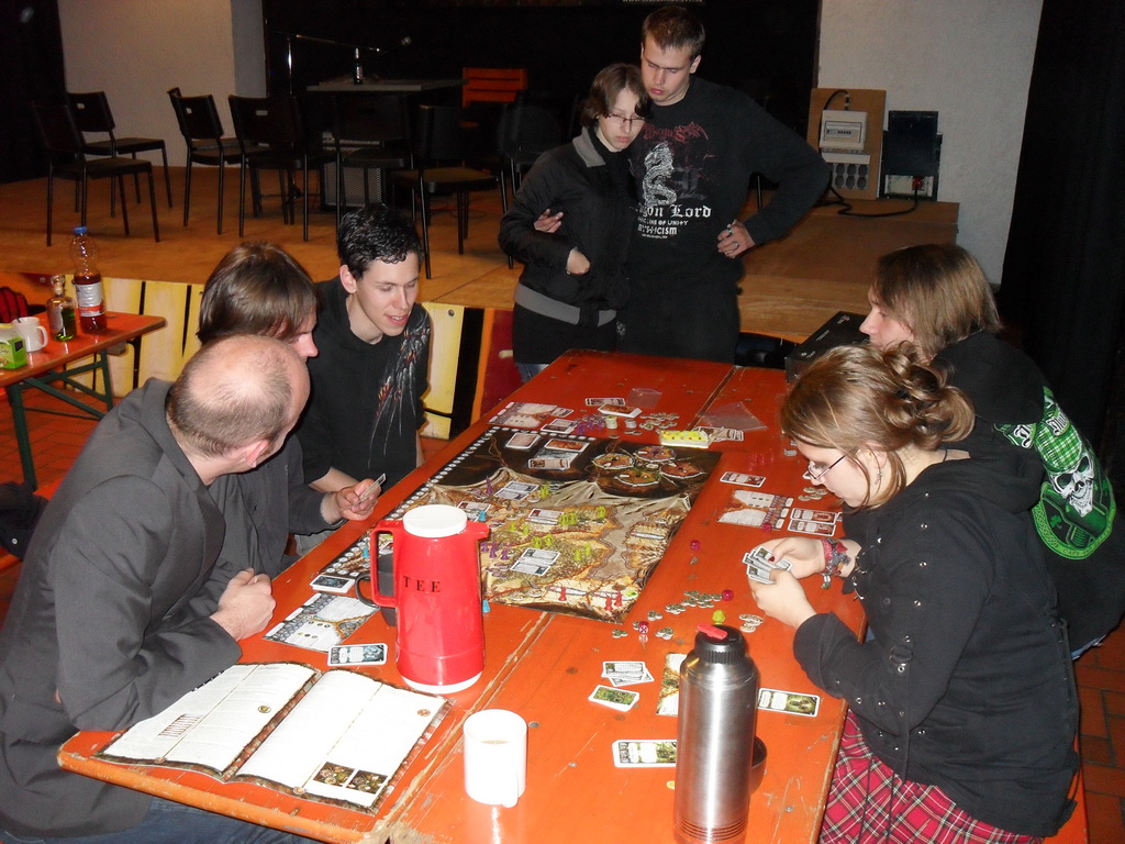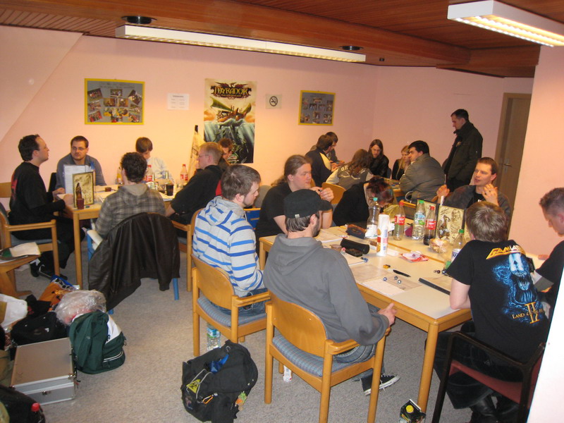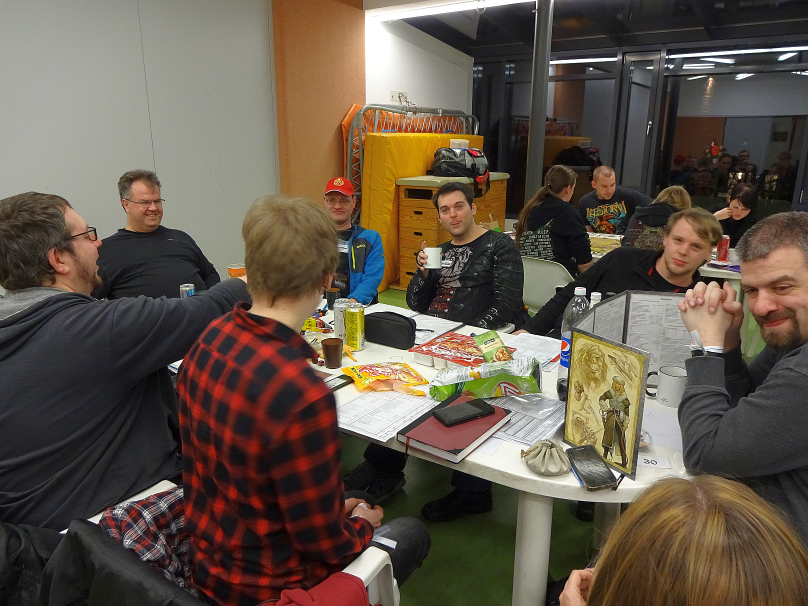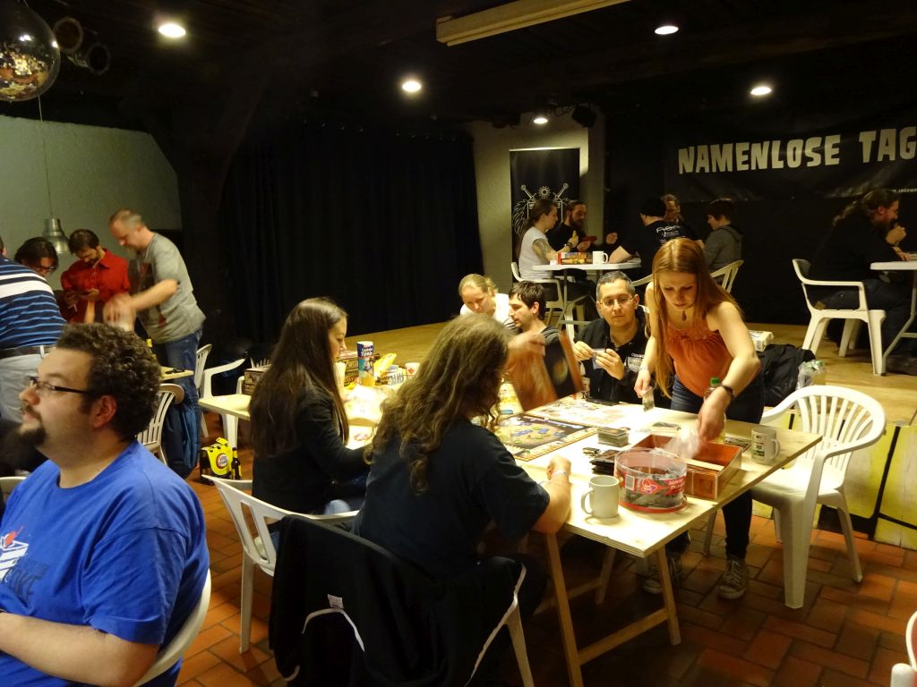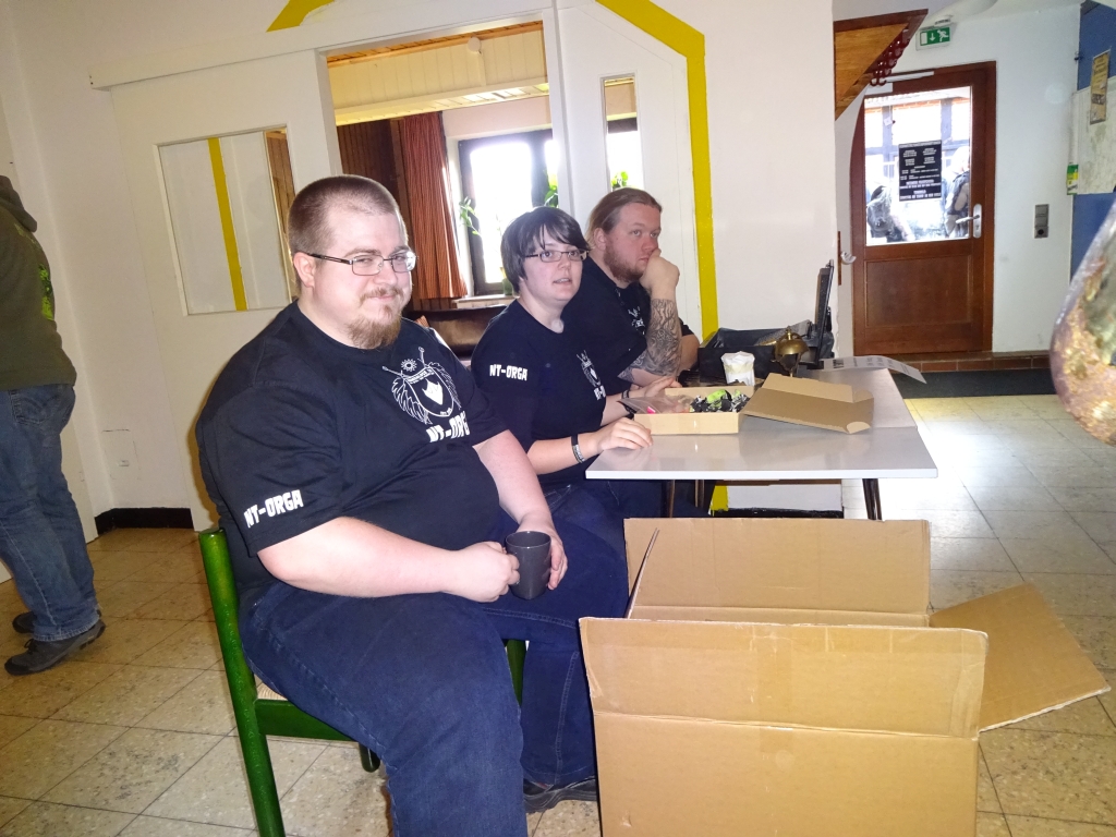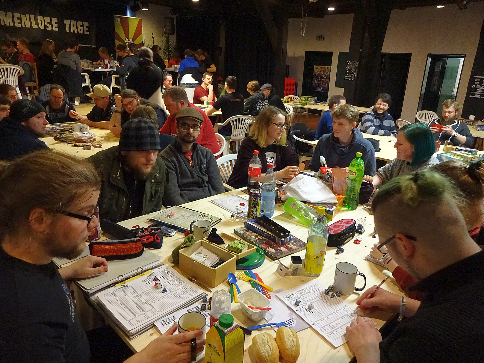 NT24: Bei frischem, wenn doch trockenem Wetter, öffneten sich die Pforten gegen 17:30 Uhr und der Run auf die Tassen im JD Style konnte beginnen. Mit Flatrate und Proviant gewappnet ging es auch schon an die Spieltische. Wer hingegen etwas Kultur genießen wollte, war in der Lesung mit Bernhard Hennen genau richtig. Als der Chilimeister zum Mitternachtsimbiss rief und auch der letzte eine Spielrunde oder bereits einen Platz im Schlafraum der neuen Kita gefunden hatte, ging der Freitag mit einem neuen Besucherrekord von 212 Gästen zu Ende. Am Samstag sollte es spannend werden, ob der Wegfall des Obergeschosses im Jugendhaus auf die Tischreserven auswirken sollte, doch dem war nicht so. Auch einem erneuten Wurststau konnte entgegengewirkt werden, trotz dessen es zu kurzen Wartezeiten beim Grillmeister kam. Mit der Wunschlesung von Bernhard Hennen und Tom Daut wurde auch der Samstag Nachmittag literarisch aufgewertet. Bei der Tombola am Abend konnte man gleich zu Beginn, oder doch am Ende, den verwirrten Gästen eine Besucherzahl von 310 präsentieren. Am Sonntag sollte, ausser beim Grillmeister nichts mehr anbrennen. Die Besucher die es bis dahin geschafft hatten gegen die Müdigkeit anzukämpfen nutzten nochmal ihre Flatrate und spielten bis zur letzten Minute. Mit 321 Gästen, ging die an der Besucherzahl gemessene zweit stärkste Märzveranstaltung zu Ende.