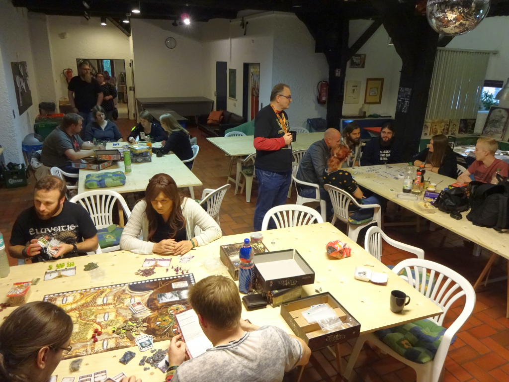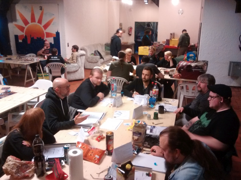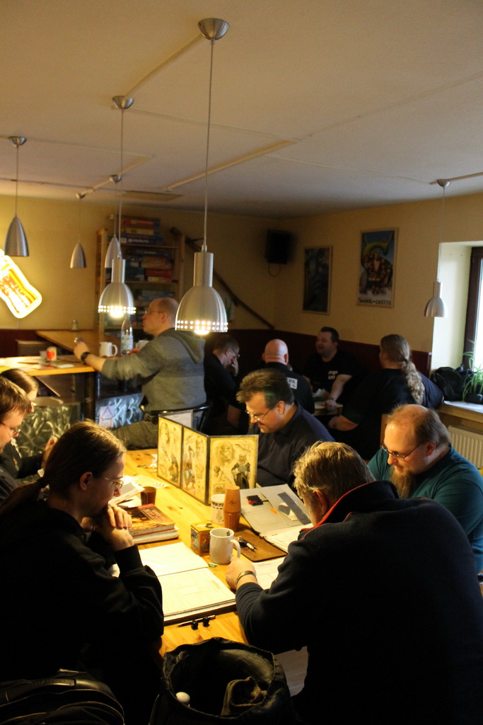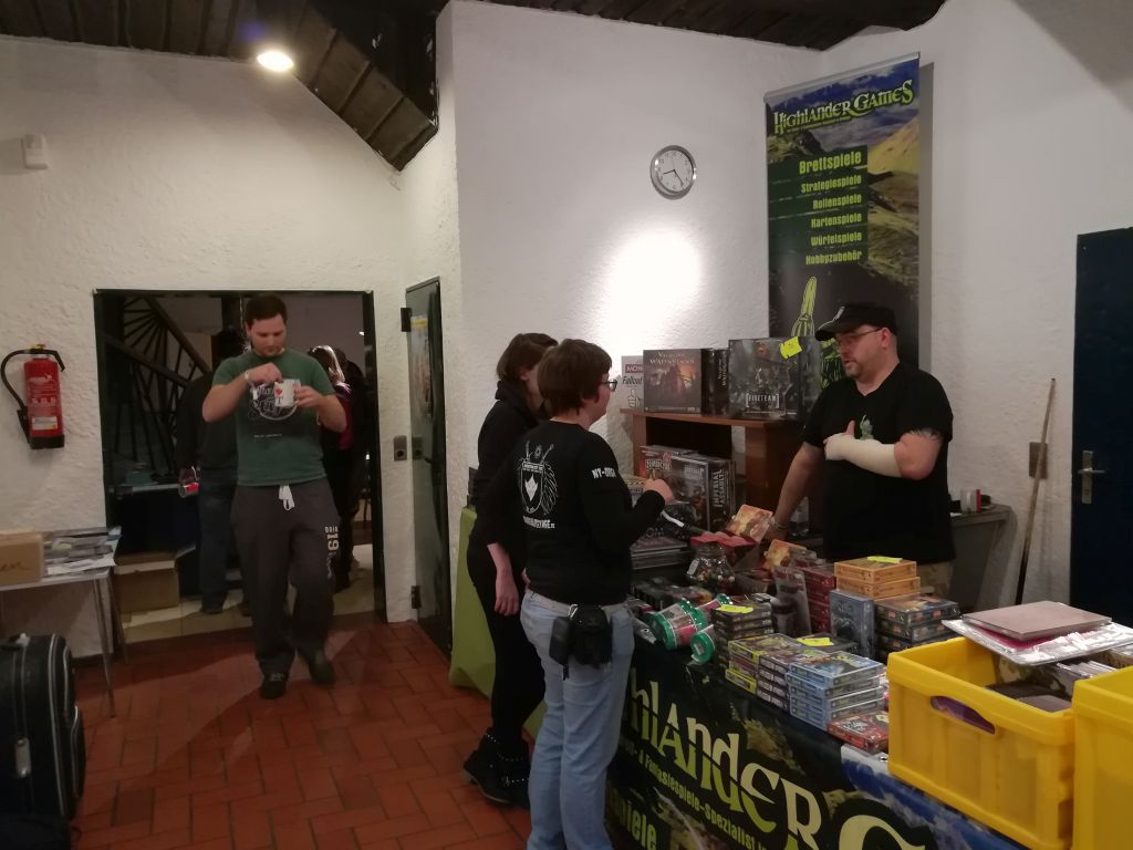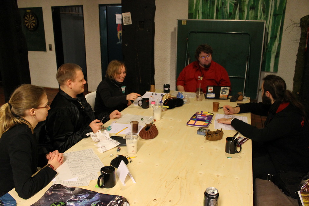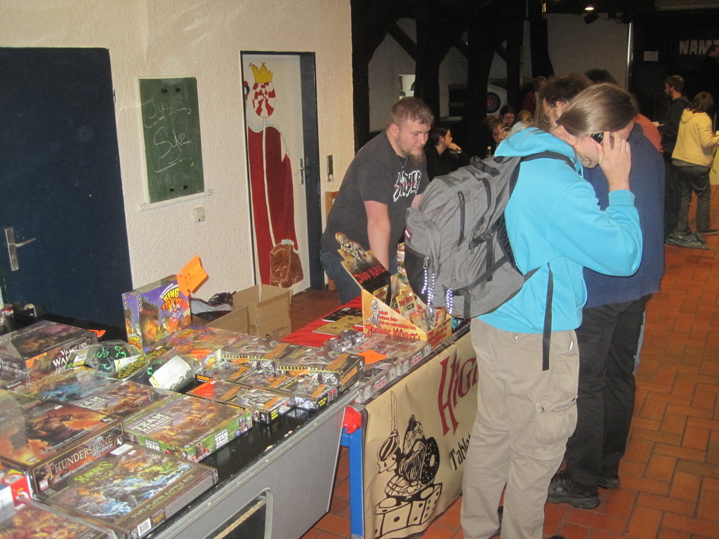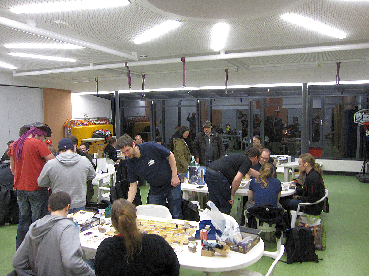 NT24: Bei frischem, wenn doch trockenem Wetter, öffneten sich die Pforten gegen 17:30 Uhr und der Run auf die Tassen im JD Style konnte beginnen. Mit Flatrate und Proviant gewappnet ging es auch schon an die Spieltische. Wer hingegen etwas Kultur genießen wollte, war in der Lesung mit Bernhard Hennen genau richtig. Als der Chilimeister zum Mitternachtsimbiss rief und auch der letzte eine Spielrunde oder bereits einen Platz im Schlafraum der neuen Kita gefunden hatte, ging der Freitag mit einem neuen Besucherrekord von 212 Gästen zu Ende. Am Samstag sollte es spannend werden, ob der Wegfall des Obergeschosses im Jugendhaus auf die Tischreserven auswirken sollte, doch dem war nicht so. Auch einem erneuten Wurststau konnte entgegengewirkt werden, trotz dessen es zu kurzen Wartezeiten beim Grillmeister kam. Mit der Wunschlesung von Bernhard Hennen und Tom Daut wurde auch der Samstag Nachmittag literarisch aufgewertet. Bei der Tombola am Abend konnte man gleich zu Beginn, oder doch am Ende, den verwirrten Gästen eine Besucherzahl von 310 präsentieren. Am Sonntag sollte, ausser beim Grillmeister nichts mehr anbrennen. Die Besucher die es bis dahin geschafft hatten gegen die Müdigkeit anzukämpfen nutzten nochmal ihre Flatrate und spielten bis zur letzten Minute. Mit 321 Gästen, ging die an der Besucherzahl gemessene zweit stärkste Märzveranstaltung zu Ende.