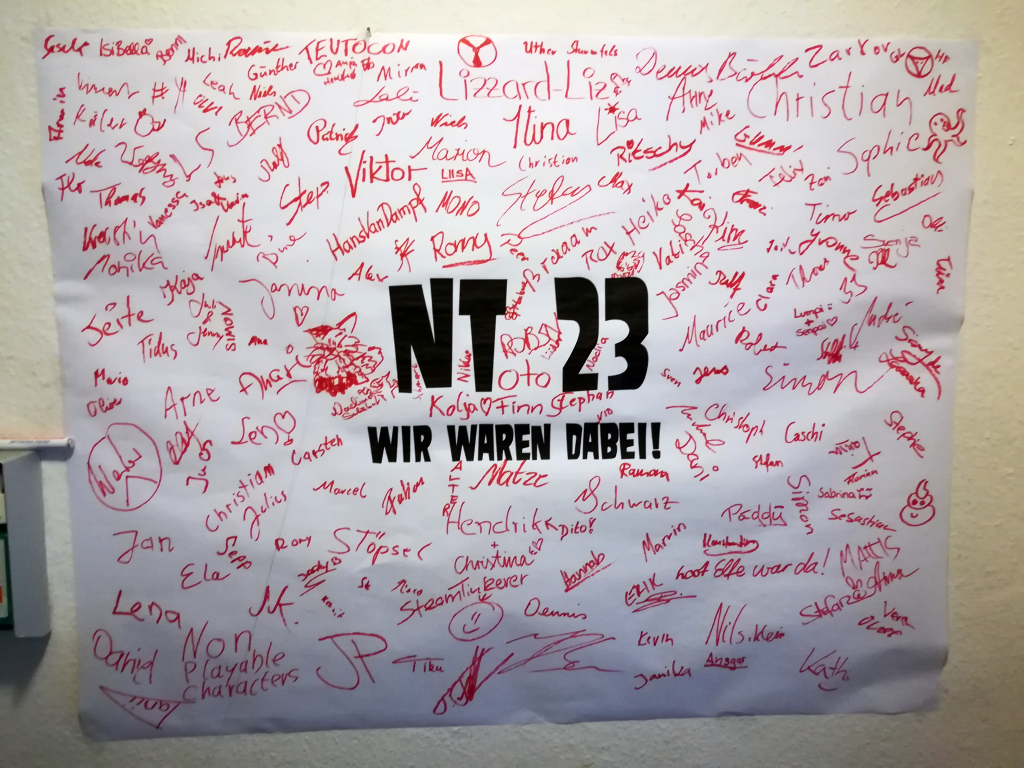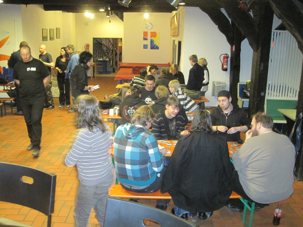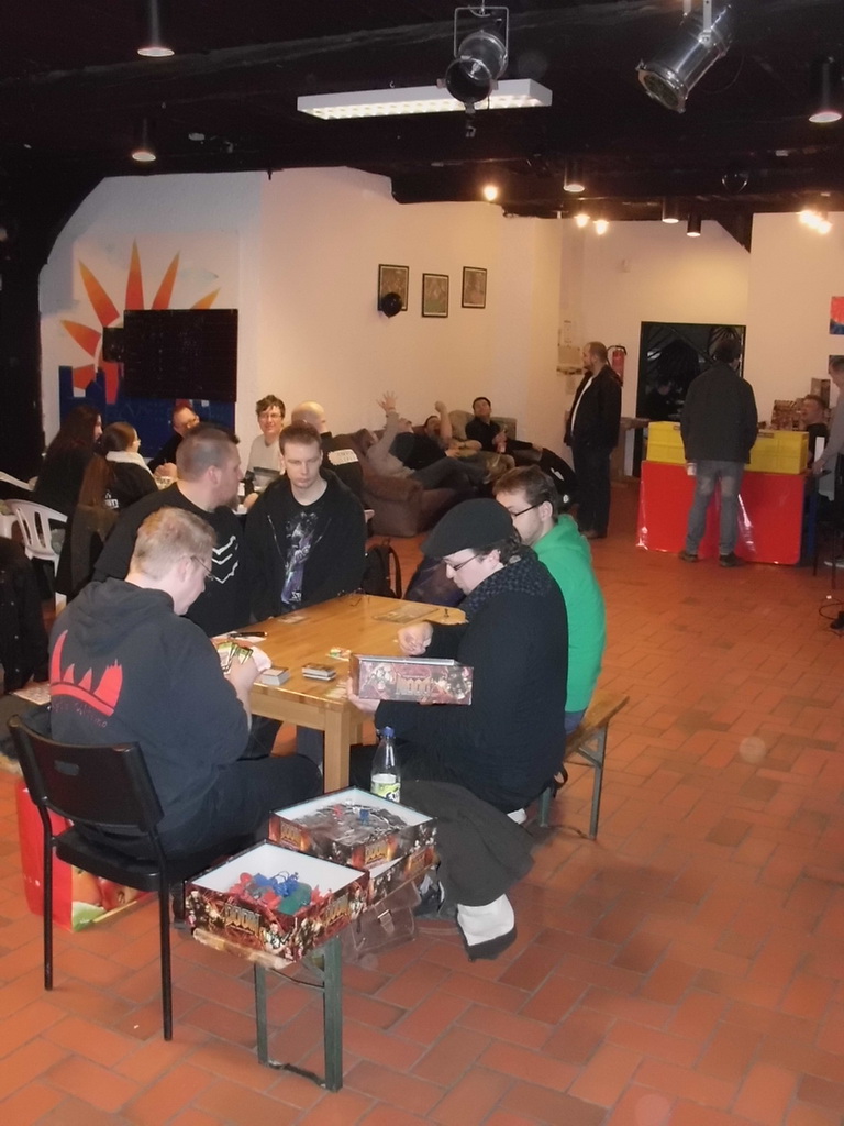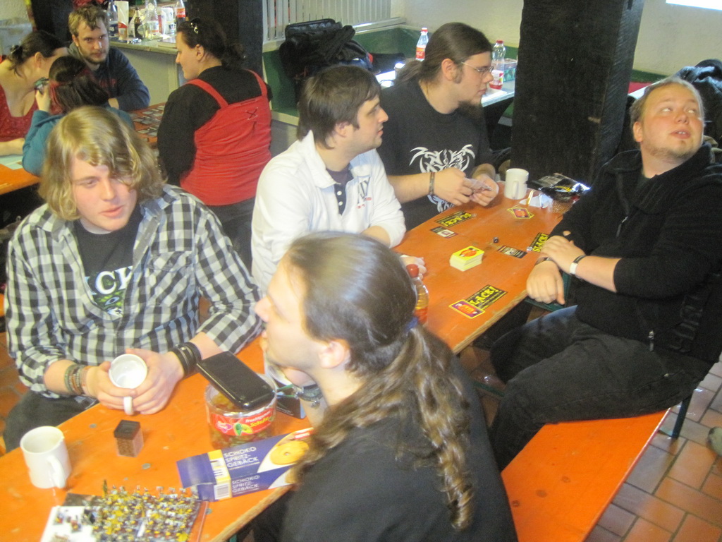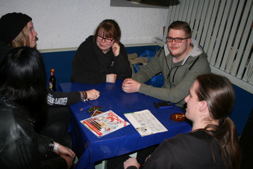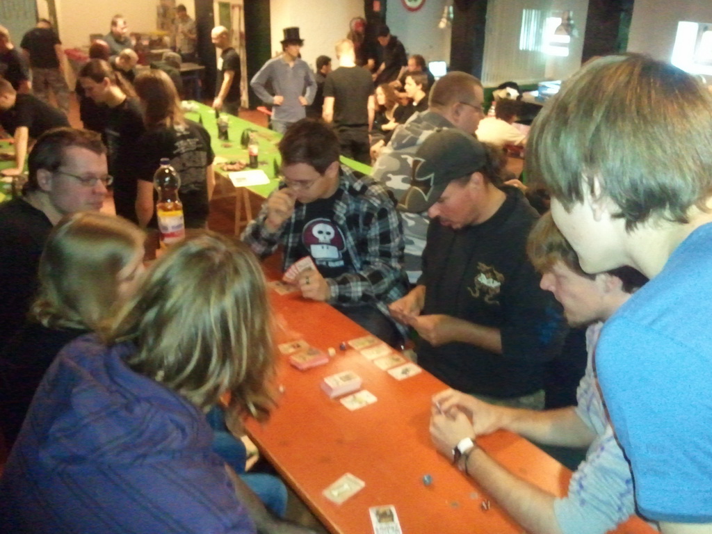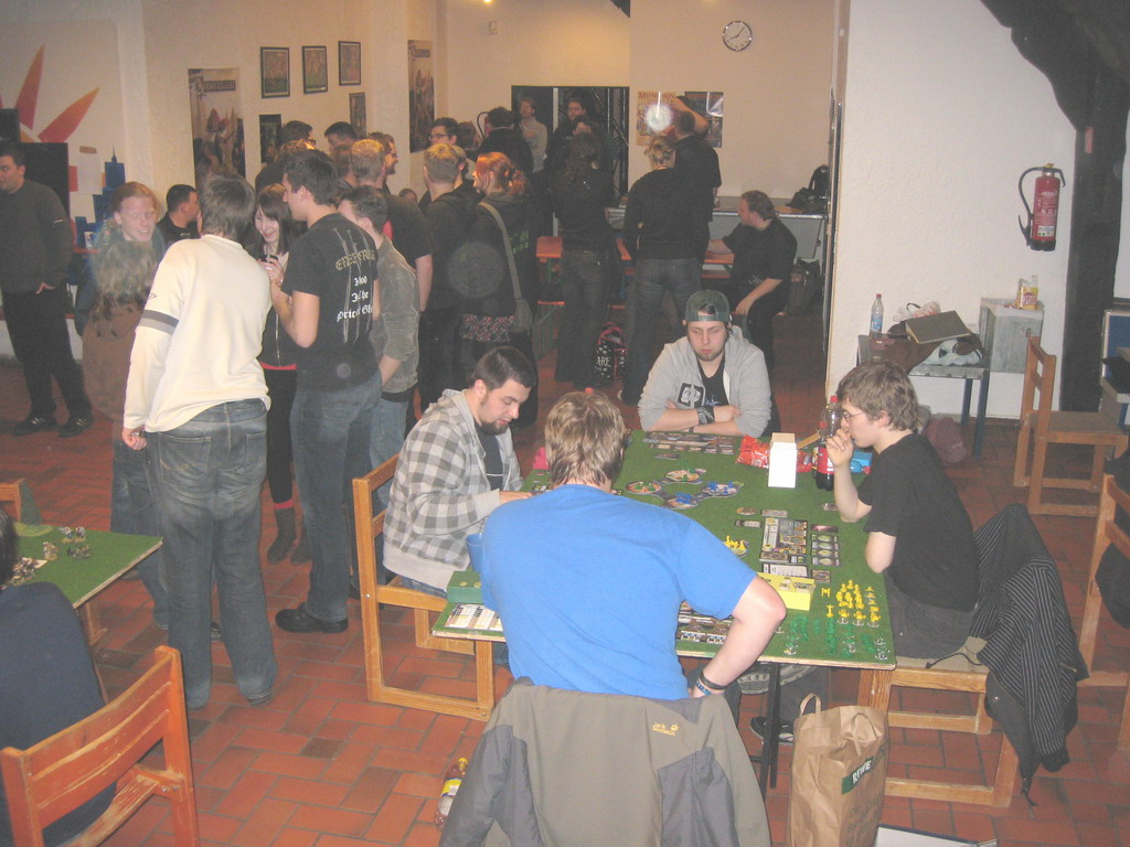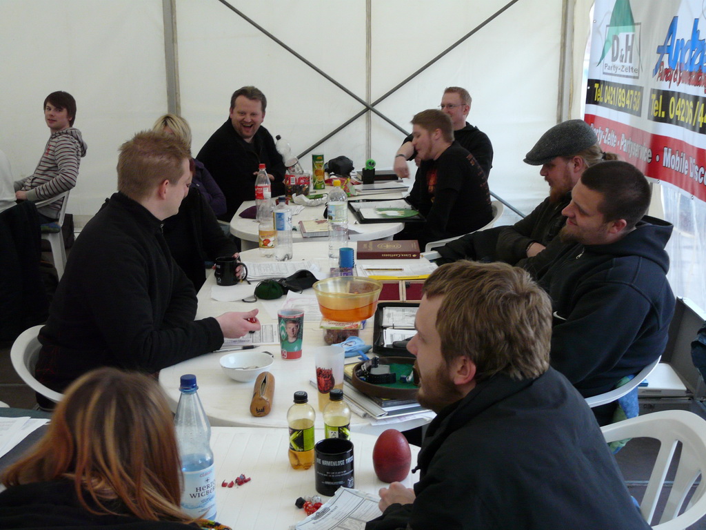 NT24: Bei frischem, wenn doch trockenem Wetter, öffneten sich die Pforten gegen 17:30 Uhr und der Run auf die Tassen im JD Style konnte beginnen. Mit Flatrate und Proviant gewappnet ging es auch schon an die Spieltische. Wer hingegen etwas Kultur genießen wollte, war in der Lesung mit Bernhard Hennen genau richtig. Als der Chilimeister zum Mitternachtsimbiss rief und auch der letzte eine Spielrunde oder bereits einen Platz im Schlafraum der neuen Kita gefunden hatte, ging der Freitag mit einem neuen Besucherrekord von 212 Gästen zu Ende. Am Samstag sollte es spannend werden, ob der Wegfall des Obergeschosses im Jugendhaus auf die Tischreserven auswirken sollte, doch dem war nicht so. Auch einem erneuten Wurststau konnte entgegengewirkt werden, trotz dessen es zu kurzen Wartezeiten beim Grillmeister kam. Mit der Wunschlesung von Bernhard Hennen und Tom Daut wurde auch der Samstag Nachmittag literarisch aufgewertet. Bei der Tombola am Abend konnte man gleich zu Beginn, oder doch am Ende, den verwirrten Gästen eine Besucherzahl von 310 präsentieren. Am Sonntag sollte, ausser beim Grillmeister nichts mehr anbrennen. Die Besucher die es bis dahin geschafft hatten gegen die Müdigkeit anzukämpfen nutzten nochmal ihre Flatrate und spielten bis zur letzten Minute. Mit 321 Gästen, ging die an der Besucherzahl gemessene zweit stärkste Märzveranstaltung zu Ende.