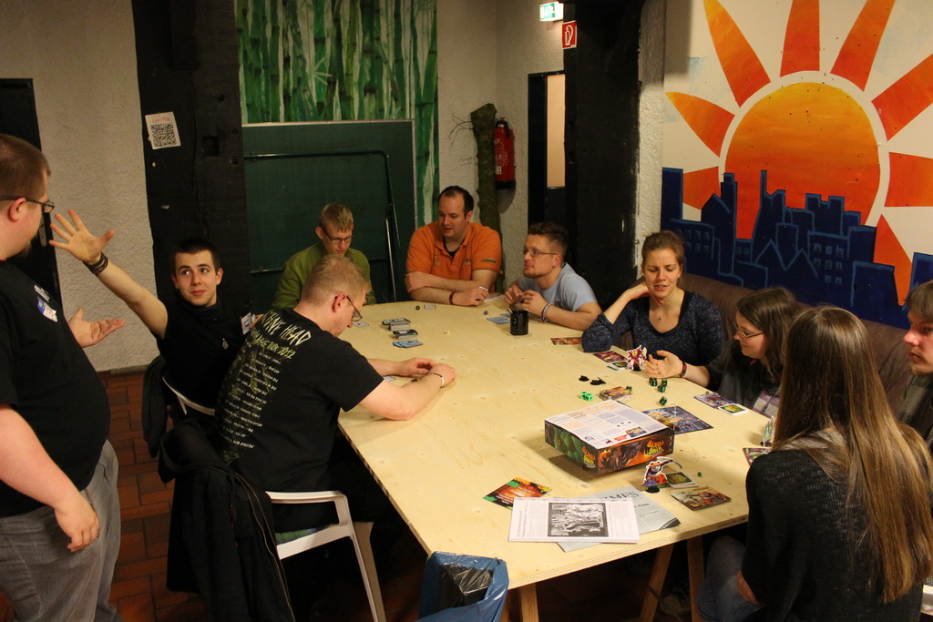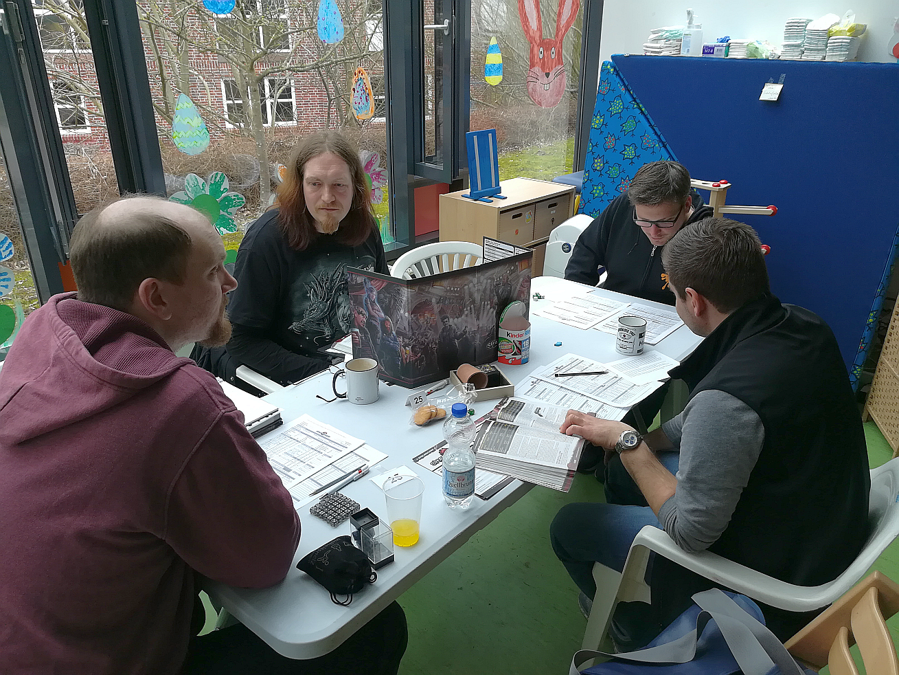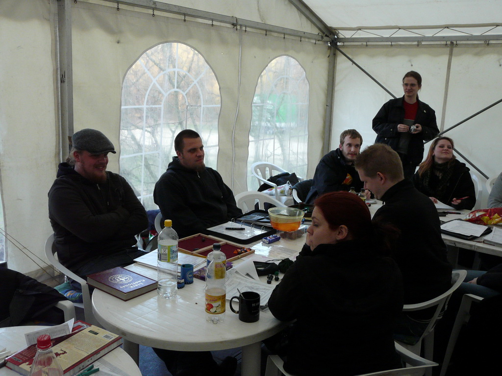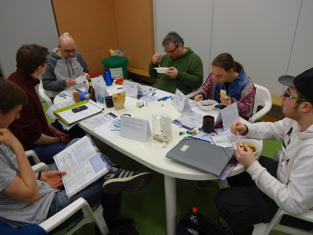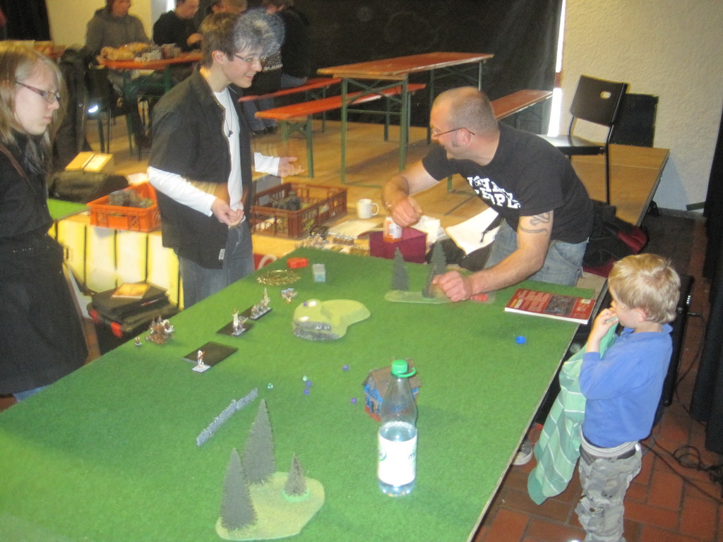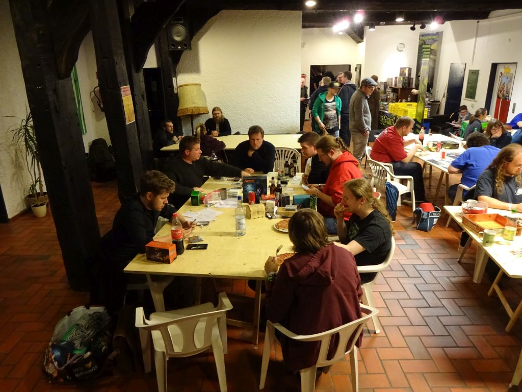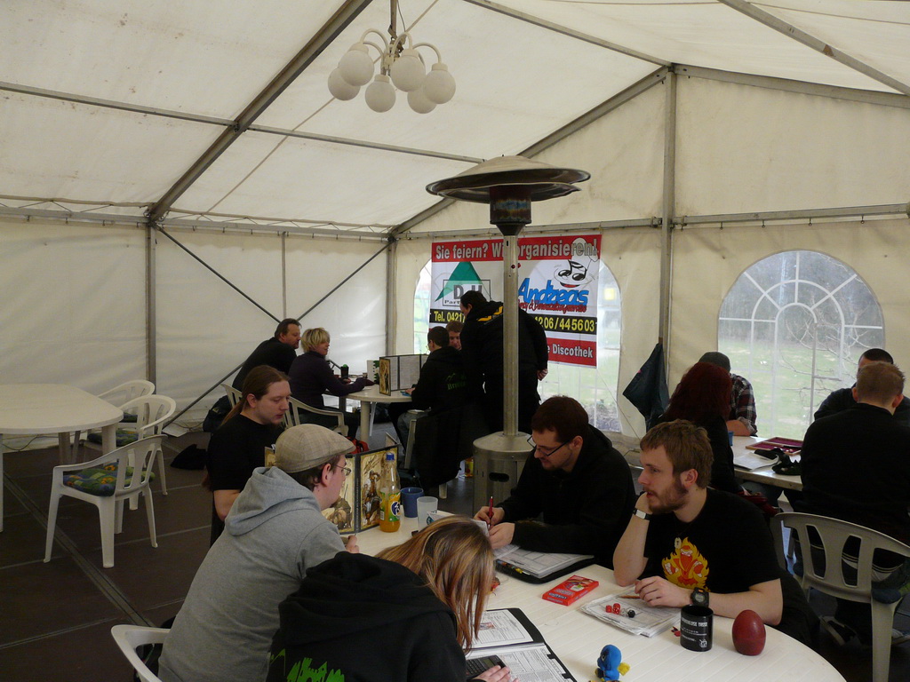 NT24: Bei frischem, wenn doch trockenem Wetter, öffneten sich die Pforten gegen 17:30 Uhr und der Run auf die Tassen im JD Style konnte beginnen. Mit Flatrate und Proviant gewappnet ging es auch schon an die Spieltische. Wer hingegen etwas Kultur genießen wollte, war in der Lesung mit Bernhard Hennen genau richtig. Als der Chilimeister zum Mitternachtsimbiss rief und auch der letzte eine Spielrunde oder bereits einen Platz im Schlafraum der neuen Kita gefunden hatte, ging der Freitag mit einem neuen Besucherrekord von 212 Gästen zu Ende. Am Samstag sollte es spannend werden, ob der Wegfall des Obergeschosses im Jugendhaus auf die Tischreserven auswirken sollte, doch dem war nicht so. Auch einem erneuten Wurststau konnte entgegengewirkt werden, trotz dessen es zu kurzen Wartezeiten beim Grillmeister kam. Mit der Wunschlesung von Bernhard Hennen und Tom Daut wurde auch der Samstag Nachmittag literarisch aufgewertet. Bei der Tombola am Abend konnte man gleich zu Beginn, oder doch am Ende, den verwirrten Gästen eine Besucherzahl von 310 präsentieren. Am Sonntag sollte, ausser beim Grillmeister nichts mehr anbrennen. Die Besucher die es bis dahin geschafft hatten gegen die Müdigkeit anzukämpfen nutzten nochmal ihre Flatrate und spielten bis zur letzten Minute. Mit 321 Gästen, ging die an der Besucherzahl gemessene zweit stärkste Märzveranstaltung zu Ende.