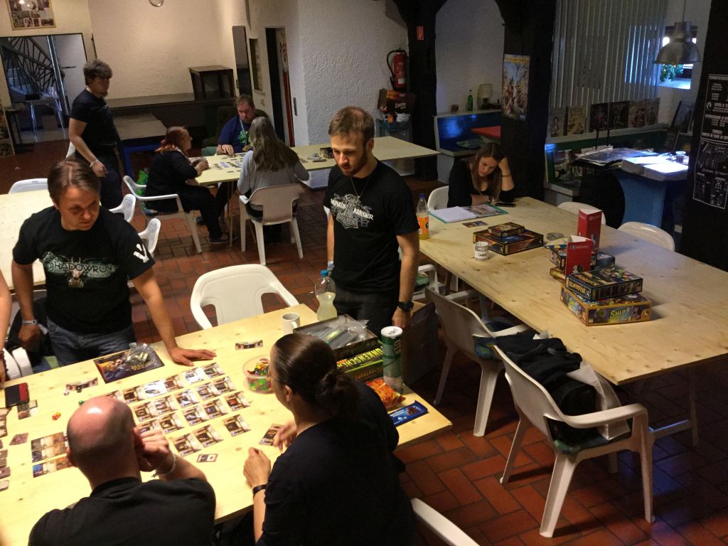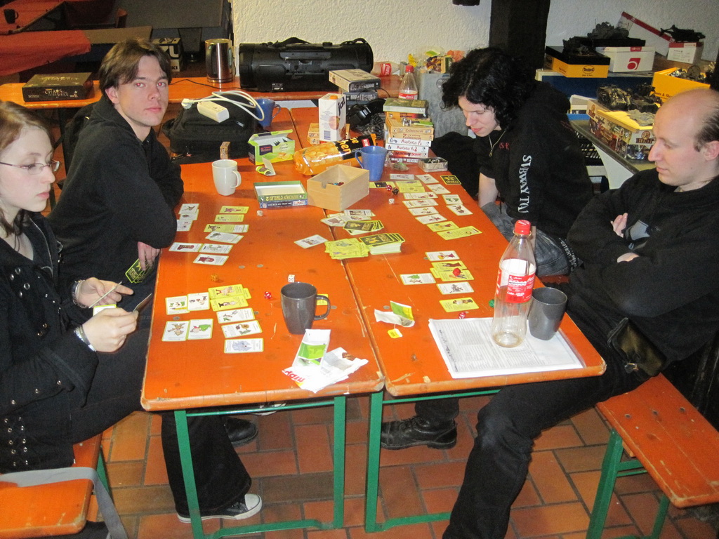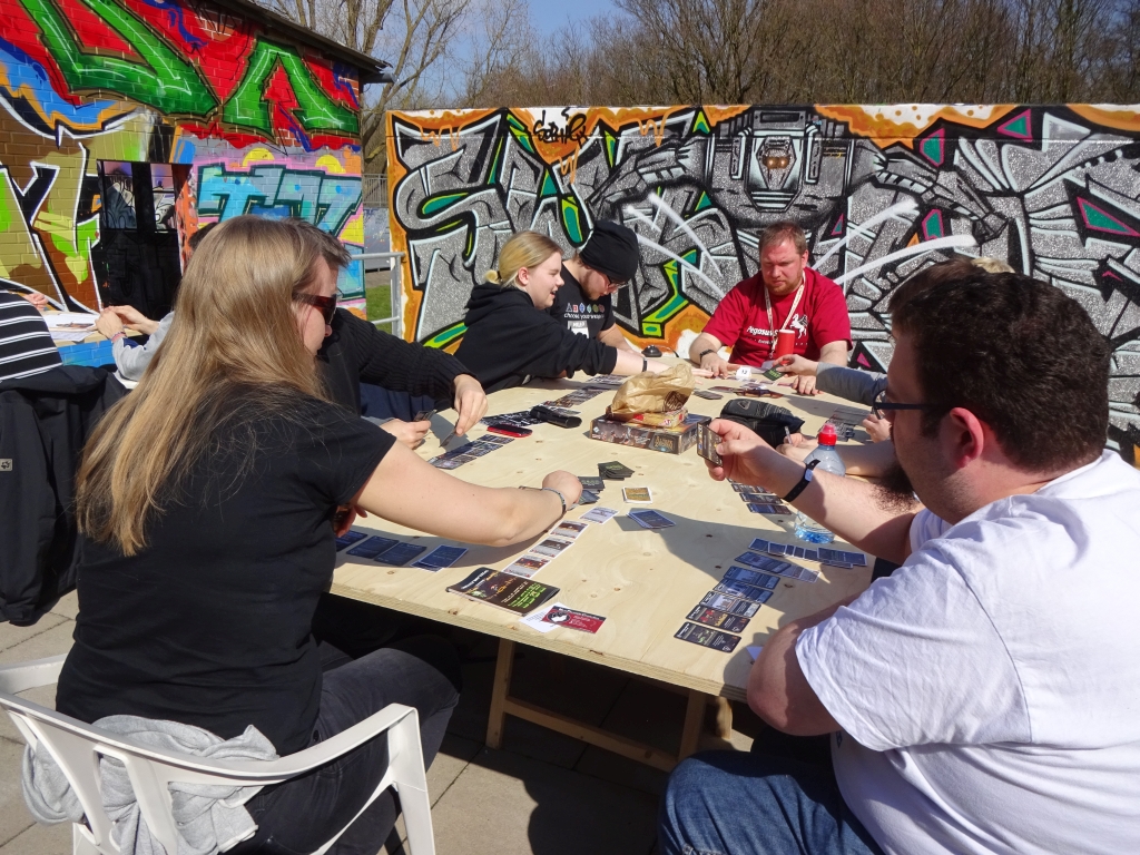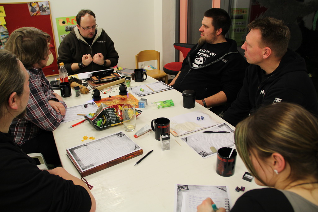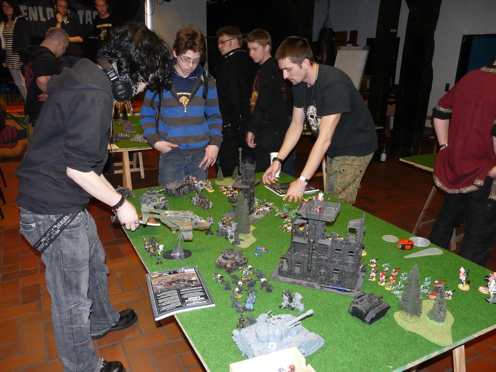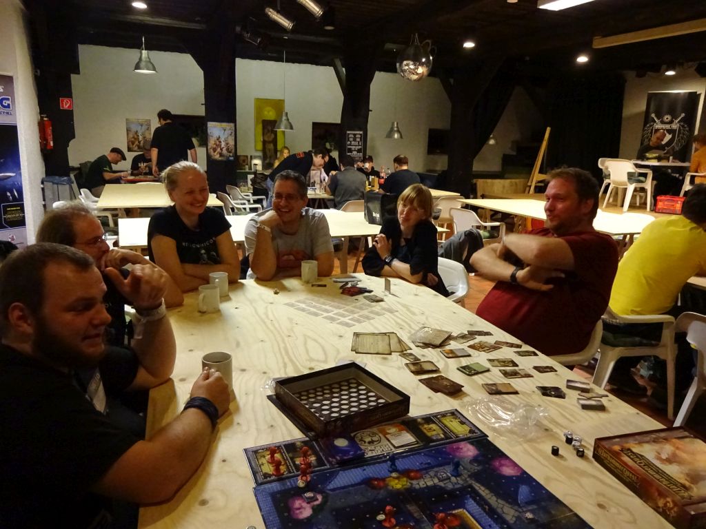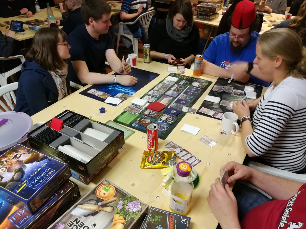 NT24: Bei frischem, wenn doch trockenem Wetter, öffneten sich die Pforten gegen 17:30 Uhr und der Run auf die Tassen im JD Style konnte beginnen. Mit Flatrate und Proviant gewappnet ging es auch schon an die Spieltische. Wer hingegen etwas Kultur genießen wollte, war in der Lesung mit Bernhard Hennen genau richtig. Als der Chilimeister zum Mitternachtsimbiss rief und auch der letzte eine Spielrunde oder bereits einen Platz im Schlafraum der neuen Kita gefunden hatte, ging der Freitag mit einem neuen Besucherrekord von 212 Gästen zu Ende. Am Samstag sollte es spannend werden, ob der Wegfall des Obergeschosses im Jugendhaus auf die Tischreserven auswirken sollte, doch dem war nicht so. Auch einem erneuten Wurststau konnte entgegengewirkt werden, trotz dessen es zu kurzen Wartezeiten beim Grillmeister kam. Mit der Wunschlesung von Bernhard Hennen und Tom Daut wurde auch der Samstag Nachmittag literarisch aufgewertet. Bei der Tombola am Abend konnte man gleich zu Beginn, oder doch am Ende, den verwirrten Gästen eine Besucherzahl von 310 präsentieren. Am Sonntag sollte, ausser beim Grillmeister nichts mehr anbrennen. Die Besucher die es bis dahin geschafft hatten gegen die Müdigkeit anzukämpfen nutzten nochmal ihre Flatrate und spielten bis zur letzten Minute. Mit 321 Gästen, ging die an der Besucherzahl gemessene zweit stärkste Märzveranstaltung zu Ende.