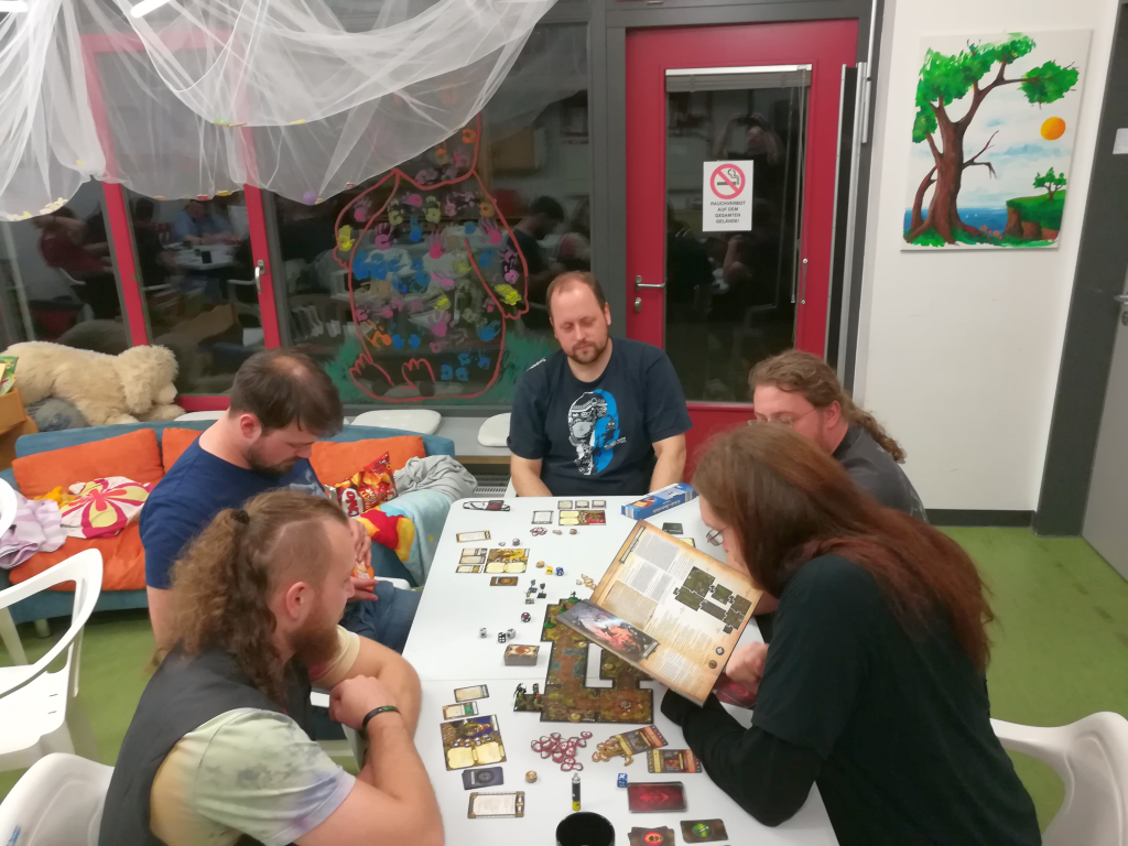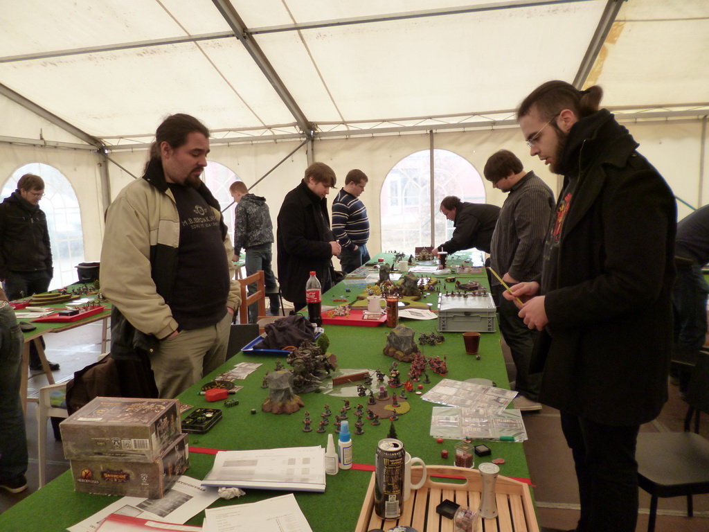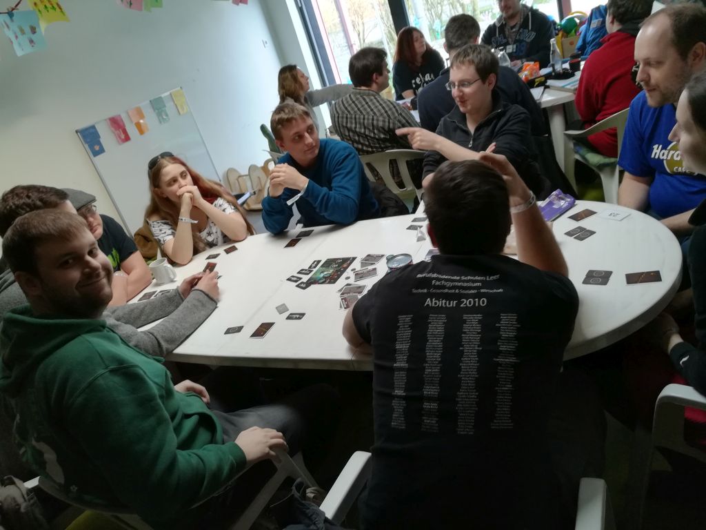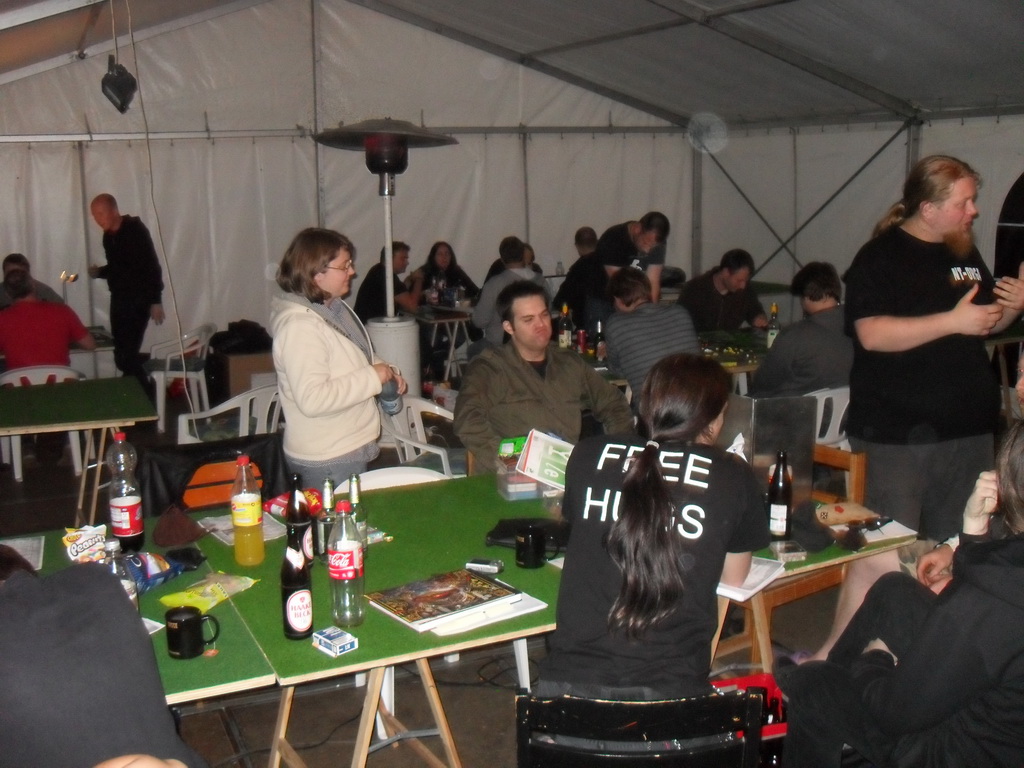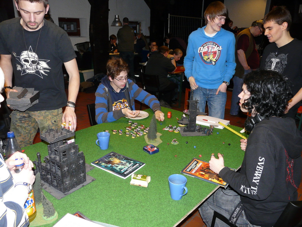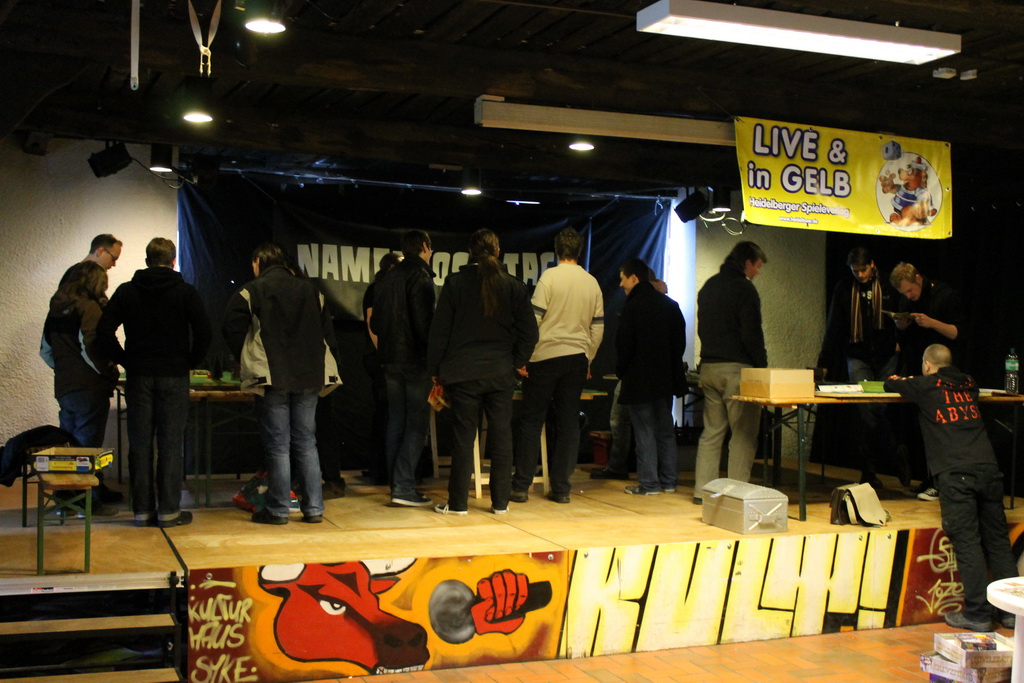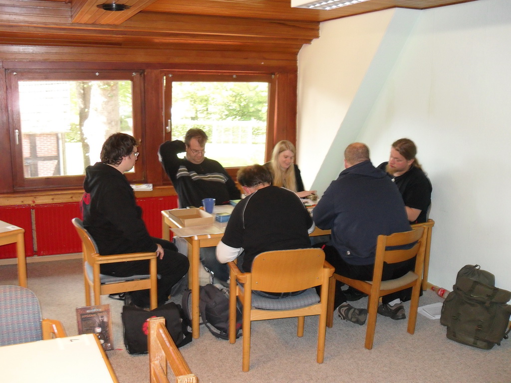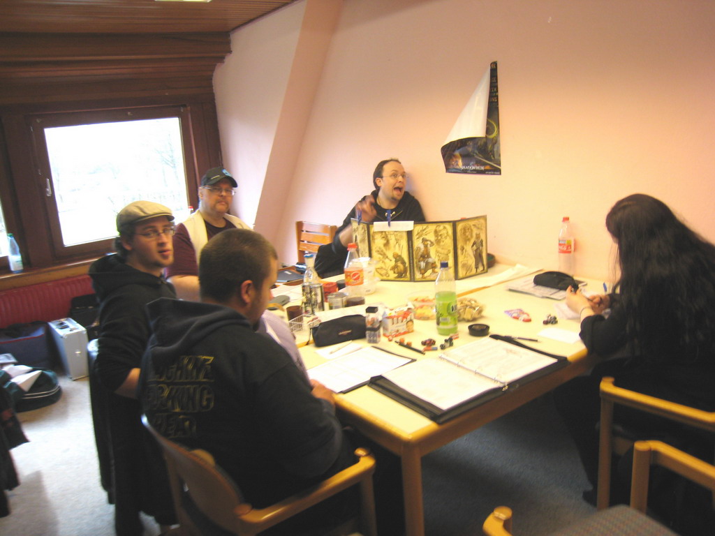 NT24: Bei frischem, wenn doch trockenem Wetter, öffneten sich die Pforten gegen 17:30 Uhr und der Run auf die Tassen im JD Style konnte beginnen. Mit Flatrate und Proviant gewappnet ging es auch schon an die Spieltische. Wer hingegen etwas Kultur genießen wollte, war in der Lesung mit Bernhard Hennen genau richtig. Als der Chilimeister zum Mitternachtsimbiss rief und auch der letzte eine Spielrunde oder bereits einen Platz im Schlafraum der neuen Kita gefunden hatte, ging der Freitag mit einem neuen Besucherrekord von 212 Gästen zu Ende. Am Samstag sollte es spannend werden, ob der Wegfall des Obergeschosses im Jugendhaus auf die Tischreserven auswirken sollte, doch dem war nicht so. Auch einem erneuten Wurststau konnte entgegengewirkt werden, trotz dessen es zu kurzen Wartezeiten beim Grillmeister kam. Mit der Wunschlesung von Bernhard Hennen und Tom Daut wurde auch der Samstag Nachmittag literarisch aufgewertet. Bei der Tombola am Abend konnte man gleich zu Beginn, oder doch am Ende, den verwirrten Gästen eine Besucherzahl von 310 präsentieren. Am Sonntag sollte, ausser beim Grillmeister nichts mehr anbrennen. Die Besucher die es bis dahin geschafft hatten gegen die Müdigkeit anzukämpfen nutzten nochmal ihre Flatrate und spielten bis zur letzten Minute. Mit 321 Gästen, ging die an der Besucherzahl gemessene zweit stärkste Märzveranstaltung zu Ende.
