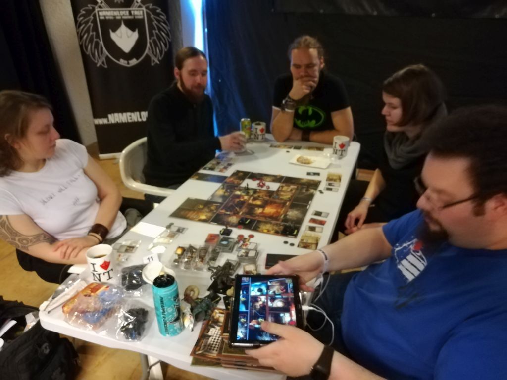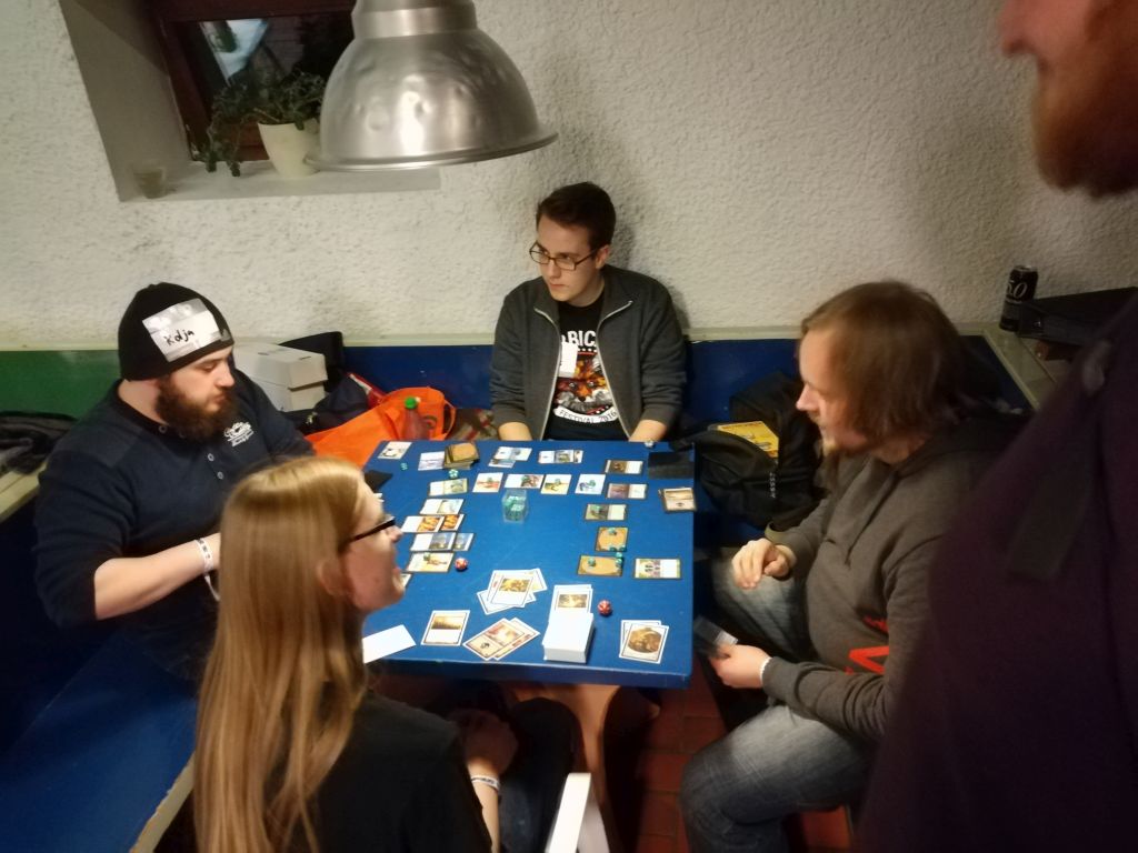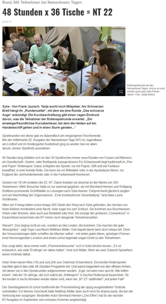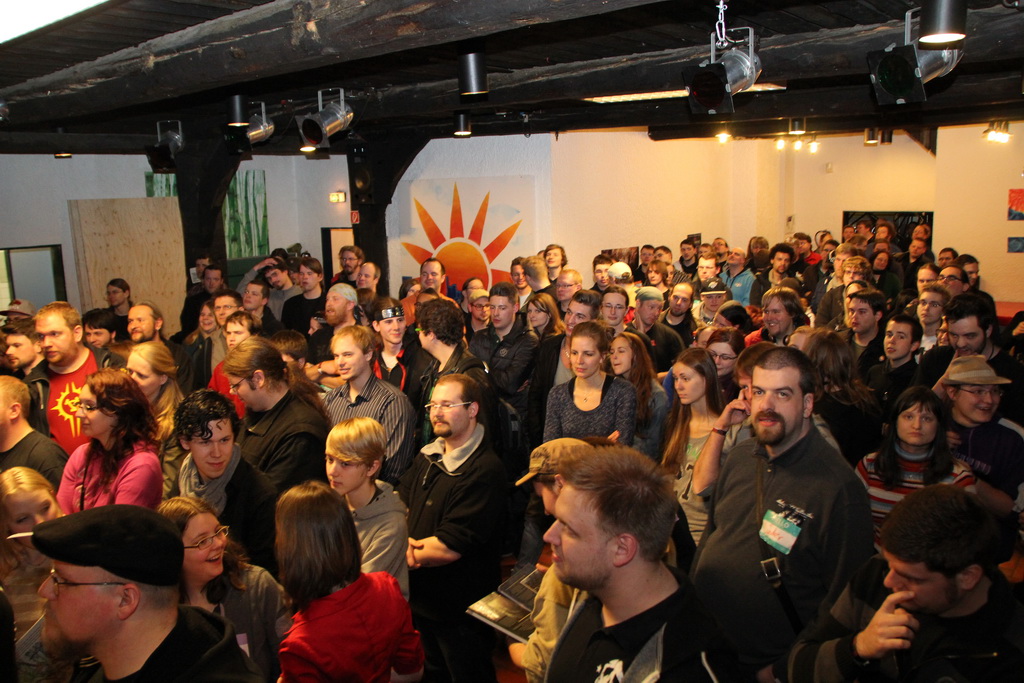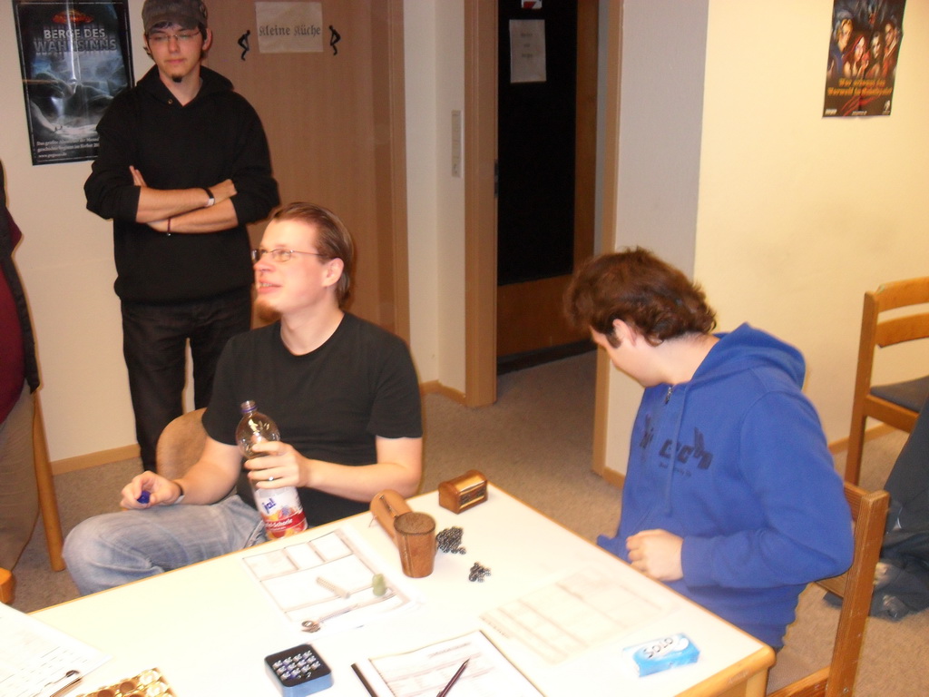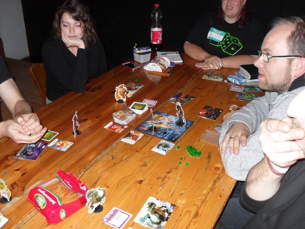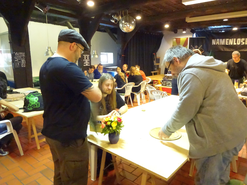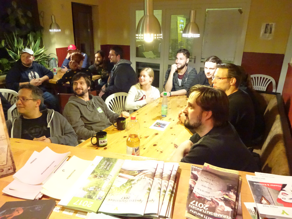 NT24: Bei frischem, wenn doch trockenem Wetter, öffneten sich die Pforten gegen 17:30 Uhr und der Run auf die Tassen im JD Style konnte beginnen. Mit Flatrate und Proviant gewappnet ging es auch schon an die Spieltische. Wer hingegen etwas Kultur genießen wollte, war in der Lesung mit Bernhard Hennen genau richtig. Als der Chilimeister zum Mitternachtsimbiss rief und auch der letzte eine Spielrunde oder bereits einen Platz im Schlafraum der neuen Kita gefunden hatte, ging der Freitag mit einem neuen Besucherrekord von 212 Gästen zu Ende. Am Samstag sollte es spannend werden, ob der Wegfall des Obergeschosses im Jugendhaus auf die Tischreserven auswirken sollte, doch dem war nicht so. Auch einem erneuten Wurststau konnte entgegengewirkt werden, trotz dessen es zu kurzen Wartezeiten beim Grillmeister kam. Mit der Wunschlesung von Bernhard Hennen und Tom Daut wurde auch der Samstag Nachmittag literarisch aufgewertet. Bei der Tombola am Abend konnte man gleich zu Beginn, oder doch am Ende, den verwirrten Gästen eine Besucherzahl von 310 präsentieren. Am Sonntag sollte, ausser beim Grillmeister nichts mehr anbrennen. Die Besucher die es bis dahin geschafft hatten gegen die Müdigkeit anzukämpfen nutzten nochmal ihre Flatrate und spielten bis zur letzten Minute. Mit 321 Gästen, ging die an der Besucherzahl gemessene zweit stärkste Märzveranstaltung zu Ende.