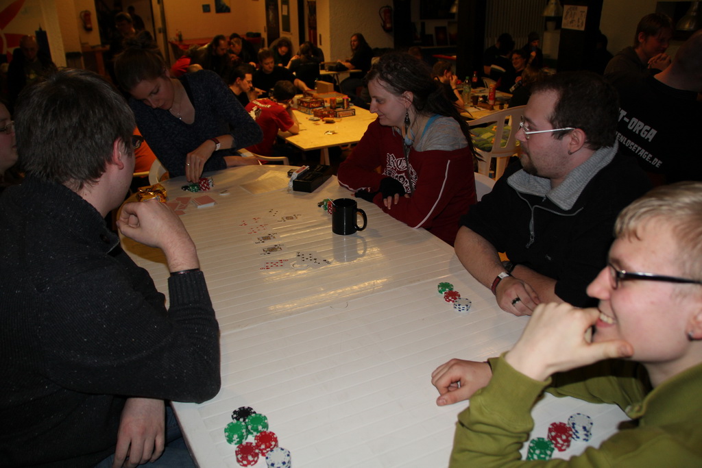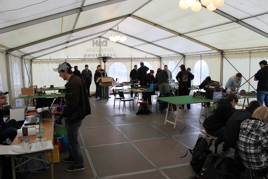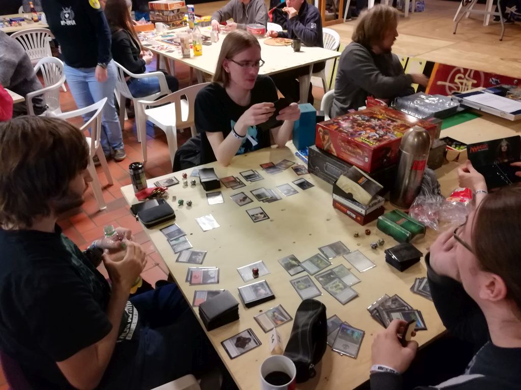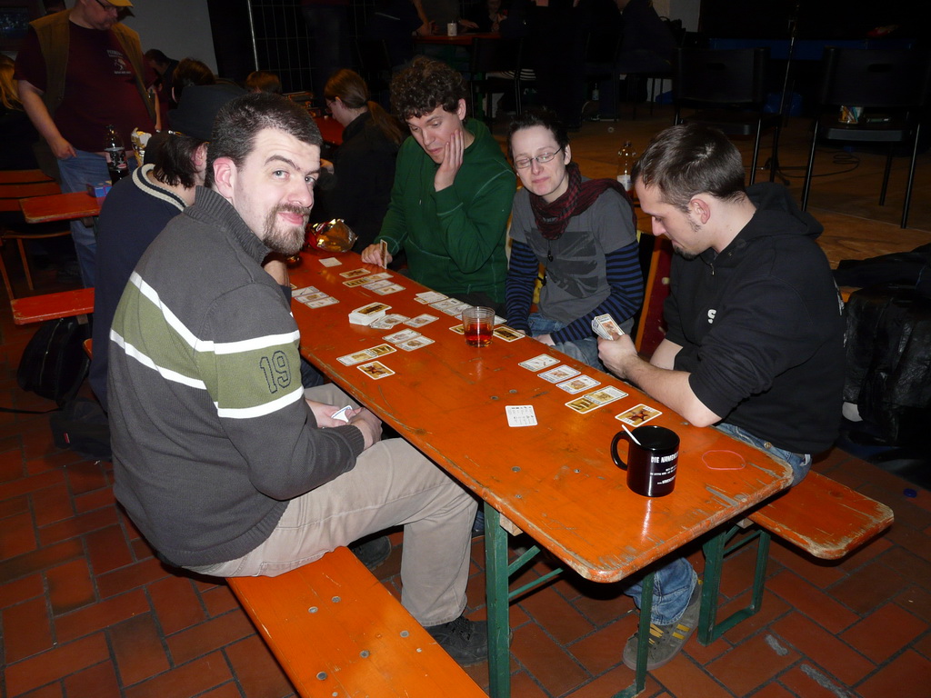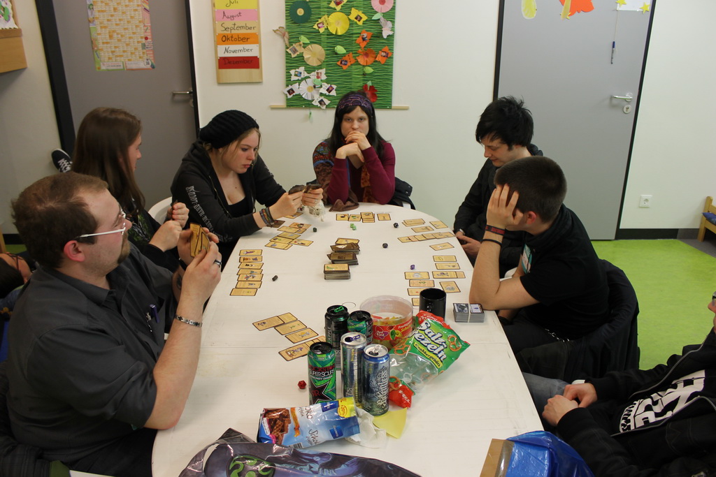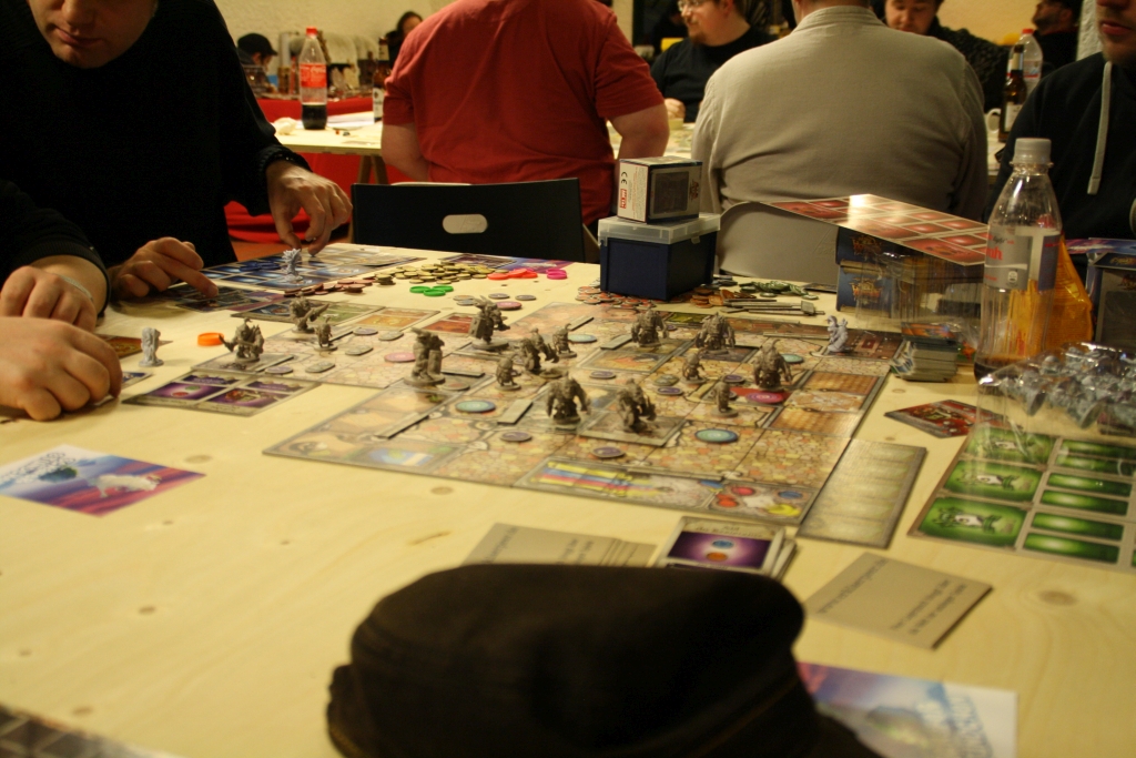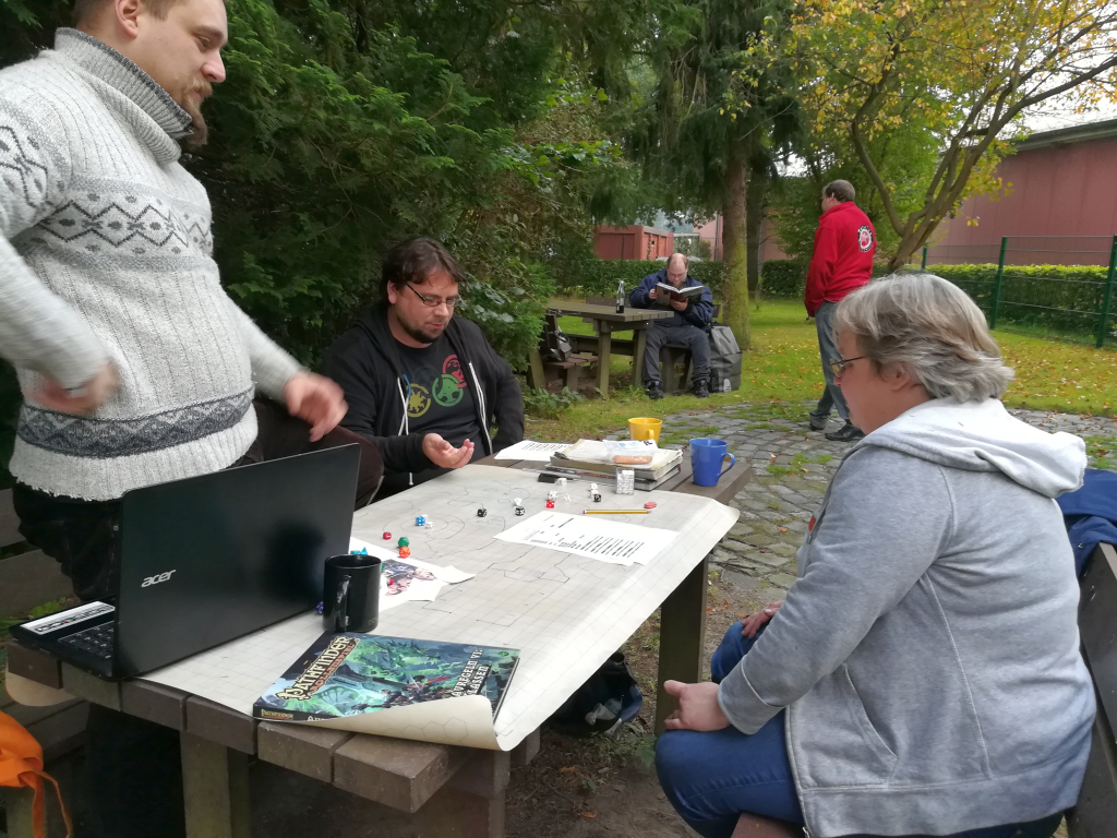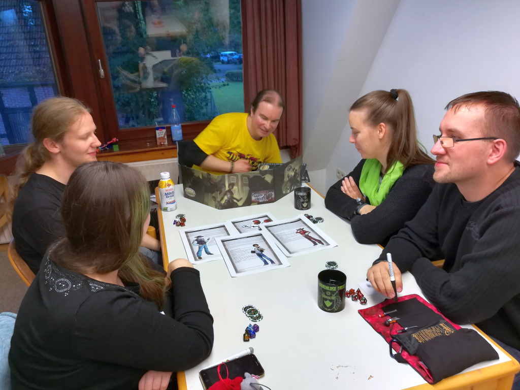 NT24: Bei frischem, wenn doch trockenem Wetter, öffneten sich die Pforten gegen 17:30 Uhr und der Run auf die Tassen im JD Style konnte beginnen. Mit Flatrate und Proviant gewappnet ging es auch schon an die Spieltische. Wer hingegen etwas Kultur genießen wollte, war in der Lesung mit Bernhard Hennen genau richtig. Als der Chilimeister zum Mitternachtsimbiss rief und auch der letzte eine Spielrunde oder bereits einen Platz im Schlafraum der neuen Kita gefunden hatte, ging der Freitag mit einem neuen Besucherrekord von 212 Gästen zu Ende. Am Samstag sollte es spannend werden, ob der Wegfall des Obergeschosses im Jugendhaus auf die Tischreserven auswirken sollte, doch dem war nicht so. Auch einem erneuten Wurststau konnte entgegengewirkt werden, trotz dessen es zu kurzen Wartezeiten beim Grillmeister kam. Mit der Wunschlesung von Bernhard Hennen und Tom Daut wurde auch der Samstag Nachmittag literarisch aufgewertet. Bei der Tombola am Abend konnte man gleich zu Beginn, oder doch am Ende, den verwirrten Gästen eine Besucherzahl von 310 präsentieren. Am Sonntag sollte, ausser beim Grillmeister nichts mehr anbrennen. Die Besucher die es bis dahin geschafft hatten gegen die Müdigkeit anzukämpfen nutzten nochmal ihre Flatrate und spielten bis zur letzten Minute. Mit 321 Gästen, ging die an der Besucherzahl gemessene zweit stärkste Märzveranstaltung zu Ende.