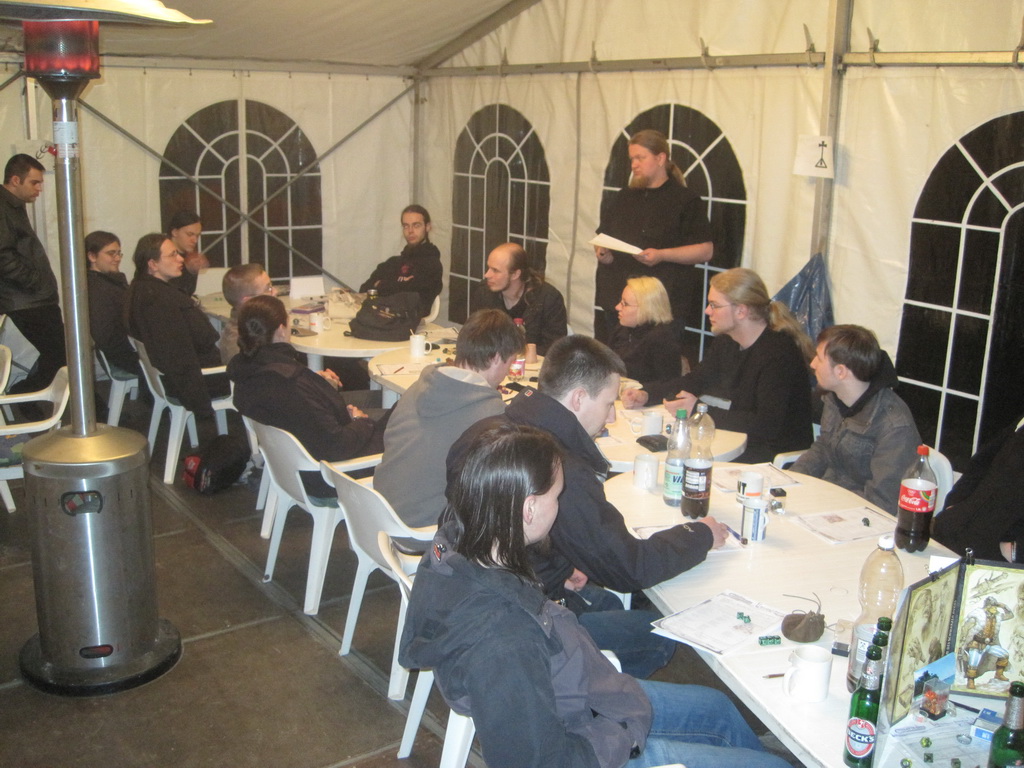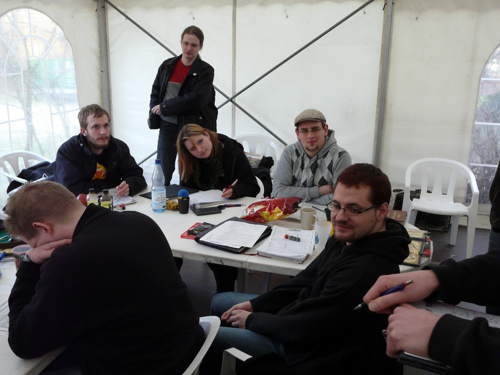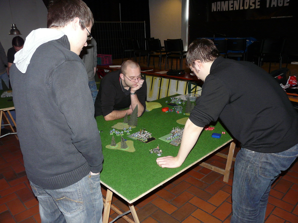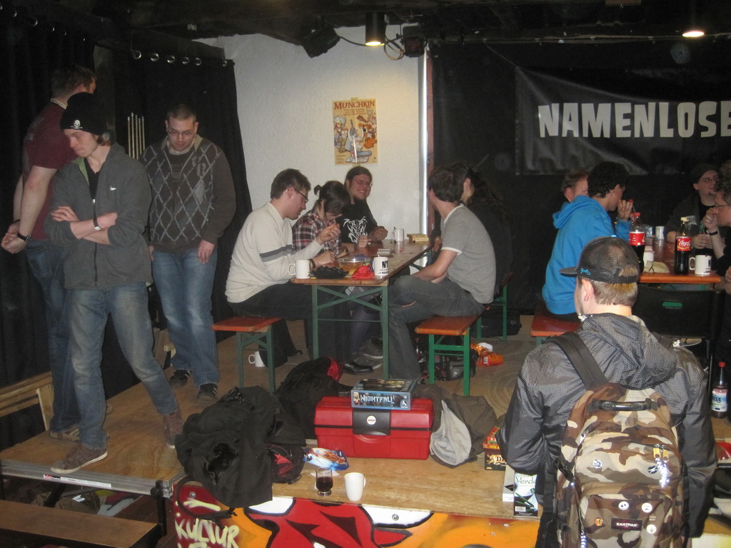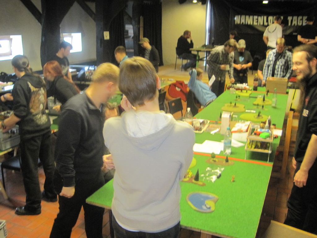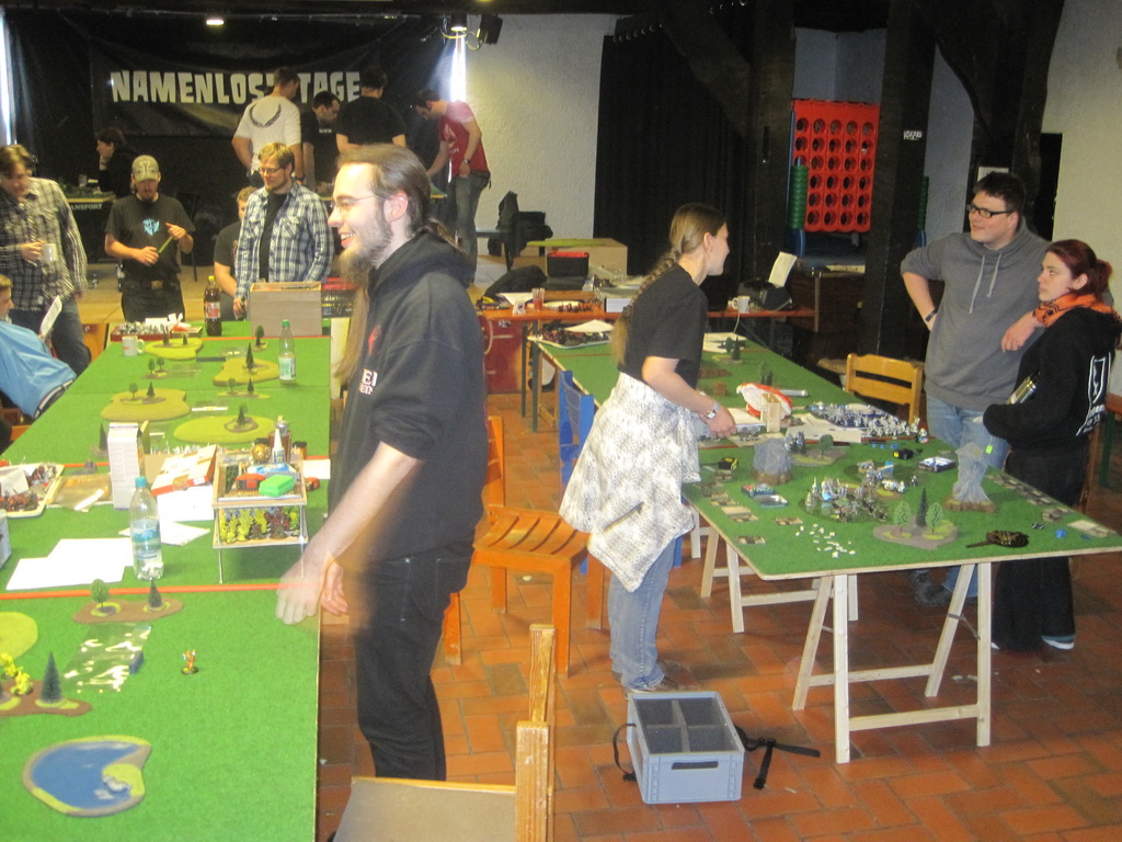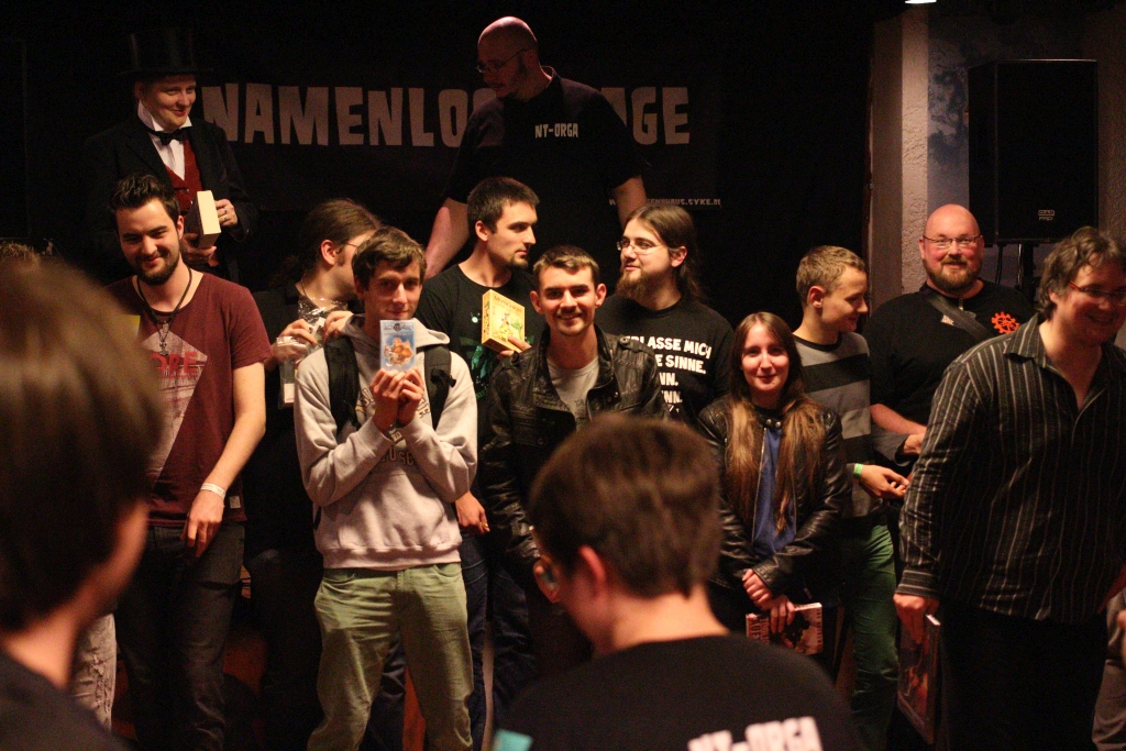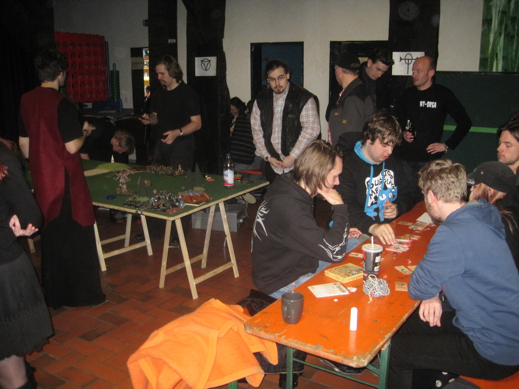 NT12: Ein eiskalter Wind schien die Besucher am Freitag der Veranstaltung in unser warmes Haus zu treiben. Man sammelte sich kurze Hand in kleinen Gruppen und begann das Haus zu einem Gesellschaftsspiel Tempel umzubauen. Eine noch nie gesehene Vielfalt an Brett- und Kartenspielen überraschte genauso, wie die neue Rekordmarke von 121 Besucher für den ersten Abend. Der Samstag wurde sowohl von weiteren eintreffenden Gästen, als auch dem Warhammer Fantasy Turnier eingeleitet. Der Himmel klarte nur für wenige Sonnenstrahlen auf, bevor der eisige Wind die Wolken wieder zu einer grauen Masse verband. Die Rollenspieler kuschelten sich zusammen und liefen, wie der Heizpilz im Zelt, zur Höchstform auf. Bis zum Abend waren das Haus und die Spielrunden ausgefüllt und den Besuchern wurde vor der Tombola durch eine kleine Feuershow noch einmal kräftig eingeheizt. Im Anschluss konnte verkündet werden, das bereits 185 Gäste den Weg zur NT gefunden haben und dann wurden sich Spielorte für die Nacht gesucht. Das traditionelle Pokerturnier zur späten Stunde konnte erneut eine Rekordteilnehmerzahl verkünden und der Gewinner der Letzten Veranstaltung musste sich geschlagen geben, da ein neuer Champion gekürt wurde. Der Sonntag startete mit dem Eintreffen der Warmaschine Hordes Leuten, welche noch einmal für eine kleine Steigerung der Besucher beitragen konnten. Durch das Nichtzustandekommen der beiden traditionellen Eckpunkte am Sonntag, Magic Turnier und Bogenschießen, blieb auch ein weiterer Schwung neuer Leute verwehrt. Dennoch blühten die Gesellschafts- und Rollenspielbereiche auf und verlebten einen ruhigen Ausklang der Veranstaltung. Zum Schluss der Veranstaltung konnten 208 Besucher gezählt werden und man sah zufrieden den 6 Monate später stattfinden 13. Namenlosen Tagen entgegen... dem Ende.