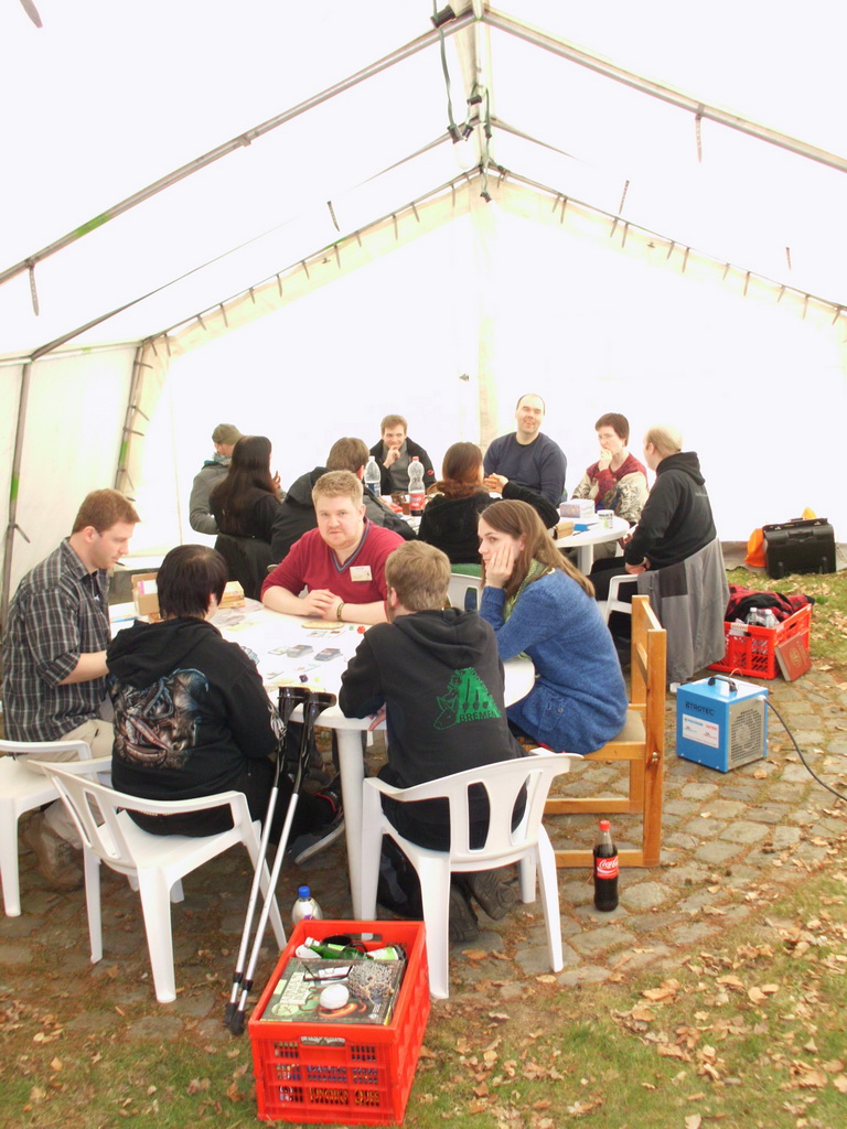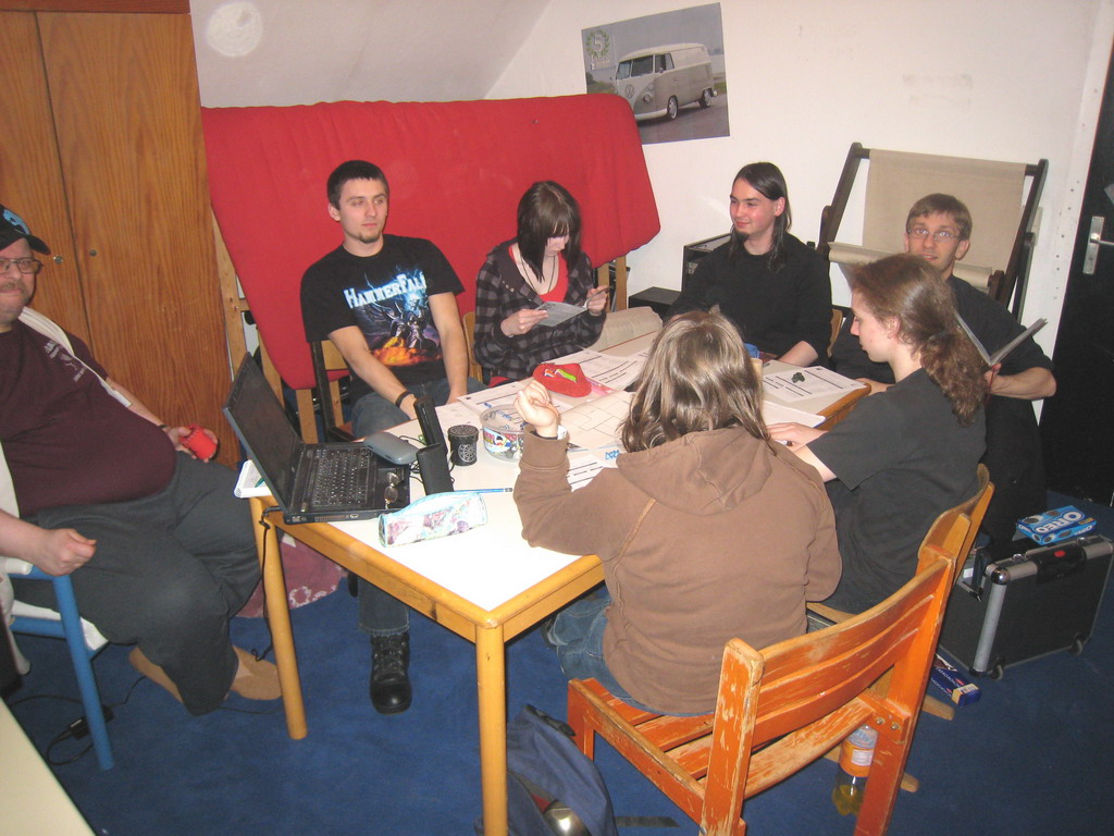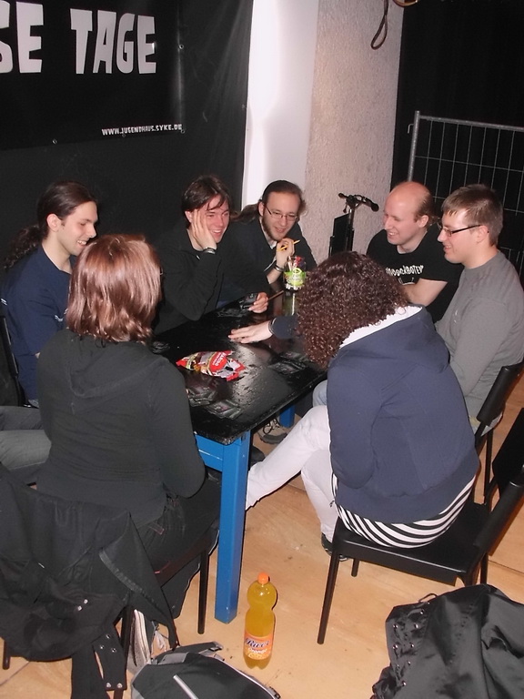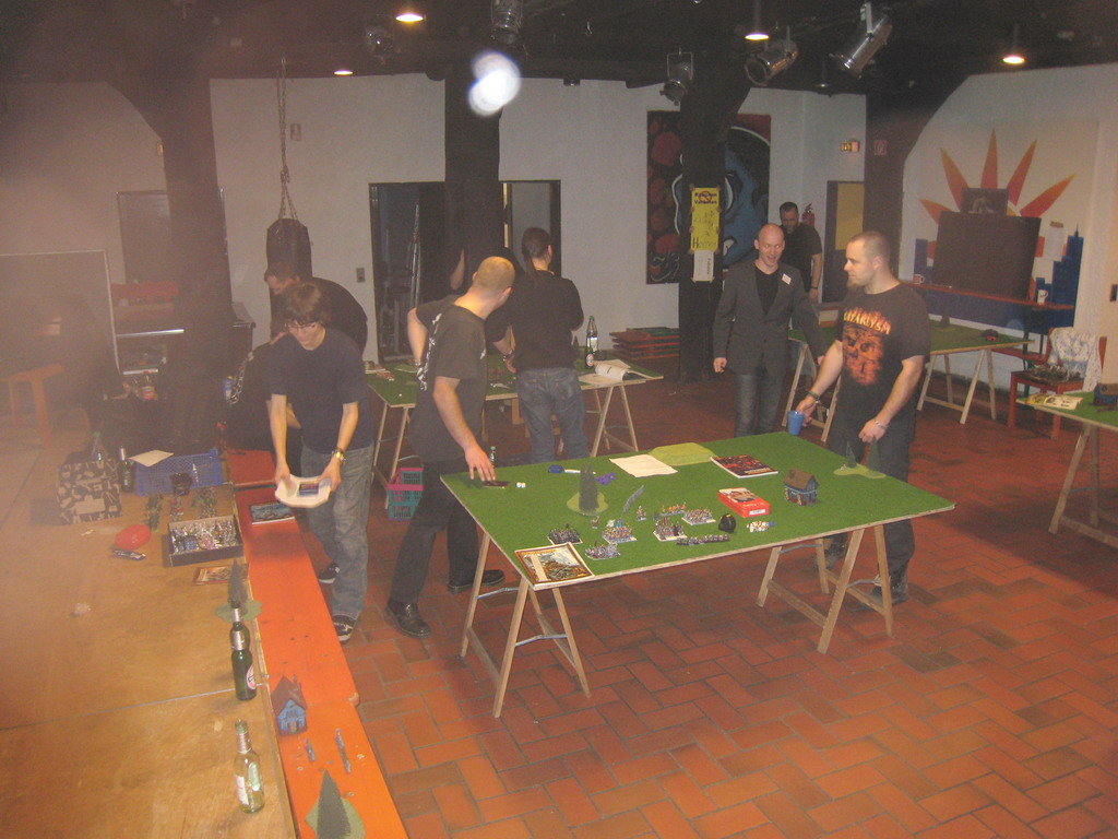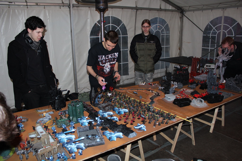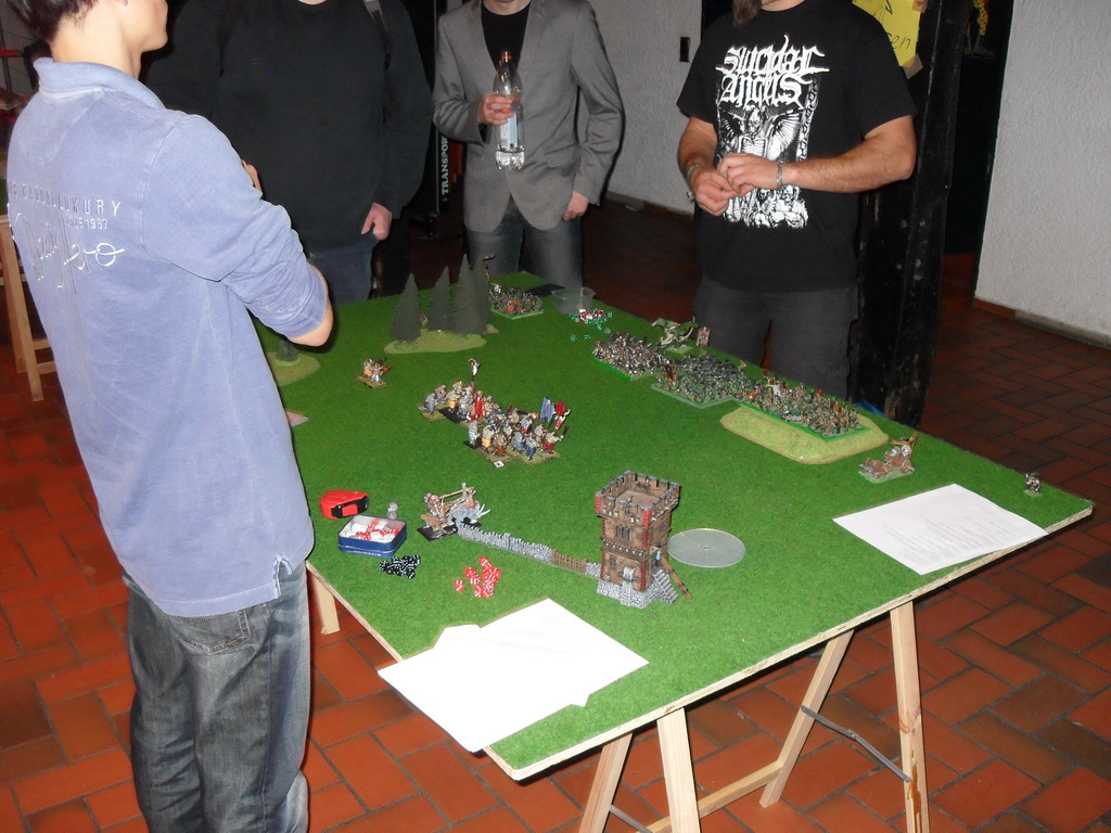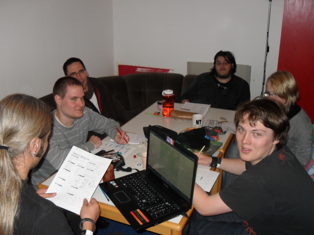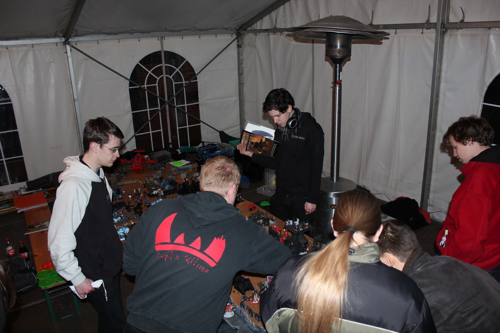NT12: Ein eiskalter Wind schien die Besucher am Freitag der Veranstaltung in unser warmes Haus zu treiben. Man sammelte sich kurze Hand in kleinen Gruppen und begann das Haus zu einem Gesellschaftsspiel Tempel umzubauen. Eine noch nie gesehene Vielfalt an Brett- und Kartenspielen überraschte genauso, wie die neue Rekordmarke von 121 Besucher für den ersten Abend. Der Samstag wurde sowohl von weiteren eintreffenden Gästen, als auch dem Warhammer Fantasy Turnier eingeleitet. Der Himmel klarte nur für wenige Sonnenstrahlen auf, bevor der eisige Wind die Wolken wieder zu einer grauen Masse verband. Die Rollenspieler kuschelten sich zusammen und liefen, wie der Heizpilz im Zelt, zur Höchstform auf. Bis zum Abend waren das Haus und die Spielrunden ausgefüllt und den Besuchern wurde vor der Tombola durch eine kleine Feuershow noch einmal kräftig eingeheizt. Im Anschluss konnte verkündet werden, das bereits 185 Gäste den Weg zur NT gefunden haben und dann wurden sich Spielorte für die Nacht gesucht. Das traditionelle Pokerturnier zur späten Stunde konnte erneut eine Rekordteilnehmerzahl verkünden und der Gewinner der Letzten Veranstaltung musste sich geschlagen geben, da ein neuer Champion gekürt wurde. Der Sonntag startete mit dem Eintreffen der Warmaschine Hordes Leuten, welche noch einmal für eine kleine Steigerung der Besucher beitragen konnten. Durch das Nichtzustandekommen der beiden traditionellen Eckpunkte am Sonntag, Magic Turnier und Bogenschießen, blieb auch ein weiterer Schwung neuer Leute verwehrt. Dennoch blühten die Gesellschafts- und Rollenspielbereiche auf und verlebten einen ruhigen Ausklang der Veranstaltung. Zum Schluss der Veranstaltung konnten 208 Besucher gezählt werden und man sah zufrieden den 6 Monate später stattfinden 13. Namenlosen Tagen entgegen... dem Ende.