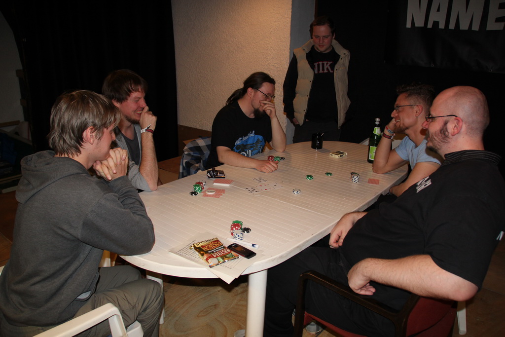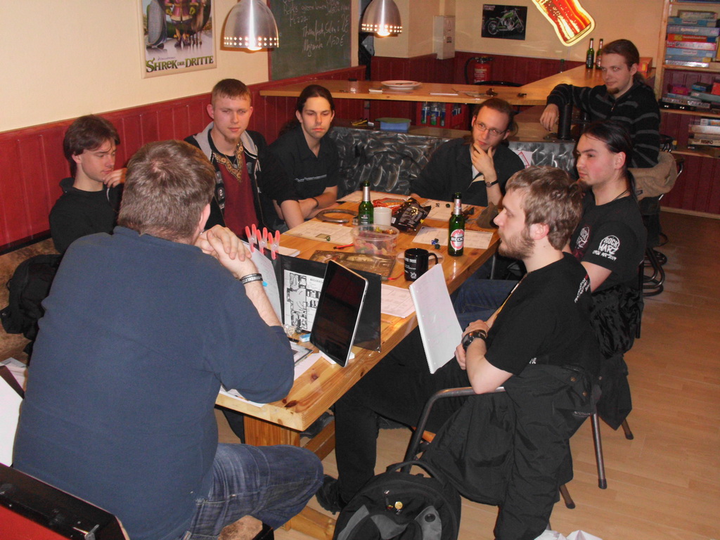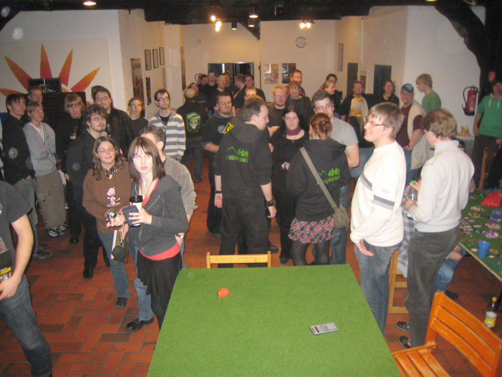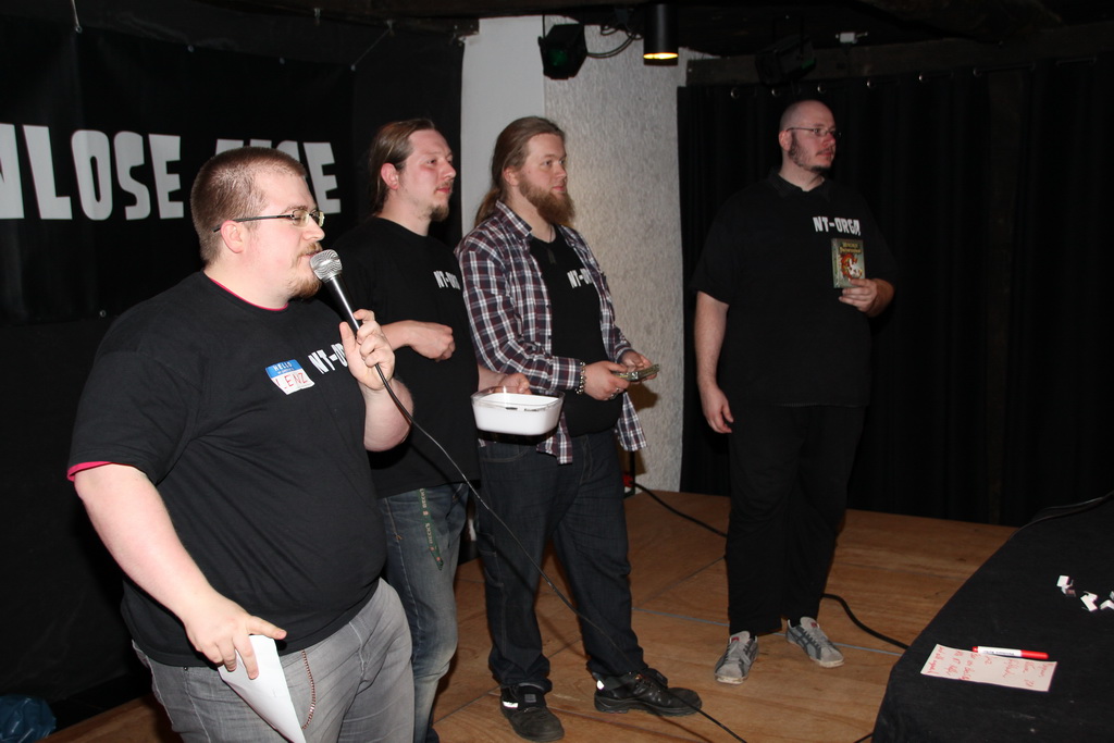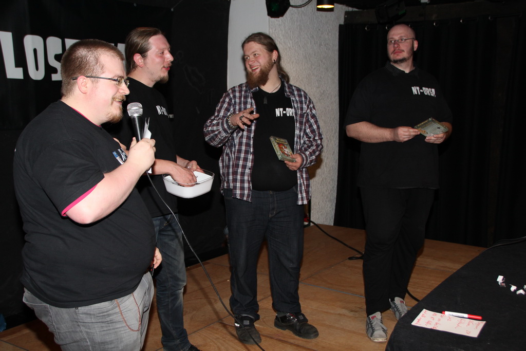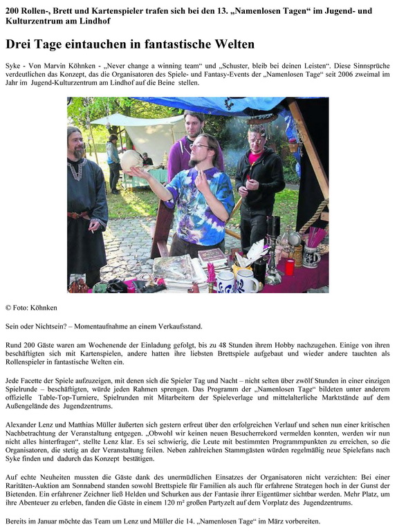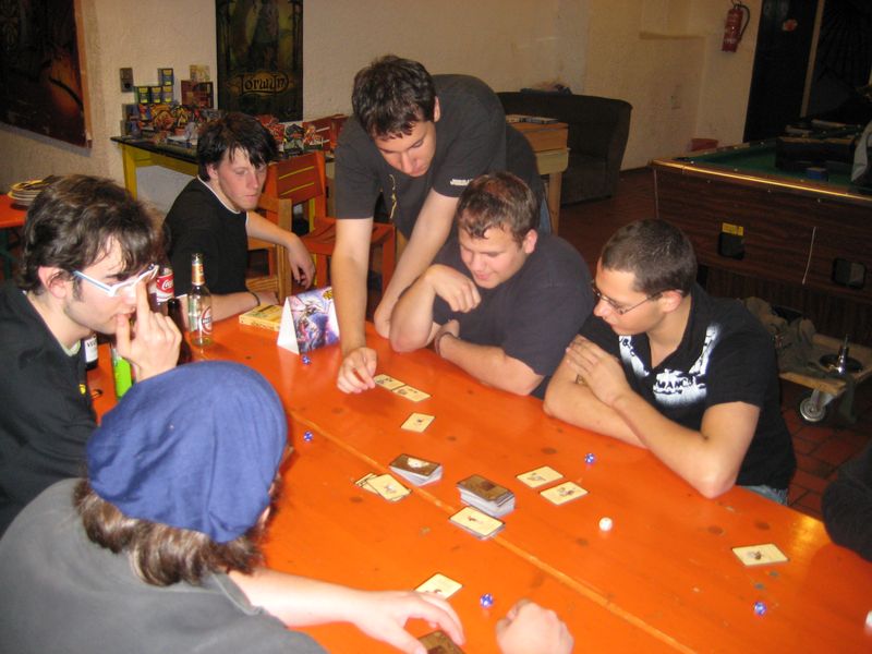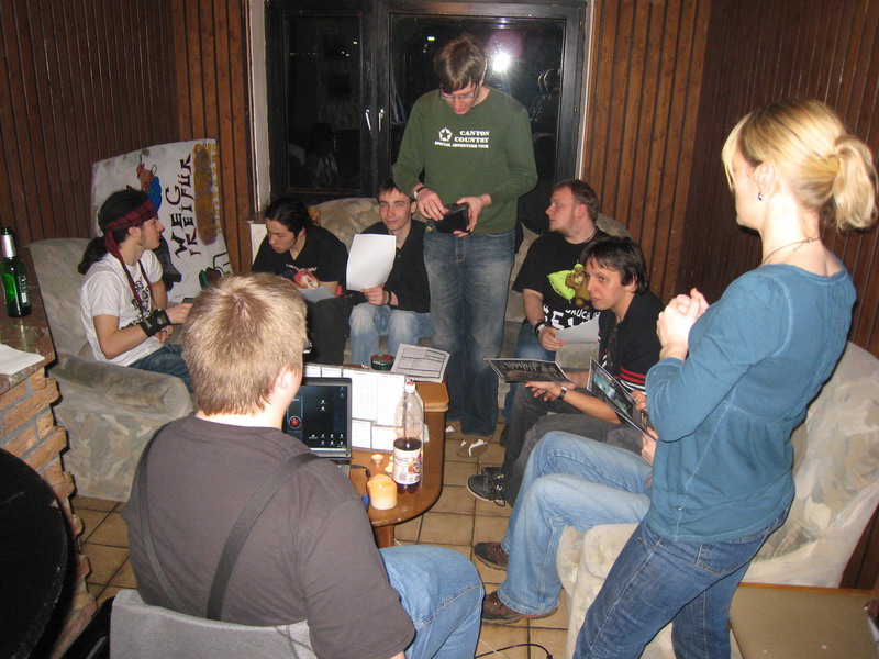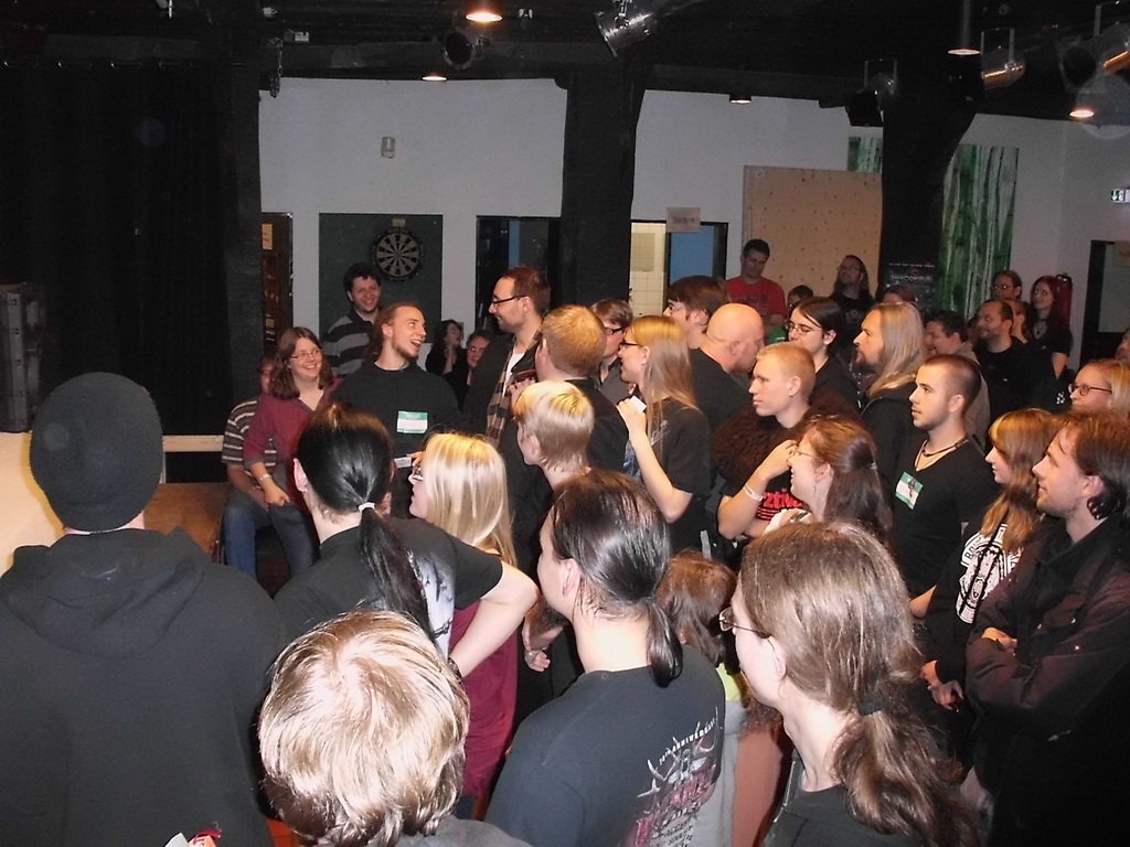 NT12: Ein eiskalter Wind schien die Besucher am Freitag der Veranstaltung in unser warmes Haus zu treiben. Man sammelte sich kurze Hand in kleinen Gruppen und begann das Haus zu einem Gesellschaftsspiel Tempel umzubauen. Eine noch nie gesehene Vielfalt an Brett- und Kartenspielen überraschte genauso, wie die neue Rekordmarke von 121 Besucher für den ersten Abend. Der Samstag wurde sowohl von weiteren eintreffenden Gästen, als auch dem Warhammer Fantasy Turnier eingeleitet. Der Himmel klarte nur für wenige Sonnenstrahlen auf, bevor der eisige Wind die Wolken wieder zu einer grauen Masse verband. Die Rollenspieler kuschelten sich zusammen und liefen, wie der Heizpilz im Zelt, zur Höchstform auf. Bis zum Abend waren das Haus und die Spielrunden ausgefüllt und den Besuchern wurde vor der Tombola durch eine kleine Feuershow noch einmal kräftig eingeheizt. Im Anschluss konnte verkündet werden, das bereits 185 Gäste den Weg zur NT gefunden haben und dann wurden sich Spielorte für die Nacht gesucht. Das traditionelle Pokerturnier zur späten Stunde konnte erneut eine Rekordteilnehmerzahl verkünden und der Gewinner der Letzten Veranstaltung musste sich geschlagen geben, da ein neuer Champion gekürt wurde. Der Sonntag startete mit dem Eintreffen der Warmaschine Hordes Leuten, welche noch einmal für eine kleine Steigerung der Besucher beitragen konnten. Durch das Nichtzustandekommen der beiden traditionellen Eckpunkte am Sonntag, Magic Turnier und Bogenschießen, blieb auch ein weiterer Schwung neuer Leute verwehrt. Dennoch blühten die Gesellschafts- und Rollenspielbereiche auf und verlebten einen ruhigen Ausklang der Veranstaltung. Zum Schluss der Veranstaltung konnten 208 Besucher gezählt werden und man sah zufrieden den 6 Monate später stattfinden 13. Namenlosen Tagen entgegen... dem Ende.