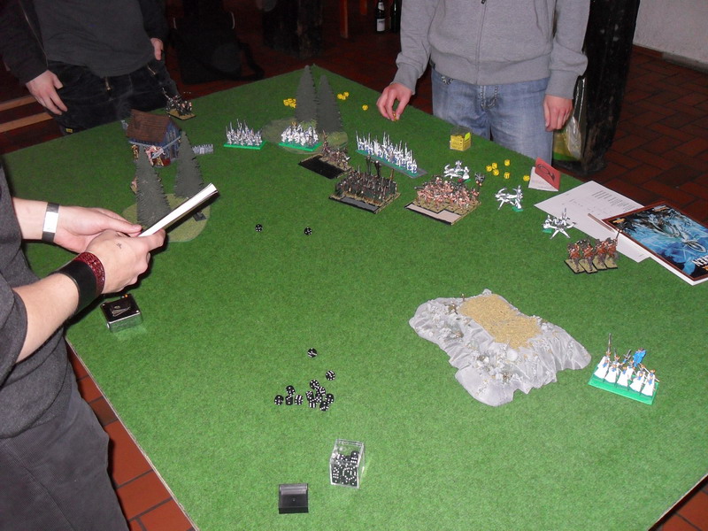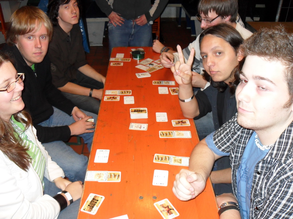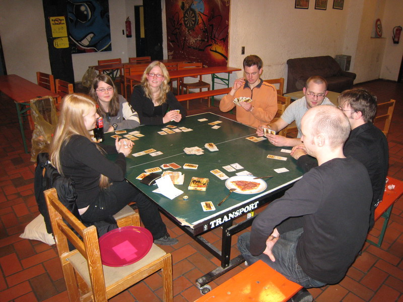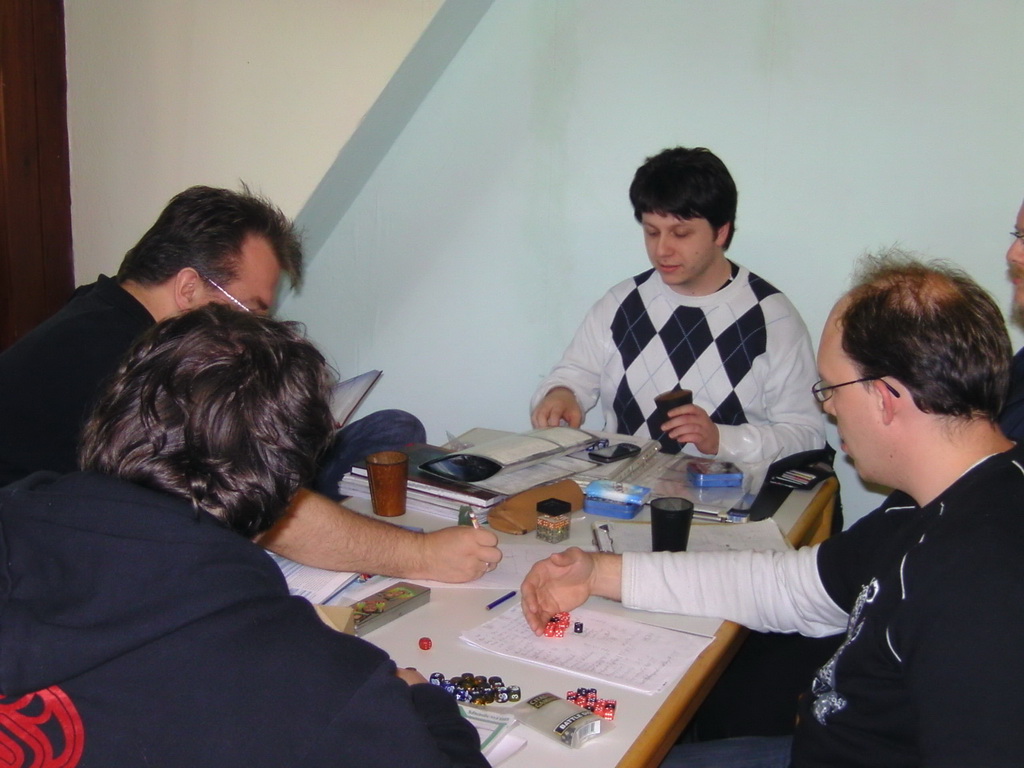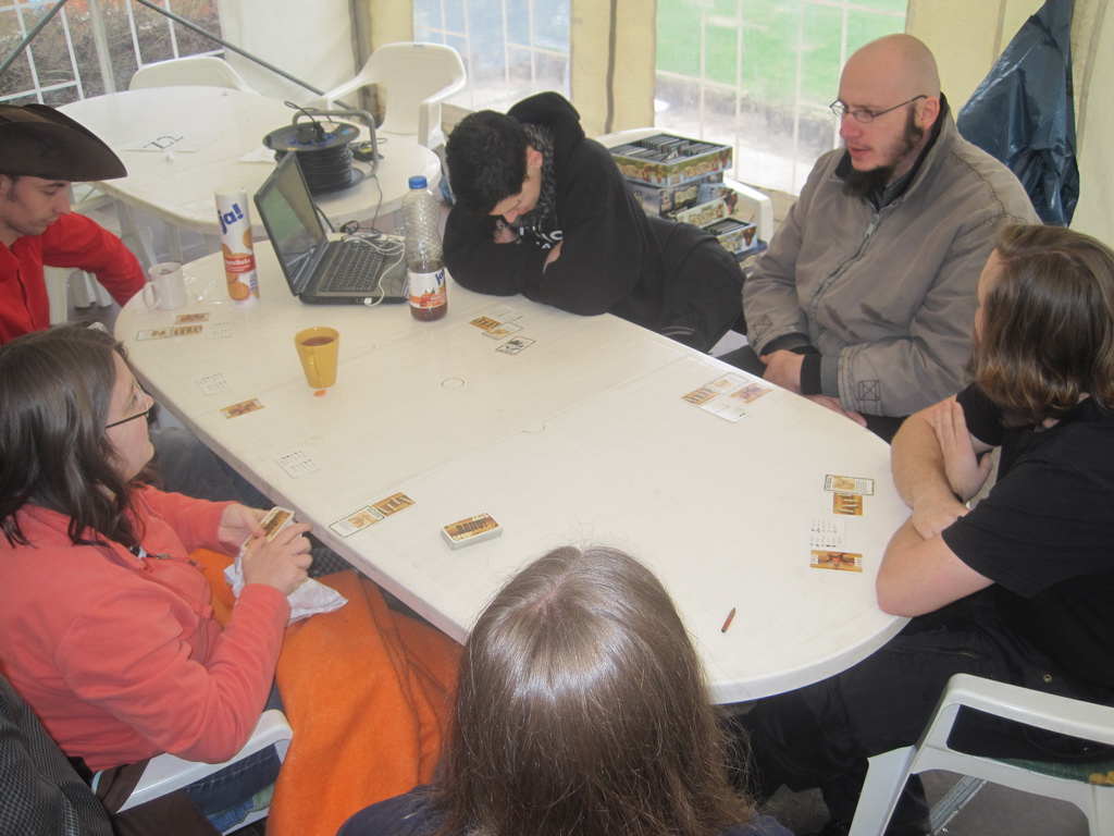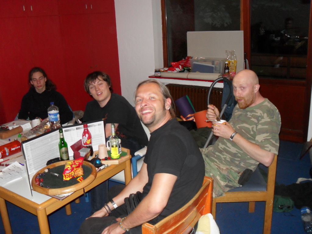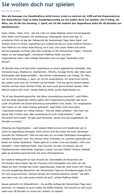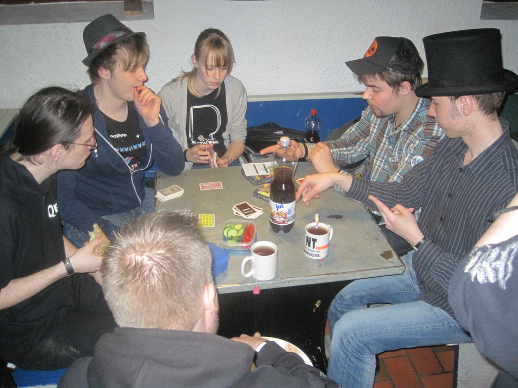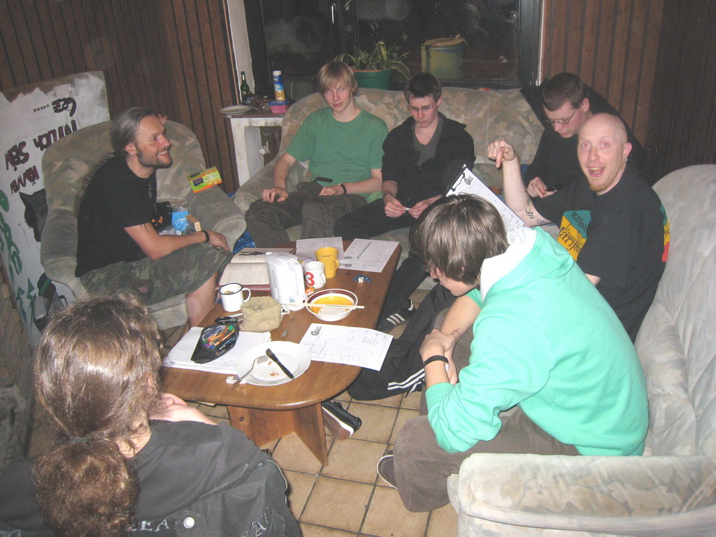NT12: Ein eiskalter Wind schien die Besucher am Freitag der Veranstaltung in unser warmes Haus zu treiben. Man sammelte sich kurze Hand in kleinen Gruppen und begann das Haus zu einem Gesellschaftsspiel Tempel umzubauen. Eine noch nie gesehene Vielfalt an Brett- und Kartenspielen überraschte genauso, wie die neue Rekordmarke von 121 Besucher für den ersten Abend. Der Samstag wurde sowohl von weiteren eintreffenden Gästen, als auch dem Warhammer Fantasy Turnier eingeleitet. Der Himmel klarte nur für wenige Sonnenstrahlen auf, bevor der eisige Wind die Wolken wieder zu einer grauen Masse verband. Die Rollenspieler kuschelten sich zusammen und liefen, wie der Heizpilz im Zelt, zur Höchstform auf. Bis zum Abend waren das Haus und die Spielrunden ausgefüllt und den Besuchern wurde vor der Tombola durch eine kleine Feuershow noch einmal kräftig eingeheizt. Im Anschluss konnte verkündet werden, das bereits 185 Gäste den Weg zur NT gefunden haben und dann wurden sich Spielorte für die Nacht gesucht. Das traditionelle Pokerturnier zur späten Stunde konnte erneut eine Rekordteilnehmerzahl verkünden und der Gewinner der Letzten Veranstaltung musste sich geschlagen geben, da ein neuer Champion gekürt wurde. Der Sonntag startete mit dem Eintreffen der Warmaschine Hordes Leuten, welche noch einmal für eine kleine Steigerung der Besucher beitragen konnten. Durch das Nichtzustandekommen der beiden traditionellen Eckpunkte am Sonntag, Magic Turnier und Bogenschießen, blieb auch ein weiterer Schwung neuer Leute verwehrt. Dennoch blühten die Gesellschafts- und Rollenspielbereiche auf und verlebten einen ruhigen Ausklang der Veranstaltung. Zum Schluss der Veranstaltung konnten 208 Besucher gezählt werden und man sah zufrieden den 6 Monate später stattfinden 13. Namenlosen Tagen entgegen... dem Ende.