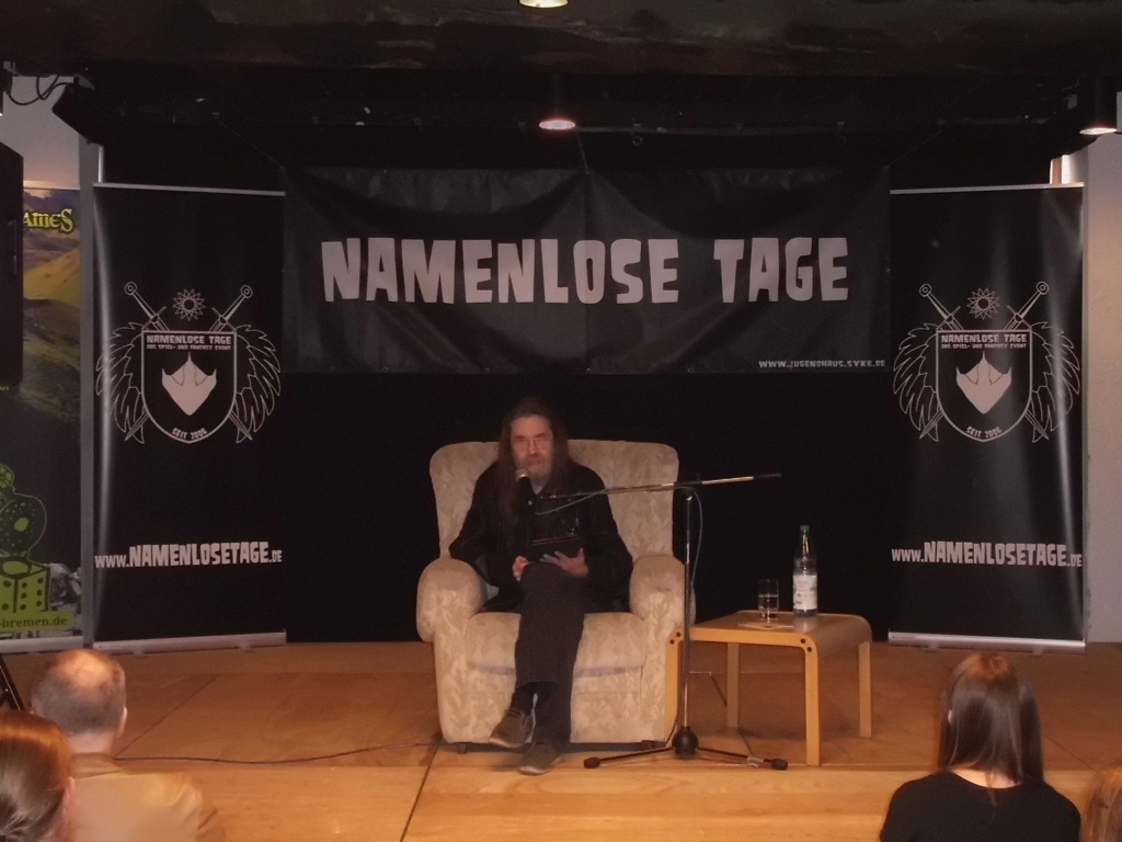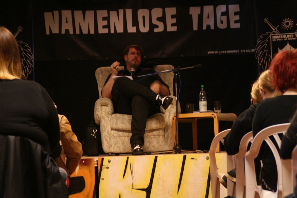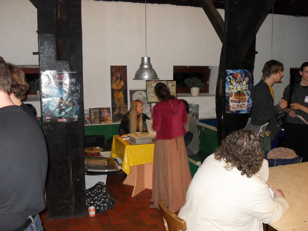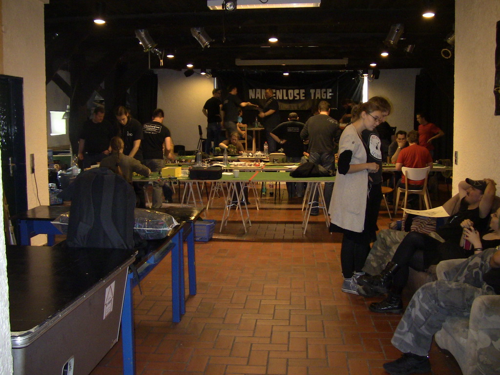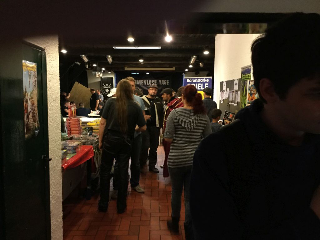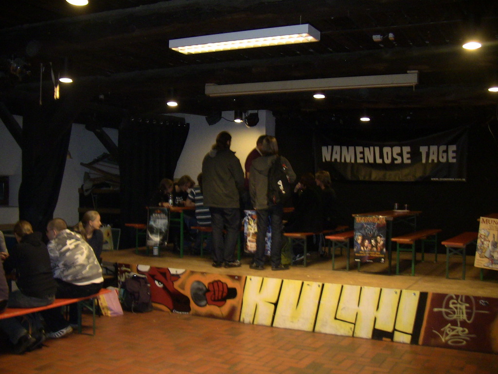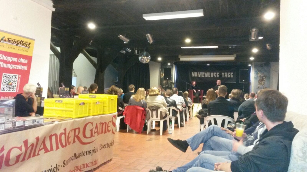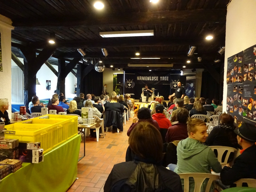 Im Vorfeld: Also irgendwie war von Anfang an der Wurm drin. Die Vorbereitungen zu den 24. Namenlosen Tagen waren ein auf und nieder und vor allem von Rückschlägen gezeichnet. Zunächst hatte man den Plan, die Menge der Spieltische um 10% zu erhöhen, da man den Schlafsaal in die neue, benachbarte Kita auslagern konnte und im Jugendhaus kleine bauliche Veränderungen vorgenommen wurden. Doch als es dann hieß, man könne die obere Etage nicht mehr nutzen, fing der Schlamassel an. Ursprünglich sollte Robert Corvus gemeinsam mit Bernhard Hennen am Freitag eine Lesung veranstalten, ersterer musste dann aber einem anderen Termin den Vorzug geben. Weitere kleine Probleme mussten aus dem Weg geräumt werden, aber als dann unsere lieb gewonnene Putzfrau in den verdienten Ruhestand ging, sah sich die Orga schon am Sonntag bis 0 Uhr im Kindergarten die Böden wischen. Letztendlich konnte in der letzten Woche vor den Namenlosen Tagen alles in die richtigen Bahnen gelenkt werden und man harrte gespannt der Dinge, die da kommen sollten.