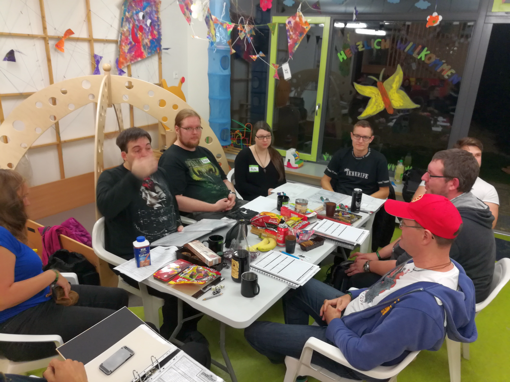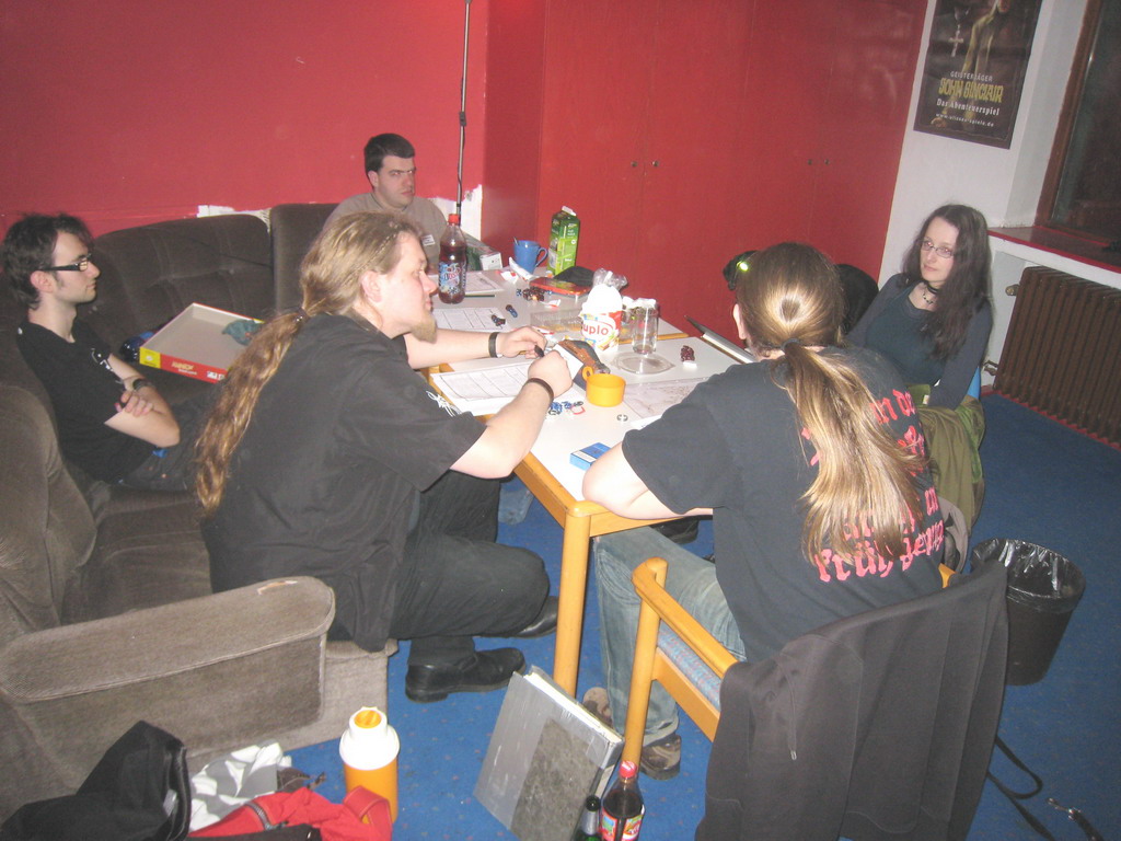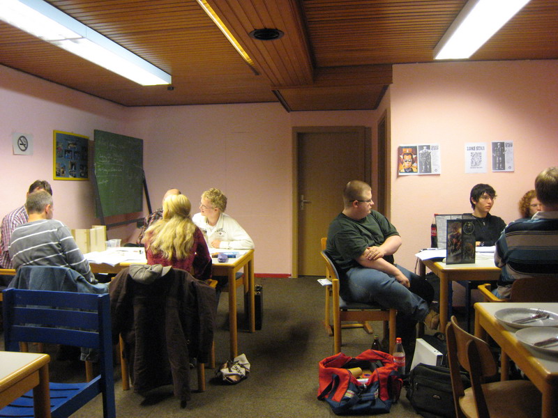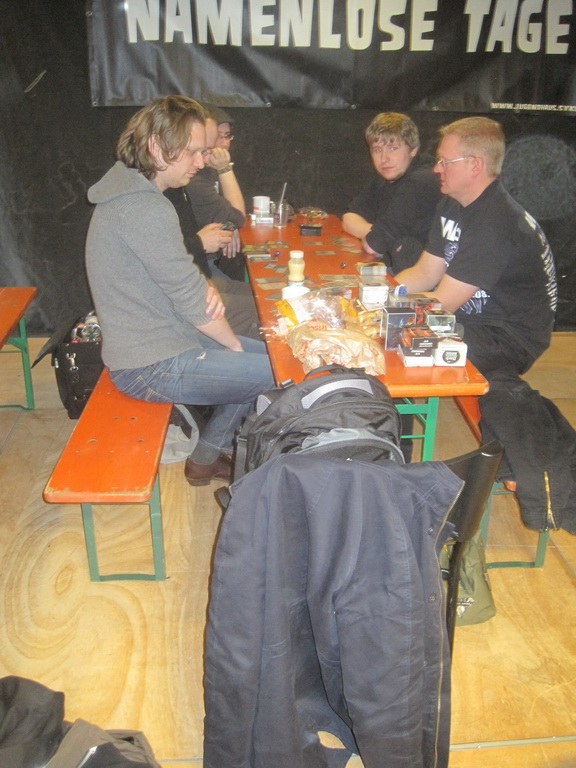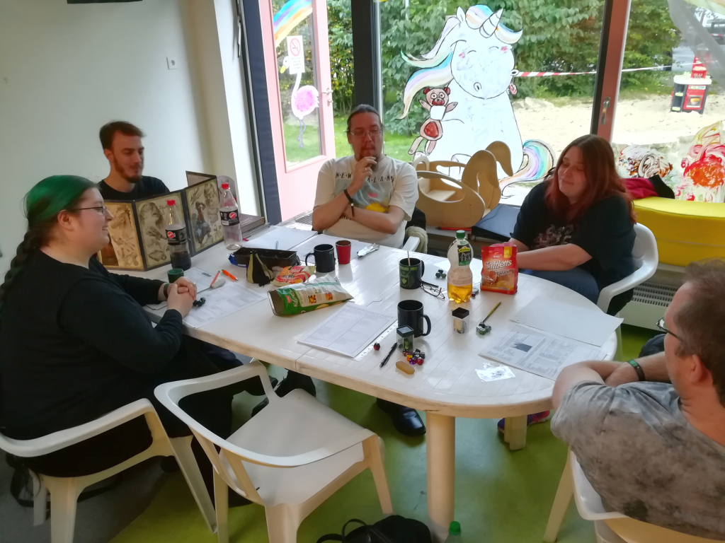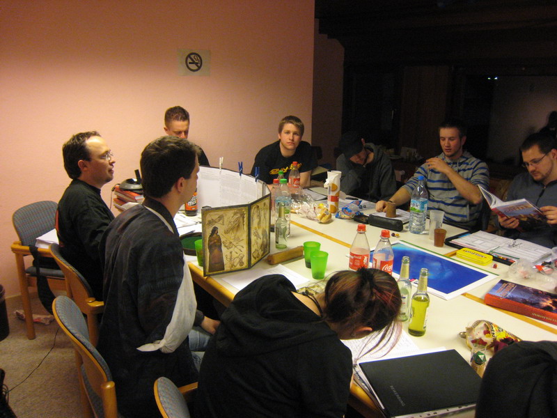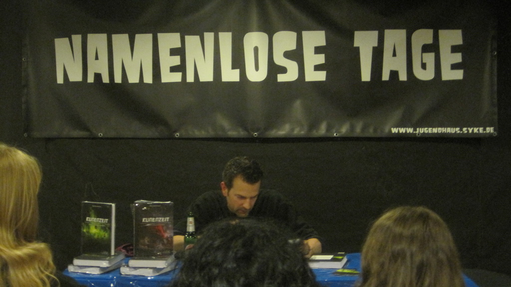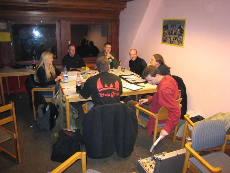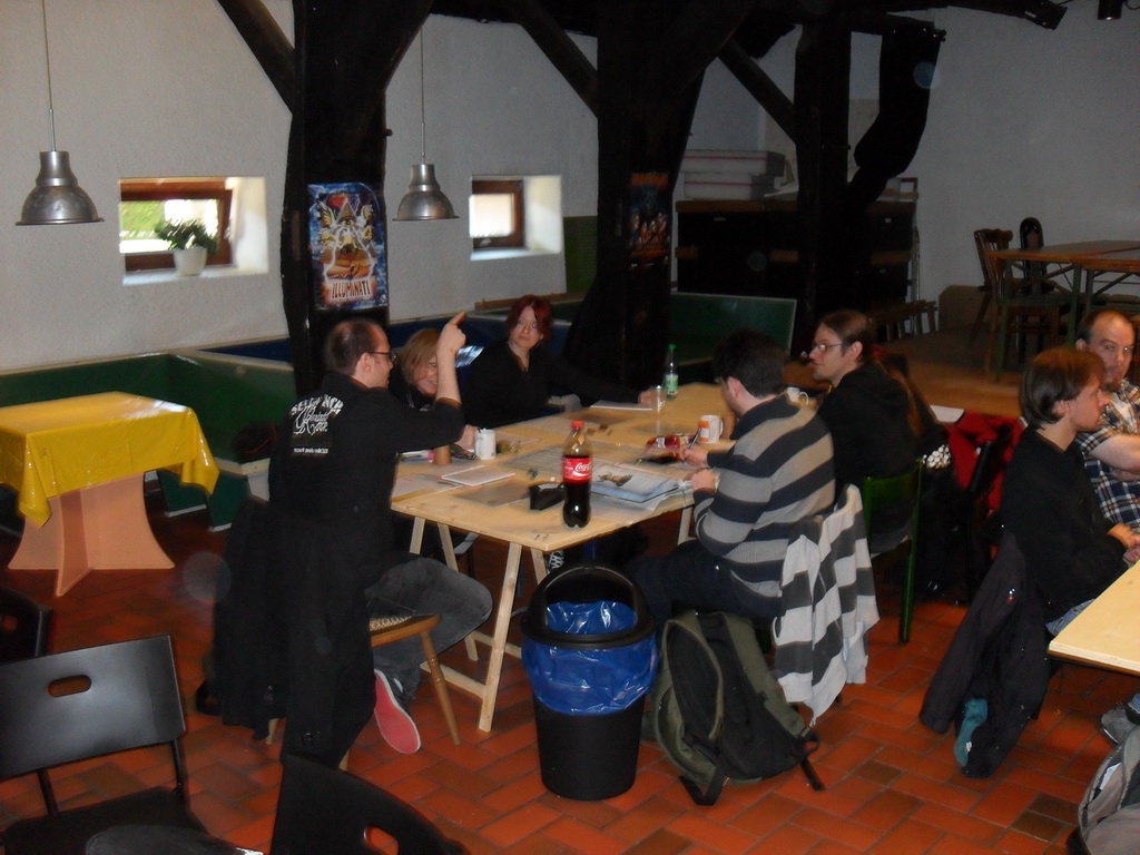 Im Vorfeld: Also irgendwie war von Anfang an der Wurm drin. Die Vorbereitungen zu den 24. Namenlosen Tagen waren ein auf und nieder und vor allem von Rückschlägen gezeichnet. Zunächst hatte man den Plan, die Menge der Spieltische um 10% zu erhöhen, da man den Schlafsaal in die neue, benachbarte Kita auslagern konnte und im Jugendhaus kleine bauliche Veränderungen vorgenommen wurden. Doch als es dann hieß, man könne die obere Etage nicht mehr nutzen, fing der Schlamassel an. Ursprünglich sollte Robert Corvus gemeinsam mit Bernhard Hennen am Freitag eine Lesung veranstalten, ersterer musste dann aber einem anderen Termin den Vorzug geben. Weitere kleine Probleme mussten aus dem Weg geräumt werden, aber als dann unsere lieb gewonnene Putzfrau in den verdienten Ruhestand ging, sah sich die Orga schon am Sonntag bis 0 Uhr im Kindergarten die Böden wischen. Letztendlich konnte in der letzten Woche vor den Namenlosen Tagen alles in die richtigen Bahnen gelenkt werden und man harrte gespannt der Dinge, die da kommen sollten.
