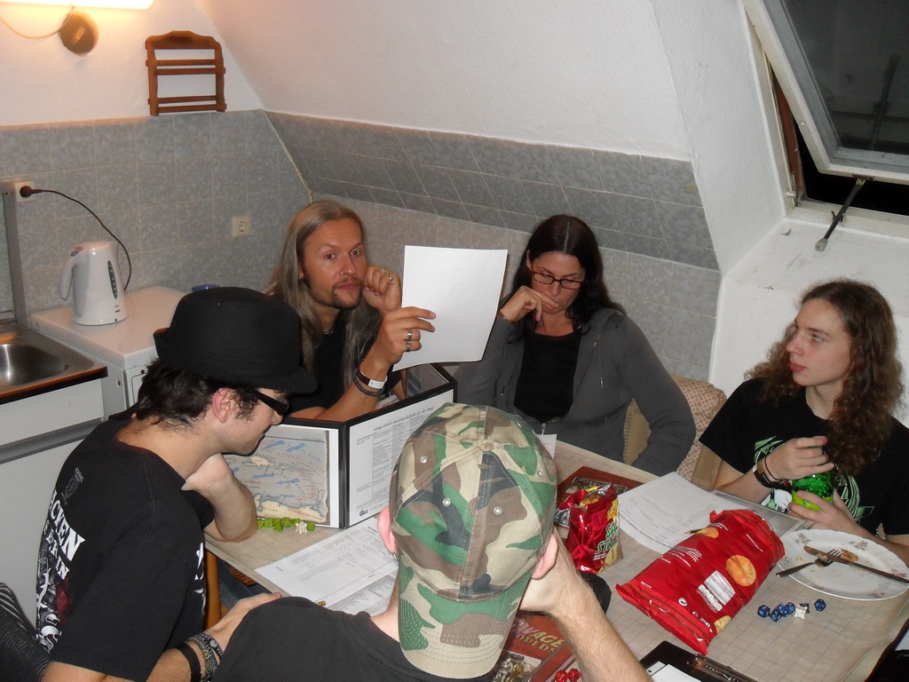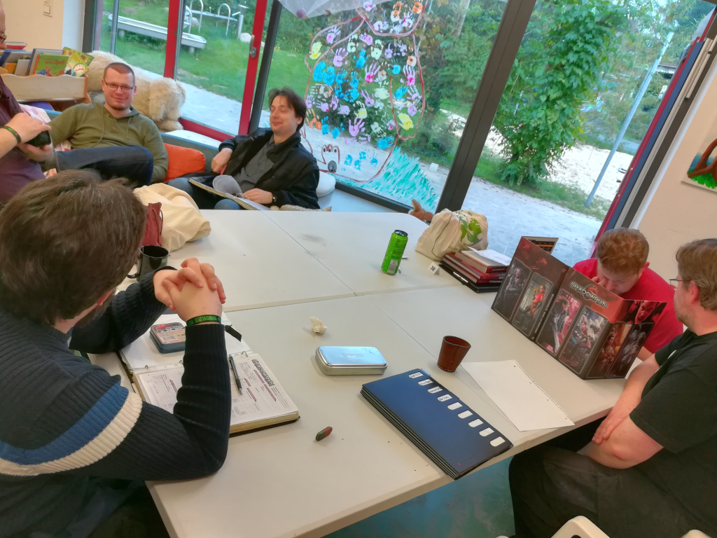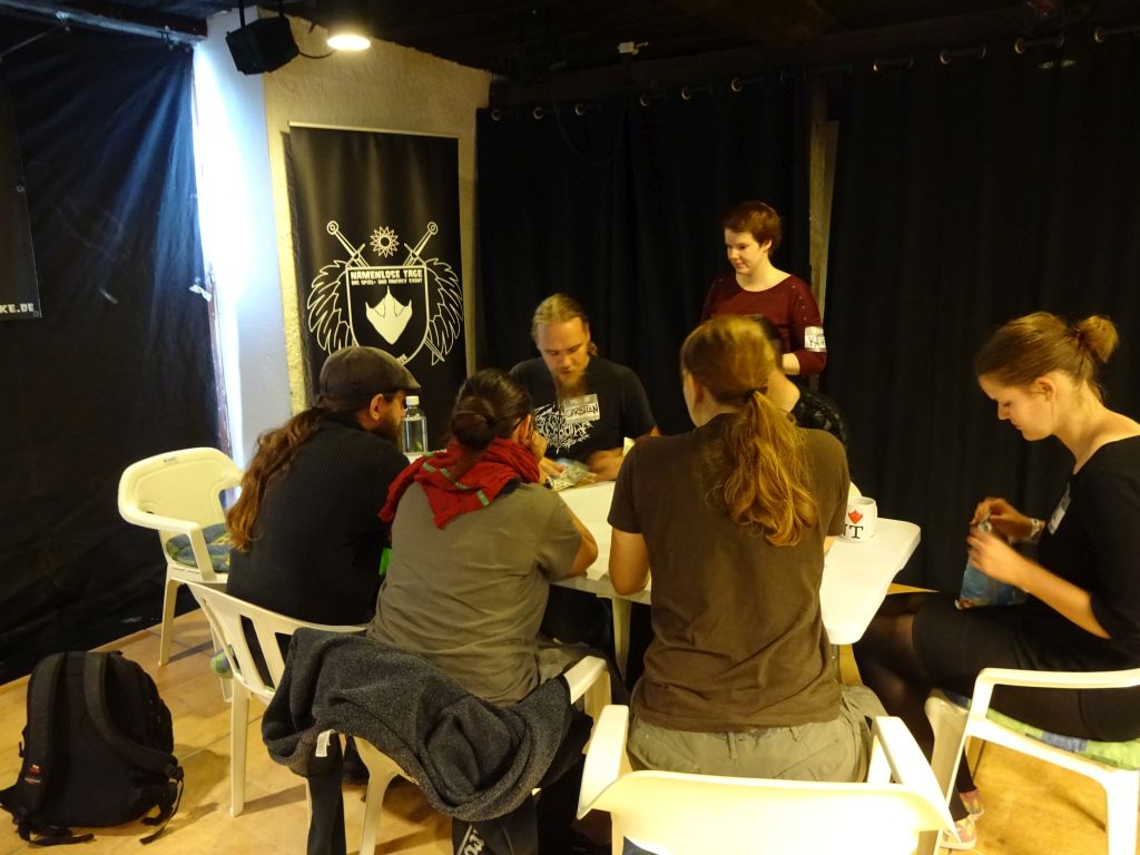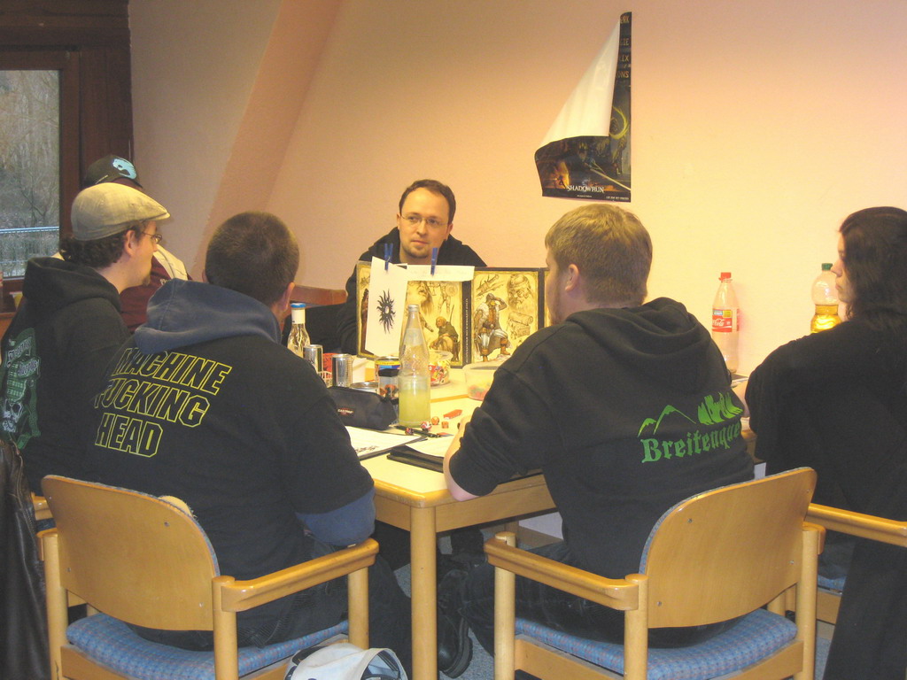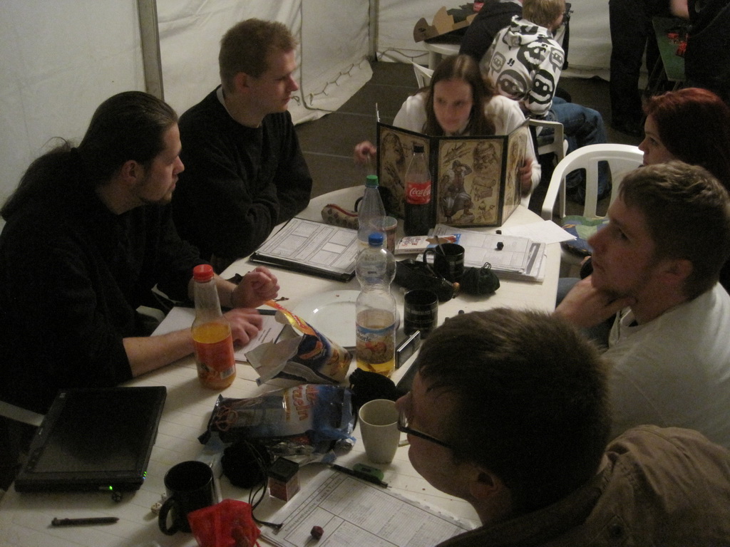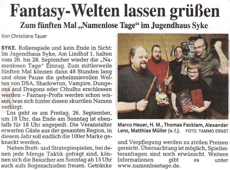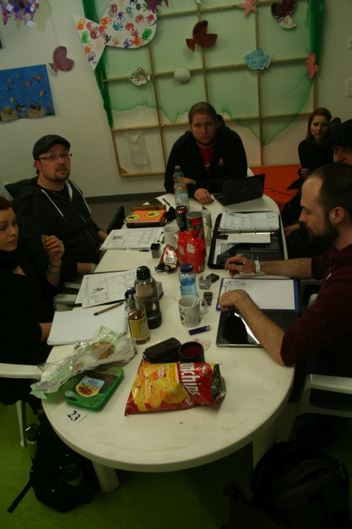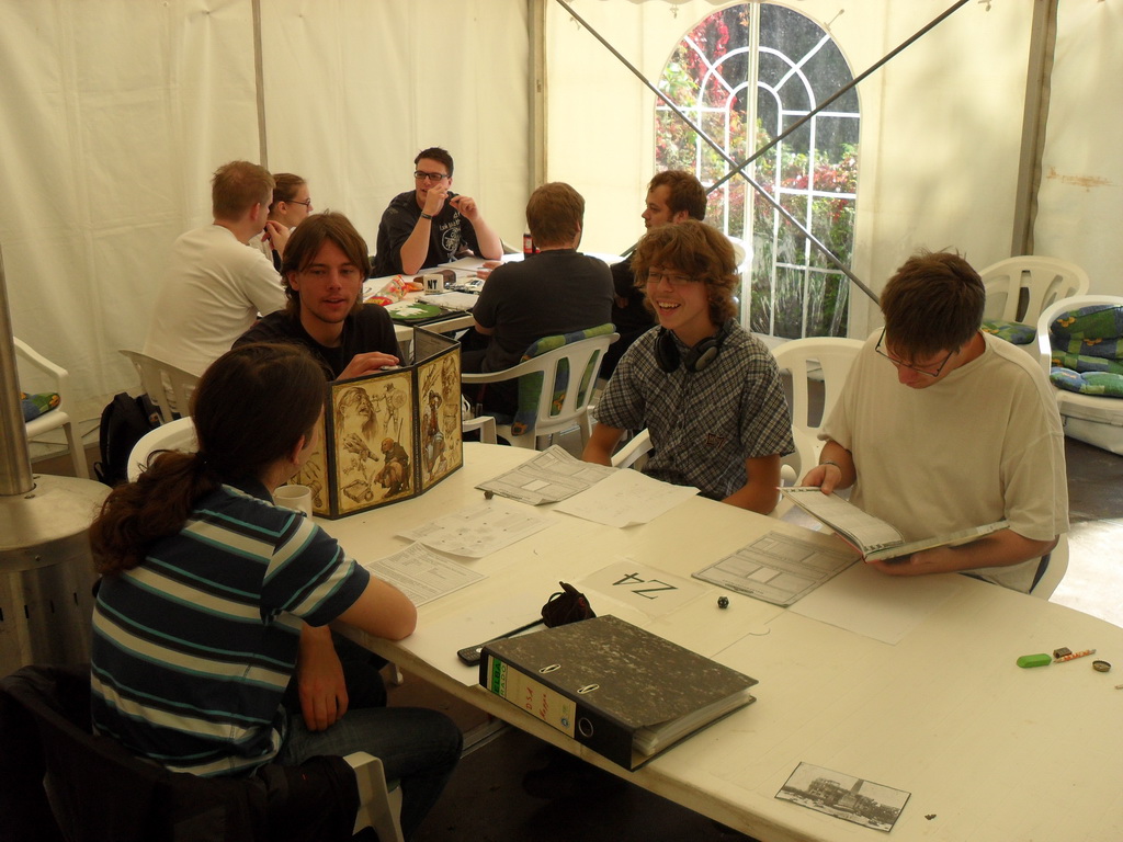 Im Vorfeld: Also irgendwie war von Anfang an der Wurm drin. Die Vorbereitungen zu den 24. Namenlosen Tagen waren ein auf und nieder und vor allem von Rückschlägen gezeichnet. Zunächst hatte man den Plan, die Menge der Spieltische um 10% zu erhöhen, da man den Schlafsaal in die neue, benachbarte Kita auslagern konnte und im Jugendhaus kleine bauliche Veränderungen vorgenommen wurden. Doch als es dann hieß, man könne die obere Etage nicht mehr nutzen, fing der Schlamassel an. Ursprünglich sollte Robert Corvus gemeinsam mit Bernhard Hennen am Freitag eine Lesung veranstalten, ersterer musste dann aber einem anderen Termin den Vorzug geben. Weitere kleine Probleme mussten aus dem Weg geräumt werden, aber als dann unsere lieb gewonnene Putzfrau in den verdienten Ruhestand ging, sah sich die Orga schon am Sonntag bis 0 Uhr im Kindergarten die Böden wischen. Letztendlich konnte in der letzten Woche vor den Namenlosen Tagen alles in die richtigen Bahnen gelenkt werden und man harrte gespannt der Dinge, die da kommen sollten.