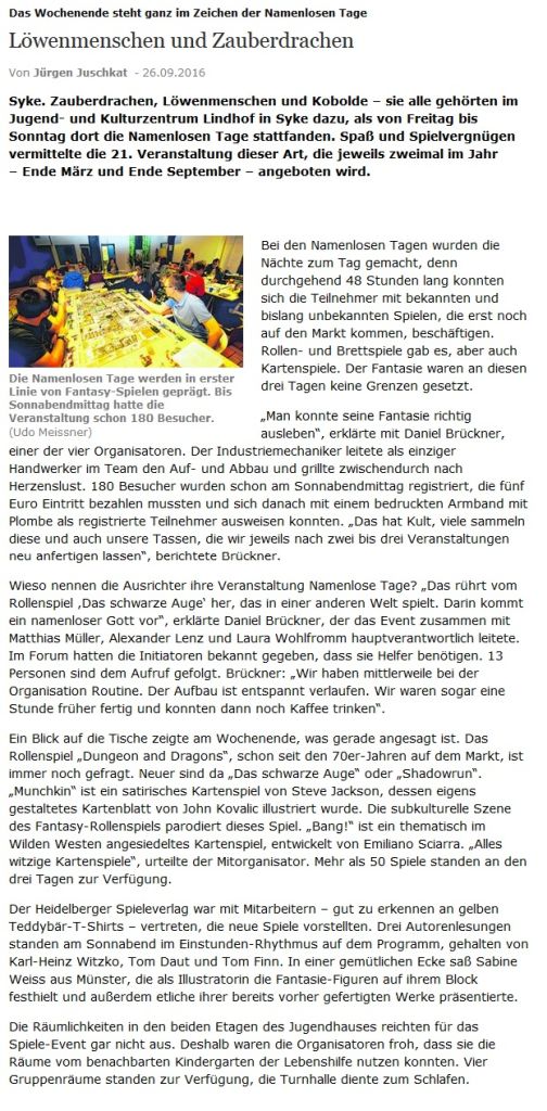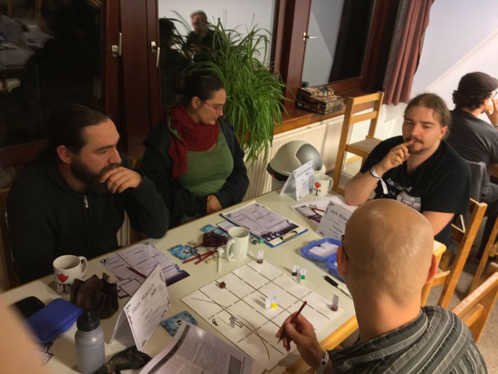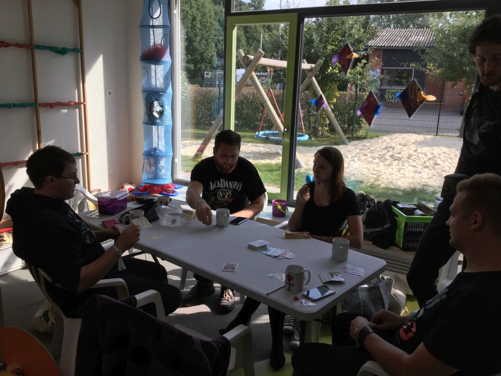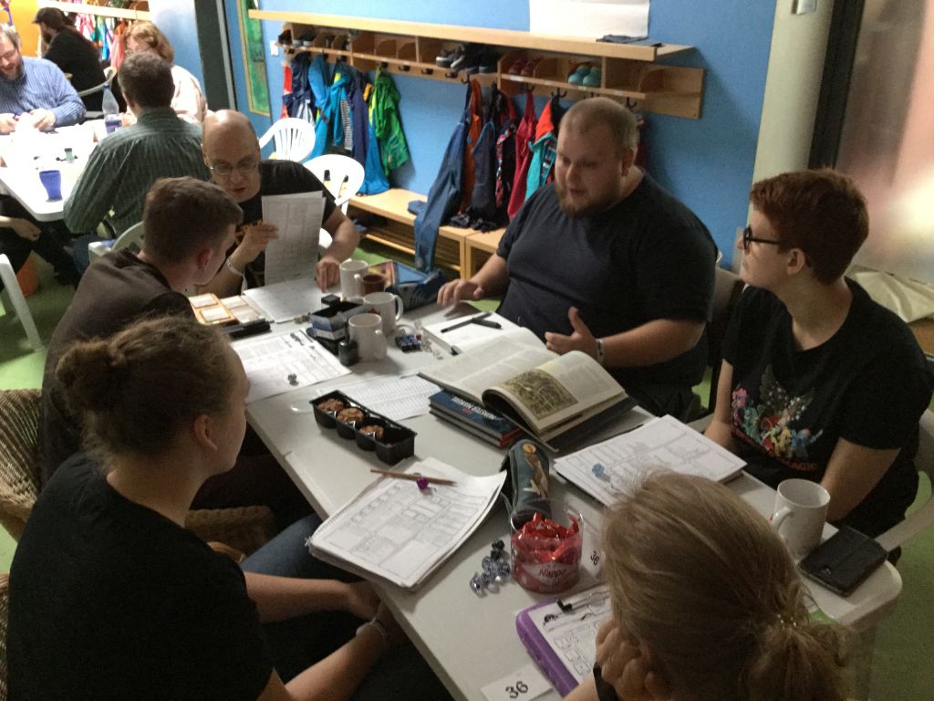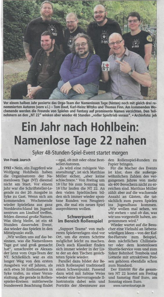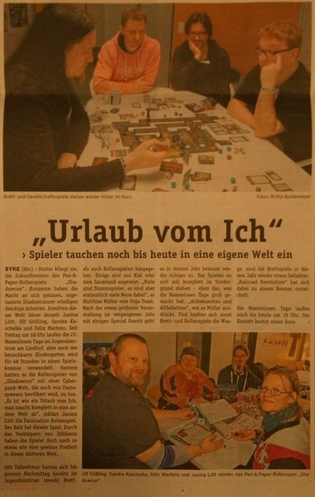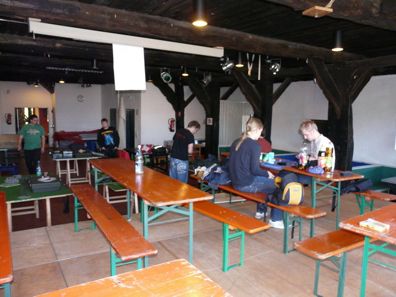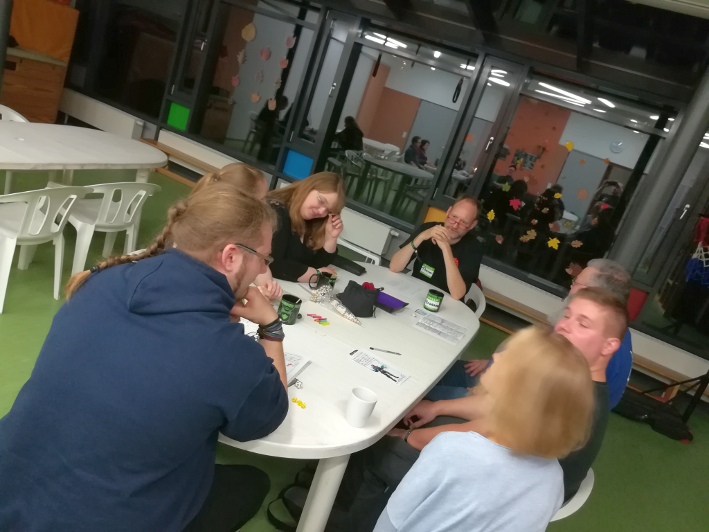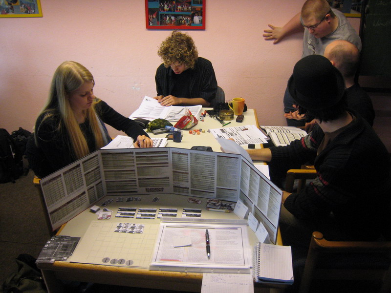 Im Vorfeld: Also irgendwie war von Anfang an der Wurm drin. Die Vorbereitungen zu den 24. Namenlosen Tagen waren ein auf und nieder und vor allem von Rückschlägen gezeichnet. Zunächst hatte man den Plan, die Menge der Spieltische um 10% zu erhöhen, da man den Schlafsaal in die neue, benachbarte Kita auslagern konnte und im Jugendhaus kleine bauliche Veränderungen vorgenommen wurden. Doch als es dann hieß, man könne die obere Etage nicht mehr nutzen, fing der Schlamassel an. Ursprünglich sollte Robert Corvus gemeinsam mit Bernhard Hennen am Freitag eine Lesung veranstalten, ersterer musste dann aber einem anderen Termin den Vorzug geben. Weitere kleine Probleme mussten aus dem Weg geräumt werden, aber als dann unsere lieb gewonnene Putzfrau in den verdienten Ruhestand ging, sah sich die Orga schon am Sonntag bis 0 Uhr im Kindergarten die Böden wischen. Letztendlich konnte in der letzten Woche vor den Namenlosen Tagen alles in die richtigen Bahnen gelenkt werden und man harrte gespannt der Dinge, die da kommen sollten.