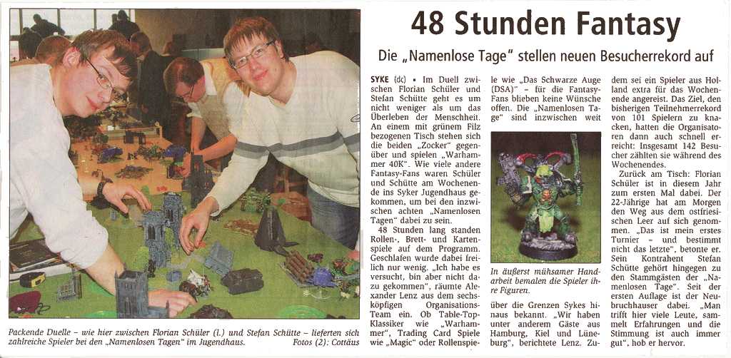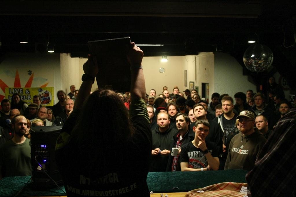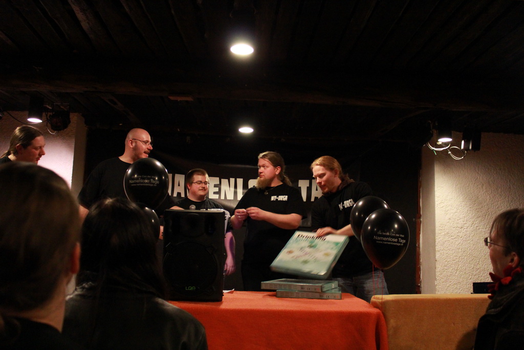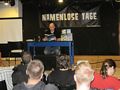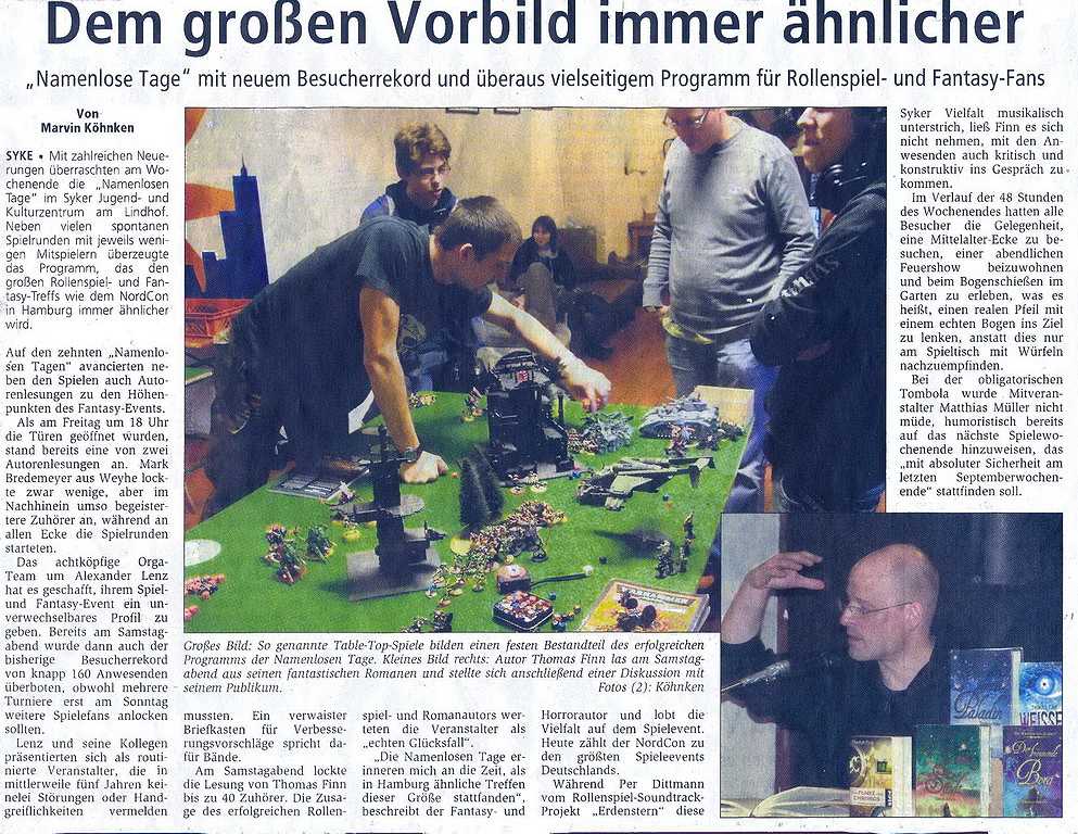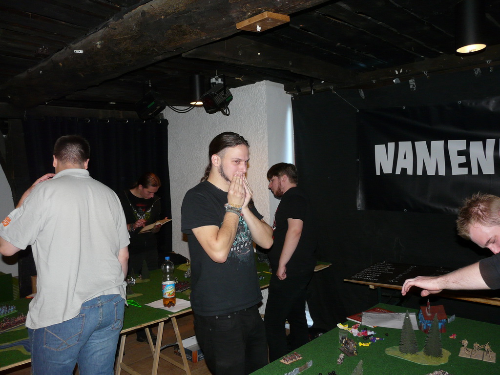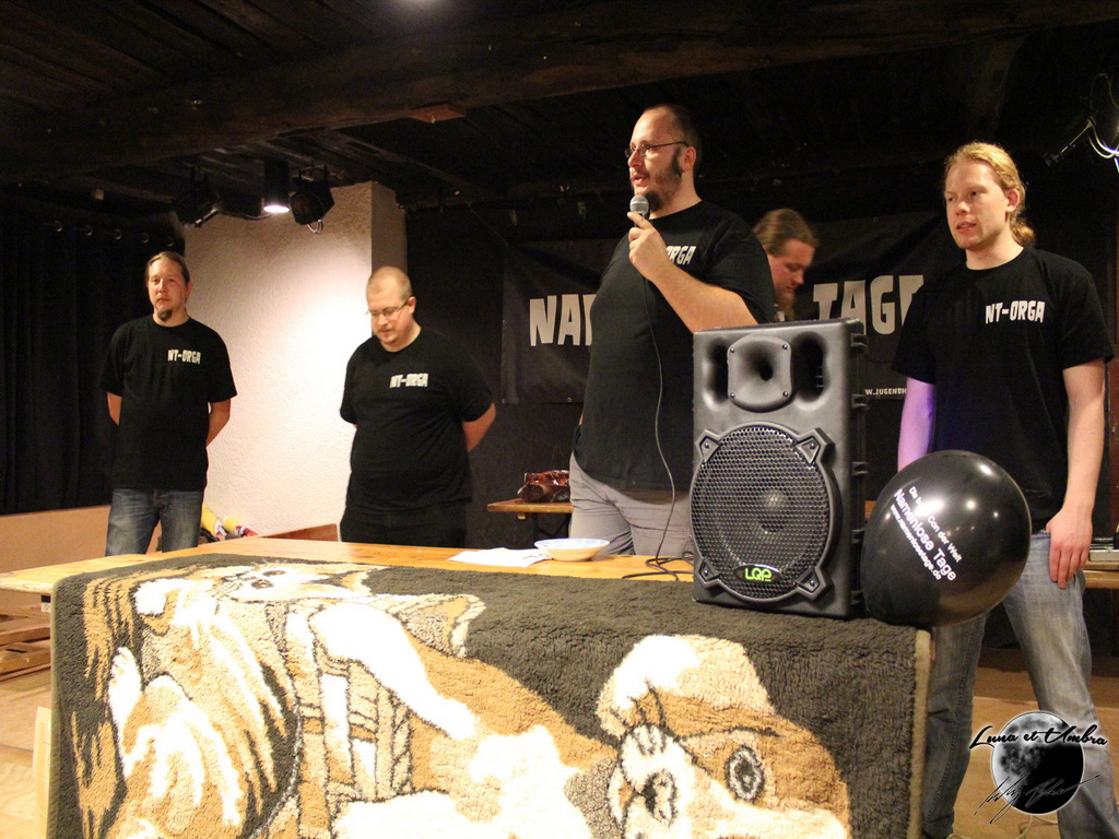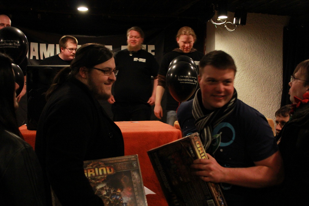 NT10: Mit einem gewaltigem Ansturm starteten diese Tage. Während die Besucherflut nicht abzureißen wollte, packten einige schon ihre Gesellschaftsspiele aus oder fanden sich in ihren Runden ein. Als der Freitag endete, alle Gäste versorgt und die 1. Autorenlesung der NT Geschichte zu Ende ging, konnte man bereits 105 Besucher zählen. Der Samstag wurde mit herrlichem Sonnenschein und dem Warhammer Fantasie Turnier begonnen. Zahlreiche Events boten ein sehr abwechslungsreiches Programm. Highlight des Abends war allerdings Thomas Finn, der einen großen Teil des Hauses zu seiner Lesung zog. Es folgte zur Auflockerung eine kleine Feuershow, bevor dann bei der Tombola die stolze Zahl von 153 Besuchern verkünden konnte. Den Abschluss des Samstag abends bildete traditionell das sehr gut besuchte Pokerturnier. Am Sonntag bereitete man sich dann auf einen weiteren Ansturm der Magic- und Warhammer 40k Spieler vor. Doch dieser wollte nicht so recht eintreten. Die beiden Bereiche die den Sonntag der NT bisher stets im Griff hatten schwächten ab. Dafür machten die Rollenspieler wieder Boden gut und konnten sich, wie das ganze Wochenende, als stärkster Bereich der NT durchsetzen. Alles in allem konnten die zehnten Namenlosentage mit soliden 181 Gästen einen erneuten Besucherrekord verzeichnen!