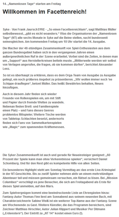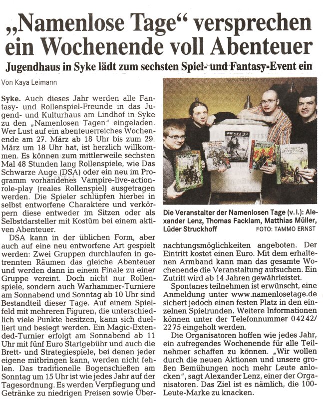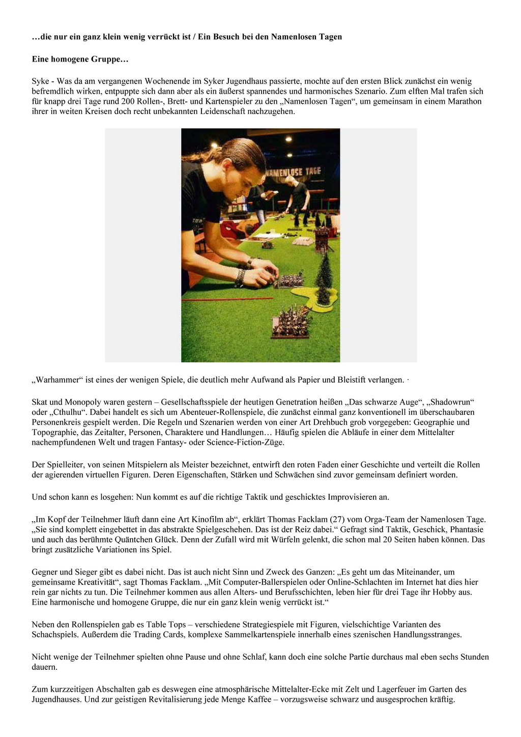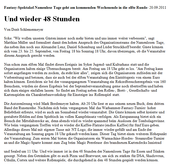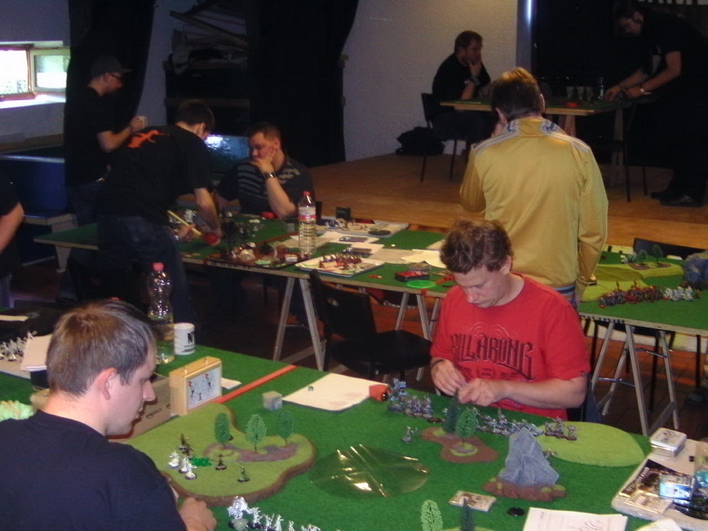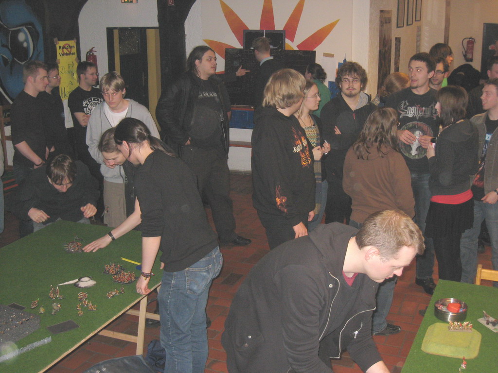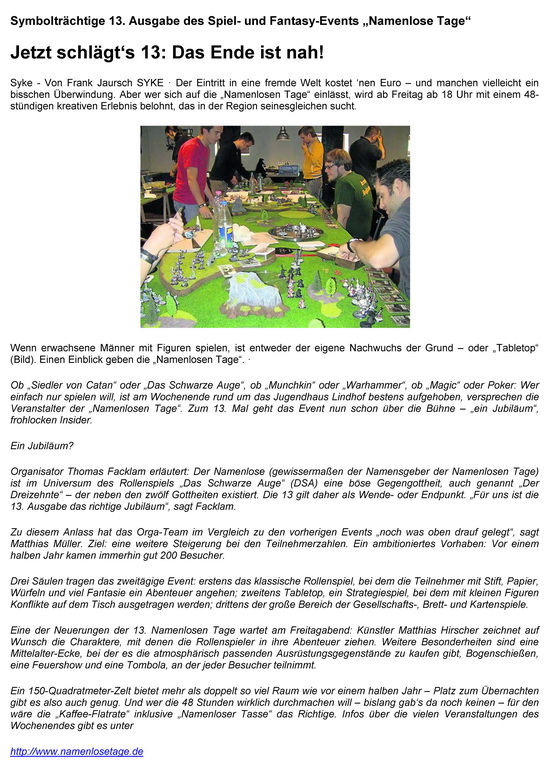 NT10: Mit einem gewaltigem Ansturm starteten diese Tage. Während die Besucherflut nicht abzureißen wollte, packten einige schon ihre Gesellschaftsspiele aus oder fanden sich in ihren Runden ein. Als der Freitag endete, alle Gäste versorgt und die 1. Autorenlesung der NT Geschichte zu Ende ging, konnte man bereits 105 Besucher zählen. Der Samstag wurde mit herrlichem Sonnenschein und dem Warhammer Fantasie Turnier begonnen. Zahlreiche Events boten ein sehr abwechslungsreiches Programm. Highlight des Abends war allerdings Thomas Finn, der einen großen Teil des Hauses zu seiner Lesung zog. Es folgte zur Auflockerung eine kleine Feuershow, bevor dann bei der Tombola die stolze Zahl von 153 Besuchern verkünden konnte. Den Abschluss des Samstag abends bildete traditionell das sehr gut besuchte Pokerturnier. Am Sonntag bereitete man sich dann auf einen weiteren Ansturm der Magic- und Warhammer 40k Spieler vor. Doch dieser wollte nicht so recht eintreten. Die beiden Bereiche die den Sonntag der NT bisher stets im Griff hatten schwächten ab. Dafür machten die Rollenspieler wieder Boden gut und konnten sich, wie das ganze Wochenende, als stärkster Bereich der NT durchsetzen. Alles in allem konnten die zehnten Namenlosentage mit soliden 181 Gästen einen erneuten Besucherrekord verzeichnen!