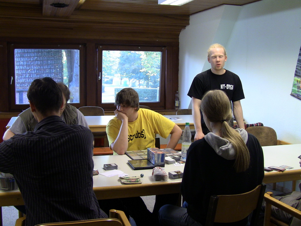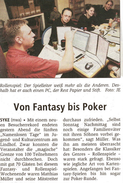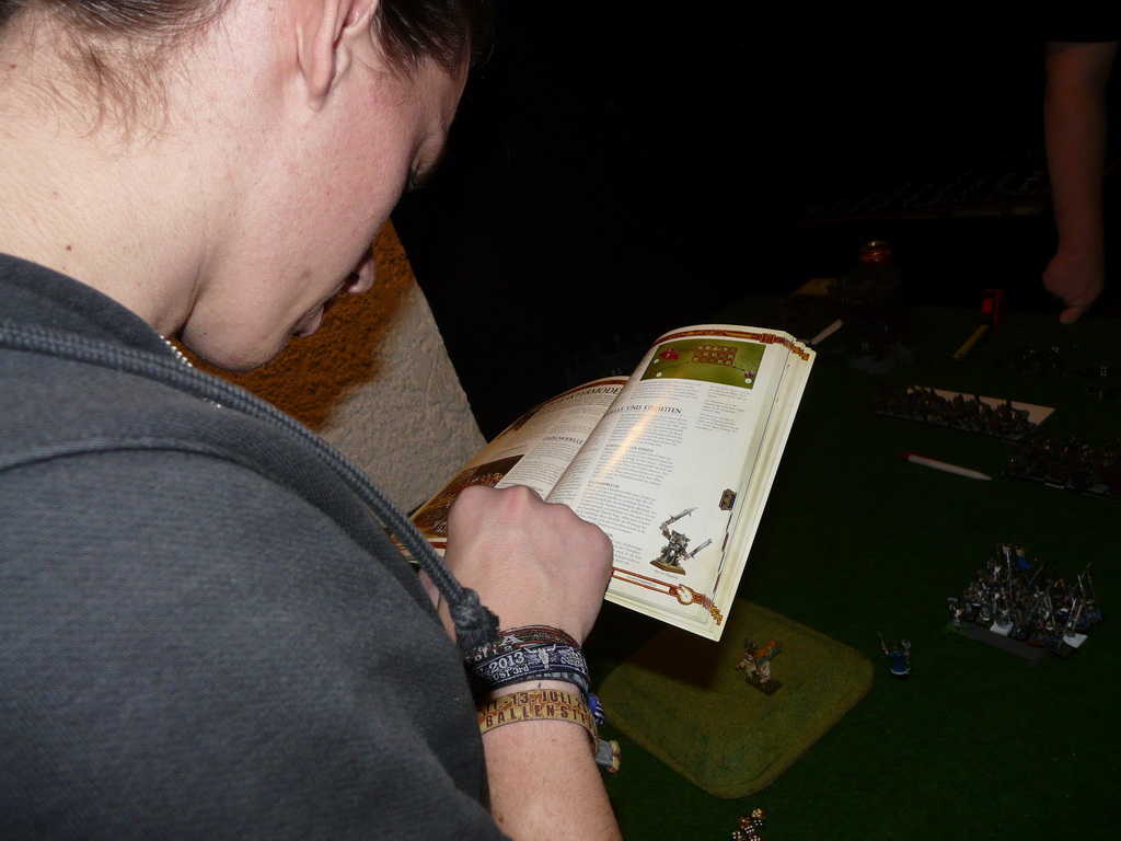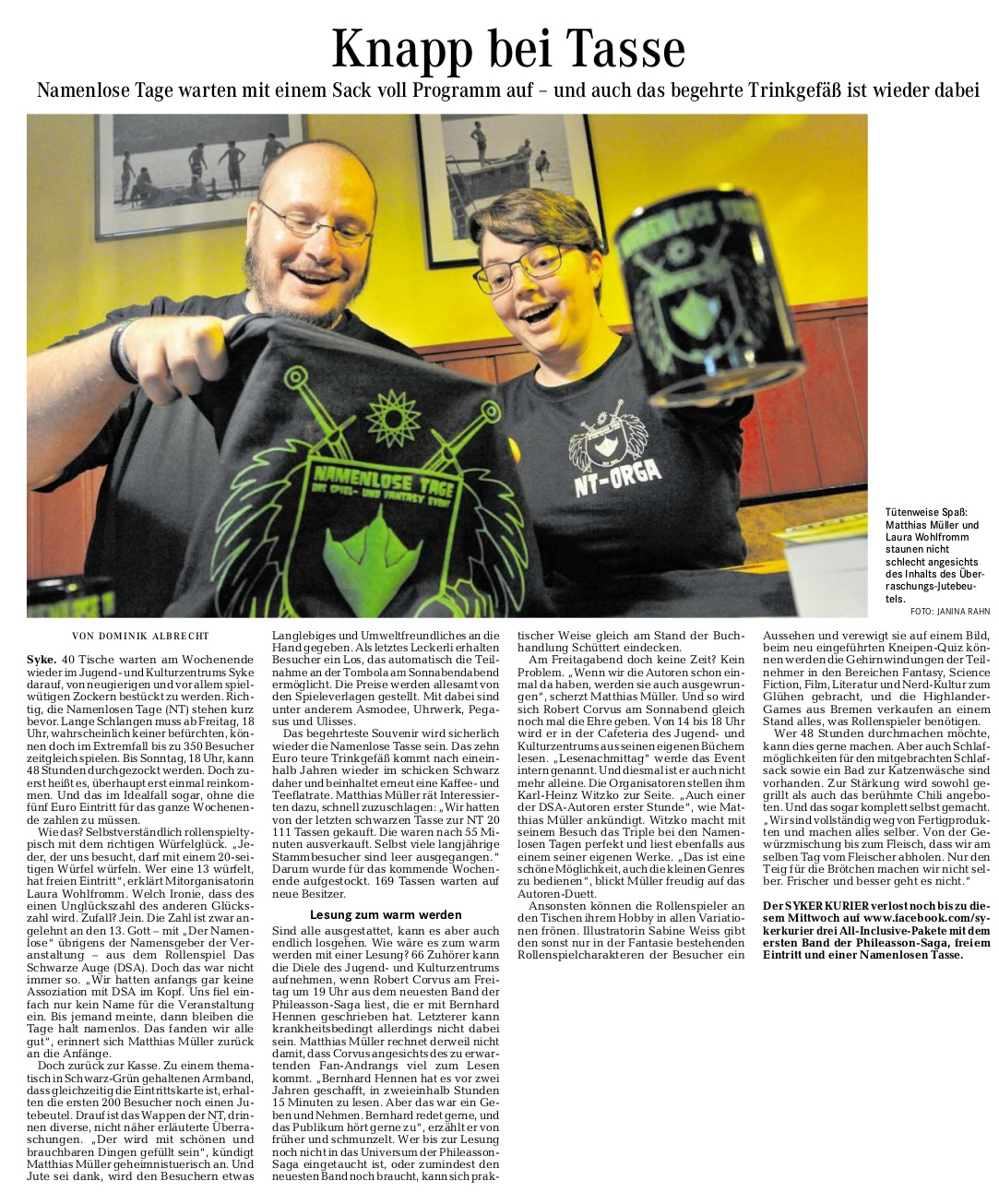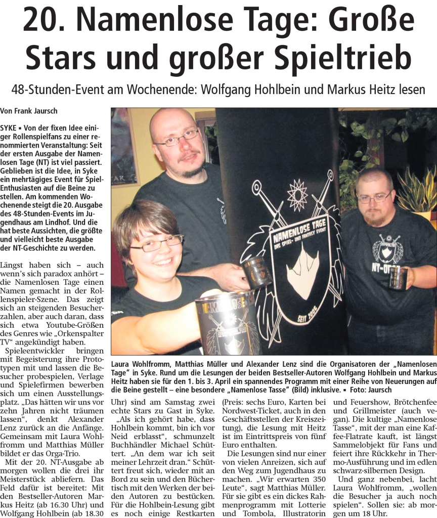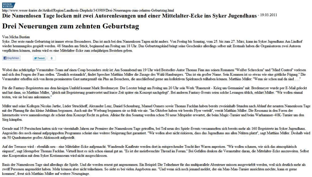 NT10: Mit einem gewaltigem Ansturm starteten diese Tage. Während die Besucherflut nicht abzureißen wollte, packten einige schon ihre Gesellschaftsspiele aus oder fanden sich in ihren Runden ein. Als der Freitag endete, alle Gäste versorgt und die 1. Autorenlesung der NT Geschichte zu Ende ging, konnte man bereits 105 Besucher zählen. Der Samstag wurde mit herrlichem Sonnenschein und dem Warhammer Fantasie Turnier begonnen. Zahlreiche Events boten ein sehr abwechslungsreiches Programm. Highlight des Abends war allerdings Thomas Finn, der einen großen Teil des Hauses zu seiner Lesung zog. Es folgte zur Auflockerung eine kleine Feuershow, bevor dann bei der Tombola die stolze Zahl von 153 Besuchern verkünden konnte. Den Abschluss des Samstag abends bildete traditionell das sehr gut besuchte Pokerturnier. Am Sonntag bereitete man sich dann auf einen weiteren Ansturm der Magic- und Warhammer 40k Spieler vor. Doch dieser wollte nicht so recht eintreten. Die beiden Bereiche die den Sonntag der NT bisher stets im Griff hatten schwächten ab. Dafür machten die Rollenspieler wieder Boden gut und konnten sich, wie das ganze Wochenende, als stärkster Bereich der NT durchsetzen. Alles in allem konnten die zehnten Namenlosentage mit soliden 181 Gästen einen erneuten Besucherrekord verzeichnen!