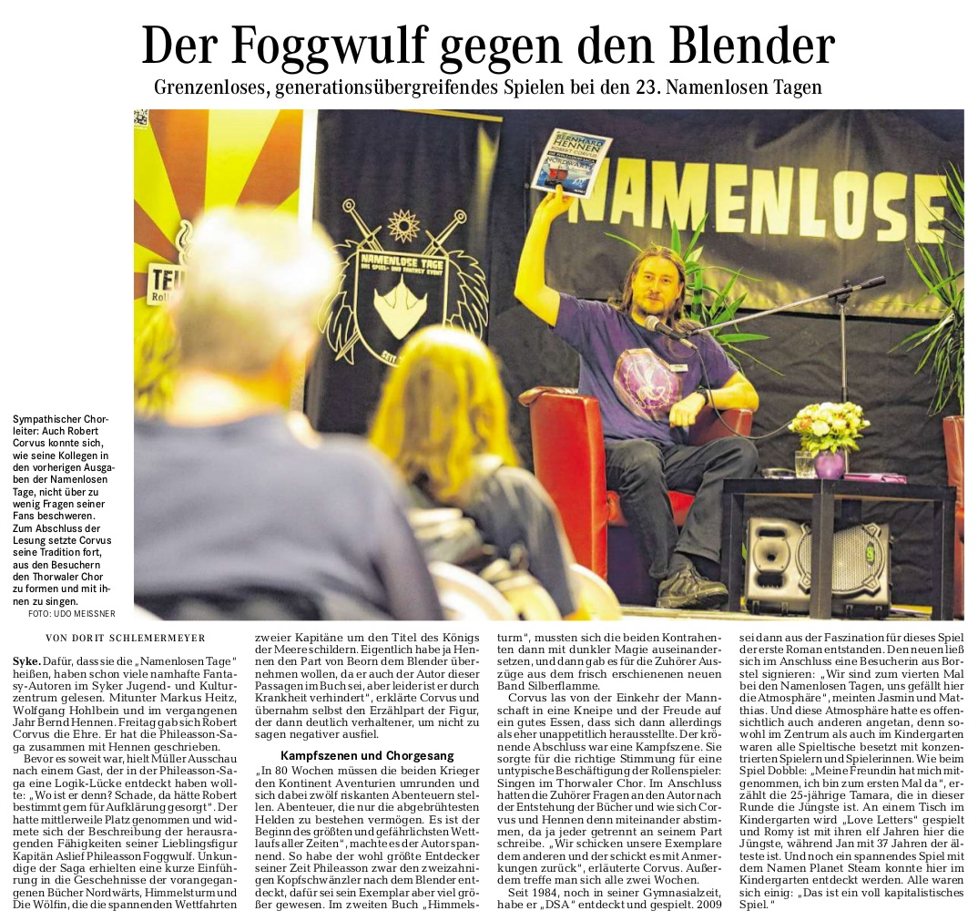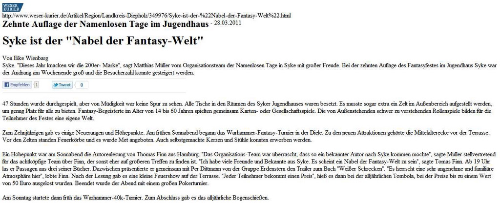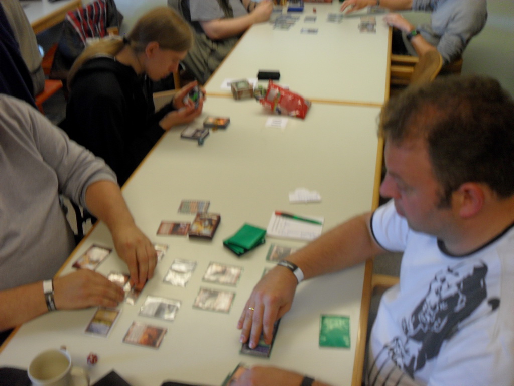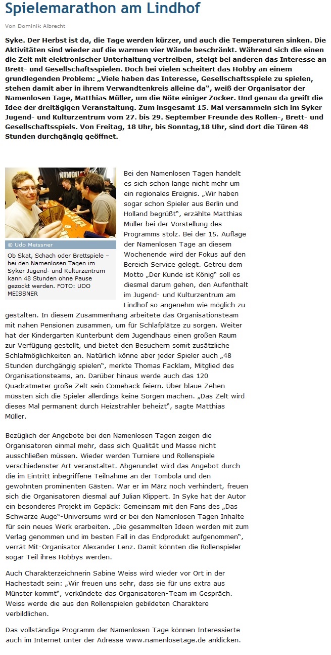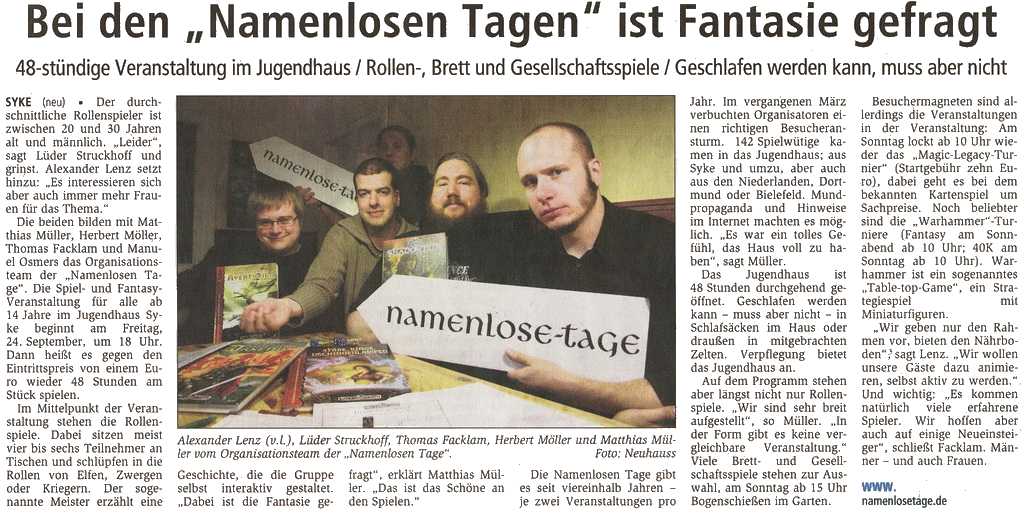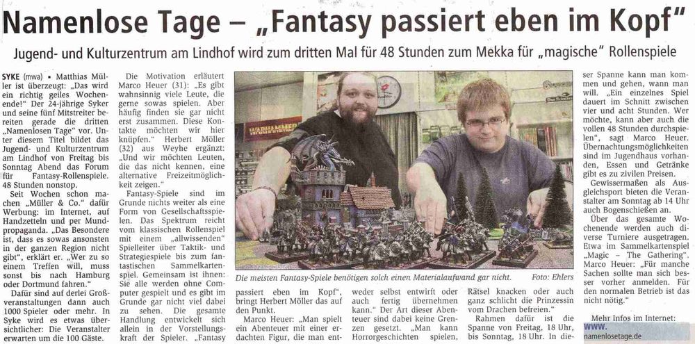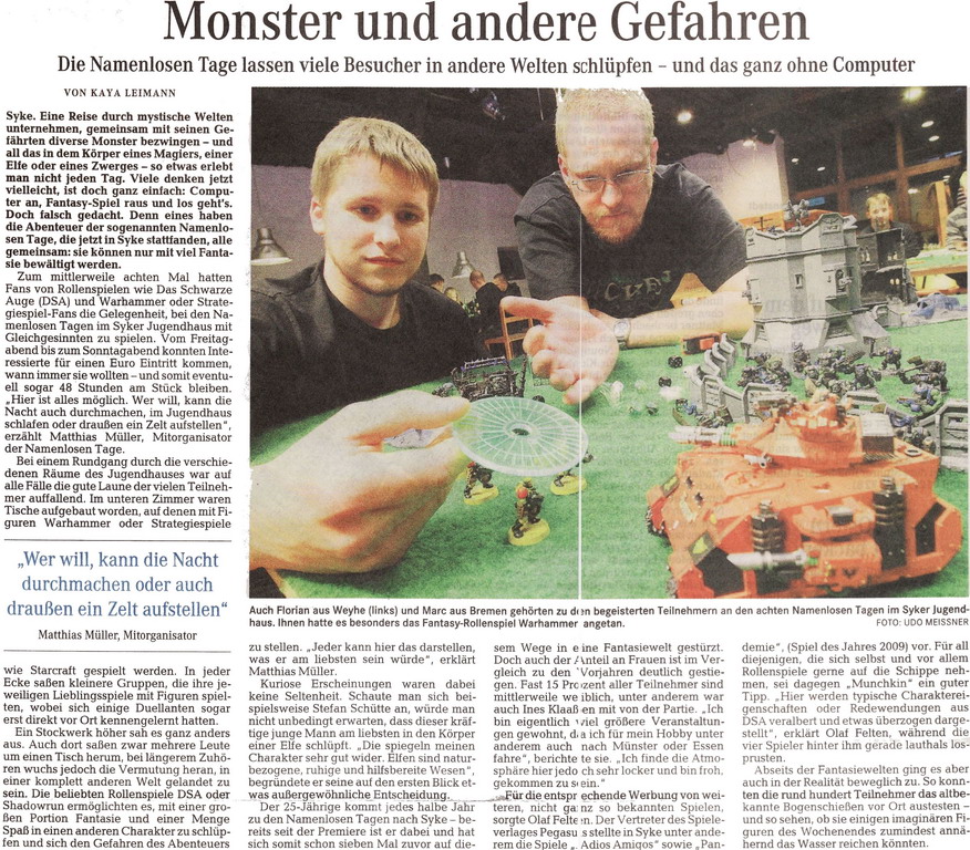 NT10: Mit einem gewaltigem Ansturm starteten diese Tage. Während die Besucherflut nicht abzureißen wollte, packten einige schon ihre Gesellschaftsspiele aus oder fanden sich in ihren Runden ein. Als der Freitag endete, alle Gäste versorgt und die 1. Autorenlesung der NT Geschichte zu Ende ging, konnte man bereits 105 Besucher zählen. Der Samstag wurde mit herrlichem Sonnenschein und dem Warhammer Fantasie Turnier begonnen. Zahlreiche Events boten ein sehr abwechslungsreiches Programm. Highlight des Abends war allerdings Thomas Finn, der einen großen Teil des Hauses zu seiner Lesung zog. Es folgte zur Auflockerung eine kleine Feuershow, bevor dann bei der Tombola die stolze Zahl von 153 Besuchern verkünden konnte. Den Abschluss des Samstag abends bildete traditionell das sehr gut besuchte Pokerturnier. Am Sonntag bereitete man sich dann auf einen weiteren Ansturm der Magic- und Warhammer 40k Spieler vor. Doch dieser wollte nicht so recht eintreten. Die beiden Bereiche die den Sonntag der NT bisher stets im Griff hatten schwächten ab. Dafür machten die Rollenspieler wieder Boden gut und konnten sich, wie das ganze Wochenende, als stärkster Bereich der NT durchsetzen. Alles in allem konnten die zehnten Namenlosentage mit soliden 181 Gästen einen erneuten Besucherrekord verzeichnen!
