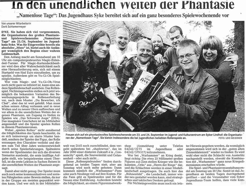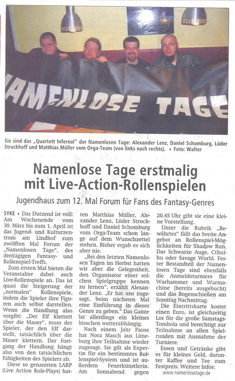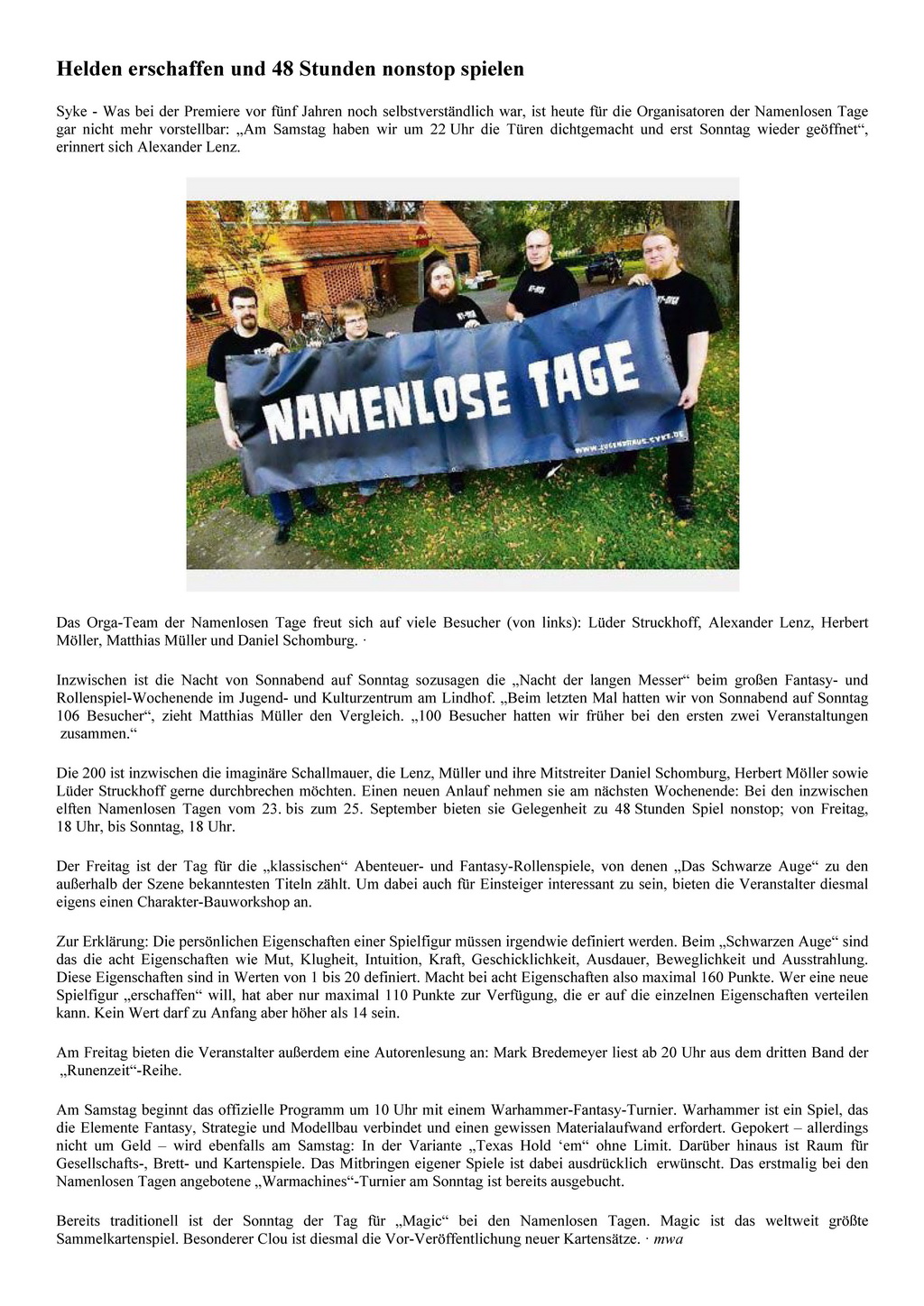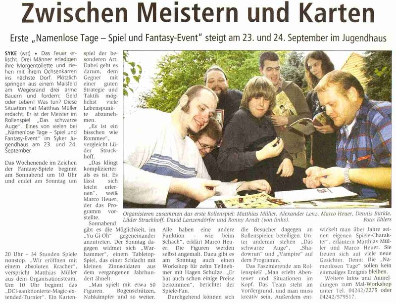 Die ersten Namenlosen Tage fanden am 23.09. und 24.09.2006 statt. Seiner Zeit noch von Samstag 10Uhr bis Sonntag 20Uhr, aber immerhin schon 34Std Nonstop. Die NT war aus damaliger Sicht ein voller Erfolg. Das Ziel wurde erreicht und man schaffte es Fantasy- und Rollenspielbegeisterte der Region zusammenzuführen und sogar neue Leute für Spiele dieser Art zu begeistern. Das Rollenspiel und das Traidingcard Game Magic waren eindeutig die am meist gespielten Systeme und mit 36 Besuchern ging diese erste Veranstaltung zu Ende.