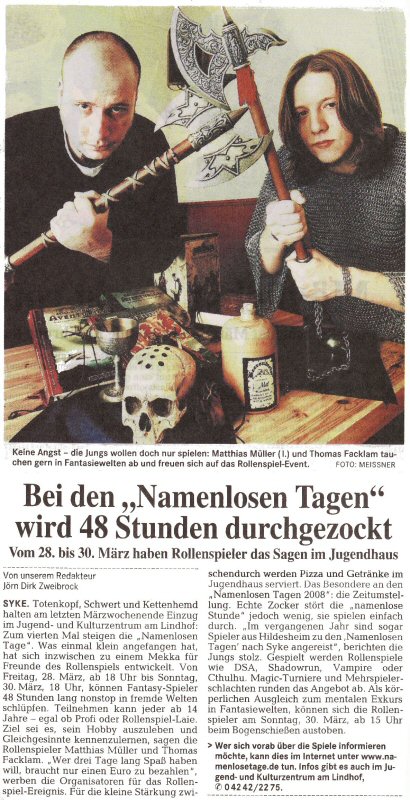 Die vierten Namenlosen Tage fanden vom 28.03. bis 30.03.2008 statt. Da nach nun mehr 2 Jahren das Grundgerüst des Events stand, konnte man sich voll auf die anstehende NT konzentrieren. Doch irgendwie war am NT Wochenende der Wurm drin. Das anhaltend schlechte Wetter vom Freitag und Samstag hielt irgendwie Gäste fern. Der Magic Bereich ging zurück und sogar die sonst so zahlreichen Rollenspieler wollten nicht so recht auf die Veranstaltung finden. Lediglich der Tabletop Bereich erhielten mehr Zulauf. Doch ab Samstagabend ging es dann los! Der Besucherstrom nahm zu und ein weiterer Bereich der bei den Planungen bis dahin kaum berücksichtigt wurde blühte auf. Das Gesellschaftsspiel. Viele Spielrunden mit verschiedensten Brett- und Kartenspielen trotzten nicht nur dem Wetter, sondern auch den schlimmsten Befürchtungen der Organisatoren zu Beginn der Veranstaltung. Als dann auch noch eine Hand voll Leute extra für das Bogenschießen am Sonntag gekommen sind, war die Überraschung perfekt und der Besucherrekord wurde auf fast 70 geschraubt.