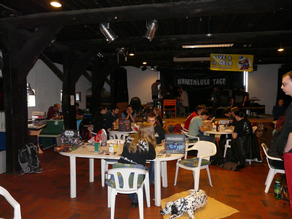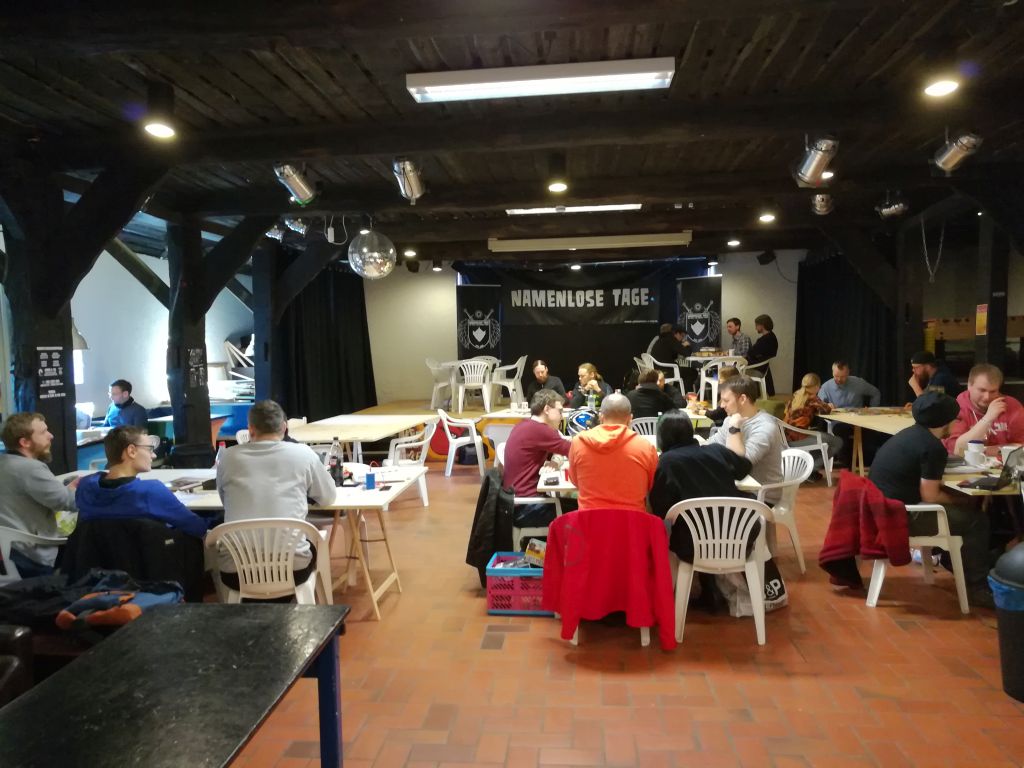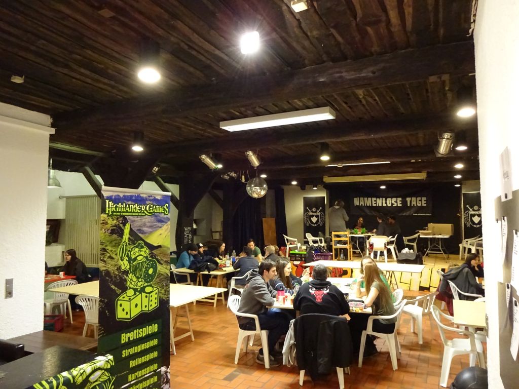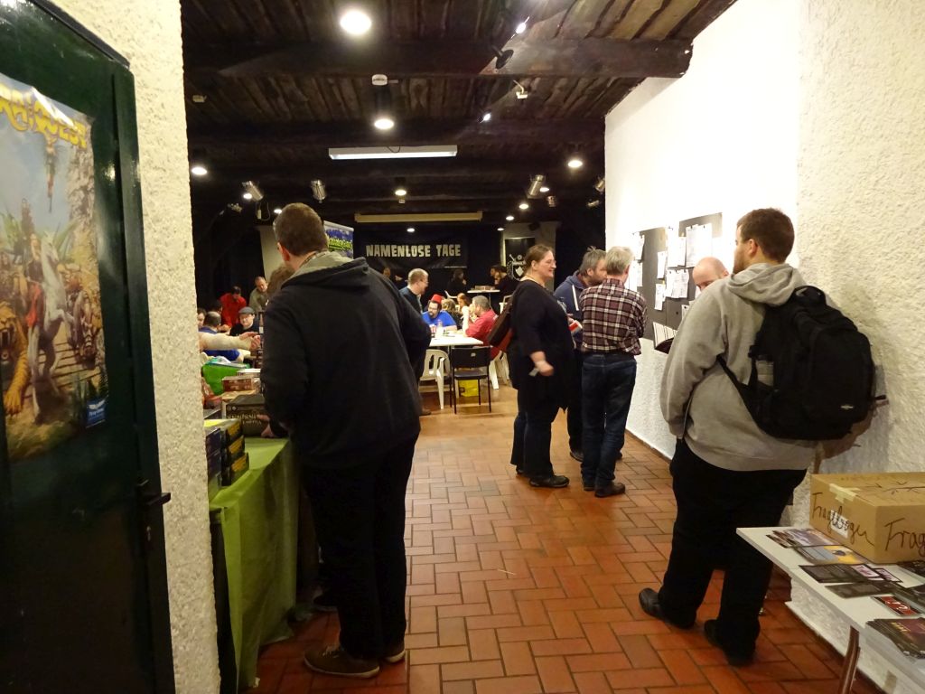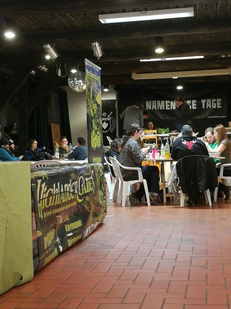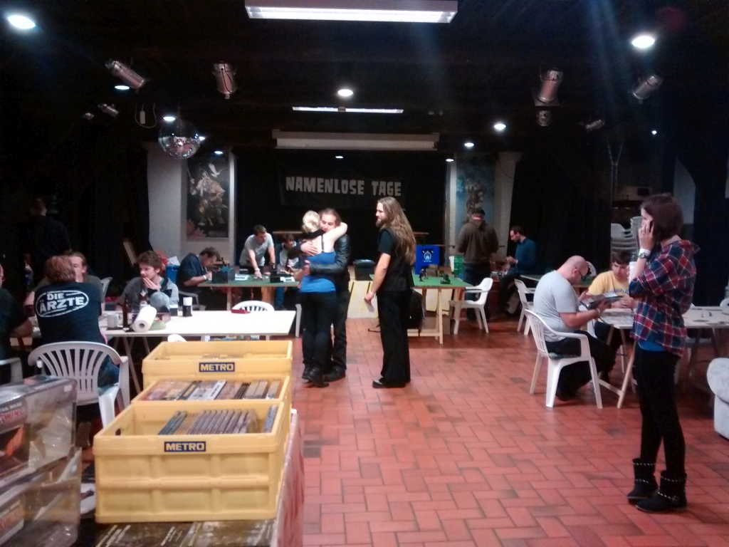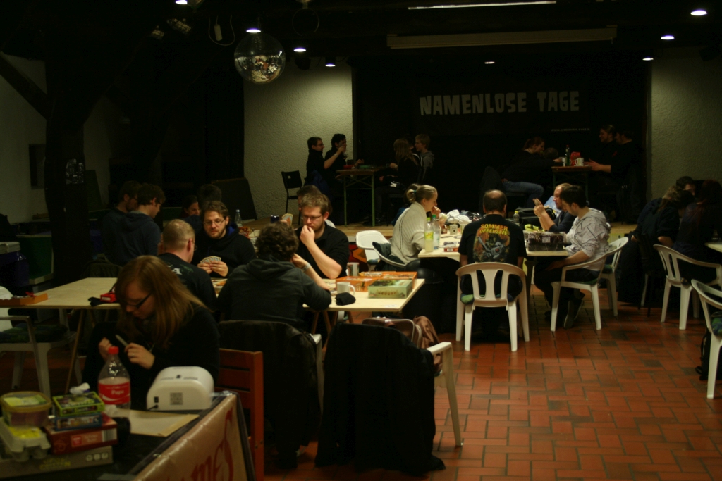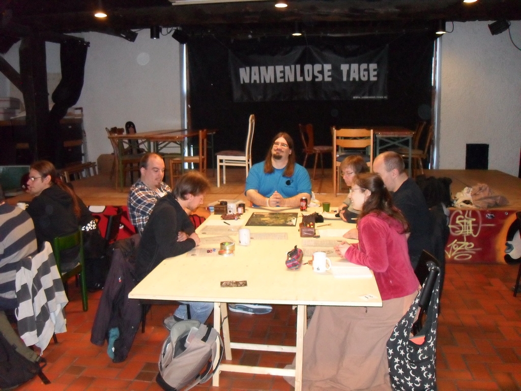 Im Vorfeld: Also irgendwie war von Anfang an der Wurm drin. Die Vorbereitungen zu den 24. Namenlosen Tagen waren ein auf und nieder und vor allem von Rückschlägen gezeichnet. Zunächst hatte man den Plan, die Menge der Spieltische um 10% zu erhöhen, da man den Schlafsaal in die neue, benachbarte Kita auslagern konnte und im Jugendhaus kleine bauliche Veränderungen vorgenommen wurden. Doch als es dann hieß, man könne die obere Etage nicht mehr nutzen, fing der Schlamassel an. Ursprünglich sollte Robert Corvus gemeinsam mit Bernhard Hennen am Freitag eine Lesung veranstalten, ersterer musste dann aber einem anderen Termin den Vorzug geben. Weitere kleine Probleme mussten aus dem Weg geräumt werden, aber als dann unsere lieb gewonnene Putzfrau in den verdienten Ruhestand ging, sah sich die Orga schon am Sonntag bis 0 Uhr im Kindergarten die Böden wischen. Letztendlich konnte in der letzten Woche vor den Namenlosen Tagen alles in die richtigen Bahnen gelenkt werden und man harrte gespannt der Dinge, die da kommen sollten.