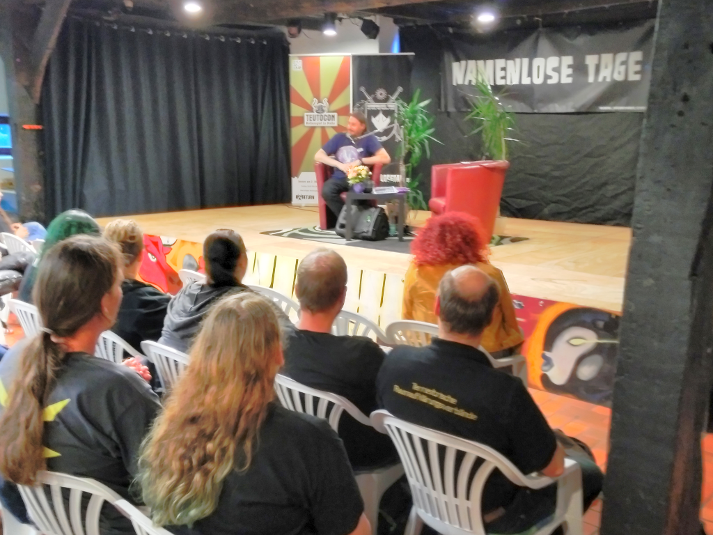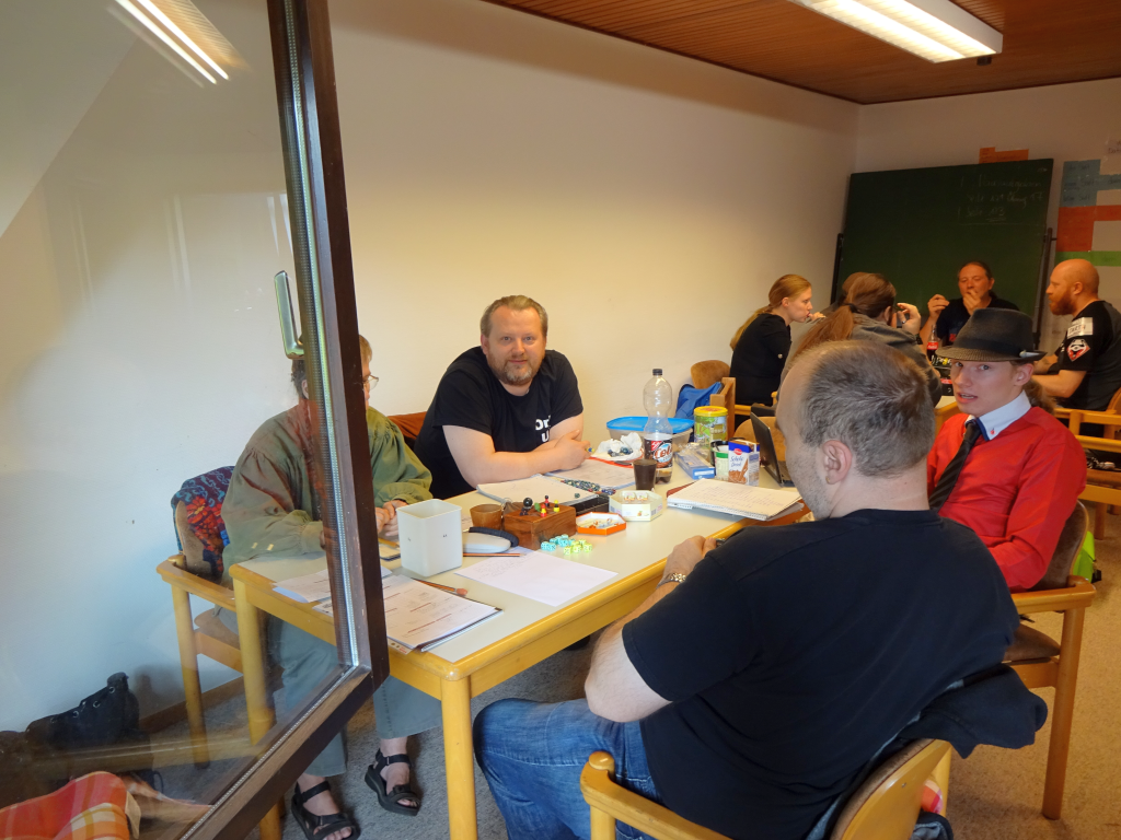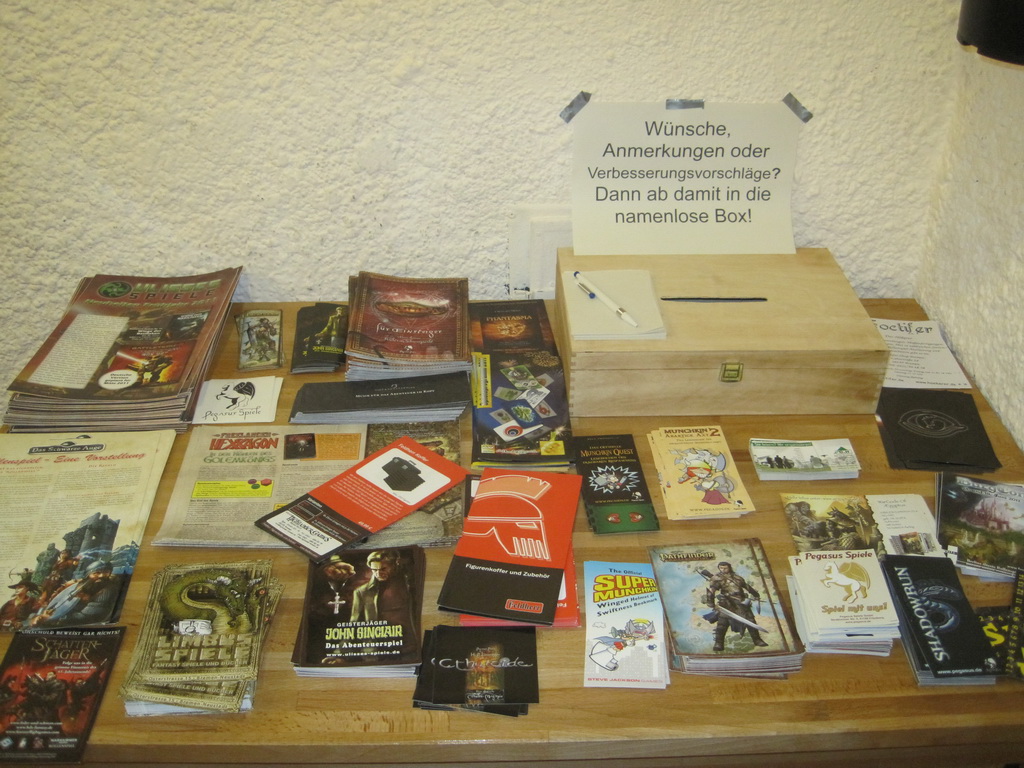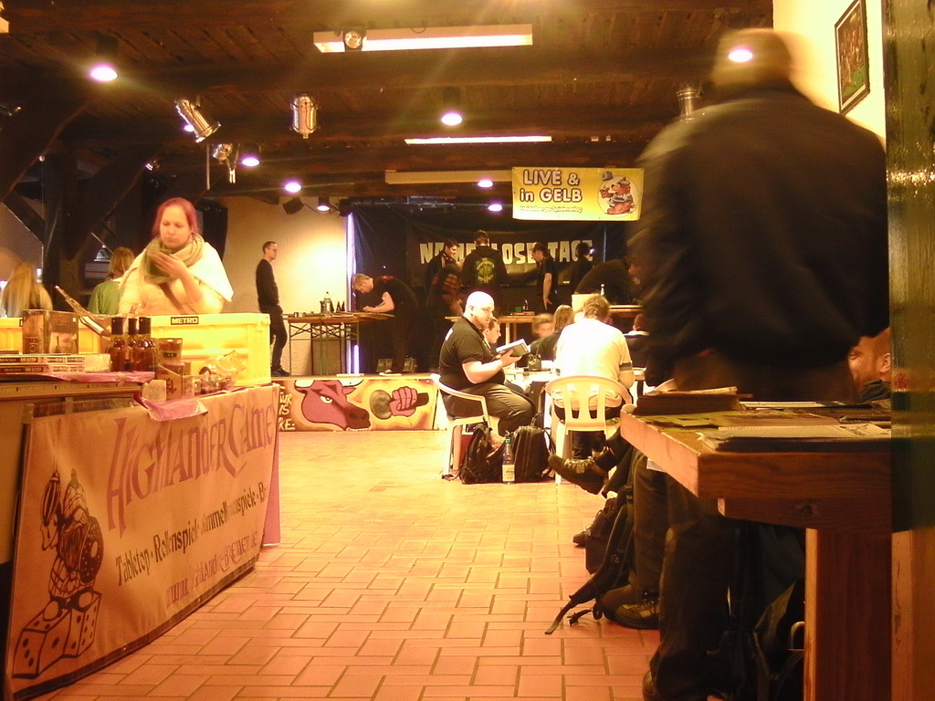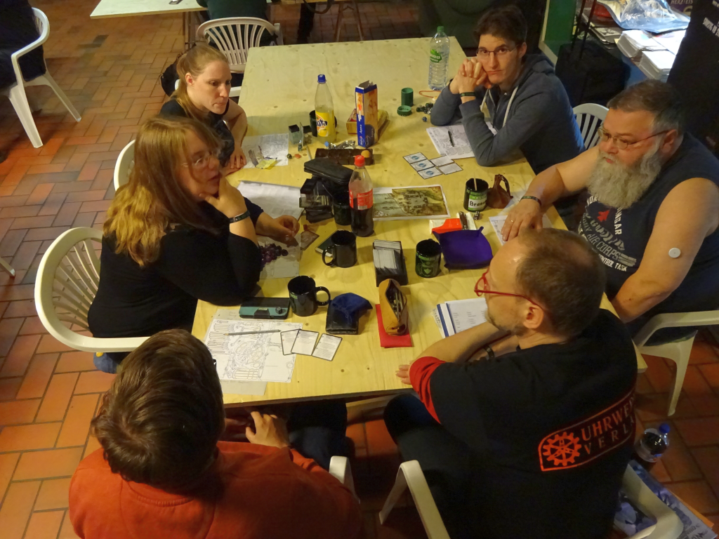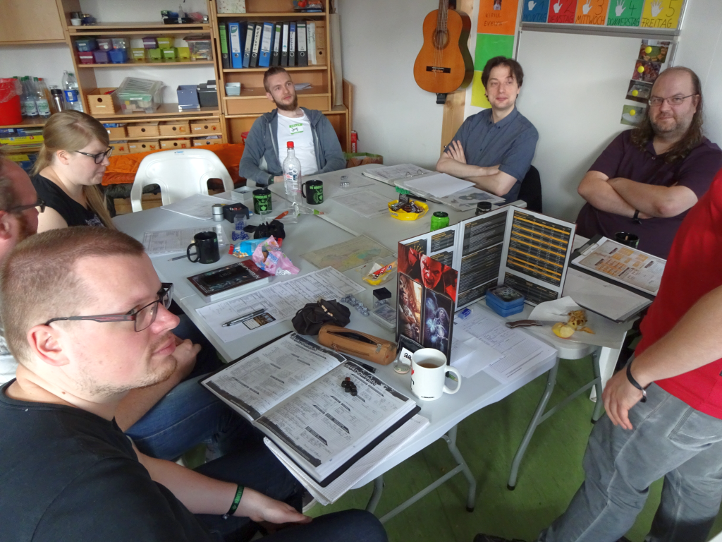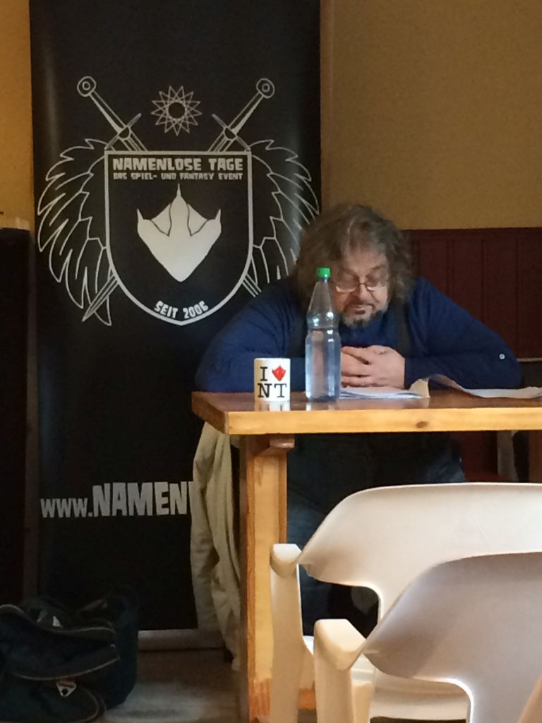 Im Vorfeld: Also irgendwie war von Anfang an der Wurm drin. Die Vorbereitungen zu den 24. Namenlosen Tagen waren ein auf und nieder und vor allem von Rückschlägen gezeichnet. Zunächst hatte man den Plan, die Menge der Spieltische um 10% zu erhöhen, da man den Schlafsaal in die neue, benachbarte Kita auslagern konnte und im Jugendhaus kleine bauliche Veränderungen vorgenommen wurden. Doch als es dann hieß, man könne die obere Etage nicht mehr nutzen, fing der Schlamassel an. Ursprünglich sollte Robert Corvus gemeinsam mit Bernhard Hennen am Freitag eine Lesung veranstalten, ersterer musste dann aber einem anderen Termin den Vorzug geben. Weitere kleine Probleme mussten aus dem Weg geräumt werden, aber als dann unsere lieb gewonnene Putzfrau in den verdienten Ruhestand ging, sah sich die Orga schon am Sonntag bis 0 Uhr im Kindergarten die Böden wischen. Letztendlich konnte in der letzten Woche vor den Namenlosen Tagen alles in die richtigen Bahnen gelenkt werden und man harrte gespannt der Dinge, die da kommen sollten.