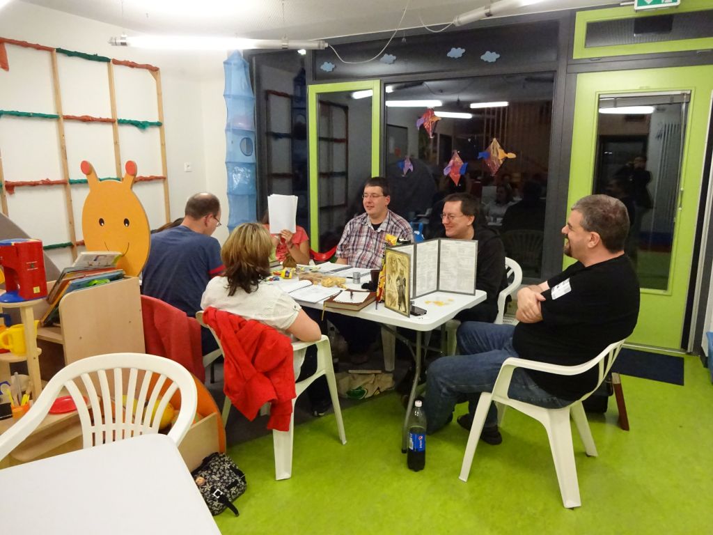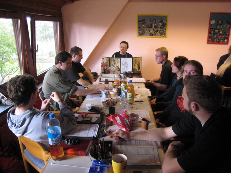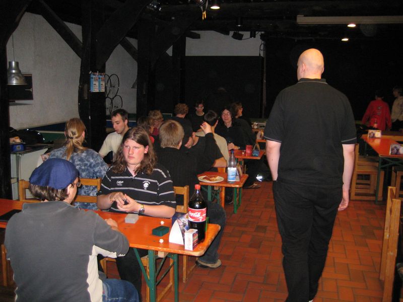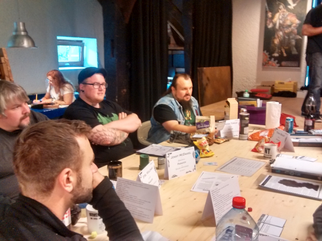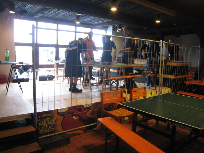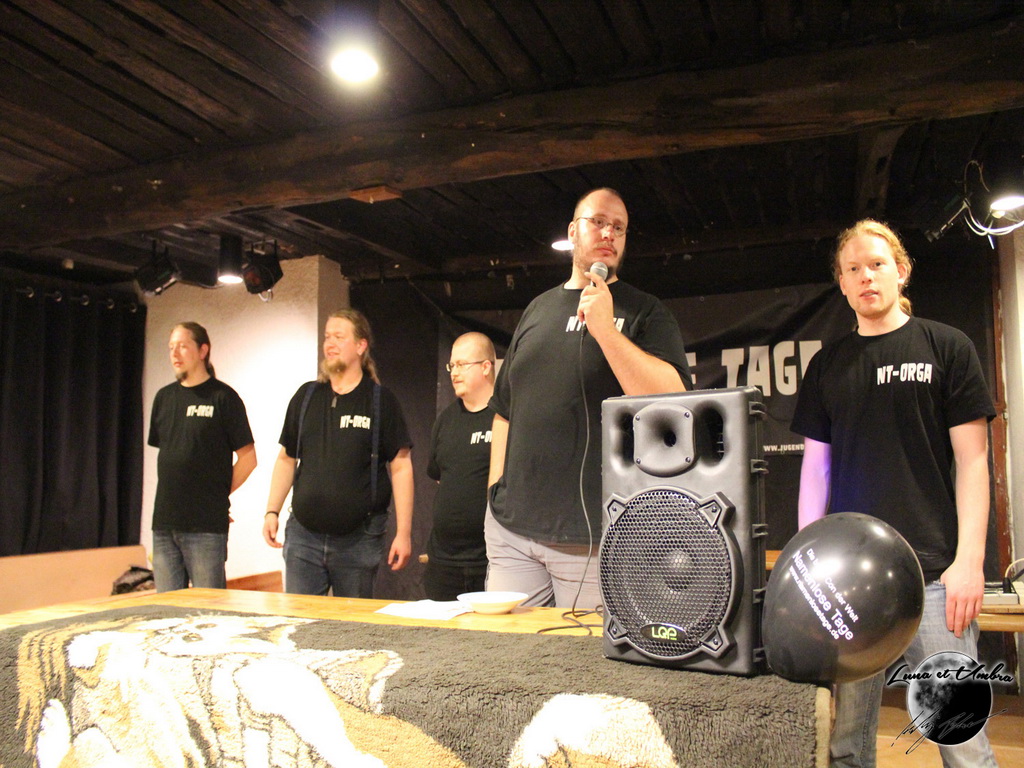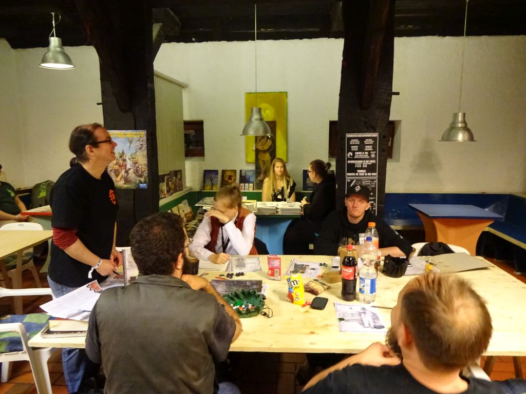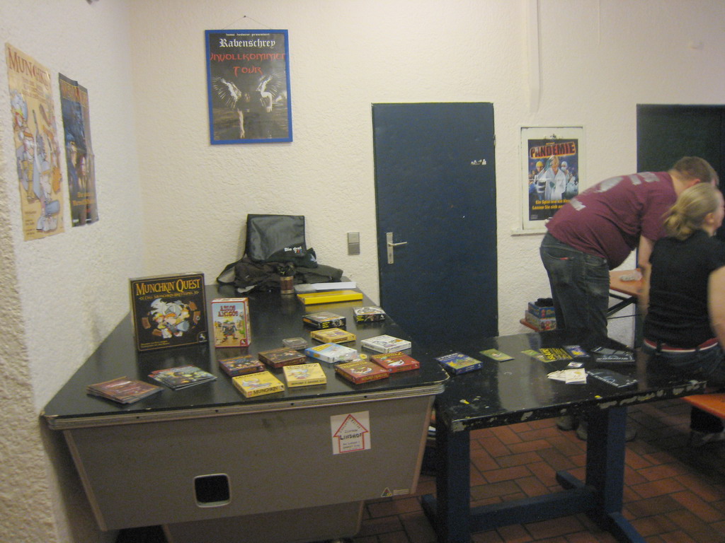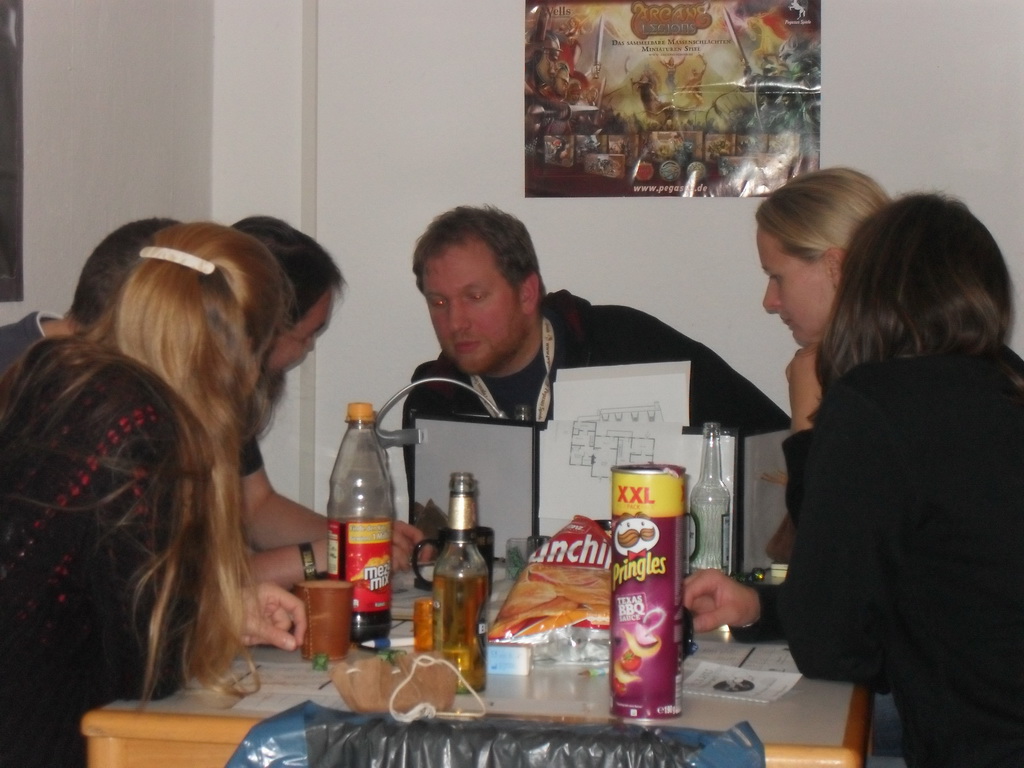 Im Vorfeld: Also irgendwie war von Anfang an der Wurm drin. Die Vorbereitungen zu den 24. Namenlosen Tagen waren ein auf und nieder und vor allem von Rückschlägen gezeichnet. Zunächst hatte man den Plan, die Menge der Spieltische um 10% zu erhöhen, da man den Schlafsaal in die neue, benachbarte Kita auslagern konnte und im Jugendhaus kleine bauliche Veränderungen vorgenommen wurden. Doch als es dann hieß, man könne die obere Etage nicht mehr nutzen, fing der Schlamassel an. Ursprünglich sollte Robert Corvus gemeinsam mit Bernhard Hennen am Freitag eine Lesung veranstalten, ersterer musste dann aber einem anderen Termin den Vorzug geben. Weitere kleine Probleme mussten aus dem Weg geräumt werden, aber als dann unsere lieb gewonnene Putzfrau in den verdienten Ruhestand ging, sah sich die Orga schon am Sonntag bis 0 Uhr im Kindergarten die Böden wischen. Letztendlich konnte in der letzten Woche vor den Namenlosen Tagen alles in die richtigen Bahnen gelenkt werden und man harrte gespannt der Dinge, die da kommen sollten.