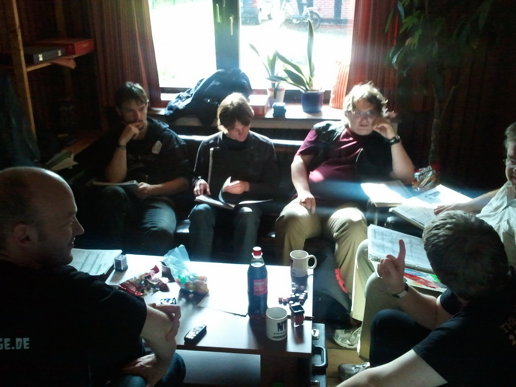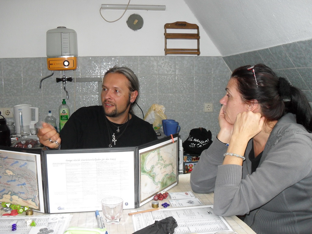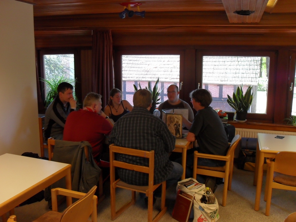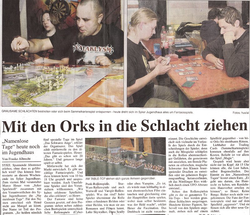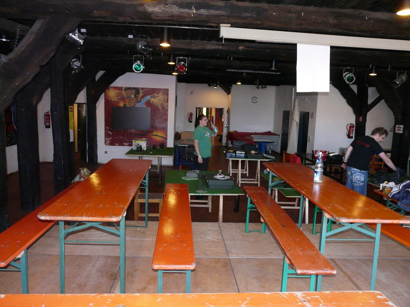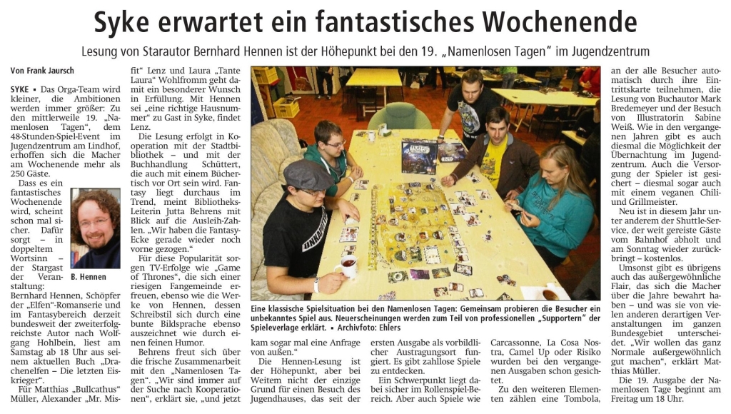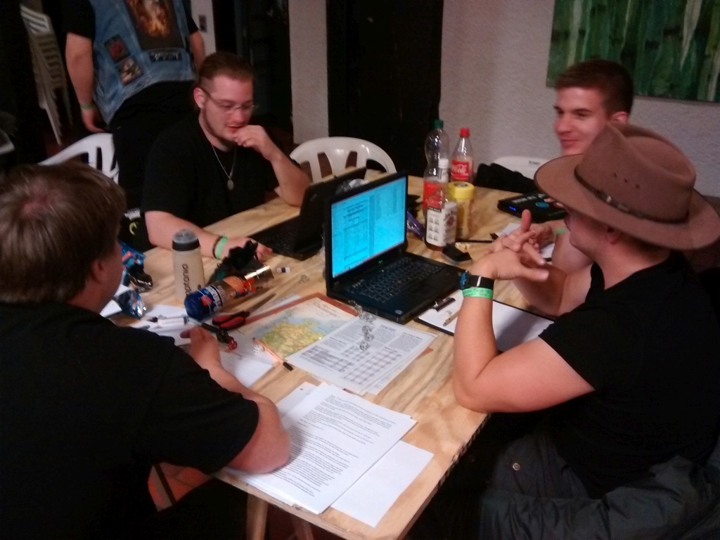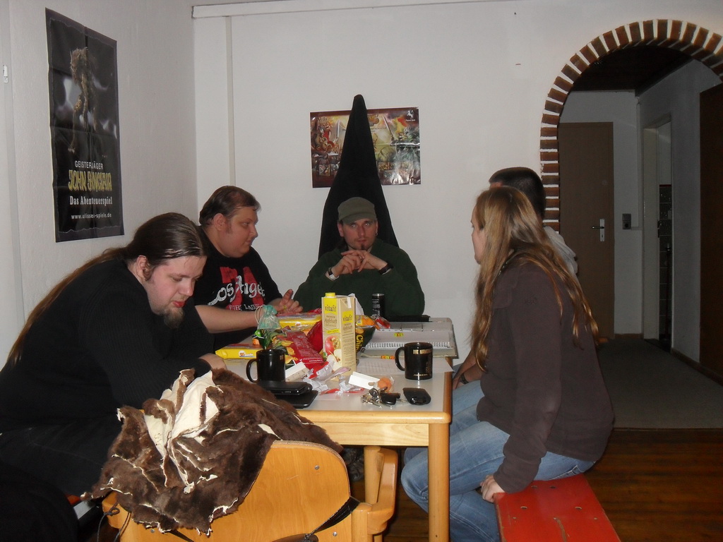 Im Vorfeld: Also irgendwie war von Anfang an der Wurm drin. Die Vorbereitungen zu den 24. Namenlosen Tagen waren ein auf und nieder und vor allem von Rückschlägen gezeichnet. Zunächst hatte man den Plan, die Menge der Spieltische um 10% zu erhöhen, da man den Schlafsaal in die neue, benachbarte Kita auslagern konnte und im Jugendhaus kleine bauliche Veränderungen vorgenommen wurden. Doch als es dann hieß, man könne die obere Etage nicht mehr nutzen, fing der Schlamassel an. Ursprünglich sollte Robert Corvus gemeinsam mit Bernhard Hennen am Freitag eine Lesung veranstalten, ersterer musste dann aber einem anderen Termin den Vorzug geben. Weitere kleine Probleme mussten aus dem Weg geräumt werden, aber als dann unsere lieb gewonnene Putzfrau in den verdienten Ruhestand ging, sah sich die Orga schon am Sonntag bis 0 Uhr im Kindergarten die Böden wischen. Letztendlich konnte in der letzten Woche vor den Namenlosen Tagen alles in die richtigen Bahnen gelenkt werden und man harrte gespannt der Dinge, die da kommen sollten.