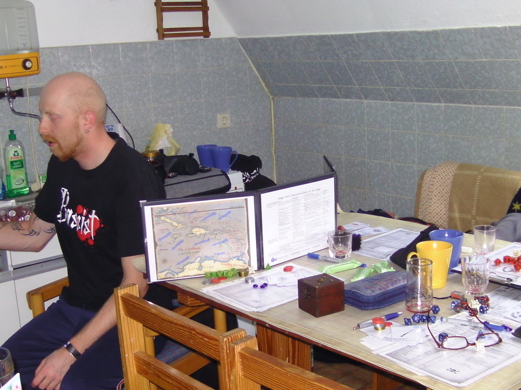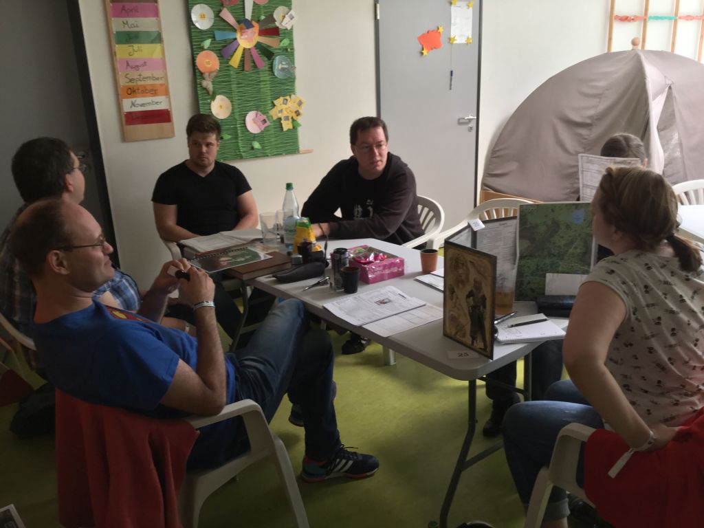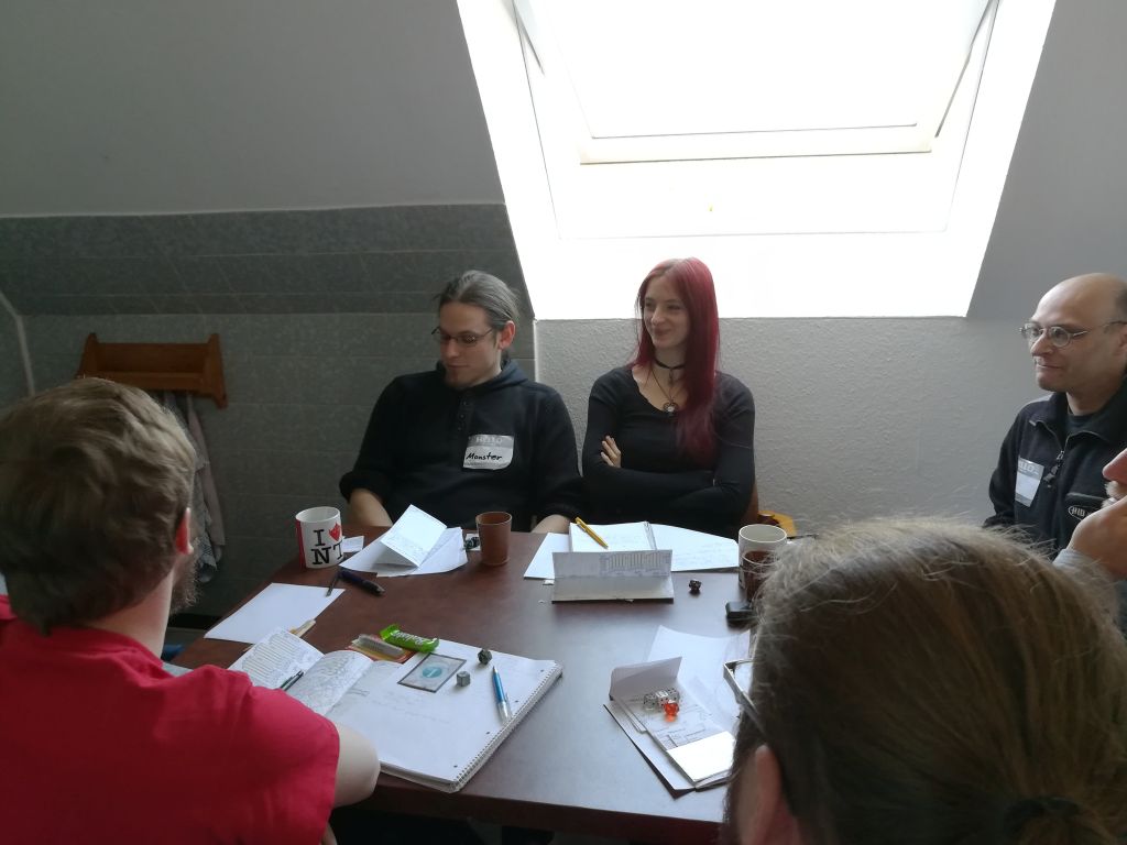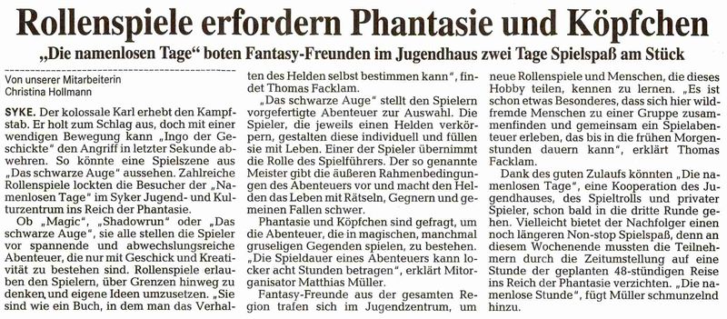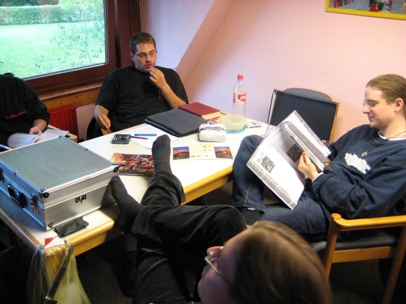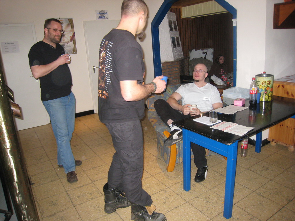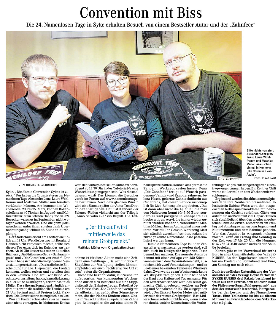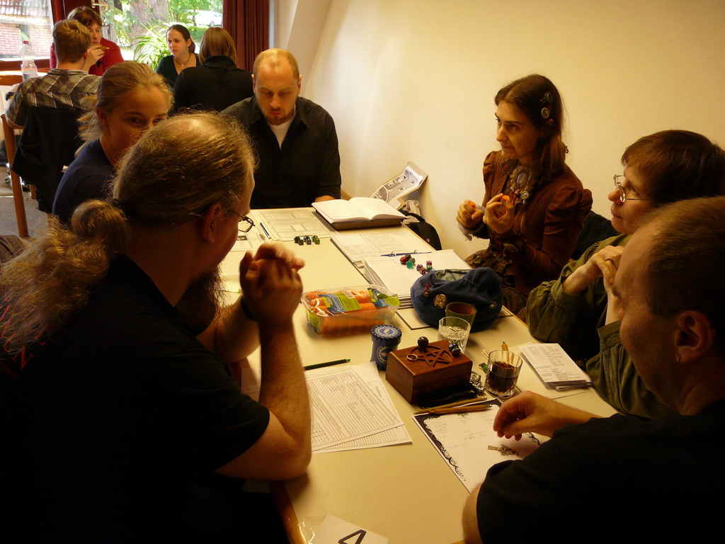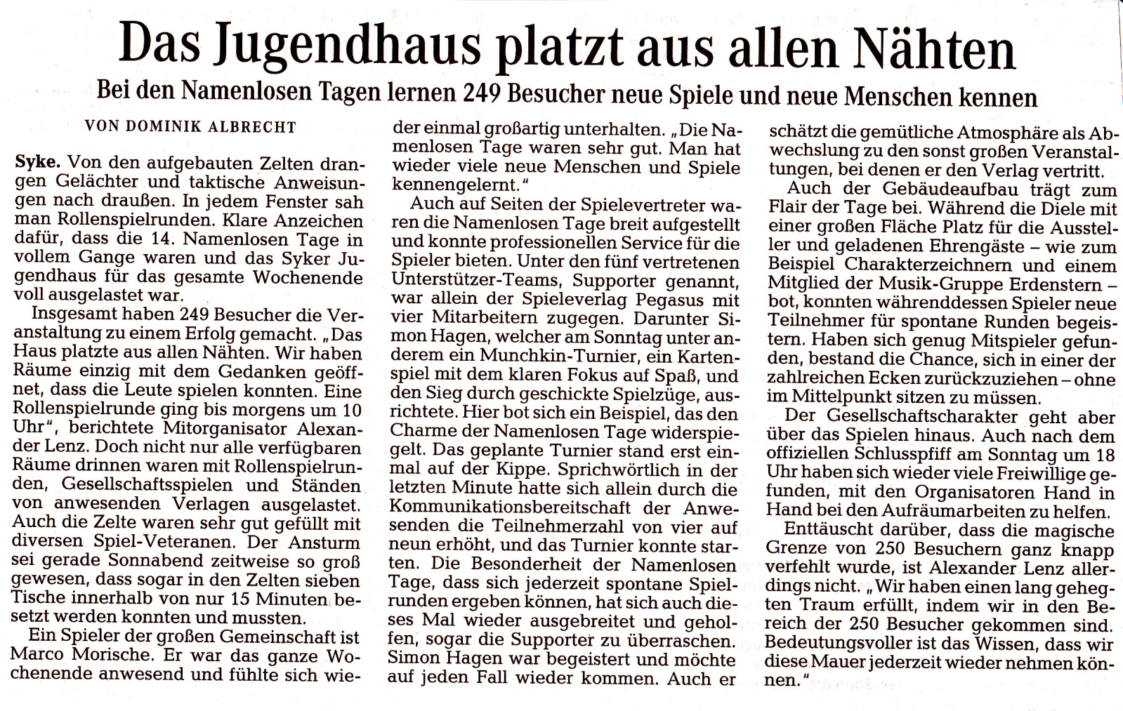 Im Vorfeld: Also irgendwie war von Anfang an der Wurm drin. Die Vorbereitungen zu den 24. Namenlosen Tagen waren ein auf und nieder und vor allem von Rückschlägen gezeichnet. Zunächst hatte man den Plan, die Menge der Spieltische um 10% zu erhöhen, da man den Schlafsaal in die neue, benachbarte Kita auslagern konnte und im Jugendhaus kleine bauliche Veränderungen vorgenommen wurden. Doch als es dann hieß, man könne die obere Etage nicht mehr nutzen, fing der Schlamassel an. Ursprünglich sollte Robert Corvus gemeinsam mit Bernhard Hennen am Freitag eine Lesung veranstalten, ersterer musste dann aber einem anderen Termin den Vorzug geben. Weitere kleine Probleme mussten aus dem Weg geräumt werden, aber als dann unsere lieb gewonnene Putzfrau in den verdienten Ruhestand ging, sah sich die Orga schon am Sonntag bis 0 Uhr im Kindergarten die Böden wischen. Letztendlich konnte in der letzten Woche vor den Namenlosen Tagen alles in die richtigen Bahnen gelenkt werden und man harrte gespannt der Dinge, die da kommen sollten.