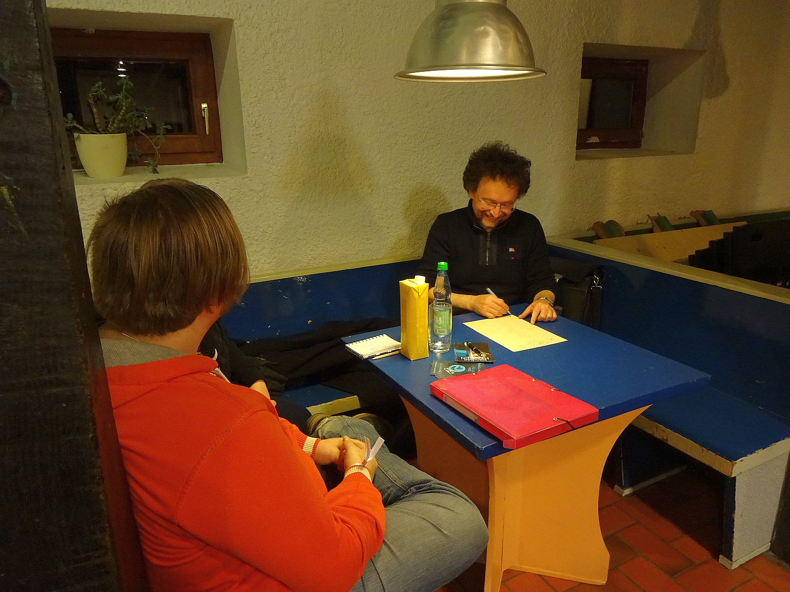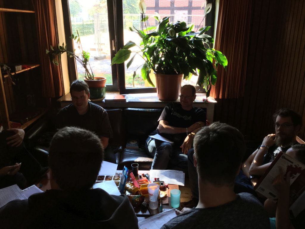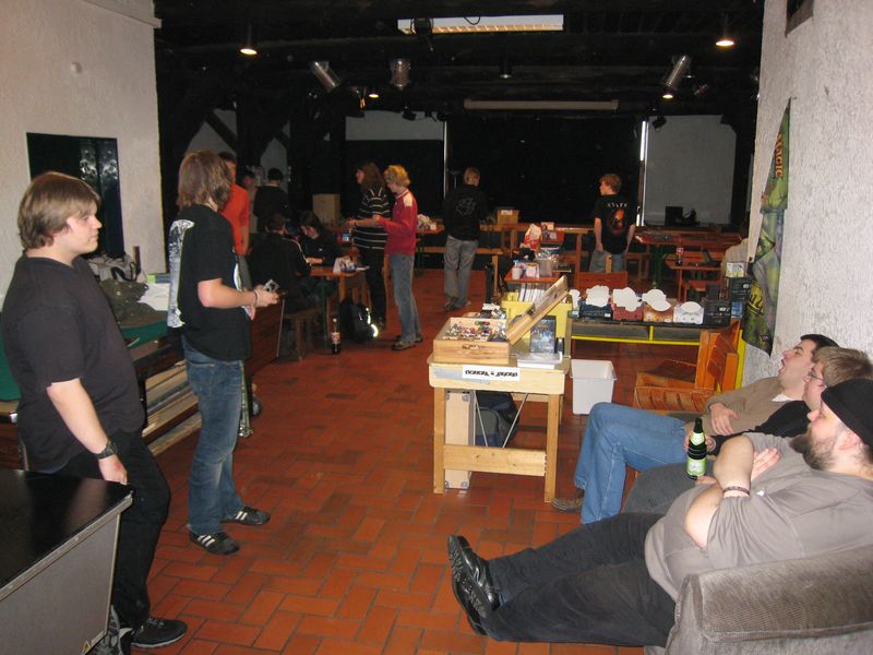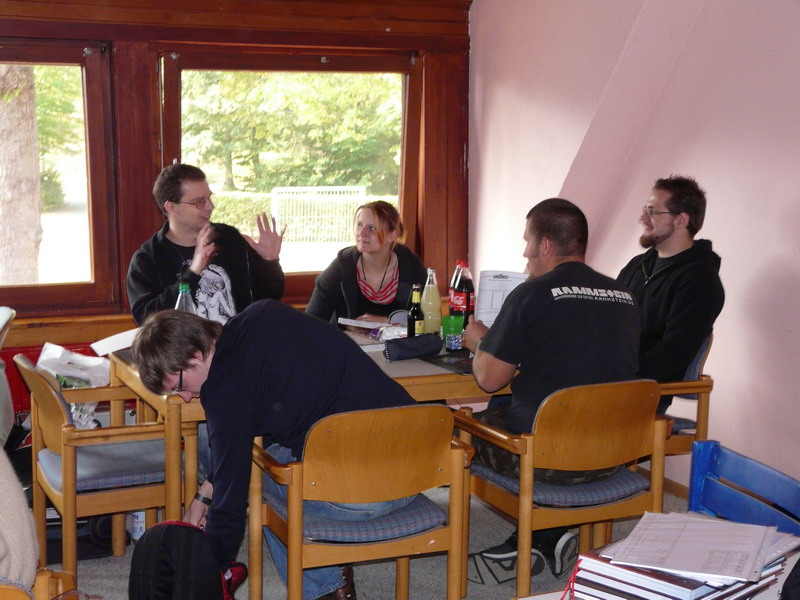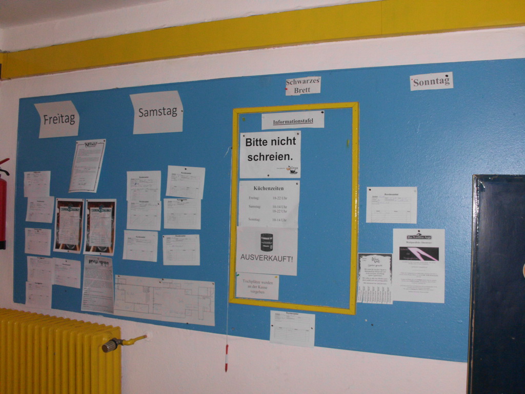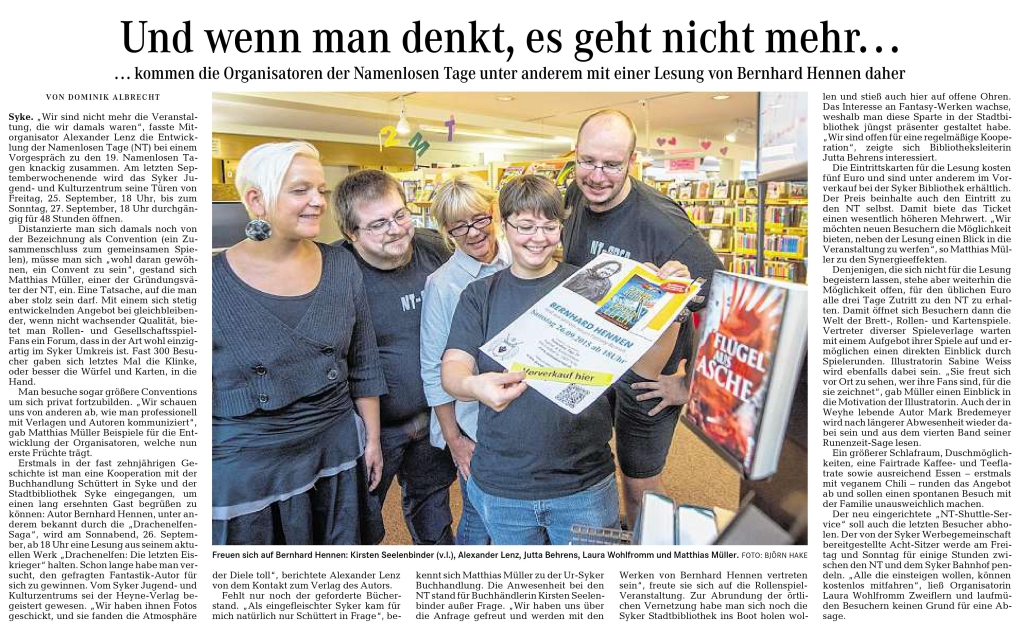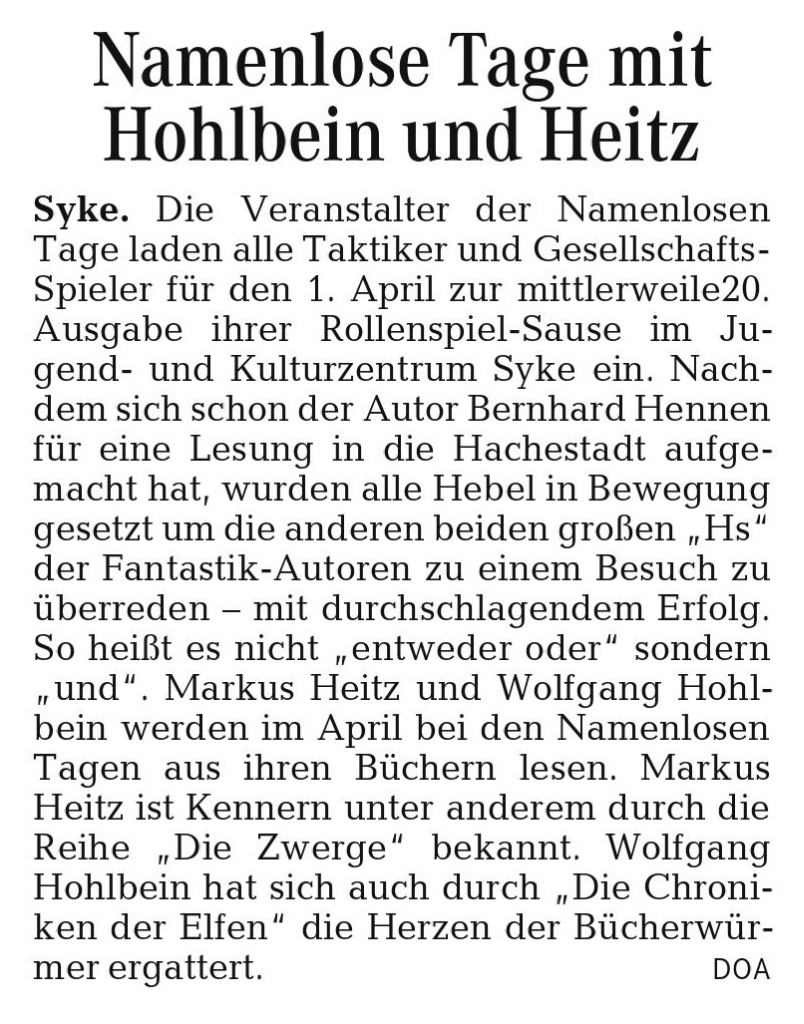 Im Vorfeld: Also irgendwie war von Anfang an der Wurm drin. Die Vorbereitungen zu den 24. Namenlosen Tagen waren ein auf und nieder und vor allem von Rückschlägen gezeichnet. Zunächst hatte man den Plan, die Menge der Spieltische um 10% zu erhöhen, da man den Schlafsaal in die neue, benachbarte Kita auslagern konnte und im Jugendhaus kleine bauliche Veränderungen vorgenommen wurden. Doch als es dann hieß, man könne die obere Etage nicht mehr nutzen, fing der Schlamassel an. Ursprünglich sollte Robert Corvus gemeinsam mit Bernhard Hennen am Freitag eine Lesung veranstalten, ersterer musste dann aber einem anderen Termin den Vorzug geben. Weitere kleine Probleme mussten aus dem Weg geräumt werden, aber als dann unsere lieb gewonnene Putzfrau in den verdienten Ruhestand ging, sah sich die Orga schon am Sonntag bis 0 Uhr im Kindergarten die Böden wischen. Letztendlich konnte in der letzten Woche vor den Namenlosen Tagen alles in die richtigen Bahnen gelenkt werden und man harrte gespannt der Dinge, die da kommen sollten.