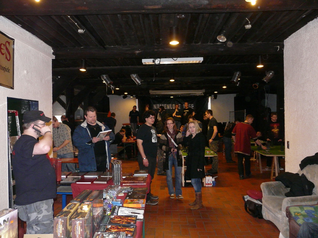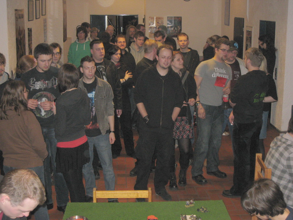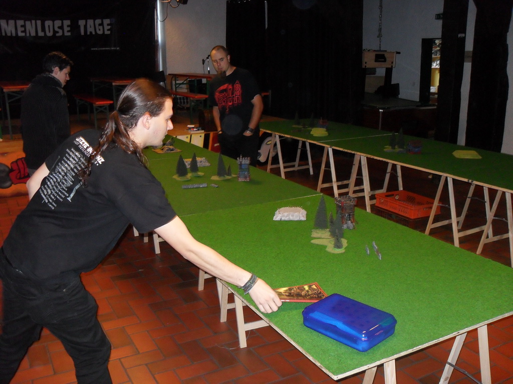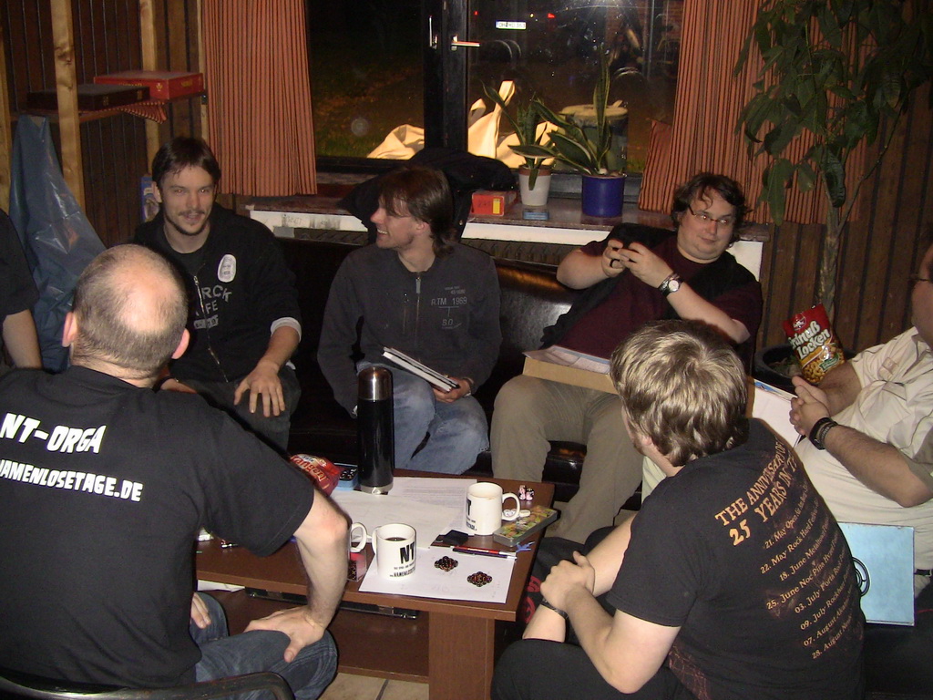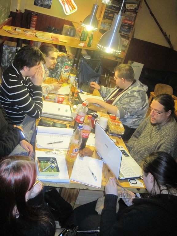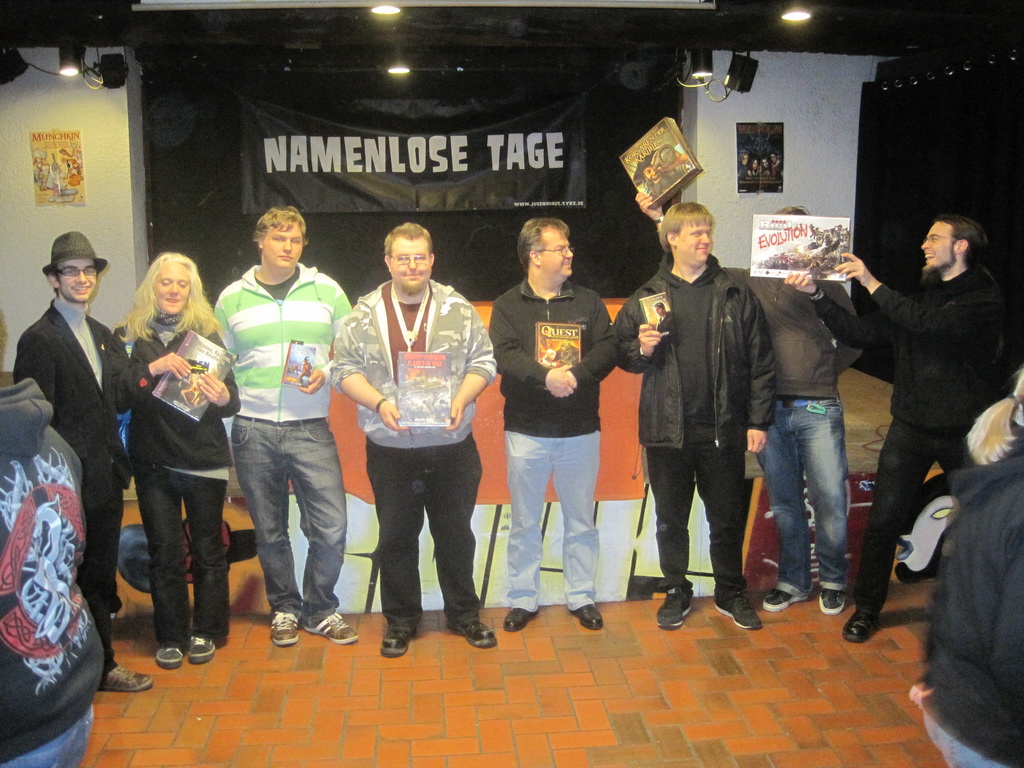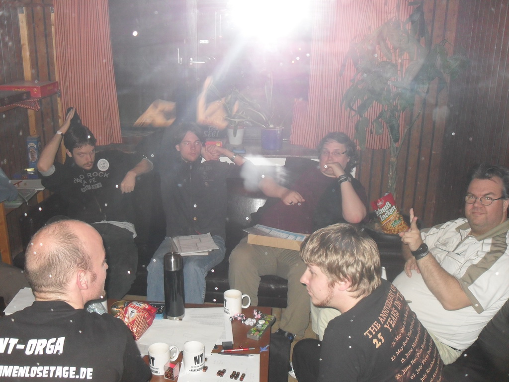 NT12: Ein eiskalter Wind schien die Besucher am Freitag der Veranstaltung in unser warmes Haus zu treiben. Man sammelte sich kurze Hand in kleinen Gruppen und begann das Haus zu einem Gesellschaftsspiel Tempel umzubauen. Eine noch nie gesehene Vielfalt an Brett- und Kartenspielen überraschte genauso, wie die neue Rekordmarke von 121 Besucher für den ersten Abend. Der Samstag wurde sowohl von weiteren eintreffenden Gästen, als auch dem Warhammer Fantasy Turnier eingeleitet. Der Himmel klarte nur für wenige Sonnenstrahlen auf, bevor der eisige Wind die Wolken wieder zu einer grauen Masse verband. Die Rollenspieler kuschelten sich zusammen und liefen, wie der Heizpilz im Zelt, zur Höchstform auf. Bis zum Abend waren das Haus und die Spielrunden ausgefüllt und den Besuchern wurde vor der Tombola durch eine kleine Feuershow noch einmal kräftig eingeheizt. Im Anschluss konnte verkündet werden, das bereits 185 Gäste den Weg zur NT gefunden haben und dann wurden sich Spielorte für die Nacht gesucht. Das traditionelle Pokerturnier zur späten Stunde konnte erneut eine Rekordteilnehmerzahl verkünden und der Gewinner der Letzten Veranstaltung musste sich geschlagen geben, da ein neuer Champion gekürt wurde. Der Sonntag startete mit dem Eintreffen der Warmaschine Hordes Leuten, welche noch einmal für eine kleine Steigerung der Besucher beitragen konnten. Durch das Nichtzustandekommen der beiden traditionellen Eckpunkte am Sonntag, Magic Turnier und Bogenschießen, blieb auch ein weiterer Schwung neuer Leute verwehrt. Dennoch blühten die Gesellschafts- und Rollenspielbereiche auf und verlebten einen ruhigen Ausklang der Veranstaltung. Zum Schluss der Veranstaltung konnten 208 Besucher gezählt werden und man sah zufrieden den 6 Monate später stattfinden 13. Namenlosen Tagen entgegen... dem Ende.