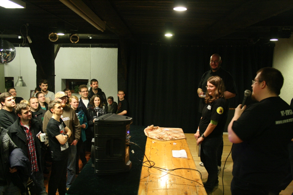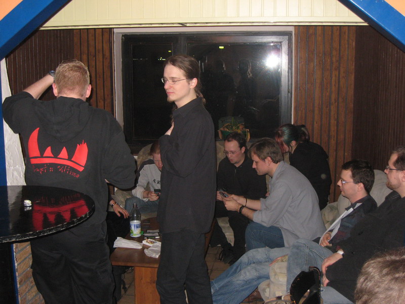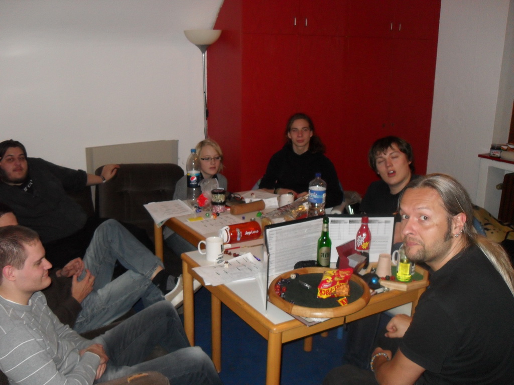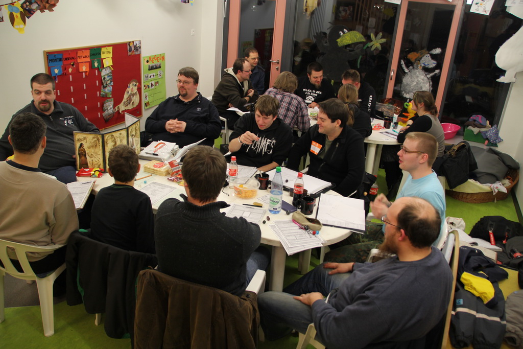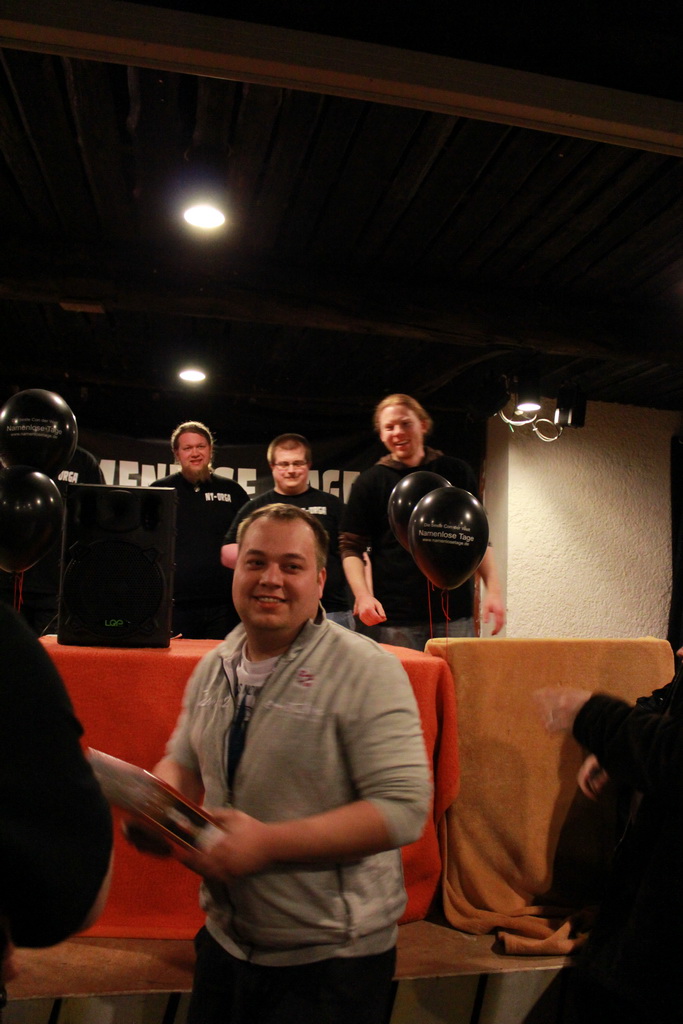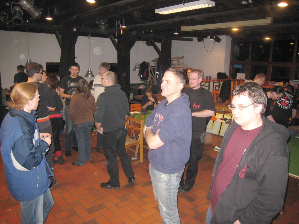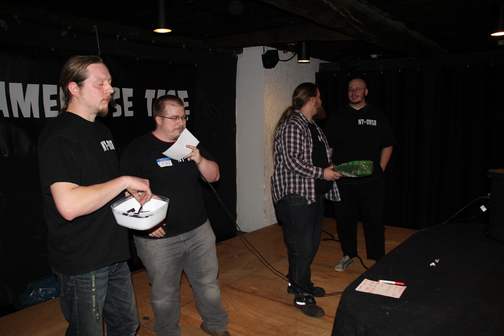NT12: Ein eiskalter Wind schien die Besucher am Freitag der Veranstaltung in unser warmes Haus zu treiben. Man sammelte sich kurze Hand in kleinen Gruppen und begann das Haus zu einem Gesellschaftsspiel Tempel umzubauen. Eine noch nie gesehene Vielfalt an Brett- und Kartenspielen überraschte genauso, wie die neue Rekordmarke von 121 Besucher für den ersten Abend. Der Samstag wurde sowohl von weiteren eintreffenden Gästen, als auch dem Warhammer Fantasy Turnier eingeleitet. Der Himmel klarte nur für wenige Sonnenstrahlen auf, bevor der eisige Wind die Wolken wieder zu einer grauen Masse verband. Die Rollenspieler kuschelten sich zusammen und liefen, wie der Heizpilz im Zelt, zur Höchstform auf. Bis zum Abend waren das Haus und die Spielrunden ausgefüllt und den Besuchern wurde vor der Tombola durch eine kleine Feuershow noch einmal kräftig eingeheizt. Im Anschluss konnte verkündet werden, das bereits 185 Gäste den Weg zur NT gefunden haben und dann wurden sich Spielorte für die Nacht gesucht. Das traditionelle Pokerturnier zur späten Stunde konnte erneut eine Rekordteilnehmerzahl verkünden und der Gewinner der Letzten Veranstaltung musste sich geschlagen geben, da ein neuer Champion gekürt wurde. Der Sonntag startete mit dem Eintreffen der Warmaschine Hordes Leuten, welche noch einmal für eine kleine Steigerung der Besucher beitragen konnten. Durch das Nichtzustandekommen der beiden traditionellen Eckpunkte am Sonntag, Magic Turnier und Bogenschießen, blieb auch ein weiterer Schwung neuer Leute verwehrt. Dennoch blühten die Gesellschafts- und Rollenspielbereiche auf und verlebten einen ruhigen Ausklang der Veranstaltung. Zum Schluss der Veranstaltung konnten 208 Besucher gezählt werden und man sah zufrieden den 6 Monate später stattfinden 13. Namenlosen Tagen entgegen... dem Ende.