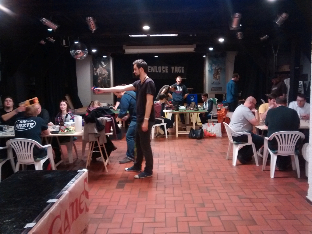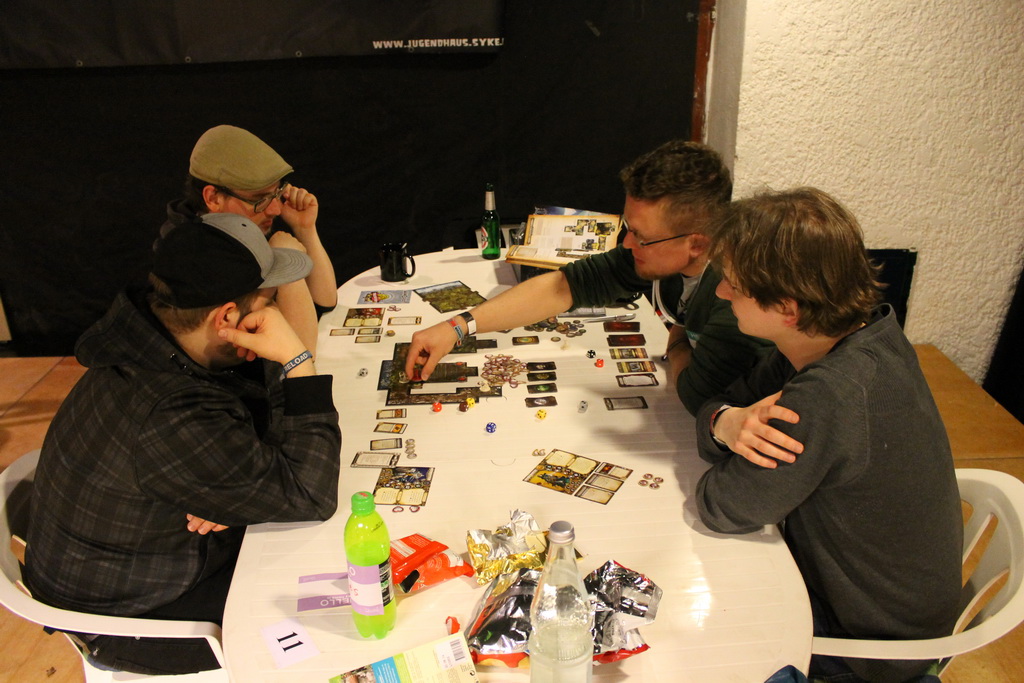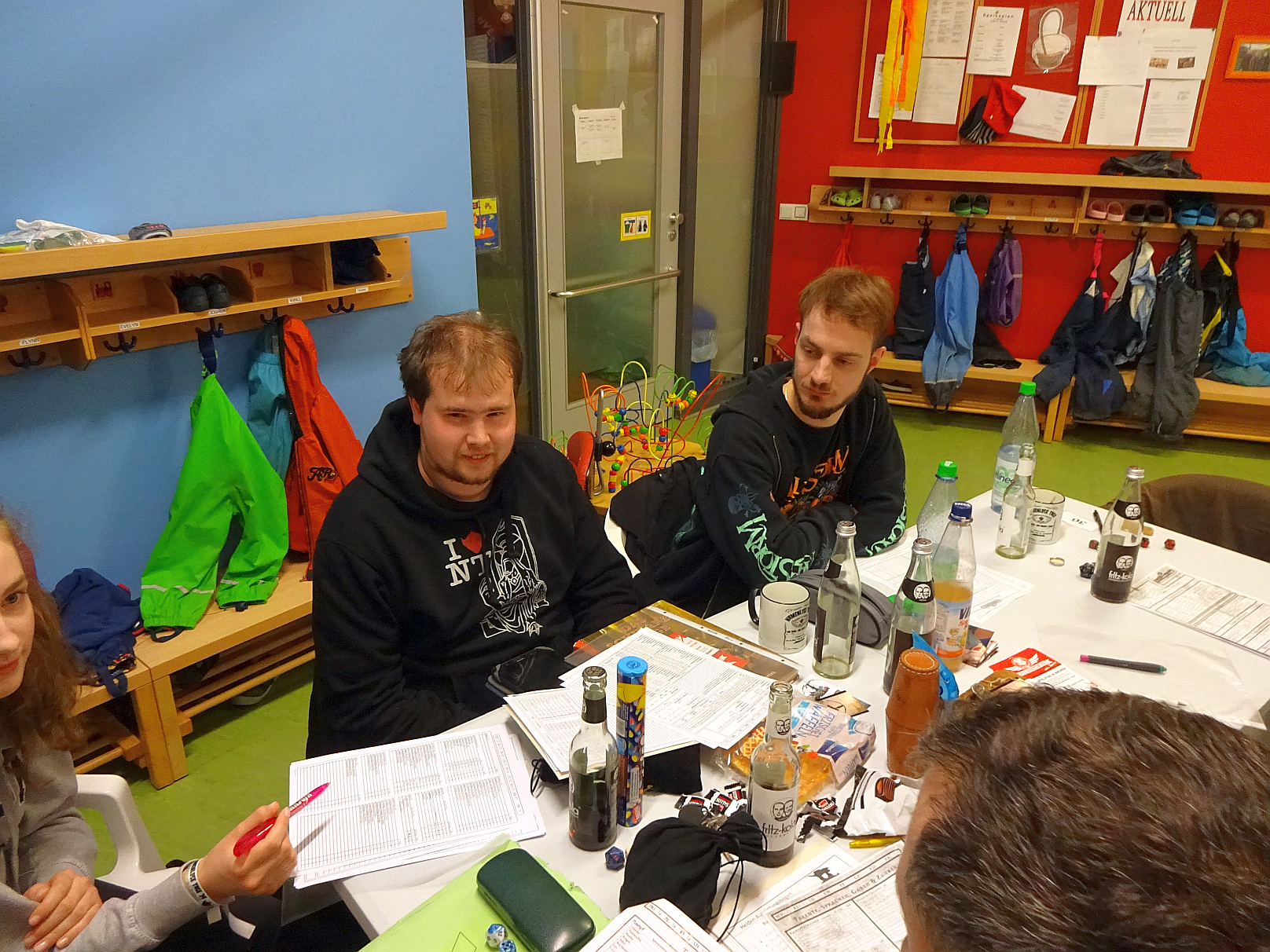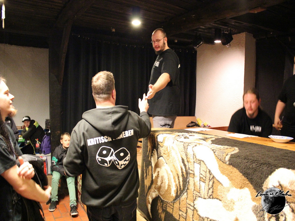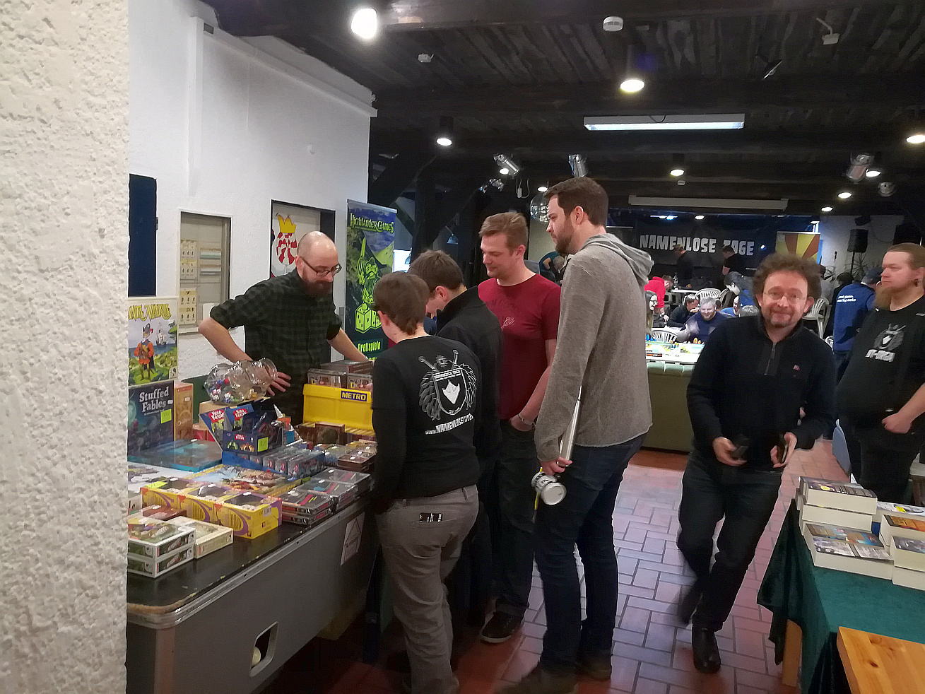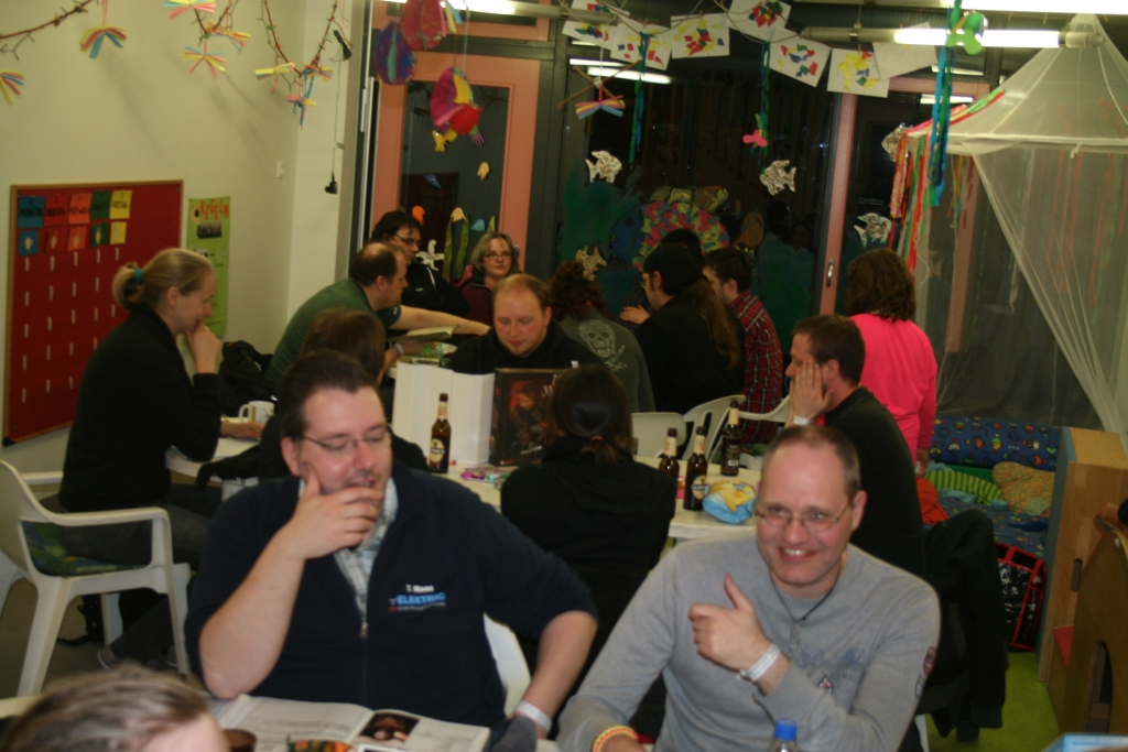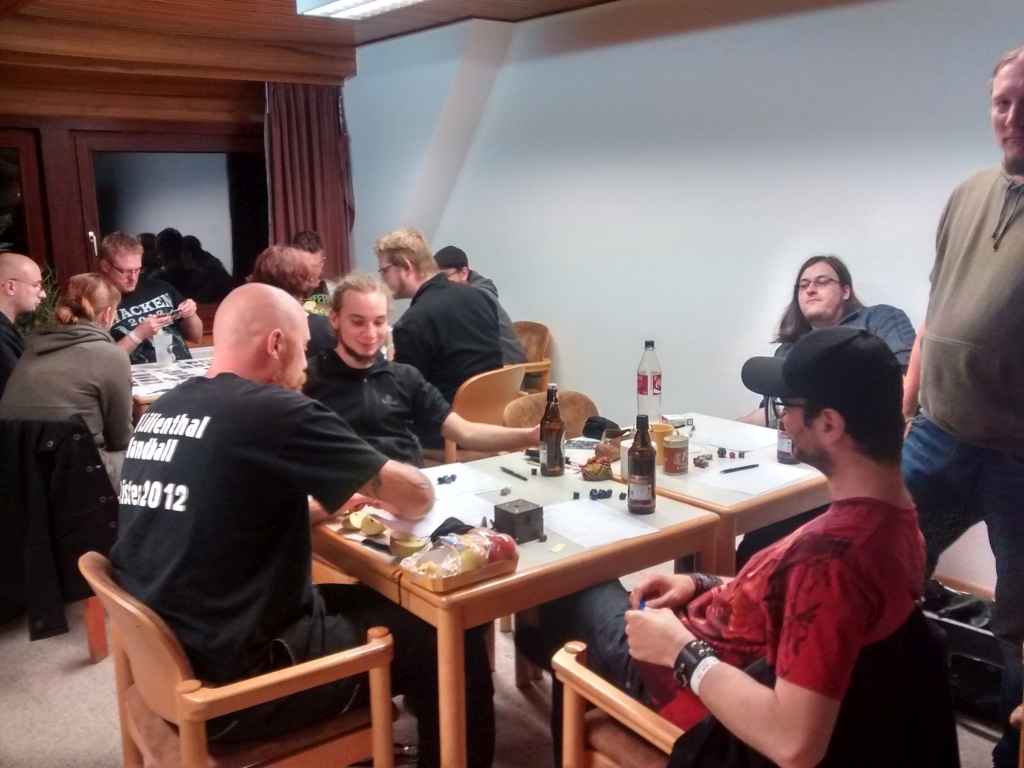 NT24: Bei frischem, wenn doch trockenem Wetter, öffneten sich die Pforten gegen 17:30 Uhr und der Run auf die Tassen im JD Style konnte beginnen. Mit Flatrate und Proviant gewappnet ging es auch schon an die Spieltische. Wer hingegen etwas Kultur genießen wollte, war in der Lesung mit Bernhard Hennen genau richtig. Als der Chilimeister zum Mitternachtsimbiss rief und auch der letzte eine Spielrunde oder bereits einen Platz im Schlafraum der neuen Kita gefunden hatte, ging der Freitag mit einem neuen Besucherrekord von 212 Gästen zu Ende. Am Samstag sollte es spannend werden, ob der Wegfall des Obergeschosses im Jugendhaus auf die Tischreserven auswirken sollte, doch dem war nicht so. Auch einem erneuten Wurststau konnte entgegengewirkt werden, trotz dessen es zu kurzen Wartezeiten beim Grillmeister kam. Mit der Wunschlesung von Bernhard Hennen und Tom Daut wurde auch der Samstag Nachmittag literarisch aufgewertet. Bei der Tombola am Abend konnte man gleich zu Beginn, oder doch am Ende, den verwirrten Gästen eine Besucherzahl von 310 präsentieren. Am Sonntag sollte, ausser beim Grillmeister nichts mehr anbrennen. Die Besucher die es bis dahin geschafft hatten gegen die Müdigkeit anzukämpfen nutzten nochmal ihre Flatrate und spielten bis zur letzten Minute. Mit 321 Gästen, ging die an der Besucherzahl gemessene zweit stärkste Märzveranstaltung zu Ende.