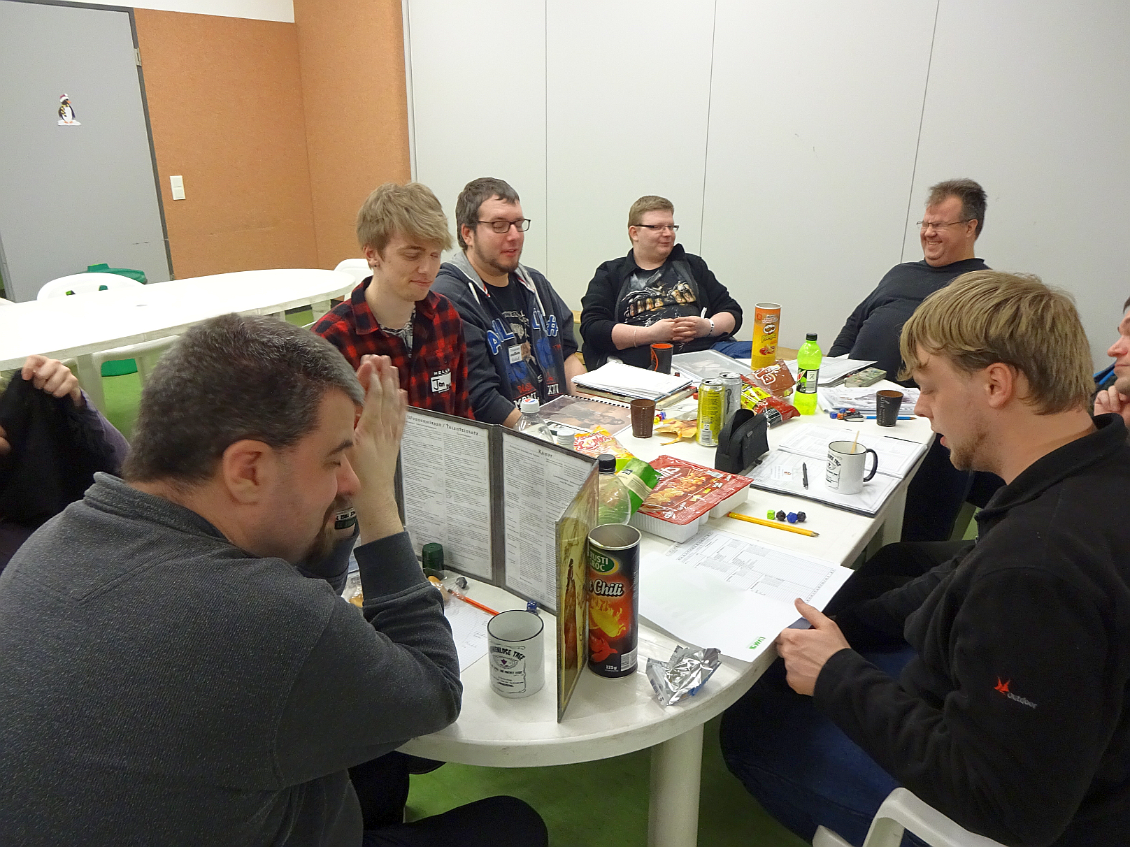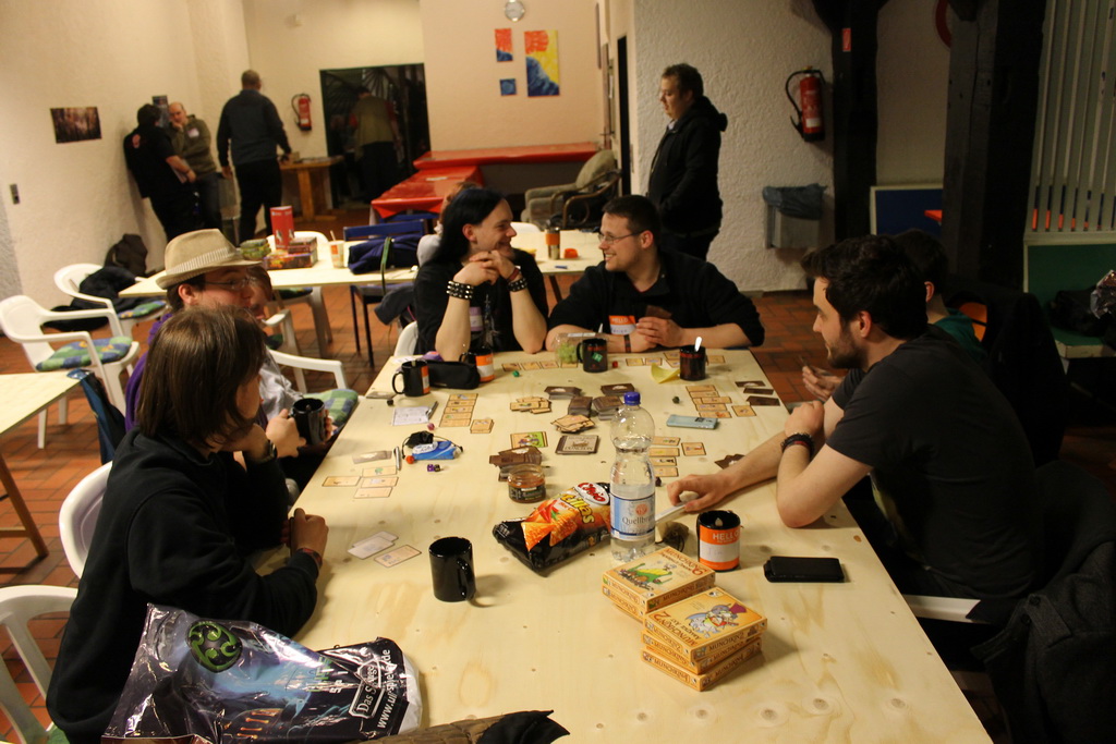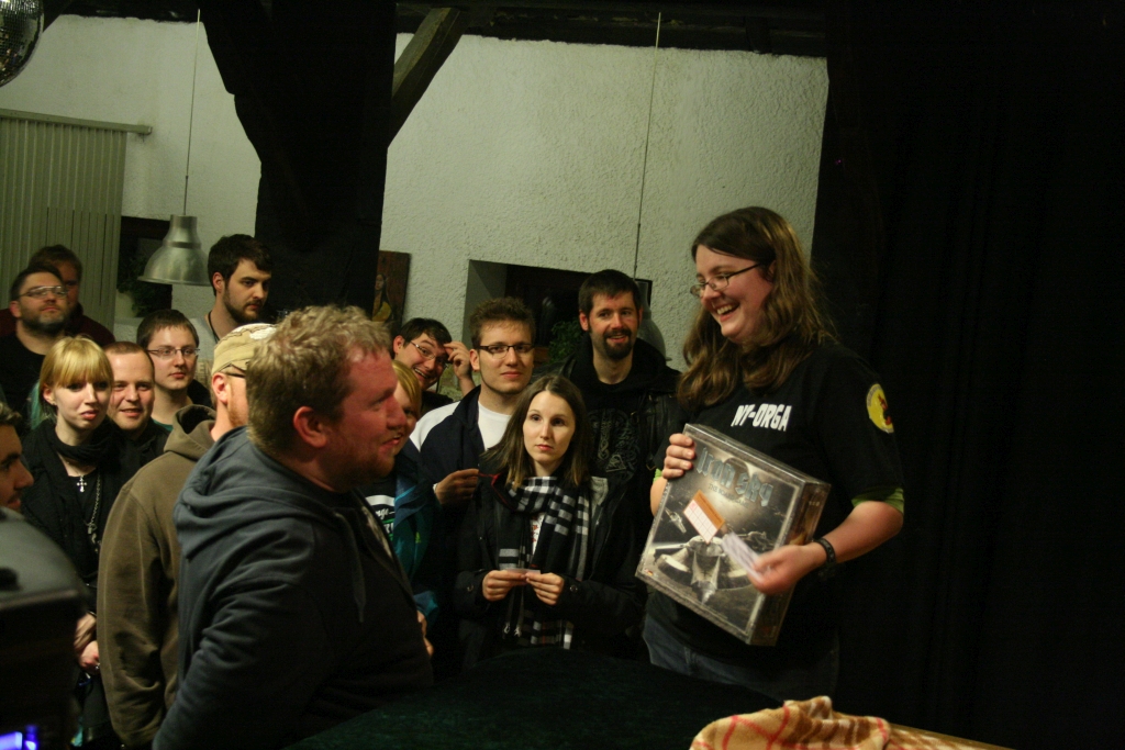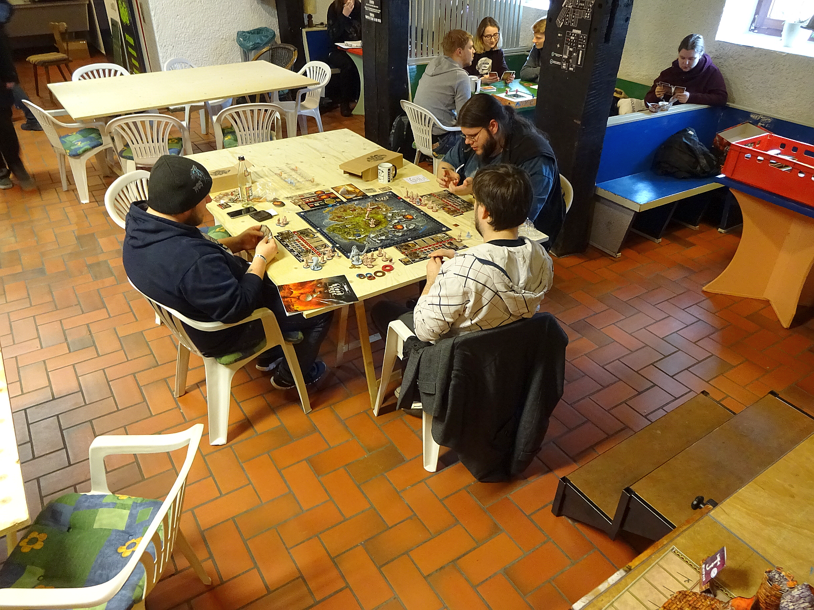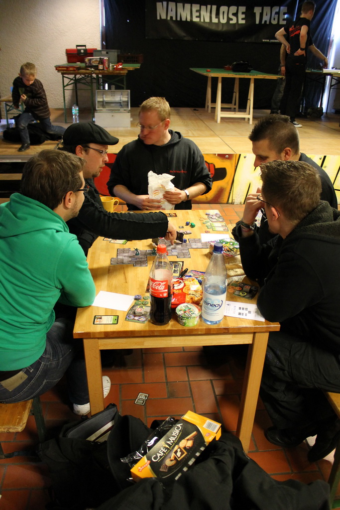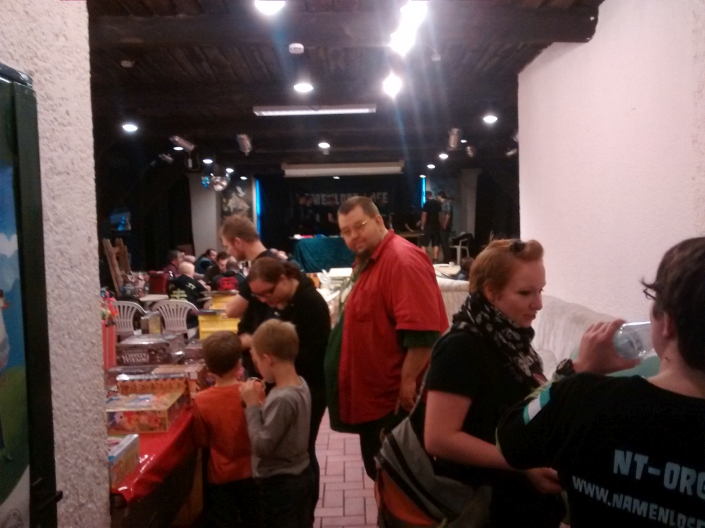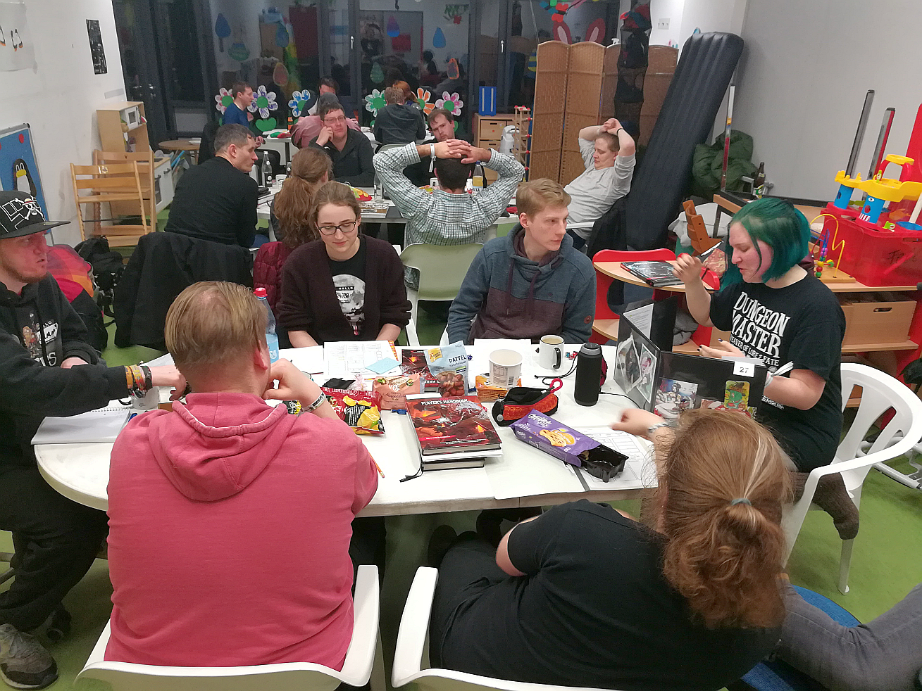 NT24: Bei frischem, wenn doch trockenem Wetter, öffneten sich die Pforten gegen 17:30 Uhr und der Run auf die Tassen im JD Style konnte beginnen. Mit Flatrate und Proviant gewappnet ging es auch schon an die Spieltische. Wer hingegen etwas Kultur genießen wollte, war in der Lesung mit Bernhard Hennen genau richtig. Als der Chilimeister zum Mitternachtsimbiss rief und auch der letzte eine Spielrunde oder bereits einen Platz im Schlafraum der neuen Kita gefunden hatte, ging der Freitag mit einem neuen Besucherrekord von 212 Gästen zu Ende. Am Samstag sollte es spannend werden, ob der Wegfall des Obergeschosses im Jugendhaus auf die Tischreserven auswirken sollte, doch dem war nicht so. Auch einem erneuten Wurststau konnte entgegengewirkt werden, trotz dessen es zu kurzen Wartezeiten beim Grillmeister kam. Mit der Wunschlesung von Bernhard Hennen und Tom Daut wurde auch der Samstag Nachmittag literarisch aufgewertet. Bei der Tombola am Abend konnte man gleich zu Beginn, oder doch am Ende, den verwirrten Gästen eine Besucherzahl von 310 präsentieren. Am Sonntag sollte, ausser beim Grillmeister nichts mehr anbrennen. Die Besucher die es bis dahin geschafft hatten gegen die Müdigkeit anzukämpfen nutzten nochmal ihre Flatrate und spielten bis zur letzten Minute. Mit 321 Gästen, ging die an der Besucherzahl gemessene zweit stärkste Märzveranstaltung zu Ende.