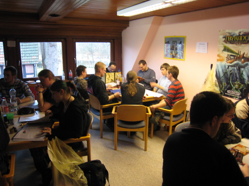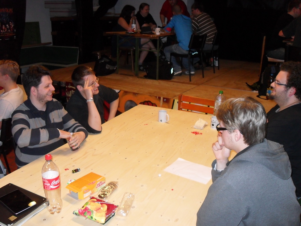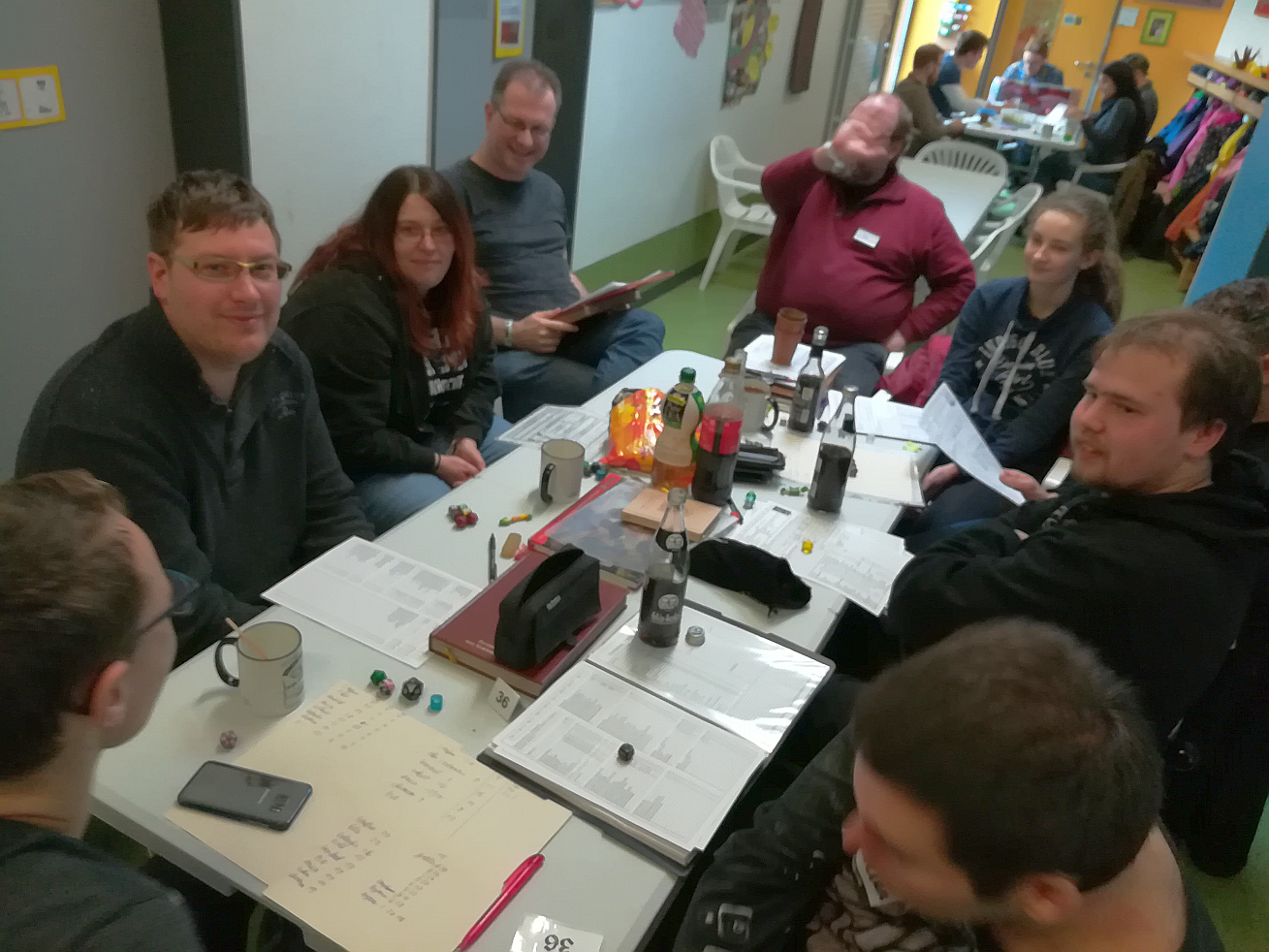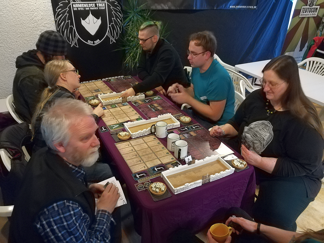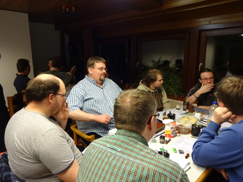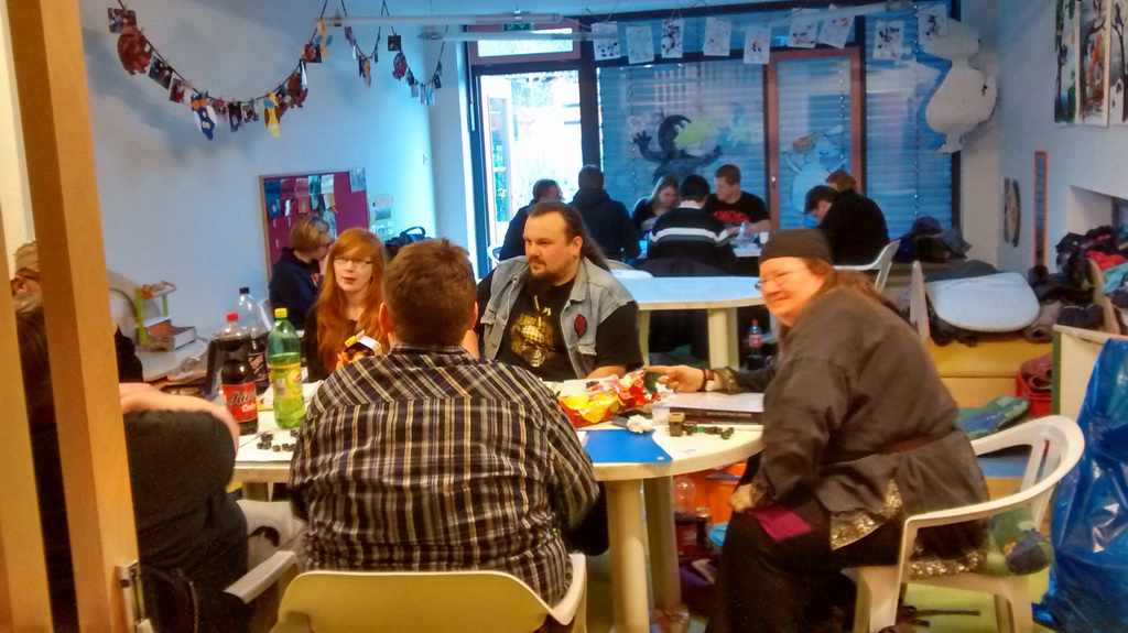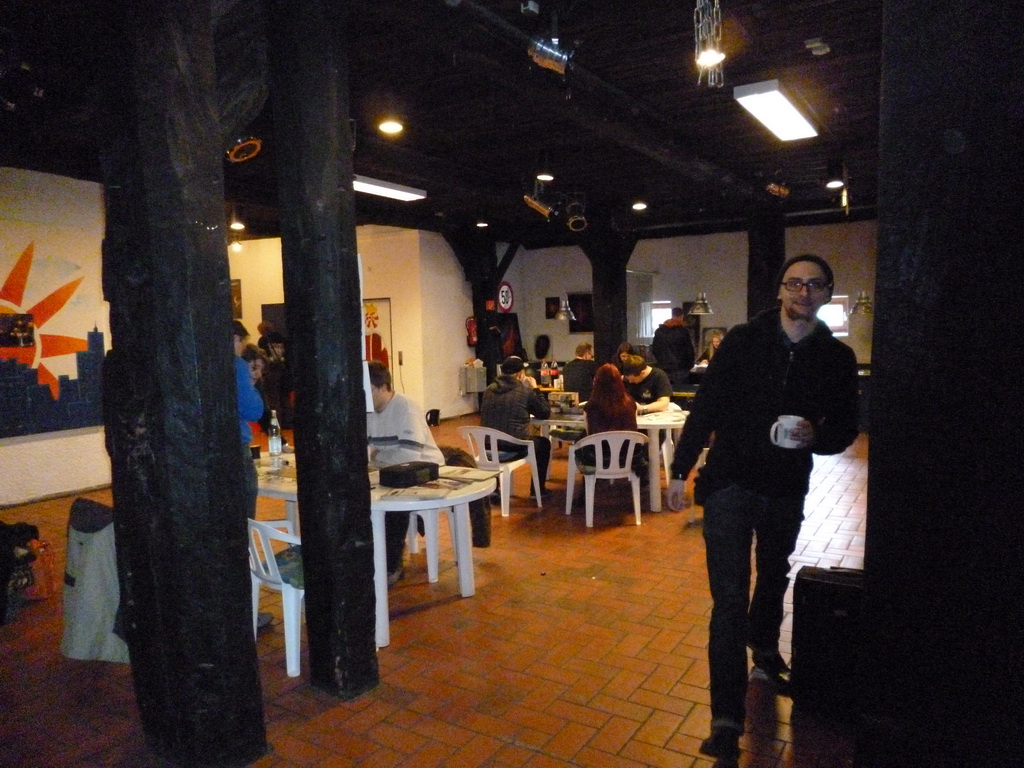 NT24: Bei frischem, wenn doch trockenem Wetter, öffneten sich die Pforten gegen 17:30 Uhr und der Run auf die Tassen im JD Style konnte beginnen. Mit Flatrate und Proviant gewappnet ging es auch schon an die Spieltische. Wer hingegen etwas Kultur genießen wollte, war in der Lesung mit Bernhard Hennen genau richtig. Als der Chilimeister zum Mitternachtsimbiss rief und auch der letzte eine Spielrunde oder bereits einen Platz im Schlafraum der neuen Kita gefunden hatte, ging der Freitag mit einem neuen Besucherrekord von 212 Gästen zu Ende. Am Samstag sollte es spannend werden, ob der Wegfall des Obergeschosses im Jugendhaus auf die Tischreserven auswirken sollte, doch dem war nicht so. Auch einem erneuten Wurststau konnte entgegengewirkt werden, trotz dessen es zu kurzen Wartezeiten beim Grillmeister kam. Mit der Wunschlesung von Bernhard Hennen und Tom Daut wurde auch der Samstag Nachmittag literarisch aufgewertet. Bei der Tombola am Abend konnte man gleich zu Beginn, oder doch am Ende, den verwirrten Gästen eine Besucherzahl von 310 präsentieren. Am Sonntag sollte, ausser beim Grillmeister nichts mehr anbrennen. Die Besucher die es bis dahin geschafft hatten gegen die Müdigkeit anzukämpfen nutzten nochmal ihre Flatrate und spielten bis zur letzten Minute. Mit 321 Gästen, ging die an der Besucherzahl gemessene zweit stärkste Märzveranstaltung zu Ende.