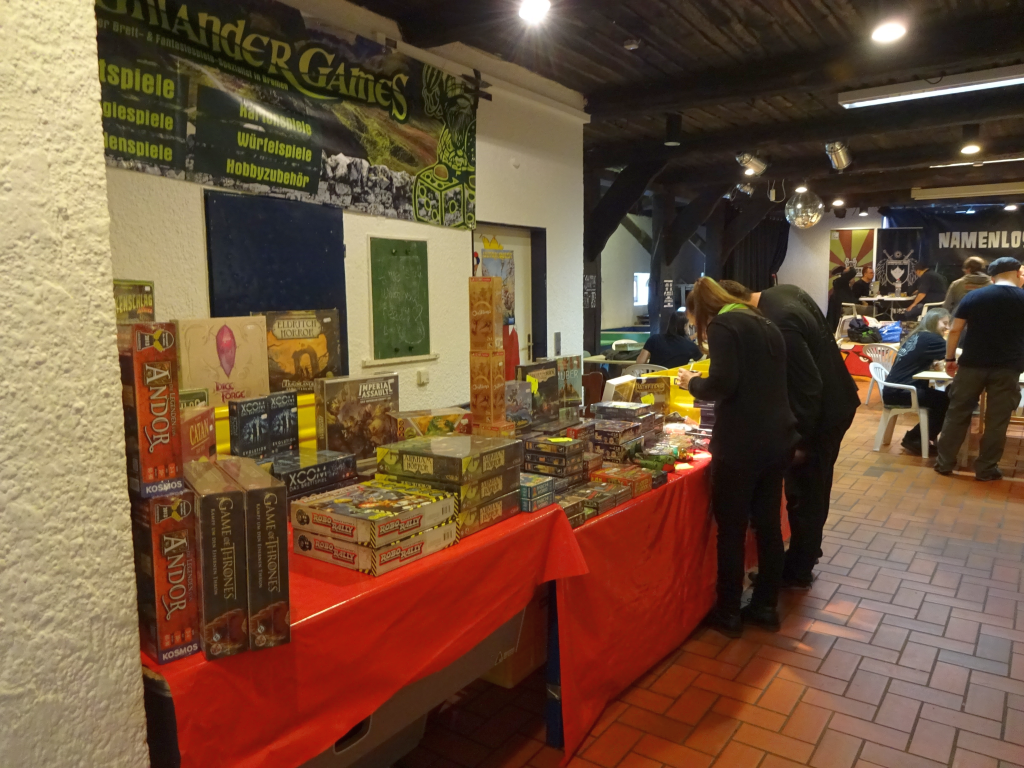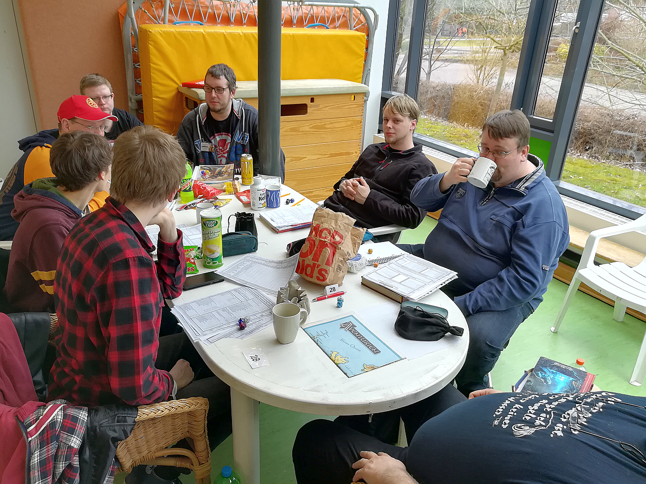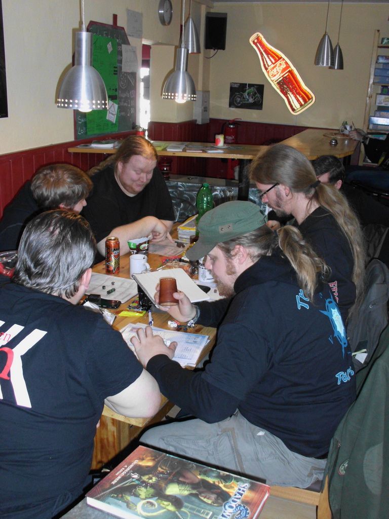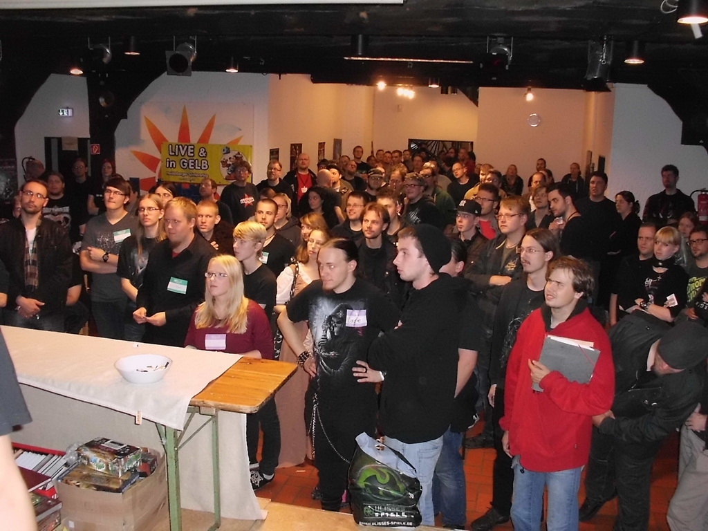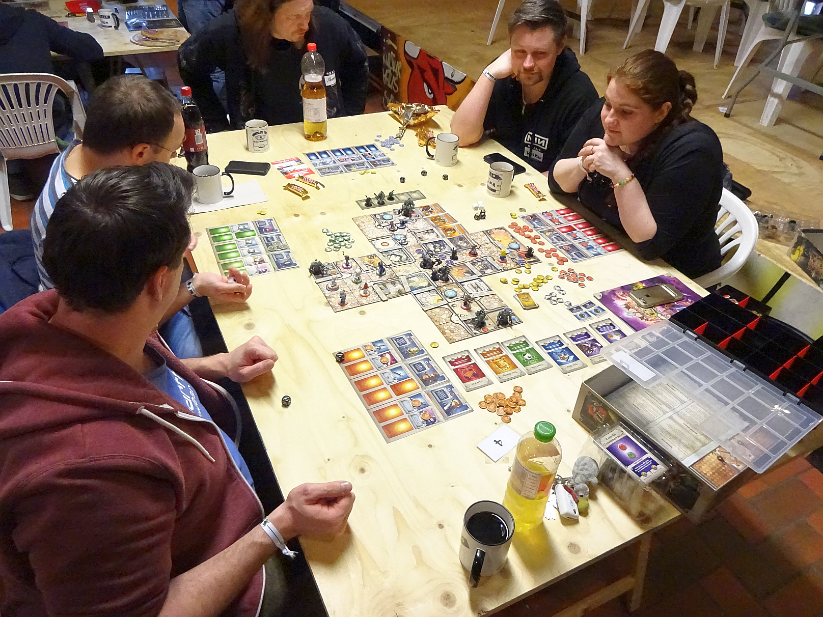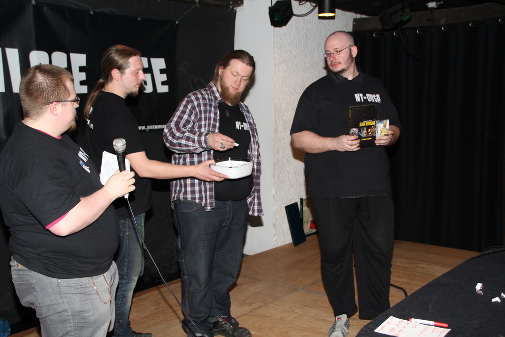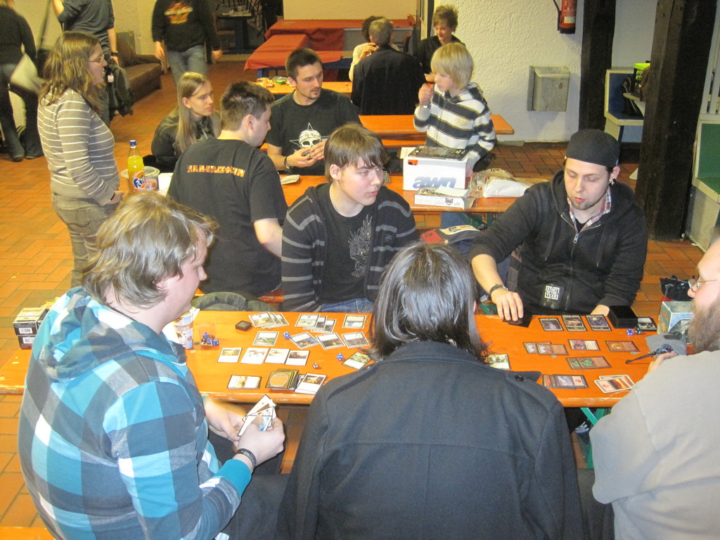 NT24: Bei frischem, wenn doch trockenem Wetter, öffneten sich die Pforten gegen 17:30 Uhr und der Run auf die Tassen im JD Style konnte beginnen. Mit Flatrate und Proviant gewappnet ging es auch schon an die Spieltische. Wer hingegen etwas Kultur genießen wollte, war in der Lesung mit Bernhard Hennen genau richtig. Als der Chilimeister zum Mitternachtsimbiss rief und auch der letzte eine Spielrunde oder bereits einen Platz im Schlafraum der neuen Kita gefunden hatte, ging der Freitag mit einem neuen Besucherrekord von 212 Gästen zu Ende. Am Samstag sollte es spannend werden, ob der Wegfall des Obergeschosses im Jugendhaus auf die Tischreserven auswirken sollte, doch dem war nicht so. Auch einem erneuten Wurststau konnte entgegengewirkt werden, trotz dessen es zu kurzen Wartezeiten beim Grillmeister kam. Mit der Wunschlesung von Bernhard Hennen und Tom Daut wurde auch der Samstag Nachmittag literarisch aufgewertet. Bei der Tombola am Abend konnte man gleich zu Beginn, oder doch am Ende, den verwirrten Gästen eine Besucherzahl von 310 präsentieren. Am Sonntag sollte, ausser beim Grillmeister nichts mehr anbrennen. Die Besucher die es bis dahin geschafft hatten gegen die Müdigkeit anzukämpfen nutzten nochmal ihre Flatrate und spielten bis zur letzten Minute. Mit 321 Gästen, ging die an der Besucherzahl gemessene zweit stärkste Märzveranstaltung zu Ende.