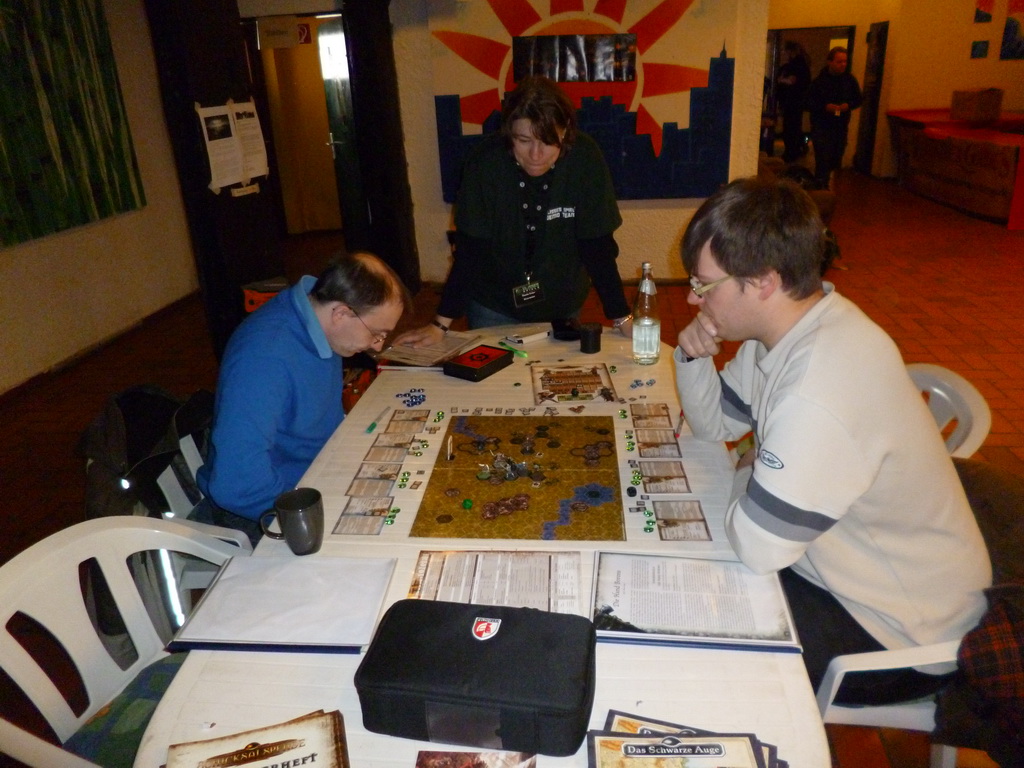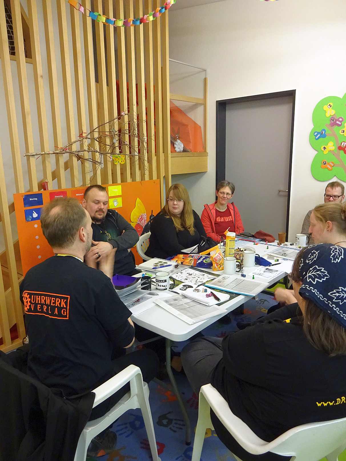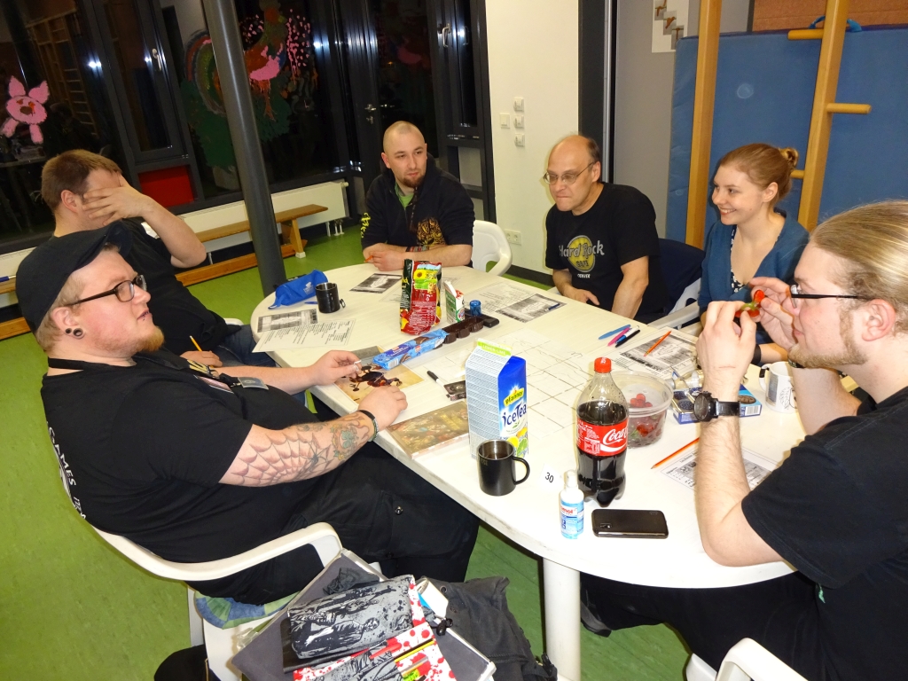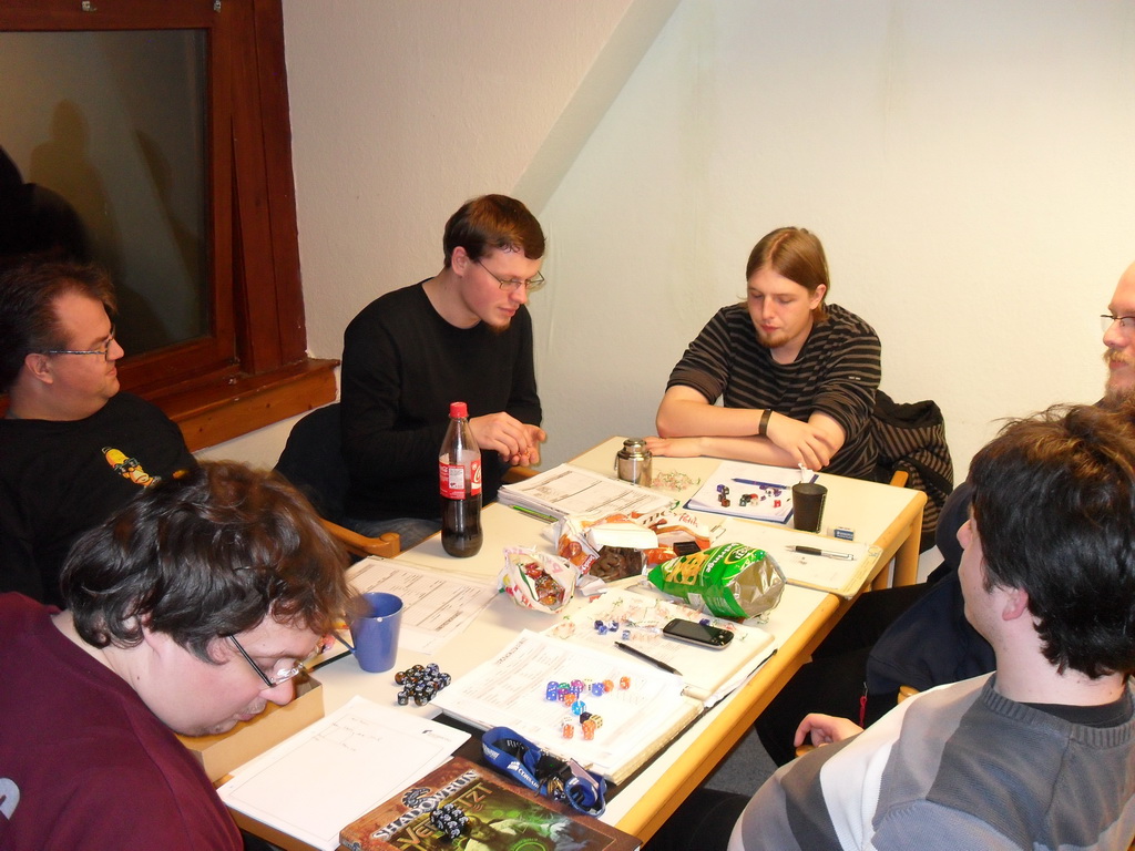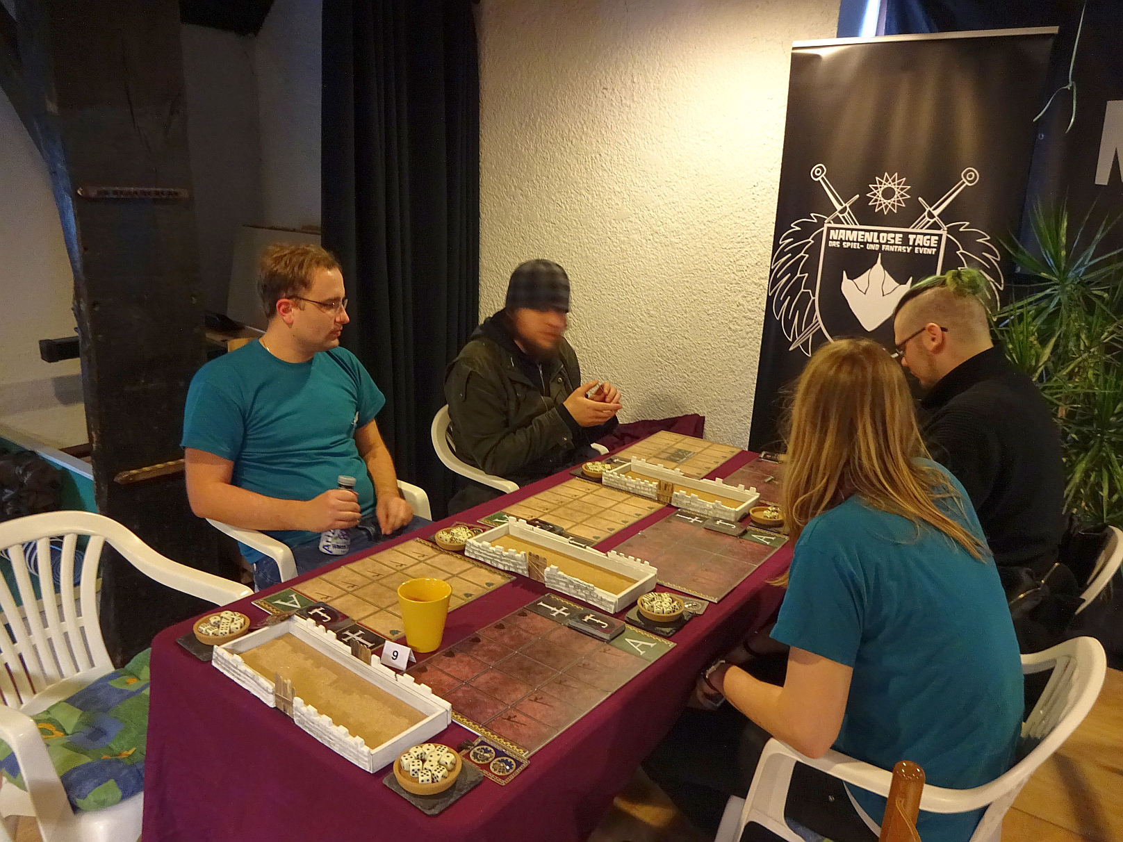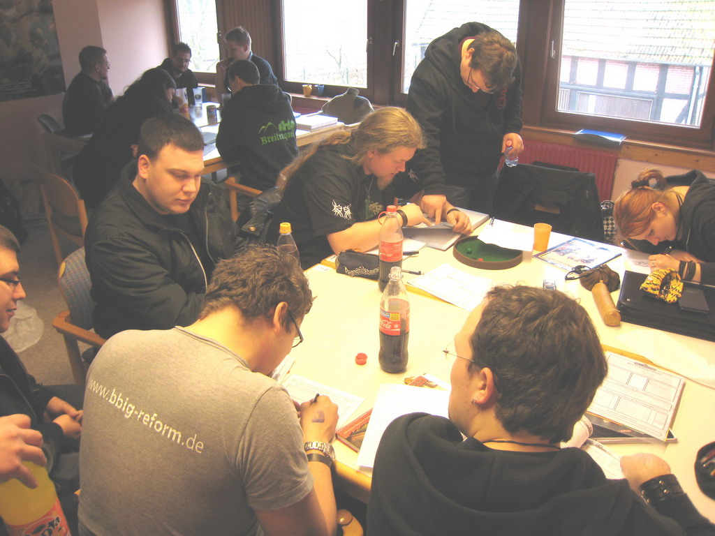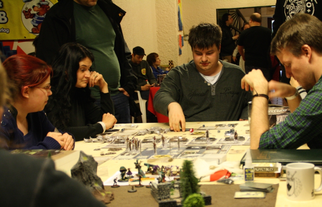 NT24: Bei frischem, wenn doch trockenem Wetter, öffneten sich die Pforten gegen 17:30 Uhr und der Run auf die Tassen im JD Style konnte beginnen. Mit Flatrate und Proviant gewappnet ging es auch schon an die Spieltische. Wer hingegen etwas Kultur genießen wollte, war in der Lesung mit Bernhard Hennen genau richtig. Als der Chilimeister zum Mitternachtsimbiss rief und auch der letzte eine Spielrunde oder bereits einen Platz im Schlafraum der neuen Kita gefunden hatte, ging der Freitag mit einem neuen Besucherrekord von 212 Gästen zu Ende. Am Samstag sollte es spannend werden, ob der Wegfall des Obergeschosses im Jugendhaus auf die Tischreserven auswirken sollte, doch dem war nicht so. Auch einem erneuten Wurststau konnte entgegengewirkt werden, trotz dessen es zu kurzen Wartezeiten beim Grillmeister kam. Mit der Wunschlesung von Bernhard Hennen und Tom Daut wurde auch der Samstag Nachmittag literarisch aufgewertet. Bei der Tombola am Abend konnte man gleich zu Beginn, oder doch am Ende, den verwirrten Gästen eine Besucherzahl von 310 präsentieren. Am Sonntag sollte, ausser beim Grillmeister nichts mehr anbrennen. Die Besucher die es bis dahin geschafft hatten gegen die Müdigkeit anzukämpfen nutzten nochmal ihre Flatrate und spielten bis zur letzten Minute. Mit 321 Gästen, ging die an der Besucherzahl gemessene zweit stärkste Märzveranstaltung zu Ende.
