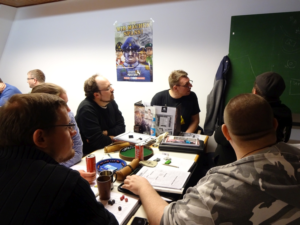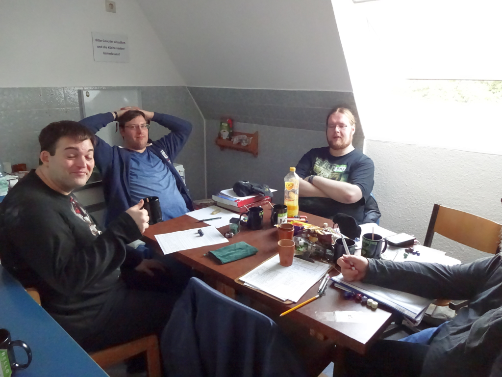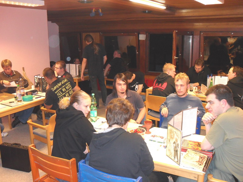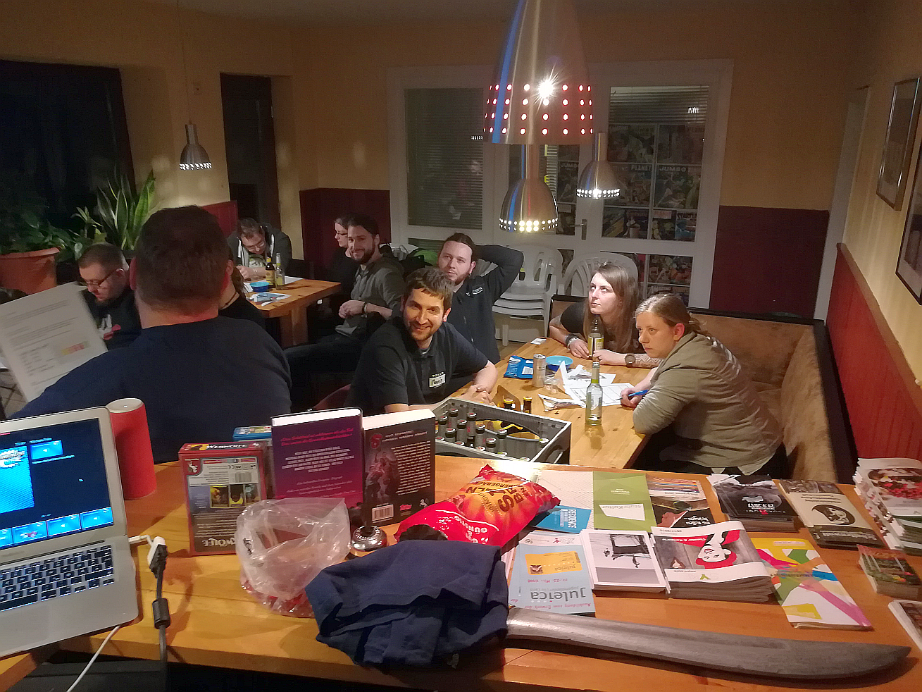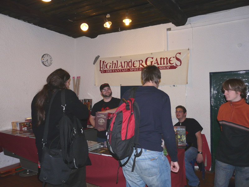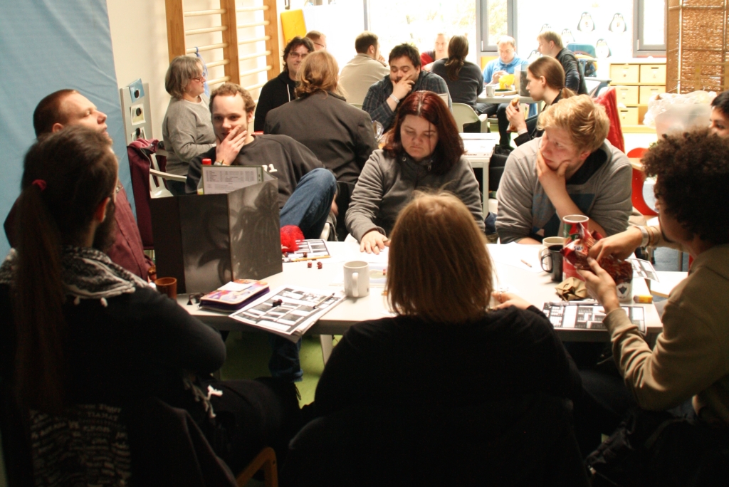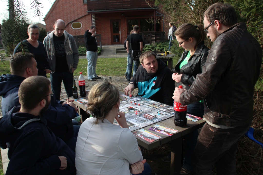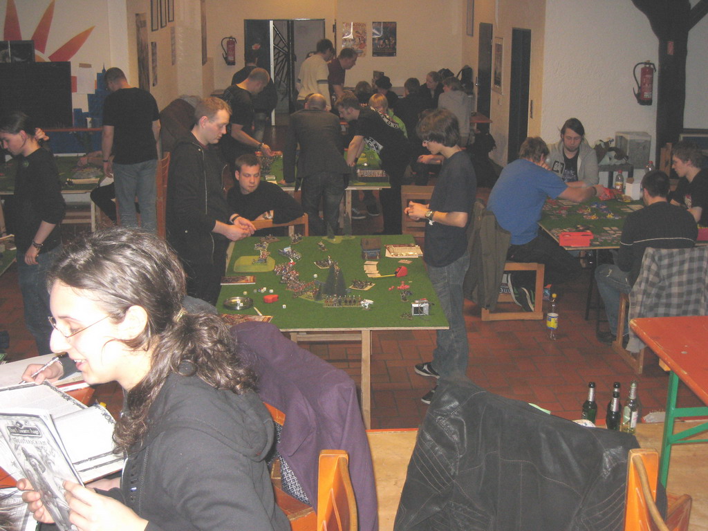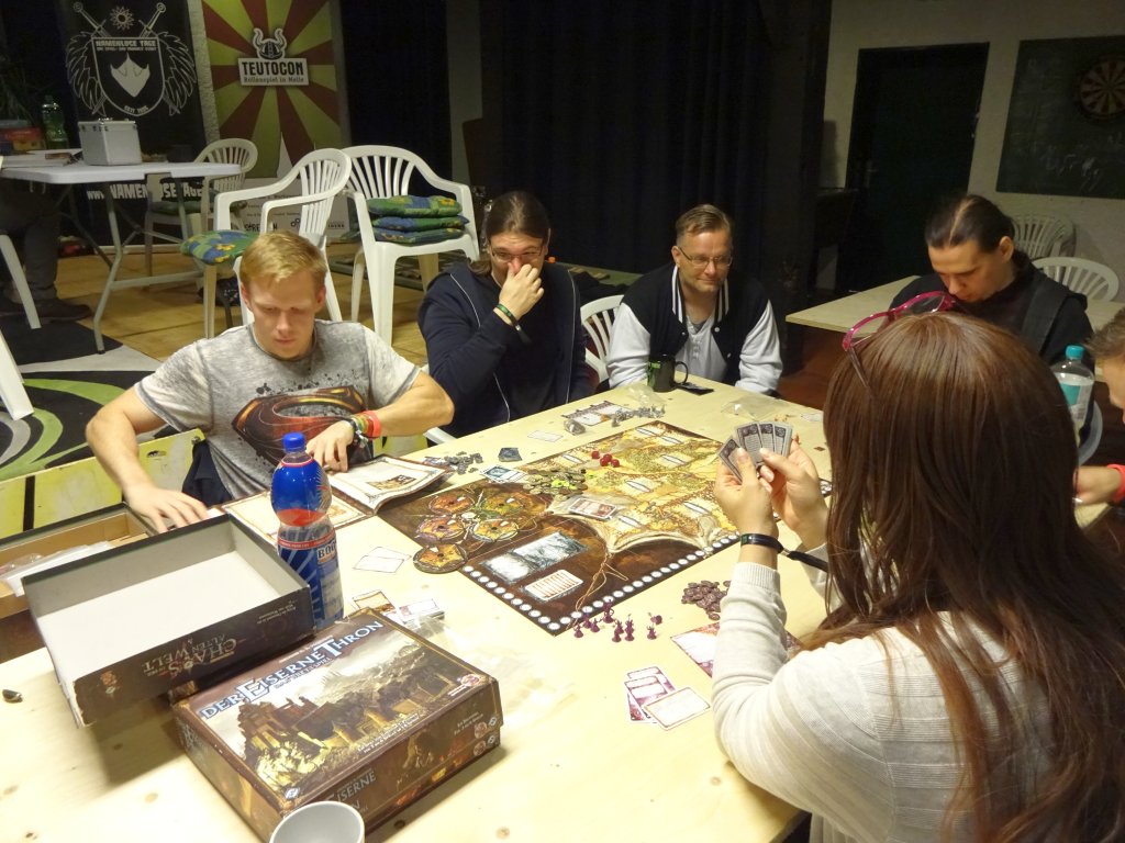 NT24: Bei frischem, wenn doch trockenem Wetter, öffneten sich die Pforten gegen 17:30 Uhr und der Run auf die Tassen im JD Style konnte beginnen. Mit Flatrate und Proviant gewappnet ging es auch schon an die Spieltische. Wer hingegen etwas Kultur genießen wollte, war in der Lesung mit Bernhard Hennen genau richtig. Als der Chilimeister zum Mitternachtsimbiss rief und auch der letzte eine Spielrunde oder bereits einen Platz im Schlafraum der neuen Kita gefunden hatte, ging der Freitag mit einem neuen Besucherrekord von 212 Gästen zu Ende. Am Samstag sollte es spannend werden, ob der Wegfall des Obergeschosses im Jugendhaus auf die Tischreserven auswirken sollte, doch dem war nicht so. Auch einem erneuten Wurststau konnte entgegengewirkt werden, trotz dessen es zu kurzen Wartezeiten beim Grillmeister kam. Mit der Wunschlesung von Bernhard Hennen und Tom Daut wurde auch der Samstag Nachmittag literarisch aufgewertet. Bei der Tombola am Abend konnte man gleich zu Beginn, oder doch am Ende, den verwirrten Gästen eine Besucherzahl von 310 präsentieren. Am Sonntag sollte, ausser beim Grillmeister nichts mehr anbrennen. Die Besucher die es bis dahin geschafft hatten gegen die Müdigkeit anzukämpfen nutzten nochmal ihre Flatrate und spielten bis zur letzten Minute. Mit 321 Gästen, ging die an der Besucherzahl gemessene zweit stärkste Märzveranstaltung zu Ende.