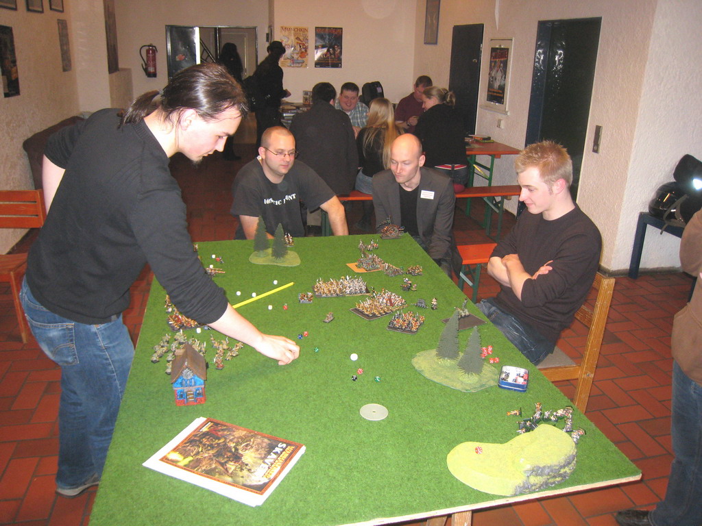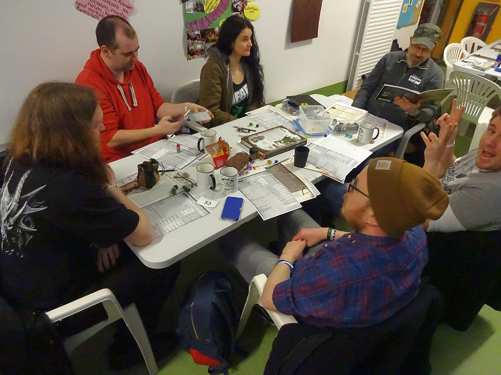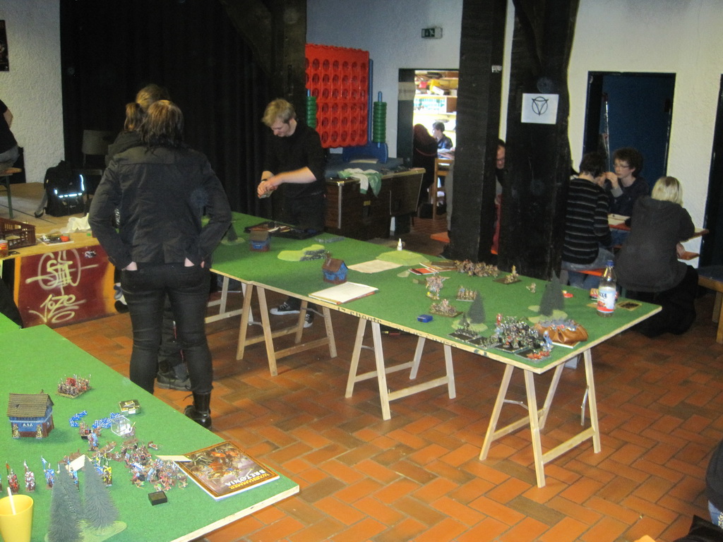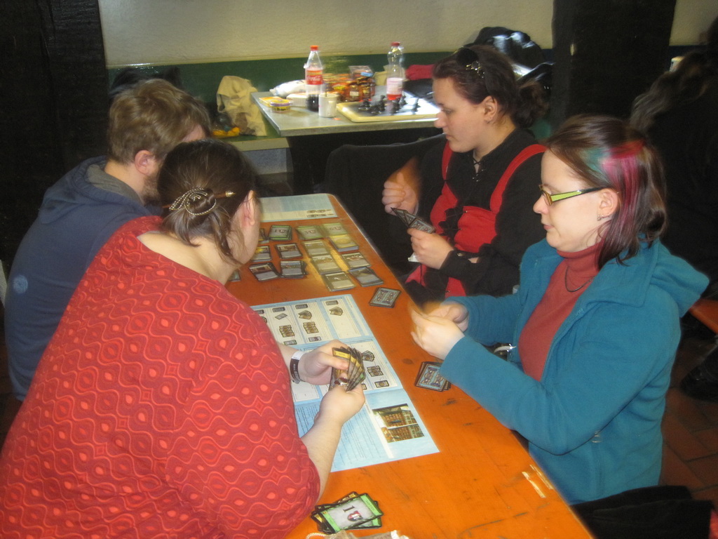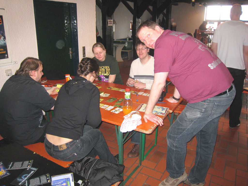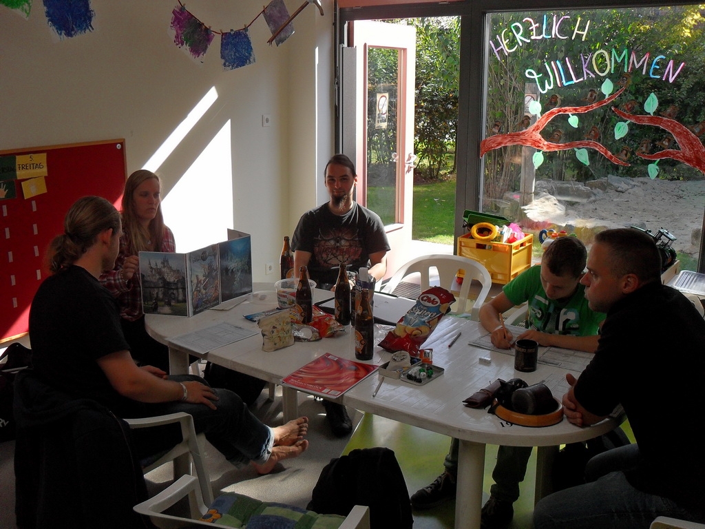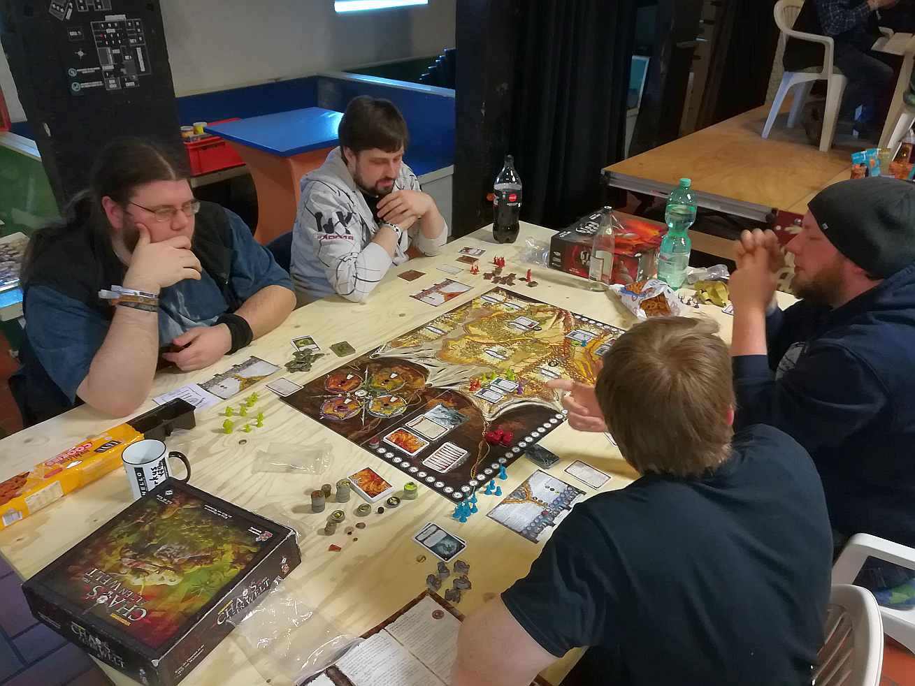 NT24: Bei frischem, wenn doch trockenem Wetter, öffneten sich die Pforten gegen 17:30 Uhr und der Run auf die Tassen im JD Style konnte beginnen. Mit Flatrate und Proviant gewappnet ging es auch schon an die Spieltische. Wer hingegen etwas Kultur genießen wollte, war in der Lesung mit Bernhard Hennen genau richtig. Als der Chilimeister zum Mitternachtsimbiss rief und auch der letzte eine Spielrunde oder bereits einen Platz im Schlafraum der neuen Kita gefunden hatte, ging der Freitag mit einem neuen Besucherrekord von 212 Gästen zu Ende. Am Samstag sollte es spannend werden, ob der Wegfall des Obergeschosses im Jugendhaus auf die Tischreserven auswirken sollte, doch dem war nicht so. Auch einem erneuten Wurststau konnte entgegengewirkt werden, trotz dessen es zu kurzen Wartezeiten beim Grillmeister kam. Mit der Wunschlesung von Bernhard Hennen und Tom Daut wurde auch der Samstag Nachmittag literarisch aufgewertet. Bei der Tombola am Abend konnte man gleich zu Beginn, oder doch am Ende, den verwirrten Gästen eine Besucherzahl von 310 präsentieren. Am Sonntag sollte, ausser beim Grillmeister nichts mehr anbrennen. Die Besucher die es bis dahin geschafft hatten gegen die Müdigkeit anzukämpfen nutzten nochmal ihre Flatrate und spielten bis zur letzten Minute. Mit 321 Gästen, ging die an der Besucherzahl gemessene zweit stärkste Märzveranstaltung zu Ende.