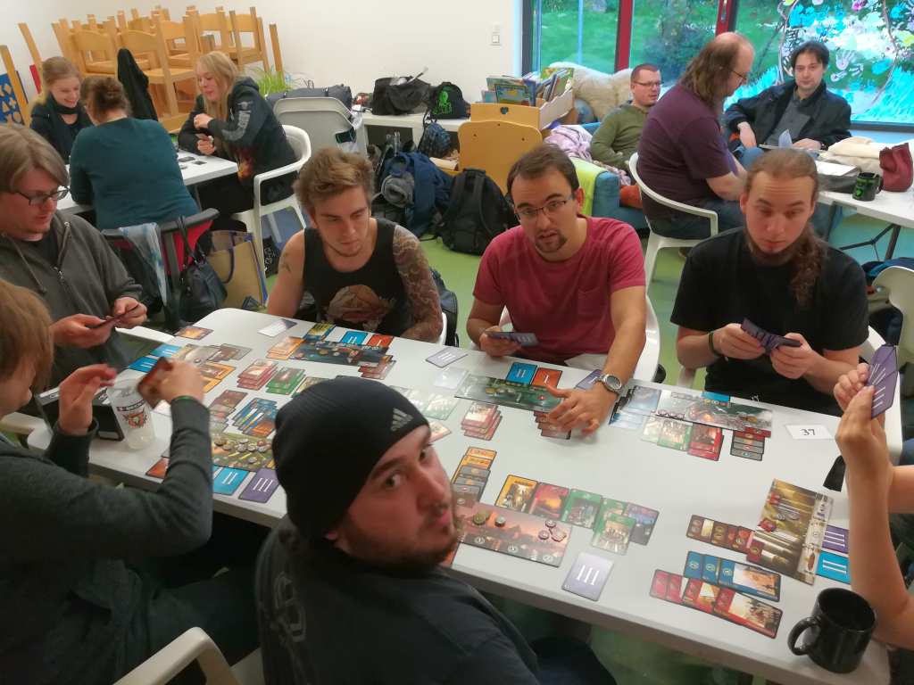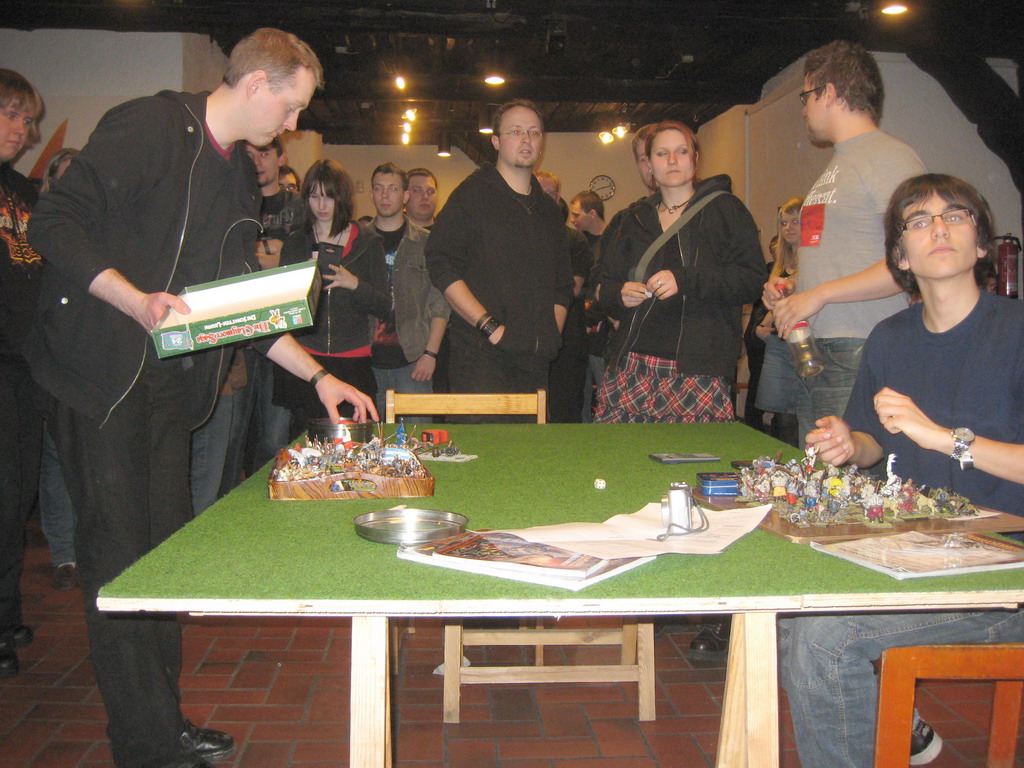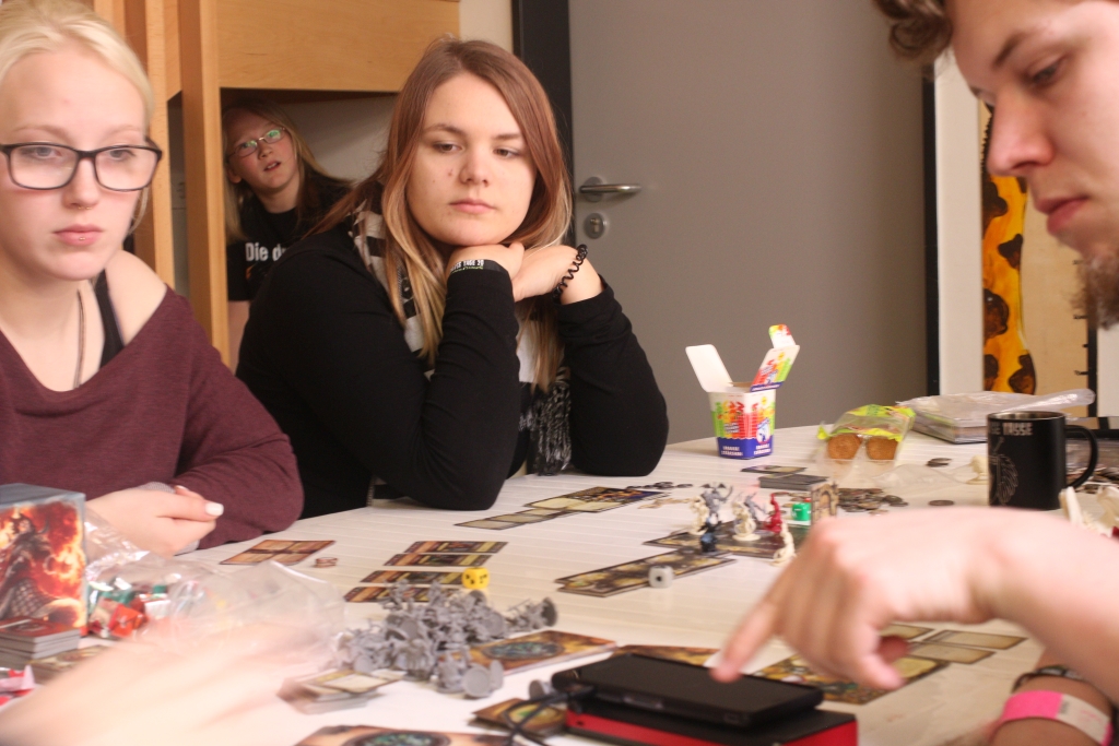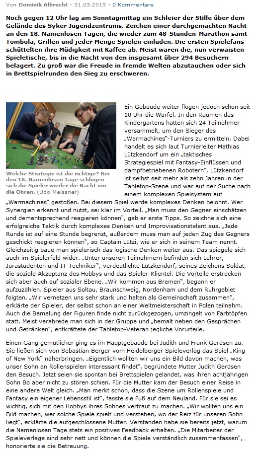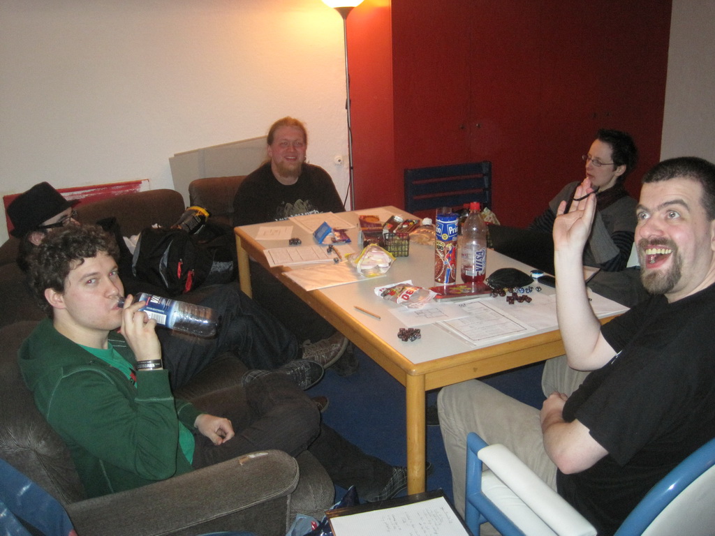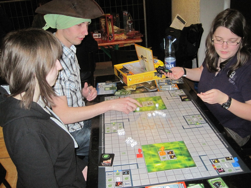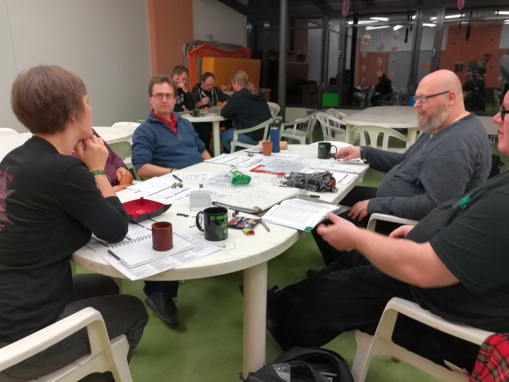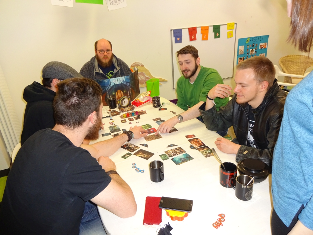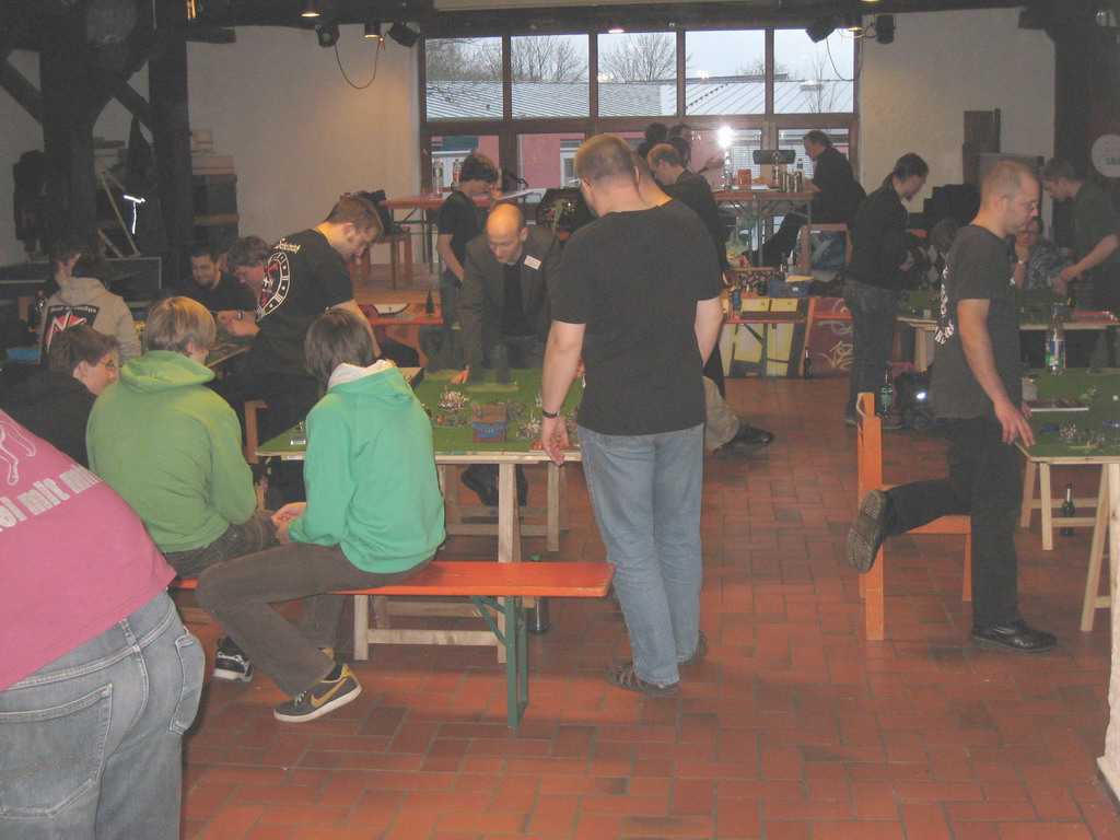 NT24: Bei frischem, wenn doch trockenem Wetter, öffneten sich die Pforten gegen 17:30 Uhr und der Run auf die Tassen im JD Style konnte beginnen. Mit Flatrate und Proviant gewappnet ging es auch schon an die Spieltische. Wer hingegen etwas Kultur genießen wollte, war in der Lesung mit Bernhard Hennen genau richtig. Als der Chilimeister zum Mitternachtsimbiss rief und auch der letzte eine Spielrunde oder bereits einen Platz im Schlafraum der neuen Kita gefunden hatte, ging der Freitag mit einem neuen Besucherrekord von 212 Gästen zu Ende. Am Samstag sollte es spannend werden, ob der Wegfall des Obergeschosses im Jugendhaus auf die Tischreserven auswirken sollte, doch dem war nicht so. Auch einem erneuten Wurststau konnte entgegengewirkt werden, trotz dessen es zu kurzen Wartezeiten beim Grillmeister kam. Mit der Wunschlesung von Bernhard Hennen und Tom Daut wurde auch der Samstag Nachmittag literarisch aufgewertet. Bei der Tombola am Abend konnte man gleich zu Beginn, oder doch am Ende, den verwirrten Gästen eine Besucherzahl von 310 präsentieren. Am Sonntag sollte, ausser beim Grillmeister nichts mehr anbrennen. Die Besucher die es bis dahin geschafft hatten gegen die Müdigkeit anzukämpfen nutzten nochmal ihre Flatrate und spielten bis zur letzten Minute. Mit 321 Gästen, ging die an der Besucherzahl gemessene zweit stärkste Märzveranstaltung zu Ende.