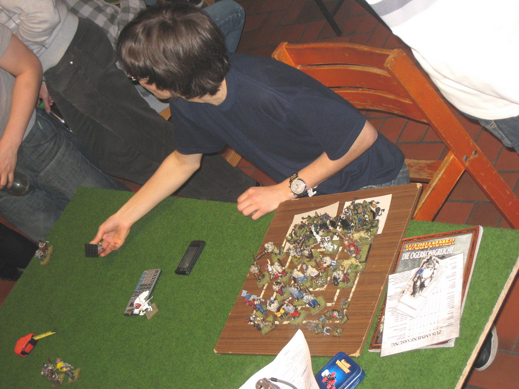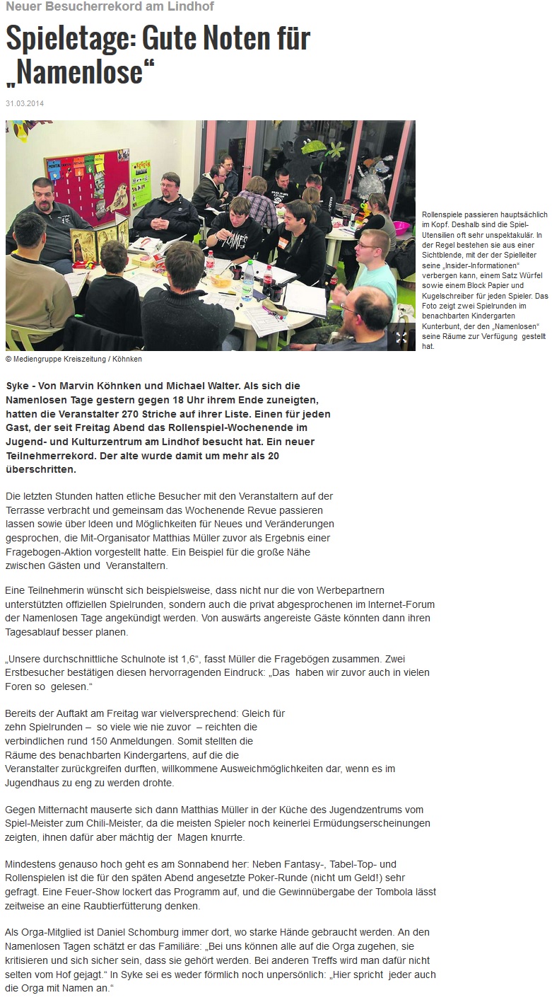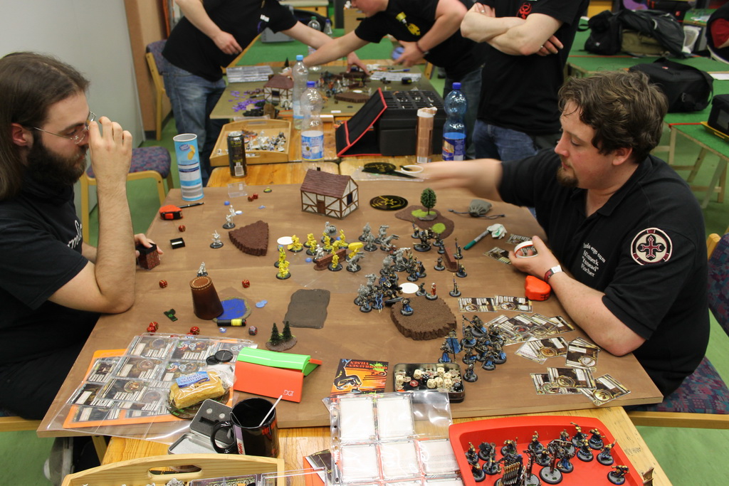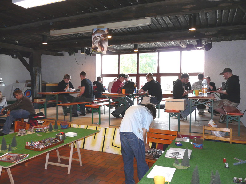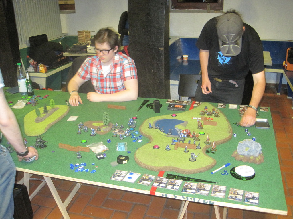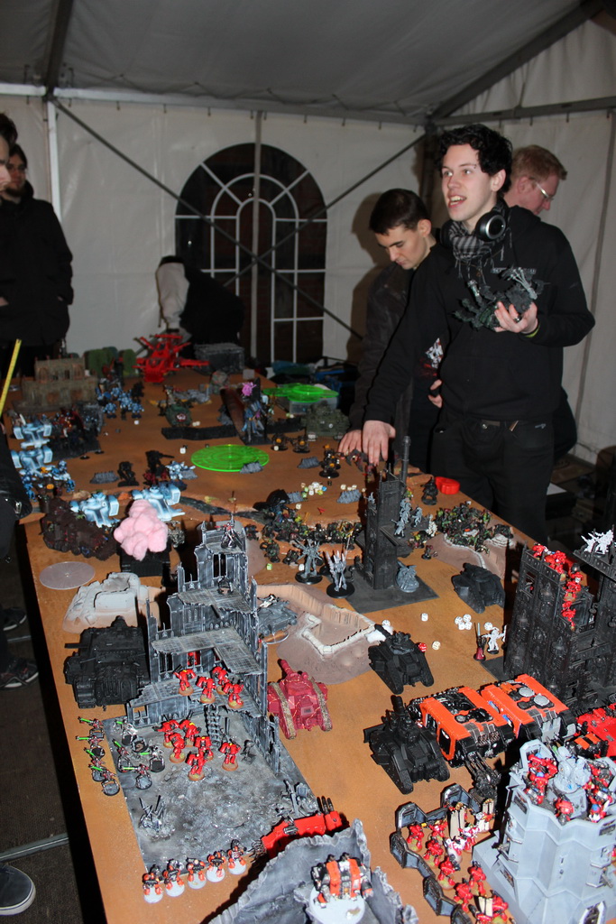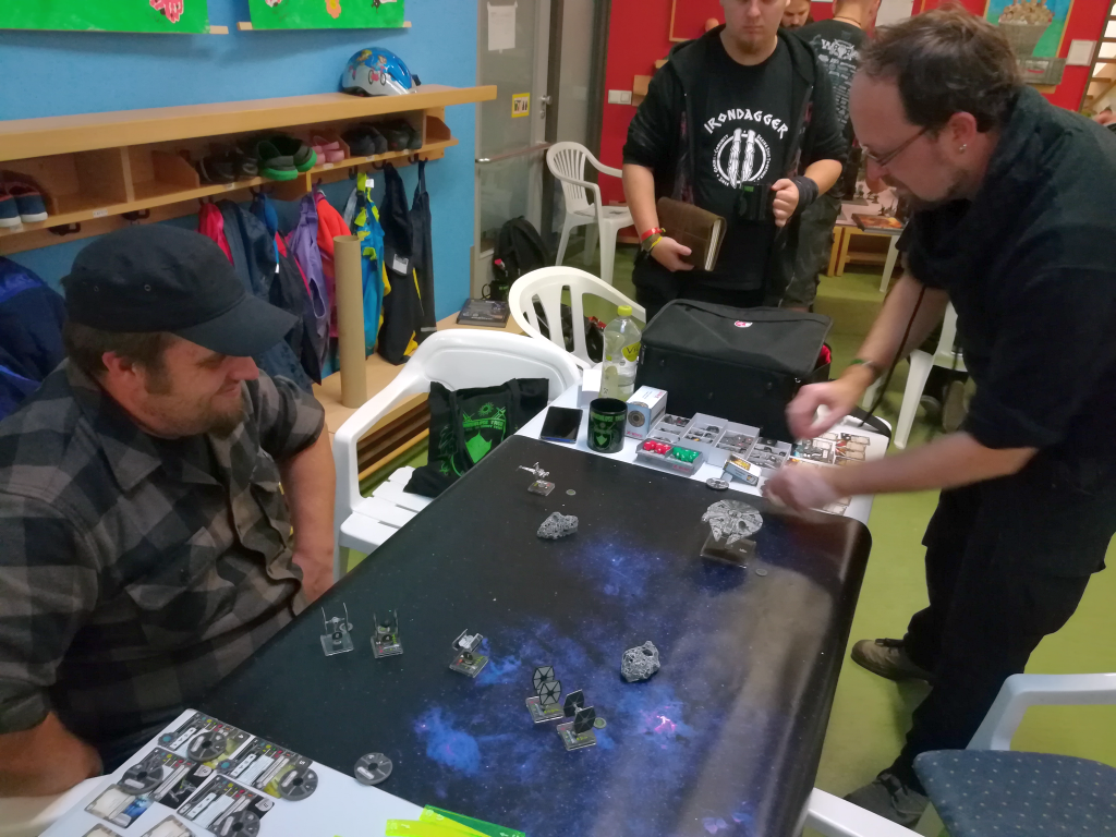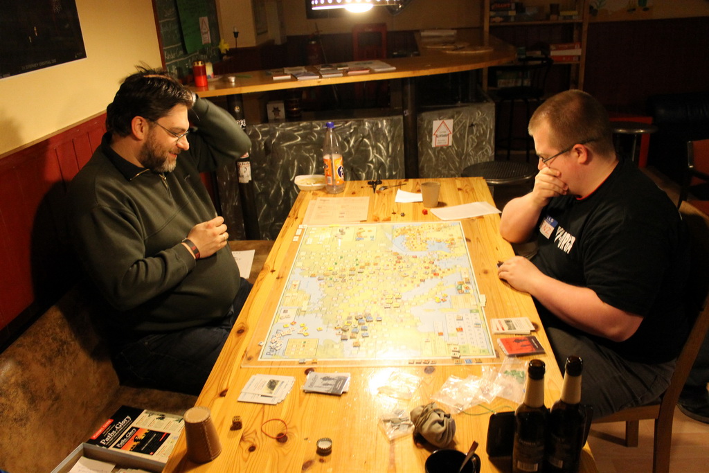 NT24: Bei frischem, wenn doch trockenem Wetter, öffneten sich die Pforten gegen 17:30 Uhr und der Run auf die Tassen im JD Style konnte beginnen. Mit Flatrate und Proviant gewappnet ging es auch schon an die Spieltische. Wer hingegen etwas Kultur genießen wollte, war in der Lesung mit Bernhard Hennen genau richtig. Als der Chilimeister zum Mitternachtsimbiss rief und auch der letzte eine Spielrunde oder bereits einen Platz im Schlafraum der neuen Kita gefunden hatte, ging der Freitag mit einem neuen Besucherrekord von 212 Gästen zu Ende. Am Samstag sollte es spannend werden, ob der Wegfall des Obergeschosses im Jugendhaus auf die Tischreserven auswirken sollte, doch dem war nicht so. Auch einem erneuten Wurststau konnte entgegengewirkt werden, trotz dessen es zu kurzen Wartezeiten beim Grillmeister kam. Mit der Wunschlesung von Bernhard Hennen und Tom Daut wurde auch der Samstag Nachmittag literarisch aufgewertet. Bei der Tombola am Abend konnte man gleich zu Beginn, oder doch am Ende, den verwirrten Gästen eine Besucherzahl von 310 präsentieren. Am Sonntag sollte, ausser beim Grillmeister nichts mehr anbrennen. Die Besucher die es bis dahin geschafft hatten gegen die Müdigkeit anzukämpfen nutzten nochmal ihre Flatrate und spielten bis zur letzten Minute. Mit 321 Gästen, ging die an der Besucherzahl gemessene zweit stärkste Märzveranstaltung zu Ende.