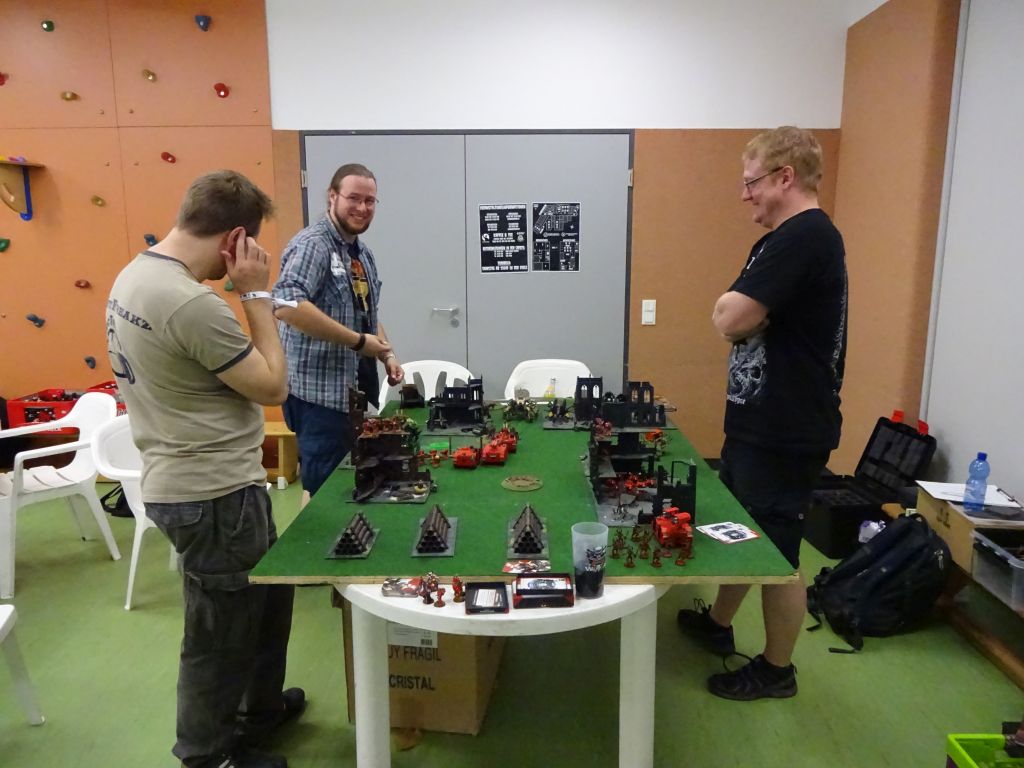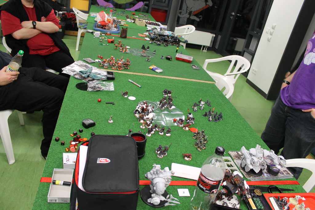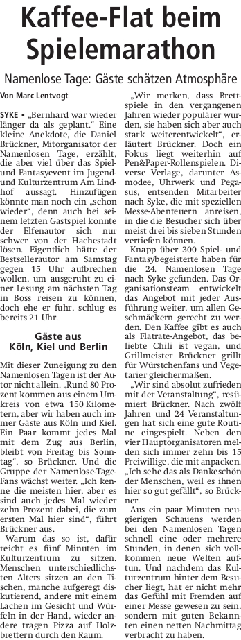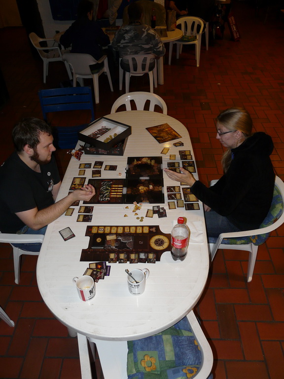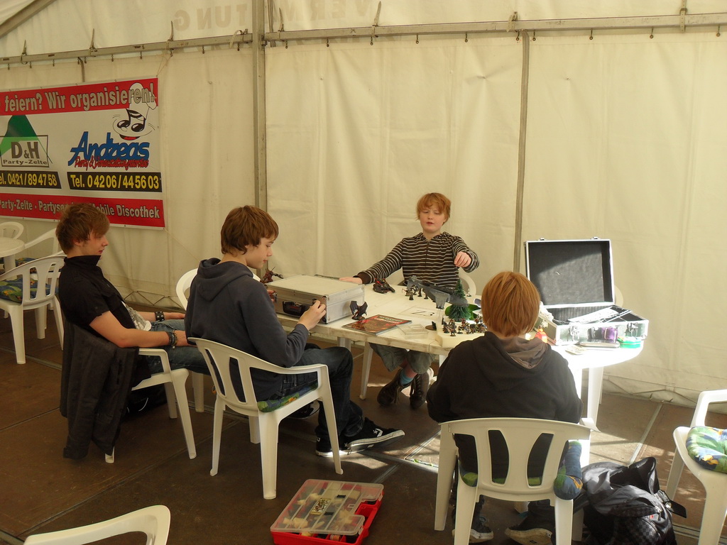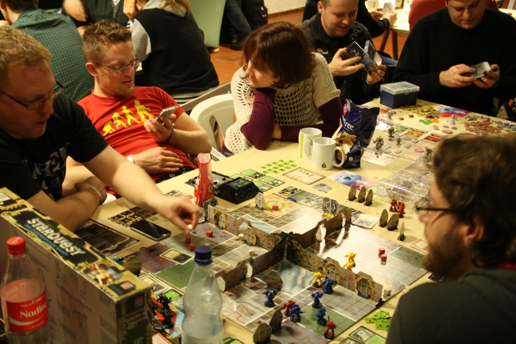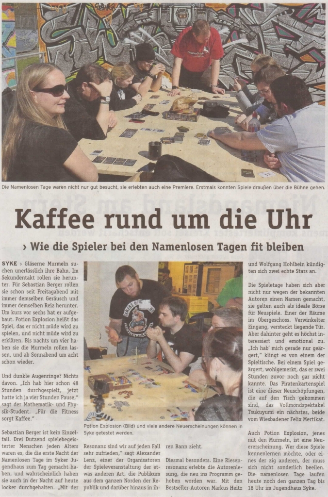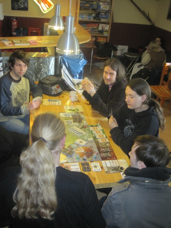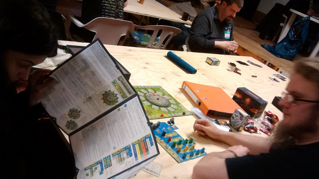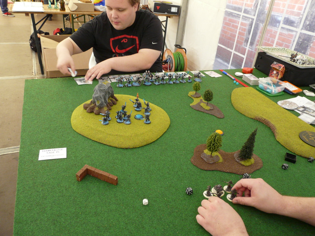 NT24: Bei frischem, wenn doch trockenem Wetter, öffneten sich die Pforten gegen 17:30 Uhr und der Run auf die Tassen im JD Style konnte beginnen. Mit Flatrate und Proviant gewappnet ging es auch schon an die Spieltische. Wer hingegen etwas Kultur genießen wollte, war in der Lesung mit Bernhard Hennen genau richtig. Als der Chilimeister zum Mitternachtsimbiss rief und auch der letzte eine Spielrunde oder bereits einen Platz im Schlafraum der neuen Kita gefunden hatte, ging der Freitag mit einem neuen Besucherrekord von 212 Gästen zu Ende. Am Samstag sollte es spannend werden, ob der Wegfall des Obergeschosses im Jugendhaus auf die Tischreserven auswirken sollte, doch dem war nicht so. Auch einem erneuten Wurststau konnte entgegengewirkt werden, trotz dessen es zu kurzen Wartezeiten beim Grillmeister kam. Mit der Wunschlesung von Bernhard Hennen und Tom Daut wurde auch der Samstag Nachmittag literarisch aufgewertet. Bei der Tombola am Abend konnte man gleich zu Beginn, oder doch am Ende, den verwirrten Gästen eine Besucherzahl von 310 präsentieren. Am Sonntag sollte, ausser beim Grillmeister nichts mehr anbrennen. Die Besucher die es bis dahin geschafft hatten gegen die Müdigkeit anzukämpfen nutzten nochmal ihre Flatrate und spielten bis zur letzten Minute. Mit 321 Gästen, ging die an der Besucherzahl gemessene zweit stärkste Märzveranstaltung zu Ende.