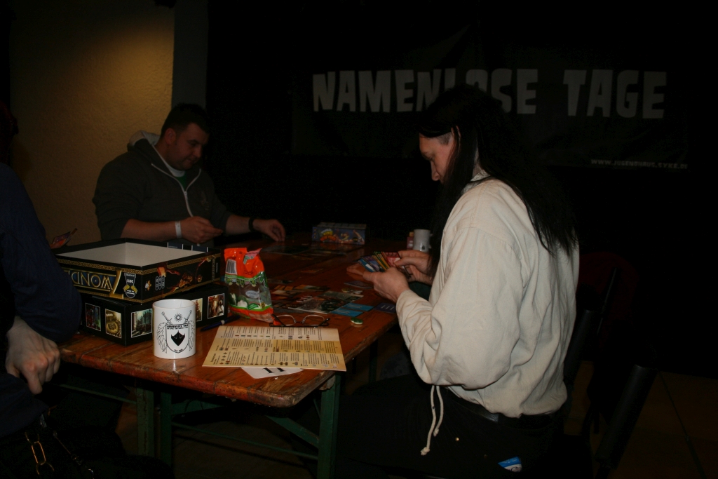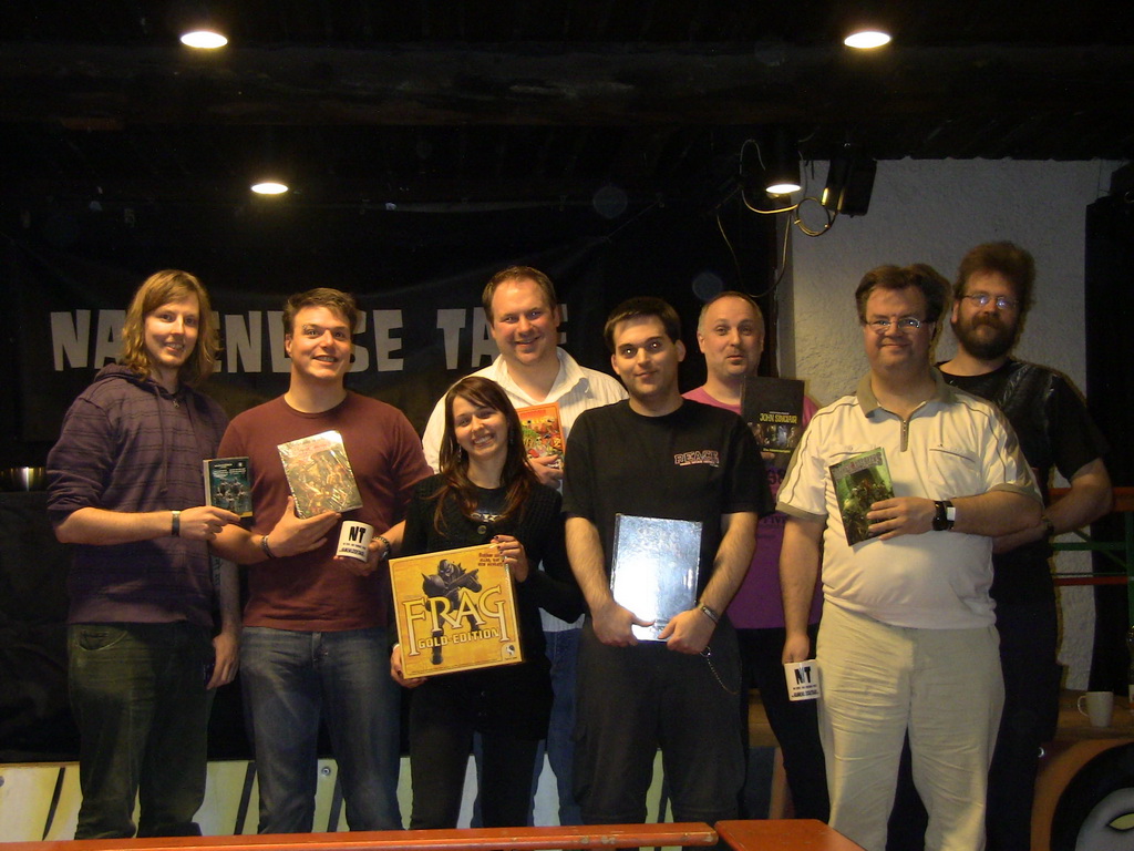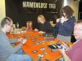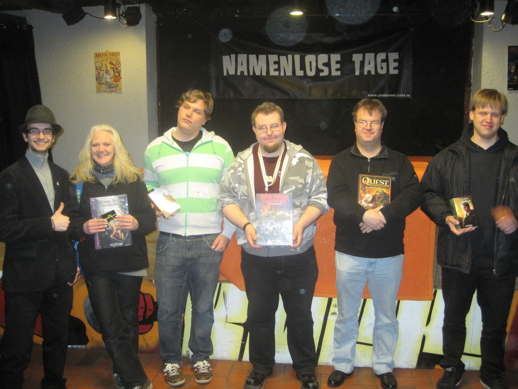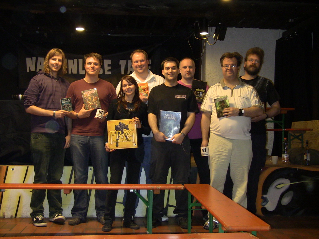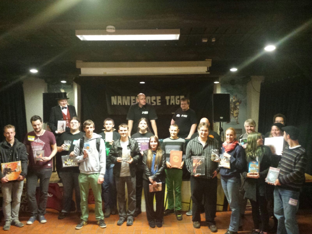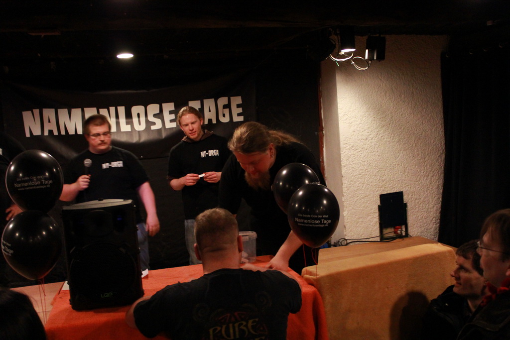 NT10: Mit einem gewaltigem Ansturm starteten diese Tage. Während die Besucherflut nicht abzureißen wollte, packten einige schon ihre Gesellschaftsspiele aus oder fanden sich in ihren Runden ein. Als der Freitag endete, alle Gäste versorgt und die 1. Autorenlesung der NT Geschichte zu Ende ging, konnte man bereits 105 Besucher zählen. Der Samstag wurde mit herrlichem Sonnenschein und dem Warhammer Fantasie Turnier begonnen. Zahlreiche Events boten ein sehr abwechslungsreiches Programm. Highlight des Abends war allerdings Thomas Finn, der einen großen Teil des Hauses zu seiner Lesung zog. Es folgte zur Auflockerung eine kleine Feuershow, bevor dann bei der Tombola die stolze Zahl von 153 Besuchern verkünden konnte. Den Abschluss des Samstag abends bildete traditionell das sehr gut besuchte Pokerturnier. Am Sonntag bereitete man sich dann auf einen weiteren Ansturm der Magic- und Warhammer 40k Spieler vor. Doch dieser wollte nicht so recht eintreten. Die beiden Bereiche die den Sonntag der NT bisher stets im Griff hatten schwächten ab. Dafür machten die Rollenspieler wieder Boden gut und konnten sich, wie das ganze Wochenende, als stärkster Bereich der NT durchsetzen. Alles in allem konnten die zehnten Namenlosentage mit soliden 181 Gästen einen erneuten Besucherrekord verzeichnen!