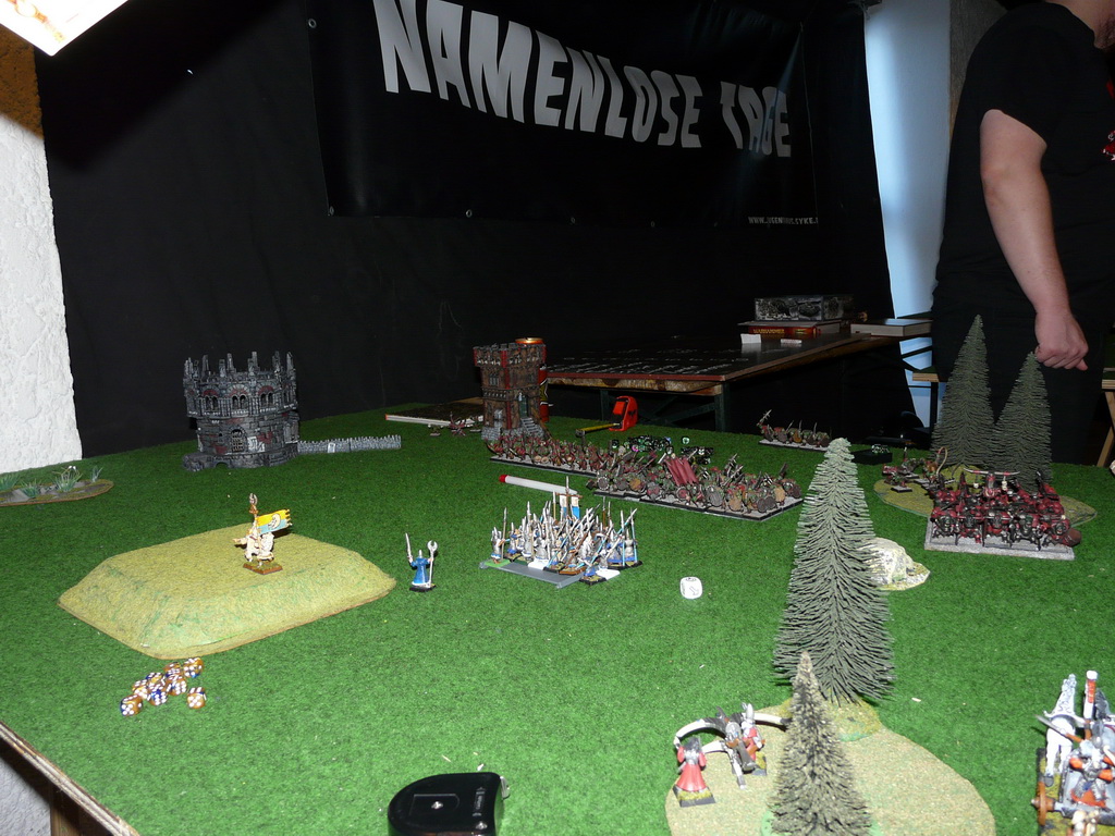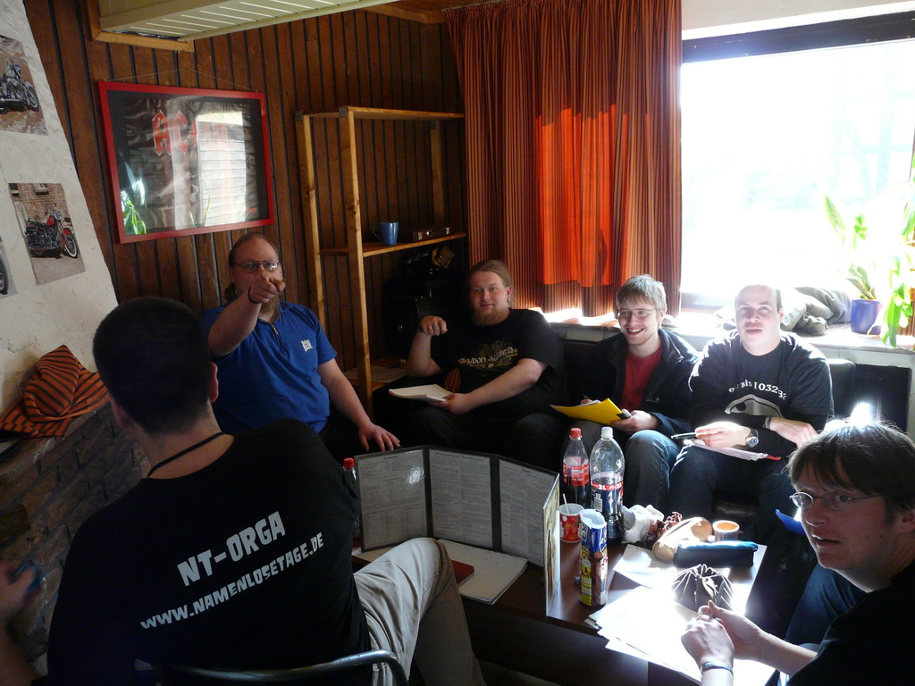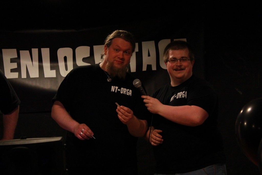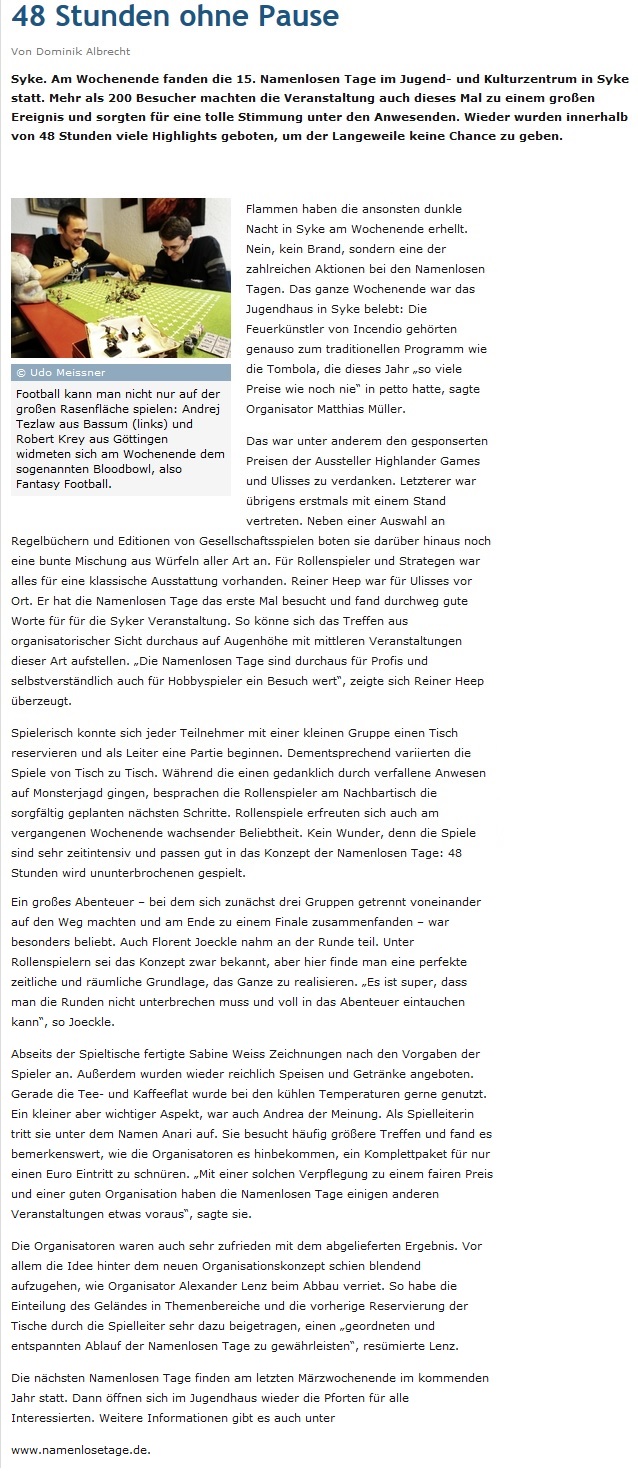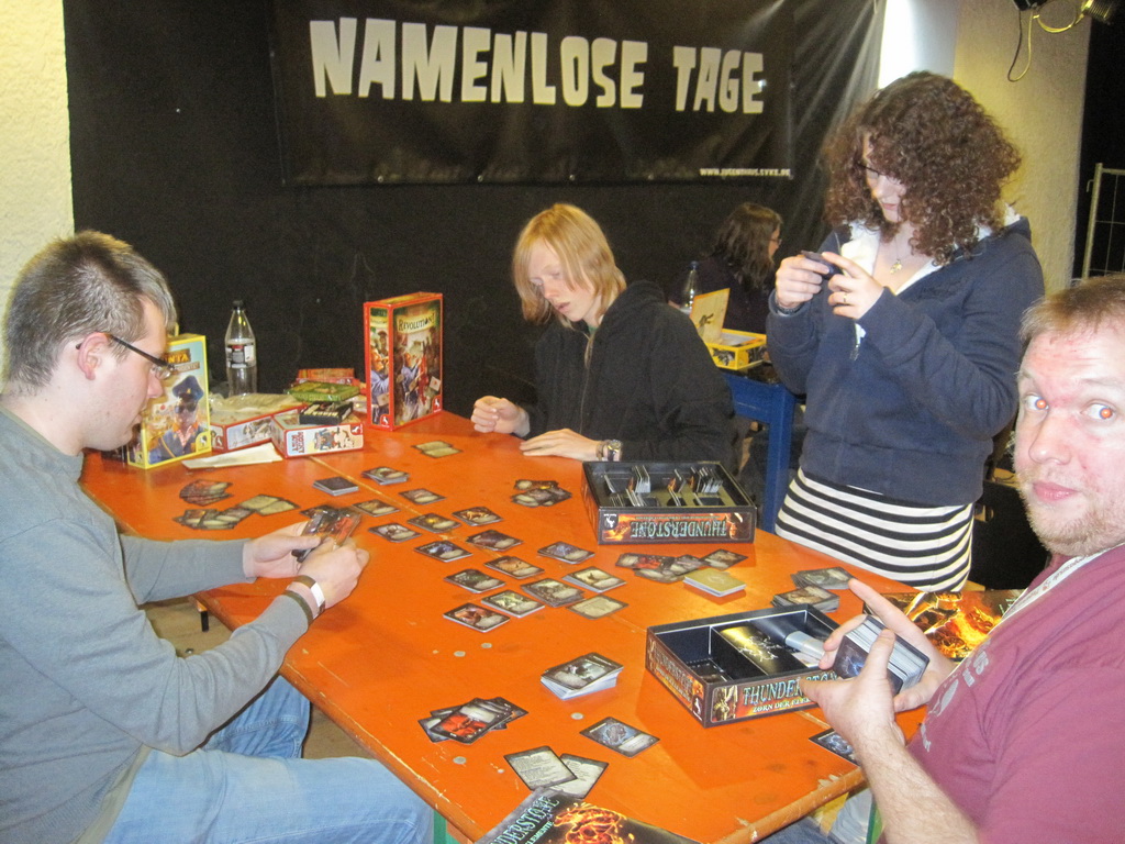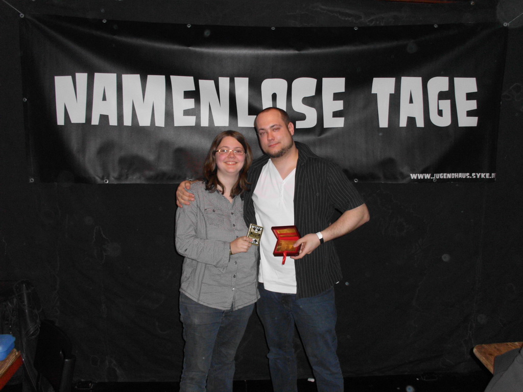 NT10: Mit einem gewaltigem Ansturm starteten diese Tage. Während die Besucherflut nicht abzureißen wollte, packten einige schon ihre Gesellschaftsspiele aus oder fanden sich in ihren Runden ein. Als der Freitag endete, alle Gäste versorgt und die 1. Autorenlesung der NT Geschichte zu Ende ging, konnte man bereits 105 Besucher zählen. Der Samstag wurde mit herrlichem Sonnenschein und dem Warhammer Fantasie Turnier begonnen. Zahlreiche Events boten ein sehr abwechslungsreiches Programm. Highlight des Abends war allerdings Thomas Finn, der einen großen Teil des Hauses zu seiner Lesung zog. Es folgte zur Auflockerung eine kleine Feuershow, bevor dann bei der Tombola die stolze Zahl von 153 Besuchern verkünden konnte. Den Abschluss des Samstag abends bildete traditionell das sehr gut besuchte Pokerturnier. Am Sonntag bereitete man sich dann auf einen weiteren Ansturm der Magic- und Warhammer 40k Spieler vor. Doch dieser wollte nicht so recht eintreten. Die beiden Bereiche die den Sonntag der NT bisher stets im Griff hatten schwächten ab. Dafür machten die Rollenspieler wieder Boden gut und konnten sich, wie das ganze Wochenende, als stärkster Bereich der NT durchsetzen. Alles in allem konnten die zehnten Namenlosentage mit soliden 181 Gästen einen erneuten Besucherrekord verzeichnen!