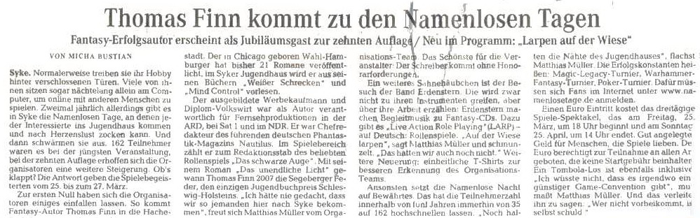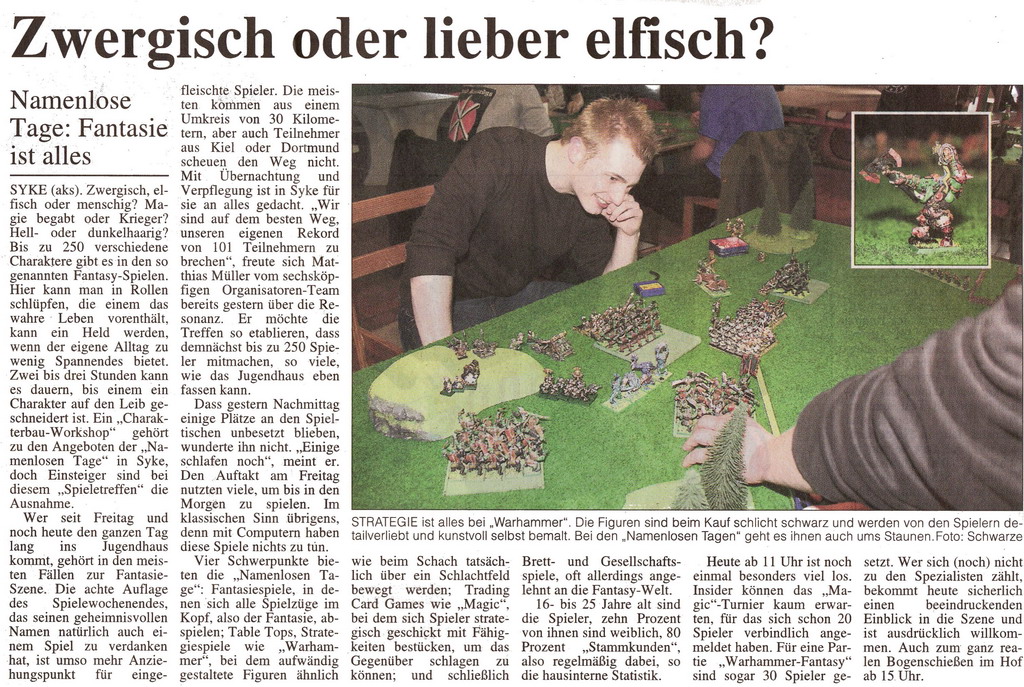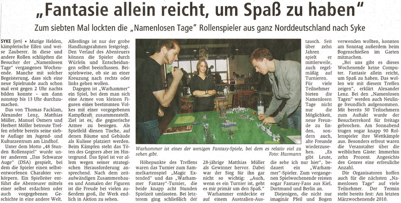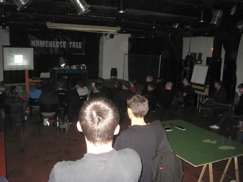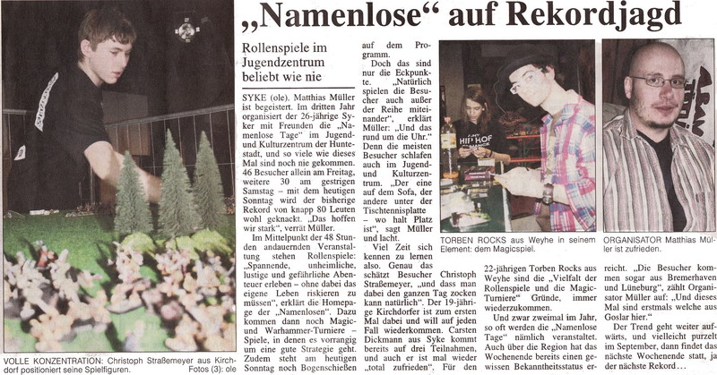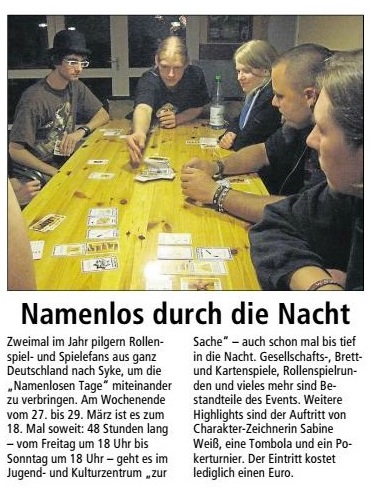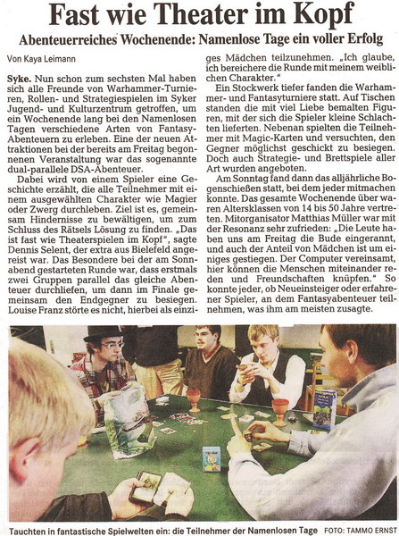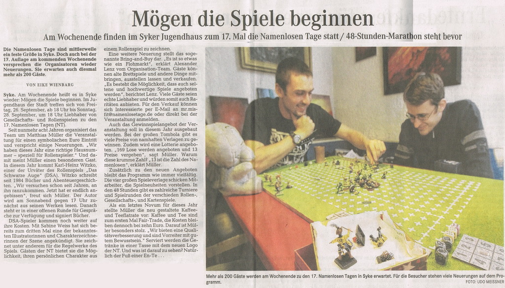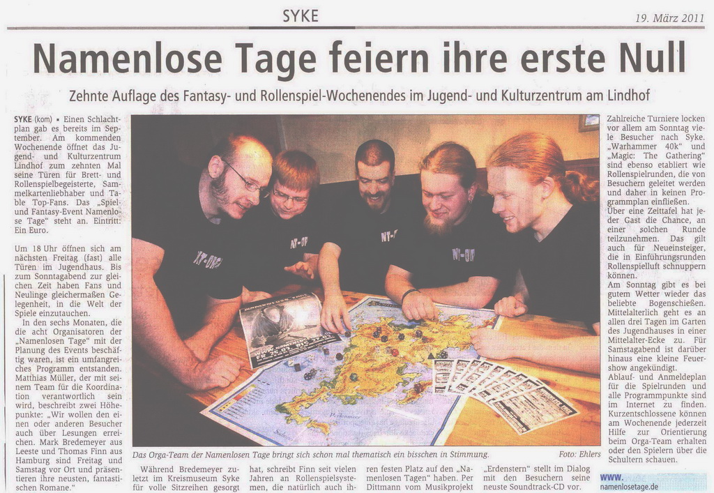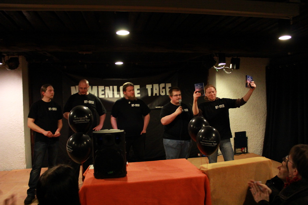 NT10: Mit einem gewaltigem Ansturm starteten diese Tage. Während die Besucherflut nicht abzureißen wollte, packten einige schon ihre Gesellschaftsspiele aus oder fanden sich in ihren Runden ein. Als der Freitag endete, alle Gäste versorgt und die 1. Autorenlesung der NT Geschichte zu Ende ging, konnte man bereits 105 Besucher zählen. Der Samstag wurde mit herrlichem Sonnenschein und dem Warhammer Fantasie Turnier begonnen. Zahlreiche Events boten ein sehr abwechslungsreiches Programm. Highlight des Abends war allerdings Thomas Finn, der einen großen Teil des Hauses zu seiner Lesung zog. Es folgte zur Auflockerung eine kleine Feuershow, bevor dann bei der Tombola die stolze Zahl von 153 Besuchern verkünden konnte. Den Abschluss des Samstag abends bildete traditionell das sehr gut besuchte Pokerturnier. Am Sonntag bereitete man sich dann auf einen weiteren Ansturm der Magic- und Warhammer 40k Spieler vor. Doch dieser wollte nicht so recht eintreten. Die beiden Bereiche die den Sonntag der NT bisher stets im Griff hatten schwächten ab. Dafür machten die Rollenspieler wieder Boden gut und konnten sich, wie das ganze Wochenende, als stärkster Bereich der NT durchsetzen. Alles in allem konnten die zehnten Namenlosentage mit soliden 181 Gästen einen erneuten Besucherrekord verzeichnen!