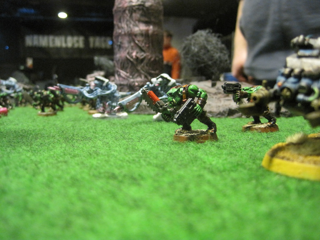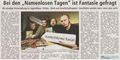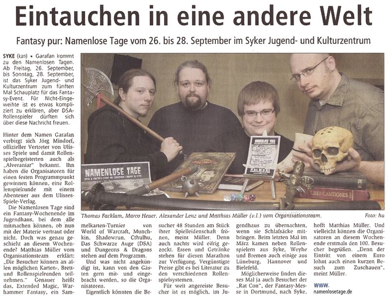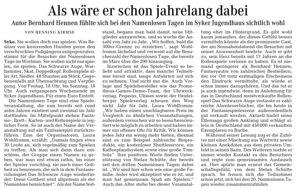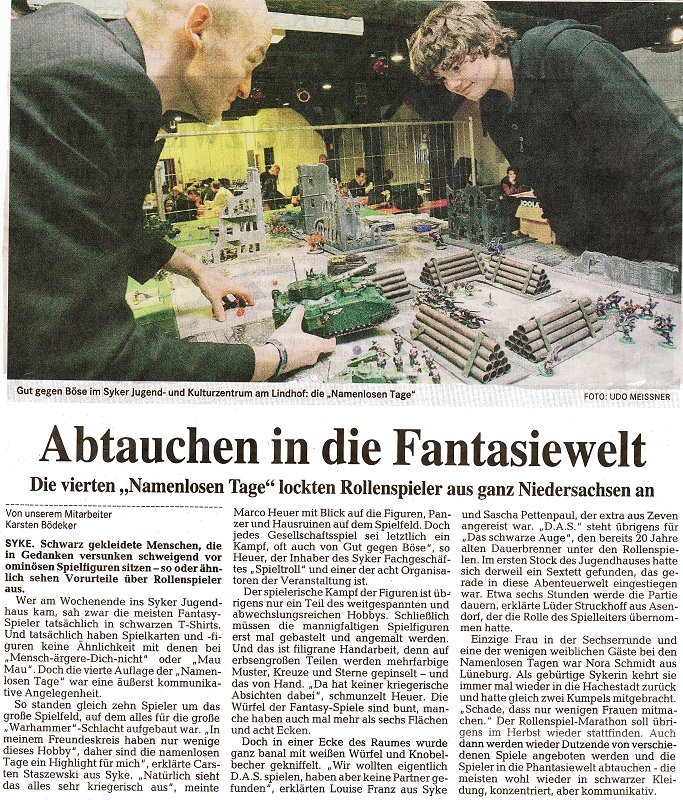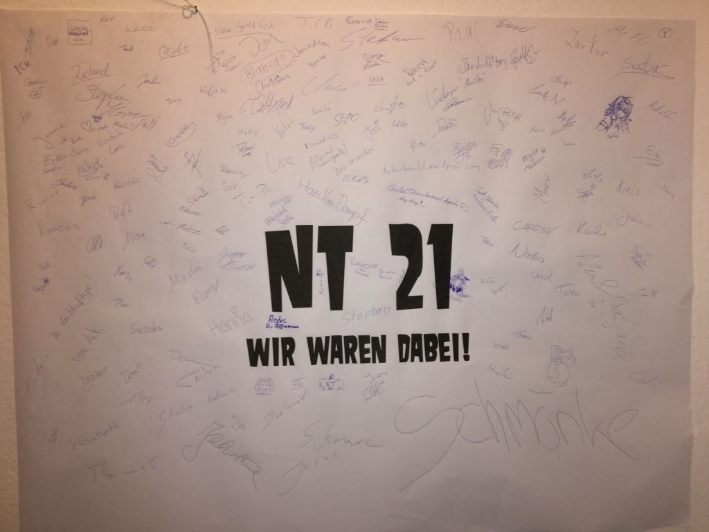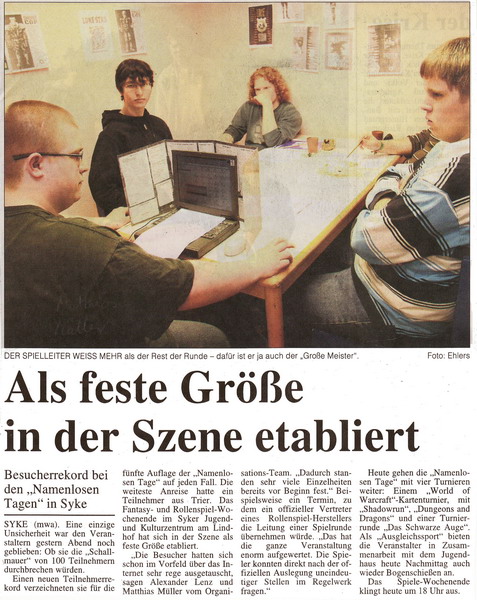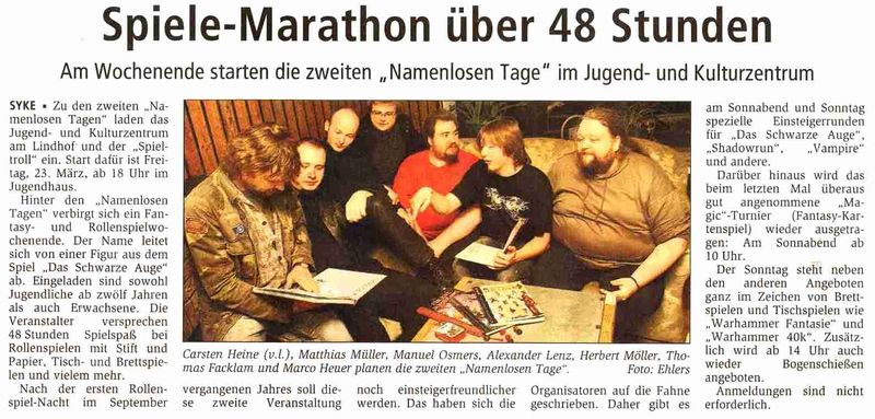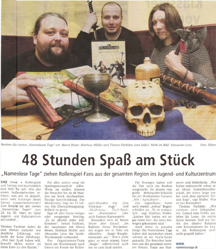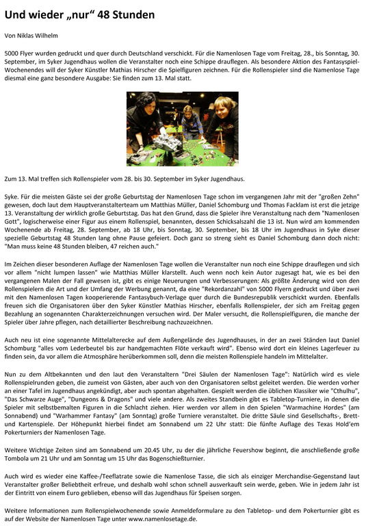 NT10: Mit einem gewaltigem Ansturm starteten diese Tage. Während die Besucherflut nicht abzureißen wollte, packten einige schon ihre Gesellschaftsspiele aus oder fanden sich in ihren Runden ein. Als der Freitag endete, alle Gäste versorgt und die 1. Autorenlesung der NT Geschichte zu Ende ging, konnte man bereits 105 Besucher zählen. Der Samstag wurde mit herrlichem Sonnenschein und dem Warhammer Fantasie Turnier begonnen. Zahlreiche Events boten ein sehr abwechslungsreiches Programm. Highlight des Abends war allerdings Thomas Finn, der einen großen Teil des Hauses zu seiner Lesung zog. Es folgte zur Auflockerung eine kleine Feuershow, bevor dann bei der Tombola die stolze Zahl von 153 Besuchern verkünden konnte. Den Abschluss des Samstag abends bildete traditionell das sehr gut besuchte Pokerturnier. Am Sonntag bereitete man sich dann auf einen weiteren Ansturm der Magic- und Warhammer 40k Spieler vor. Doch dieser wollte nicht so recht eintreten. Die beiden Bereiche die den Sonntag der NT bisher stets im Griff hatten schwächten ab. Dafür machten die Rollenspieler wieder Boden gut und konnten sich, wie das ganze Wochenende, als stärkster Bereich der NT durchsetzen. Alles in allem konnten die zehnten Namenlosentage mit soliden 181 Gästen einen erneuten Besucherrekord verzeichnen!