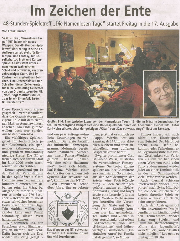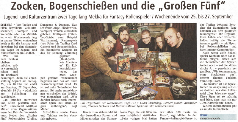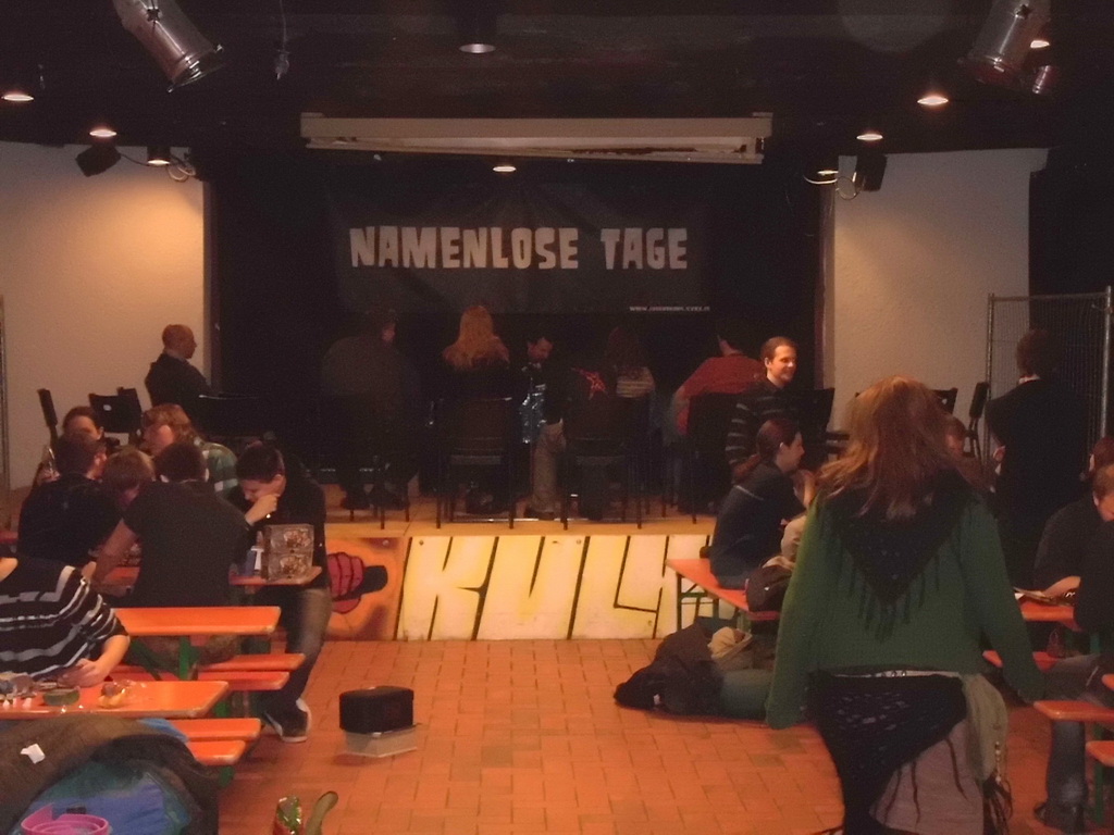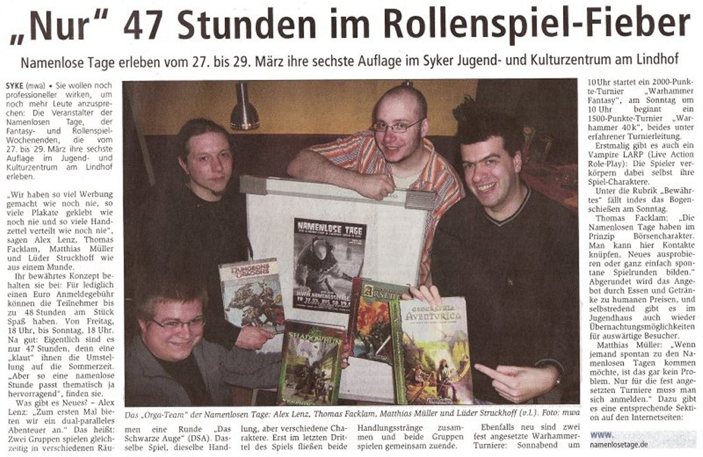 Die ersten Namenlosen Tage fanden am 23.09. und 24.09.2006 statt. Seiner Zeit noch von Samstag 10Uhr bis Sonntag 20Uhr, aber immerhin schon 34Std Nonstop. Die NT war aus damaliger Sicht ein voller Erfolg. Das Ziel wurde erreicht und man schaffte es Fantasy- und Rollenspielbegeisterte der Region zusammenzuführen und sogar neue Leute für Spiele dieser Art zu begeistern. Das Rollenspiel und das Traidingcard Game Magic waren eindeutig die am meist gespielten Systeme und mit 36 Besuchern ging diese erste Veranstaltung zu Ende.
