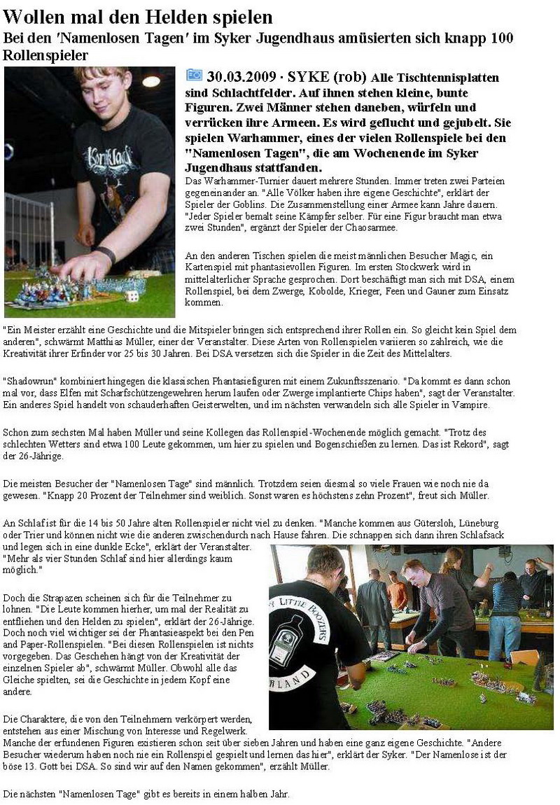 Die neunten Namenlosen Tage fanden vom 24.09. bis 26.09.2010 statt. Paralysiert von den Erfolgen der vergangenen Veranstaltungen und unter einem gewissen Druck diese Ergebnisse zu bestätigen, gingen die Organisatoren in die Vorbereitung. Im Hinterkopf schon Pläne für die 5 Jahre Jubiläums NT10, versuchte man sich dennoch voll auf diese Veranstaltung zu konzentrieren. Die Werbung im Internet und mit den Plakaten ging seinen gewohnten Gang und man zitterte dem Start entgegen. Im Regen machte der Besucheransturm zu Beginn da weiter, wo er bei der Veranstaltung zuvor aufhörte. Dieser Trend setzte sich am Samstag fort und es konnte am Abend bei der Tombola verkündet werden, dass bereits 108 Besucher zur NT gefunden haben. Die Rollenspieler hatten das Haus bis Sonntagmorgen im Griff, allerdings standen auch Gesellschafts-, Karten- und Brettspiele so hoch im Kurs wie nie zuvor. Das Warhammer Fantasy Turnier und das Munchkin Turnier lockerten den Samstag ebenso auf, wie das Pokerturnier am späten Abend. Am letzten Tag wollte das Wetter nicht Recht mitspielen und das Bogenschießen musste abgesagt werden. Davon ließen sich die Bereiche Warhammer 40k und Magic allerdings nicht abhalten und zogen noch einmal kräftig die Gäste ins Haus. Die Rekordmarke von 163 Besuchern wurde aufgestellt, als dieses Wochenende zu Ende ging.